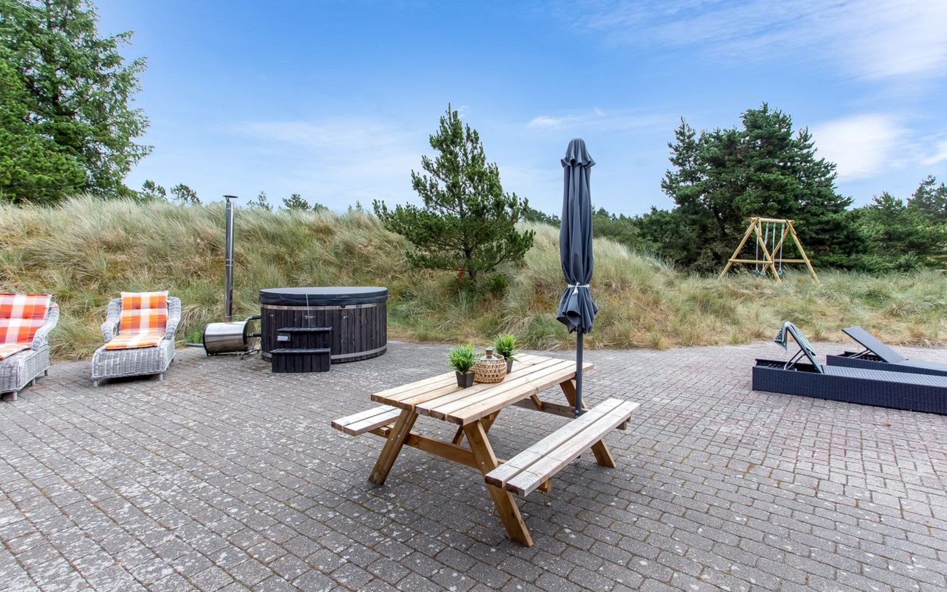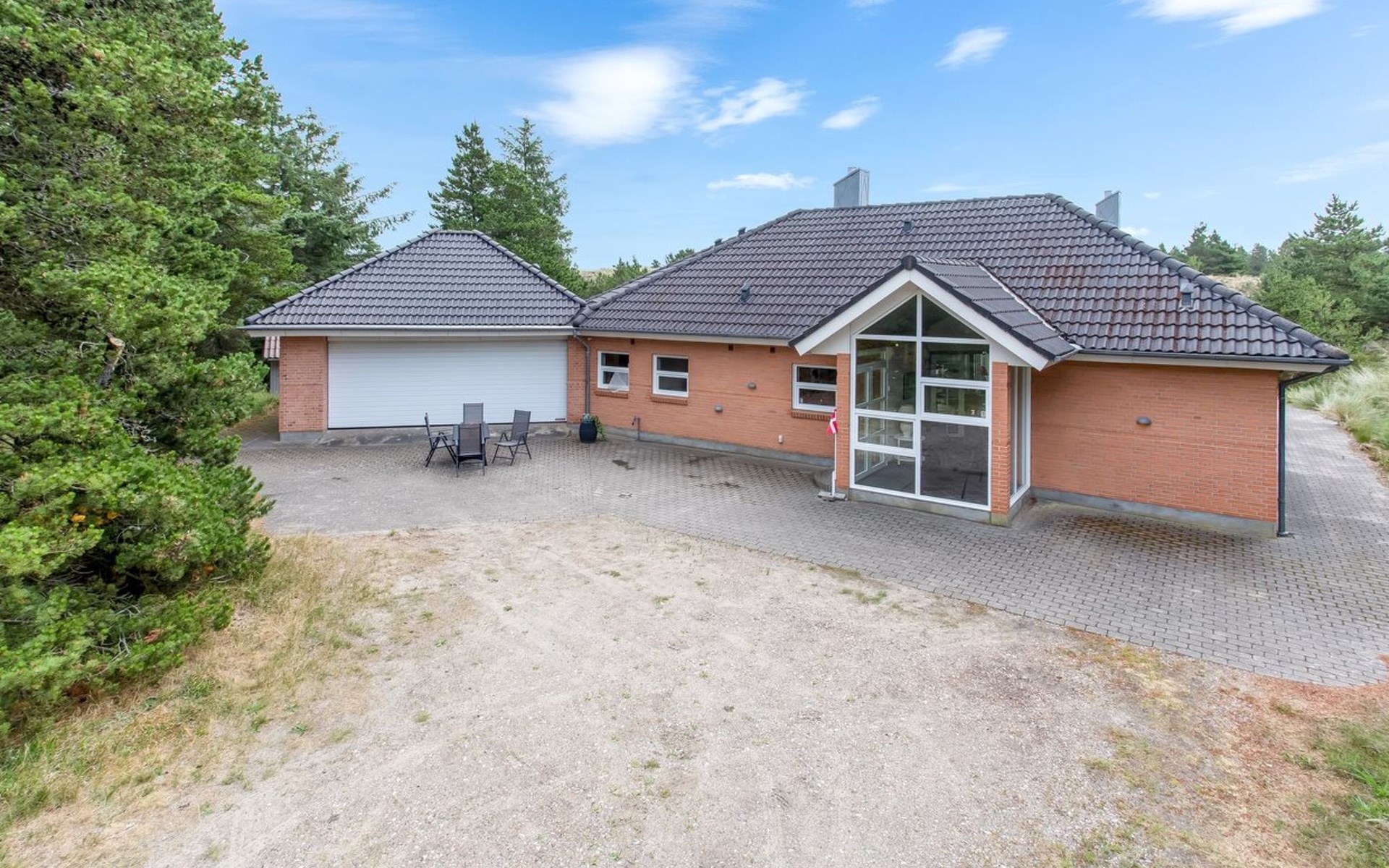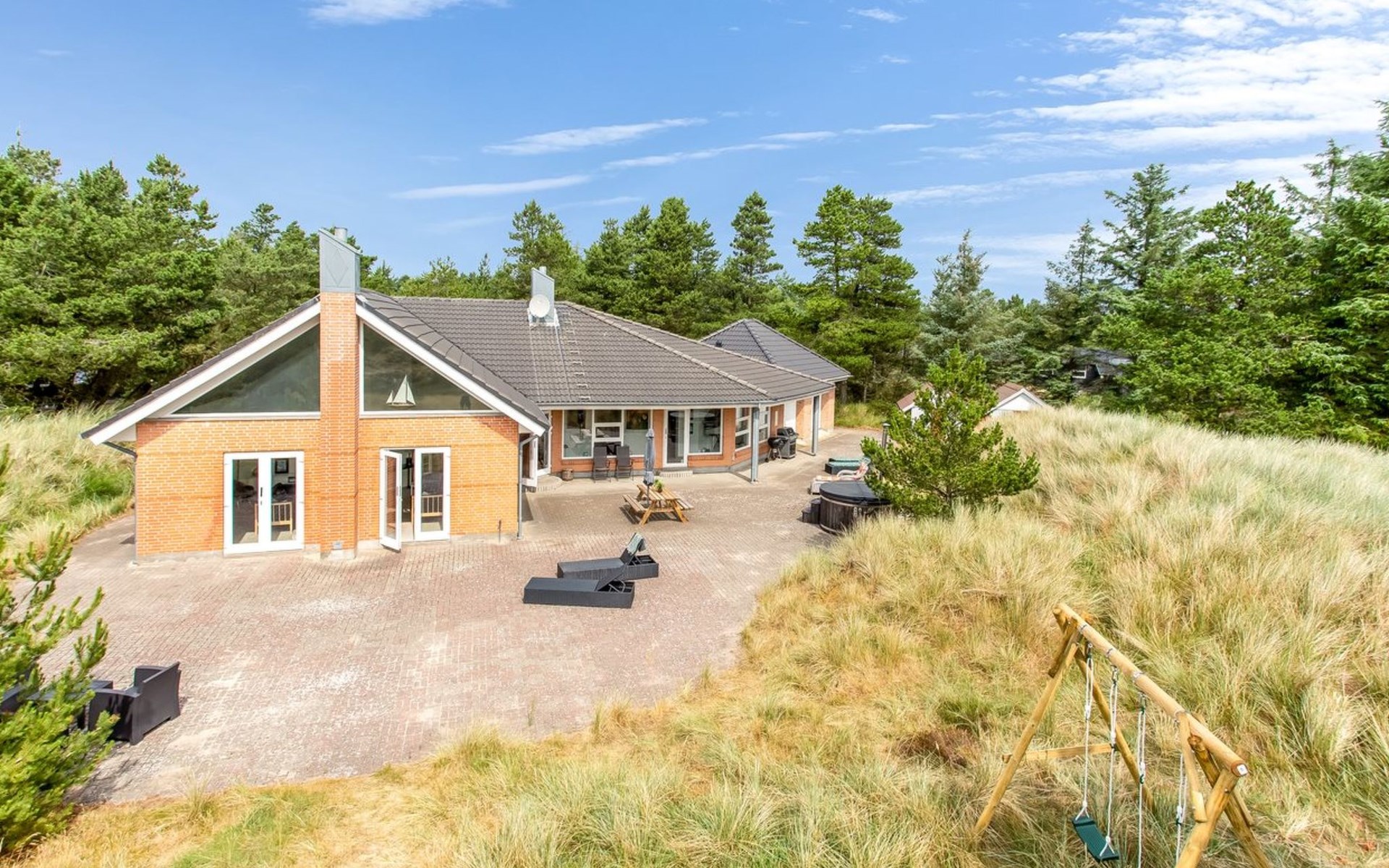 Single-family house, built in 2000. 1.2 km from the sea. Private: natural state property 3'000 m2. Terrace (100 m2), children's playground (swing). In the house: washing machine, tumble dryer. Parking at the house. E-charging station. Grocery 1 km. The owner does not accept any youth groups.