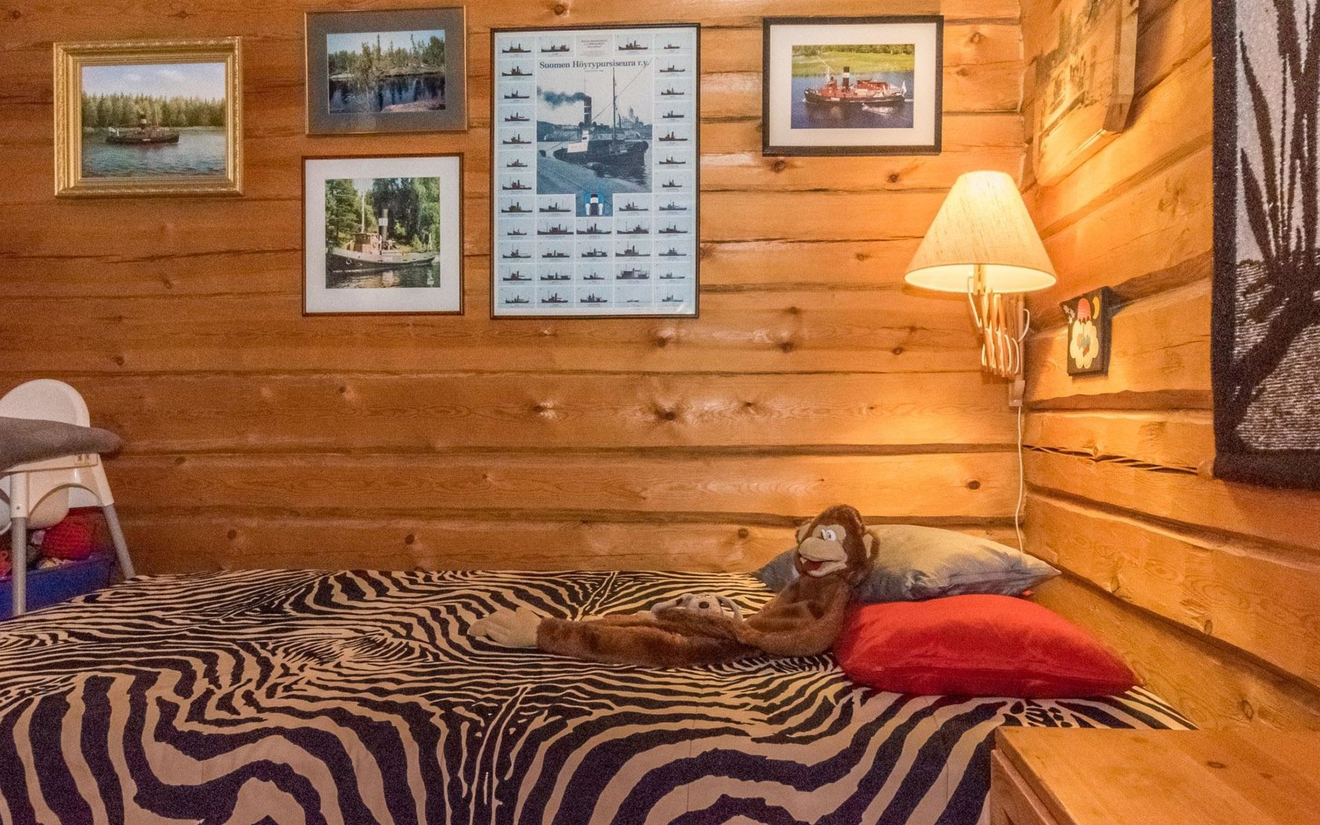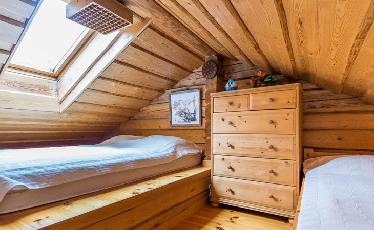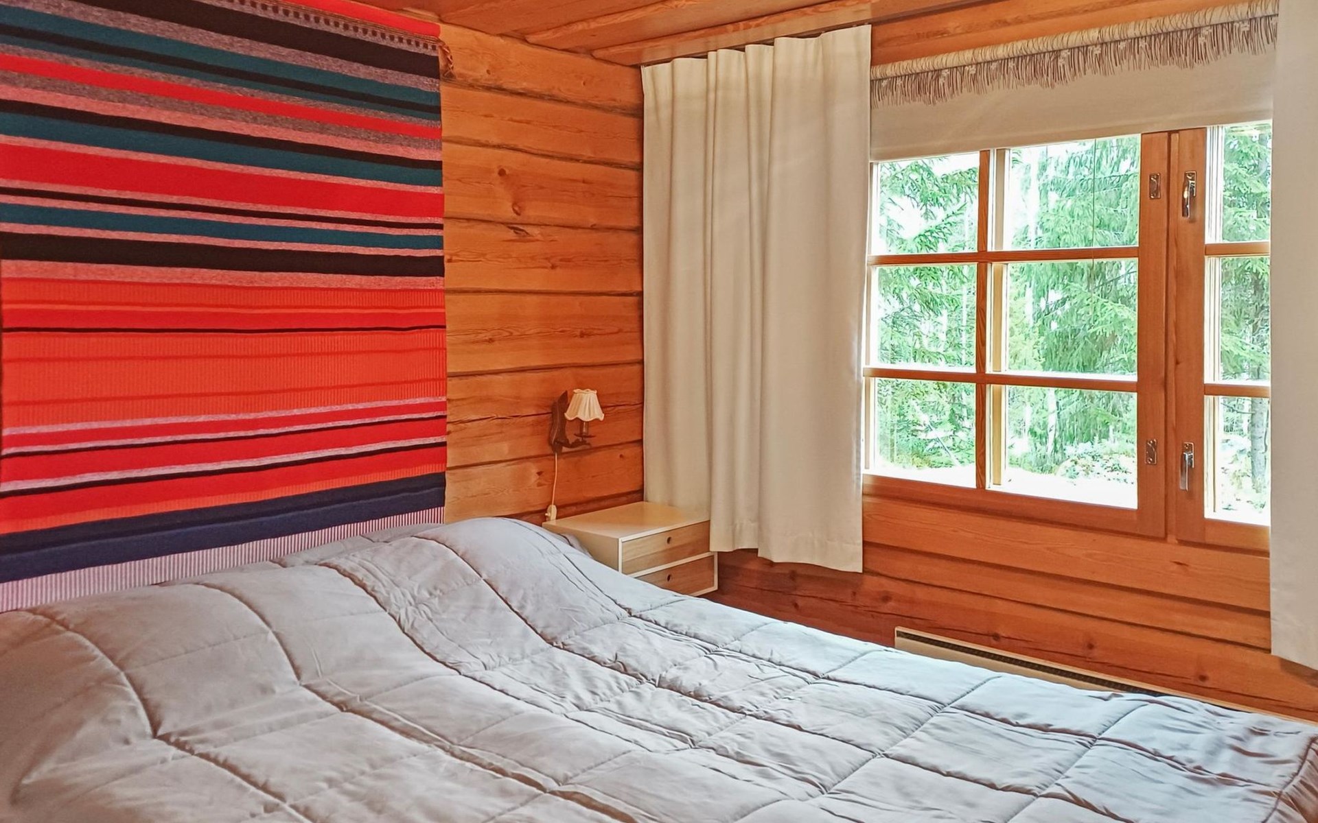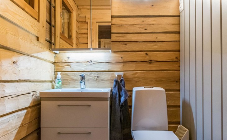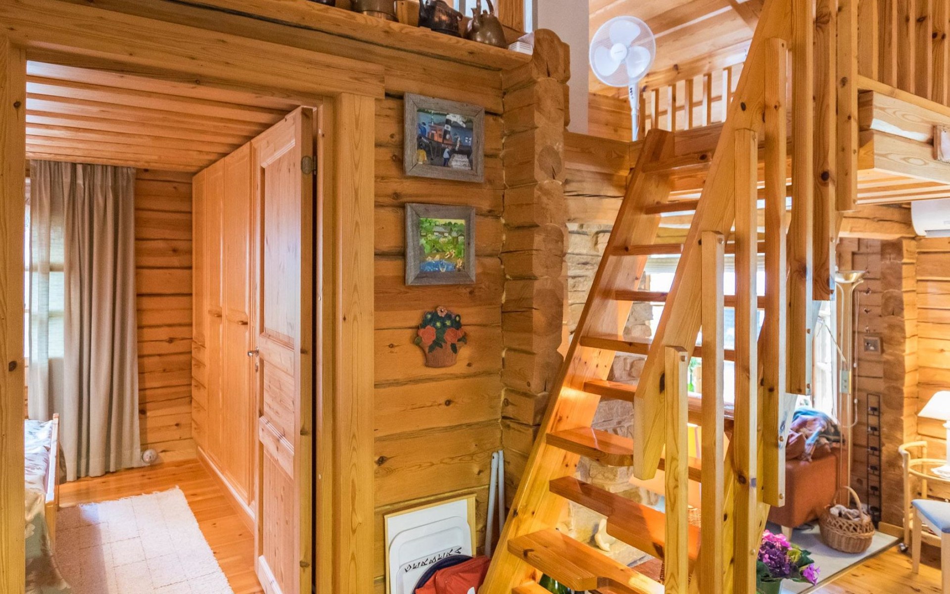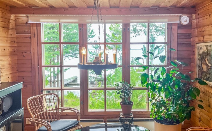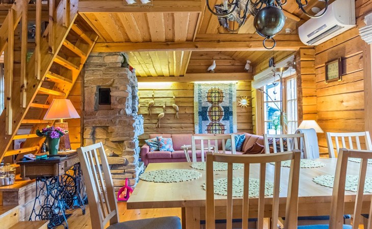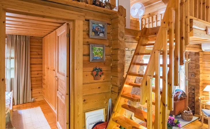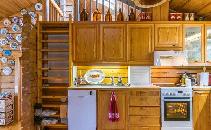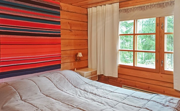 A log cottage (1998), living room and kitchen. Bedroom with a double bed (160 cm), and a sleeping alcove with one bed (120 cm). In addition, two lofts, one loft with two beds and the other with one bed. Indoor toilet. The fireplace is a cast iron hearth with a glass door.