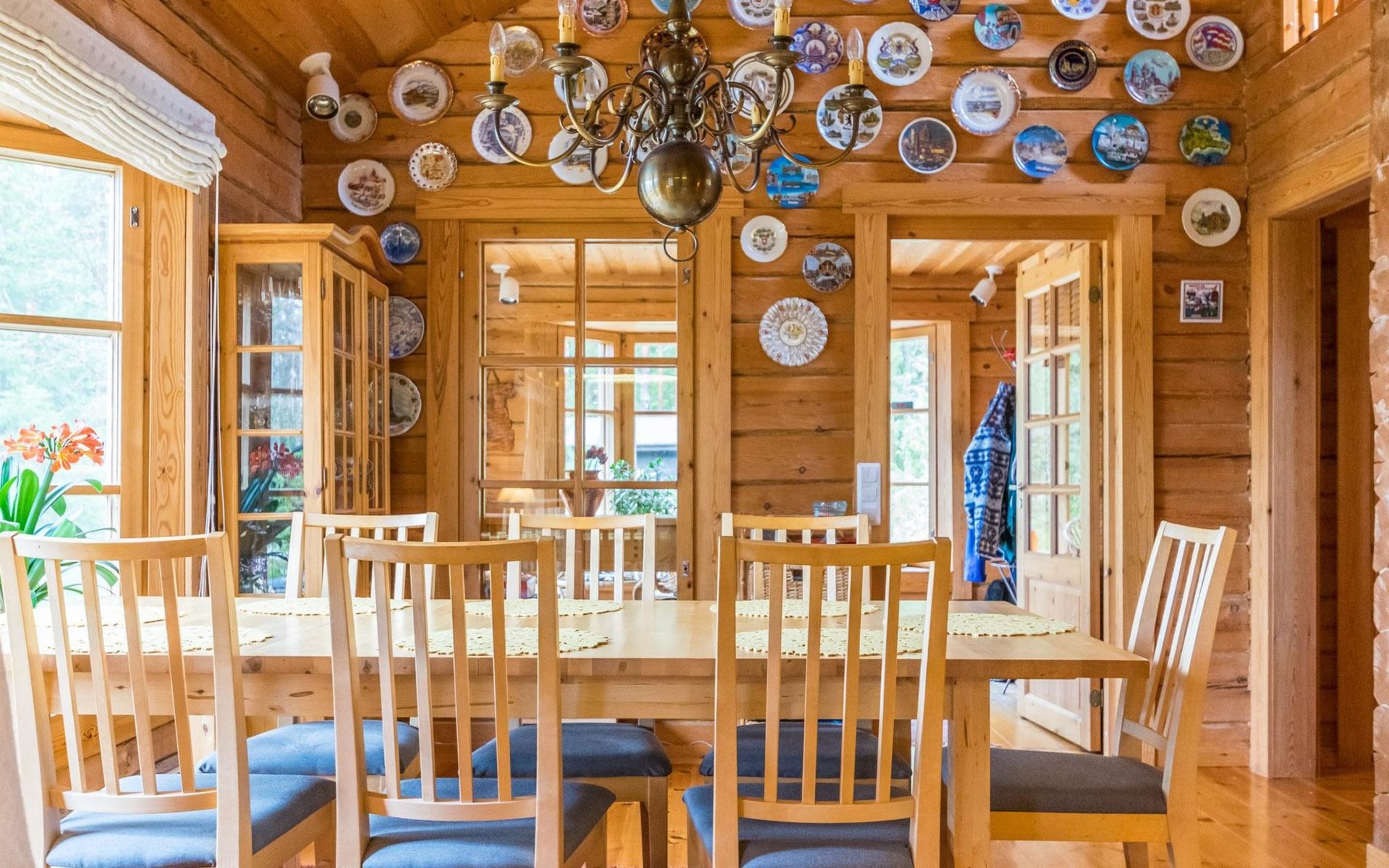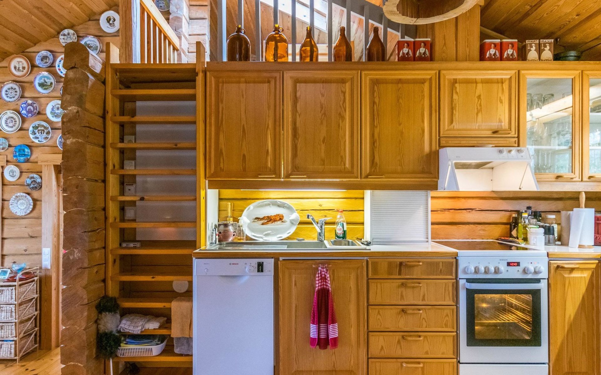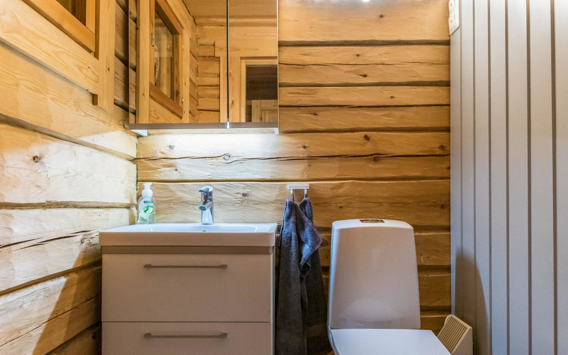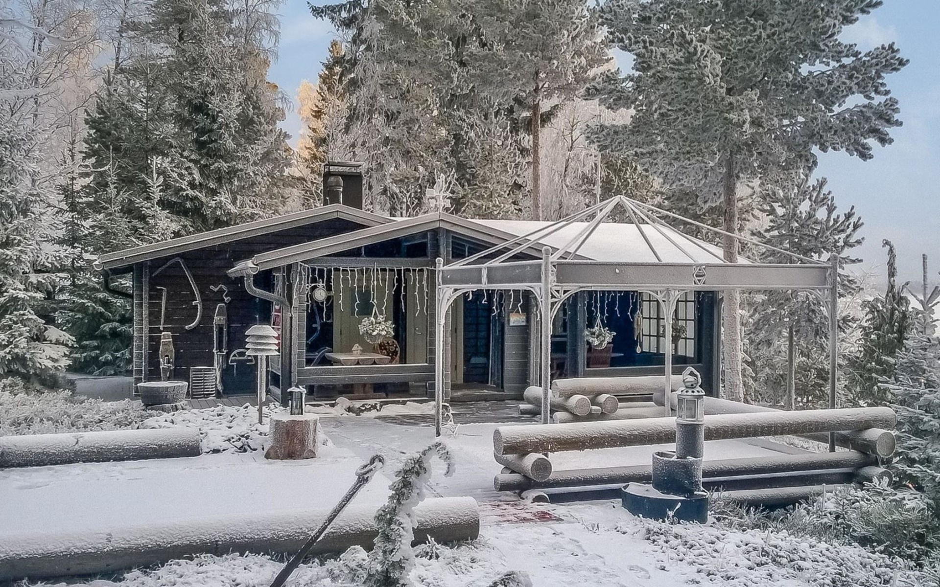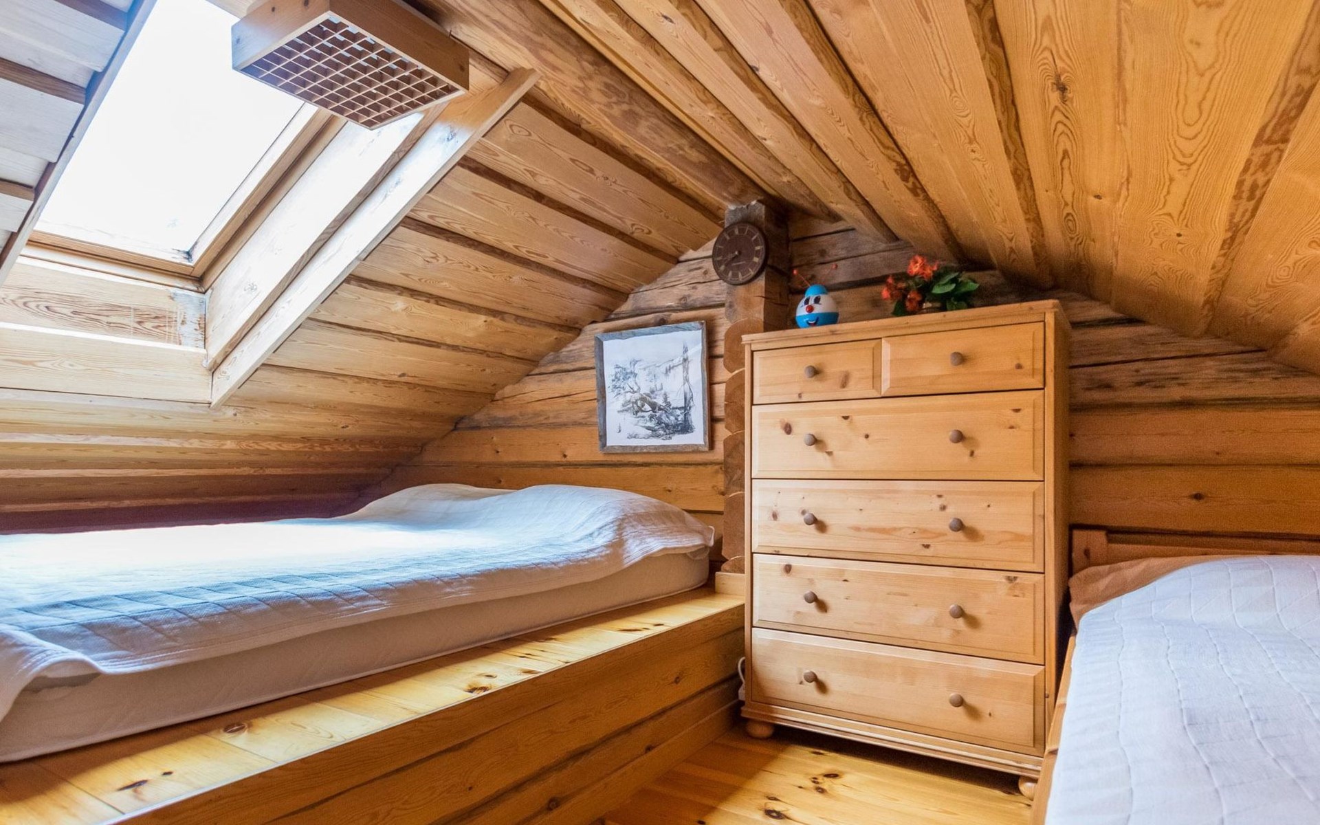 A log cottage (1998), living room and kitchen. Bedroom with a double bed (160 cm), and a sleeping alcove with one bed (120 cm). In addition, two lofts, one loft with two beds and the other with one bed. Indoor toilet. The fireplace is a cast iron hearth with a glass door.