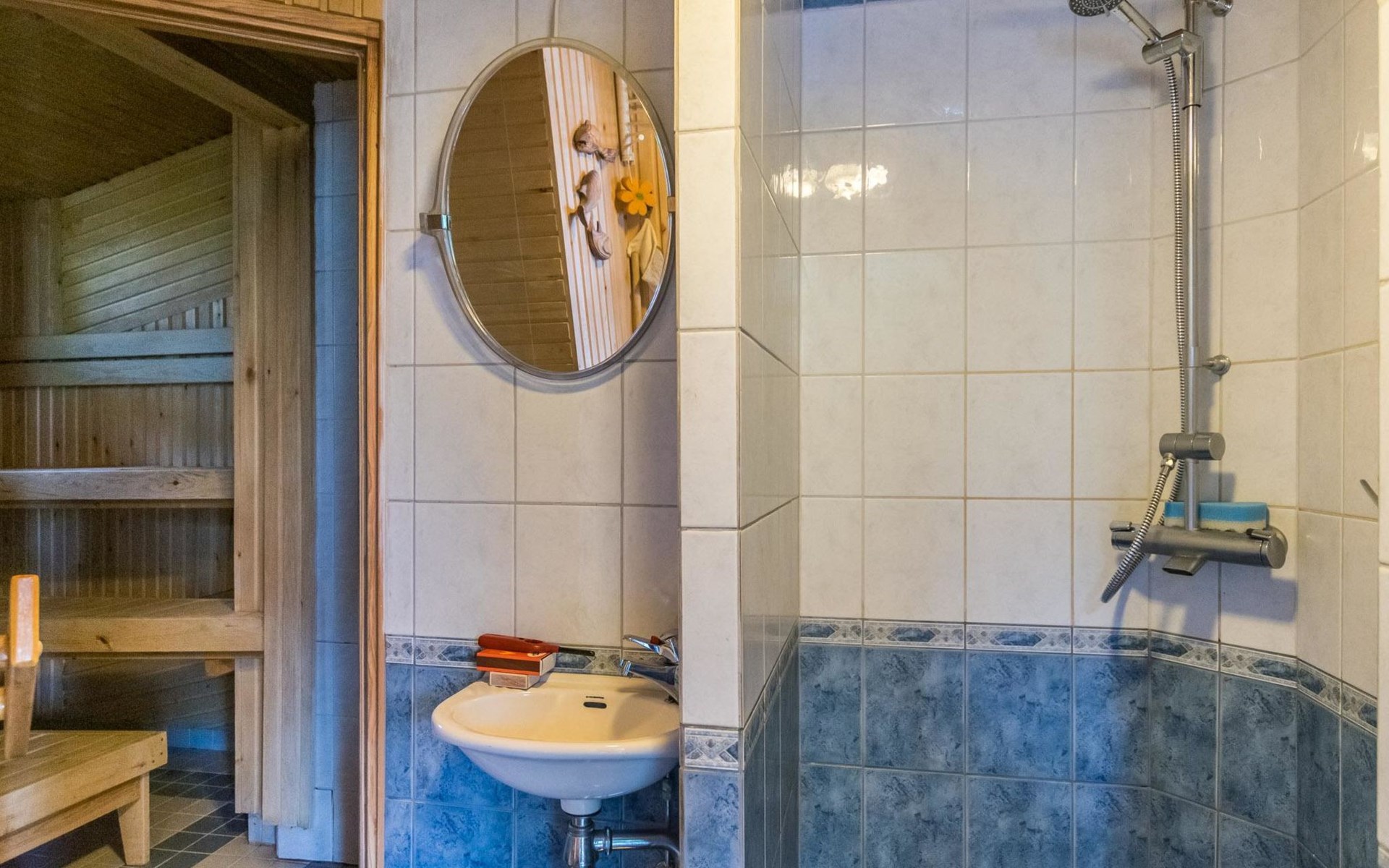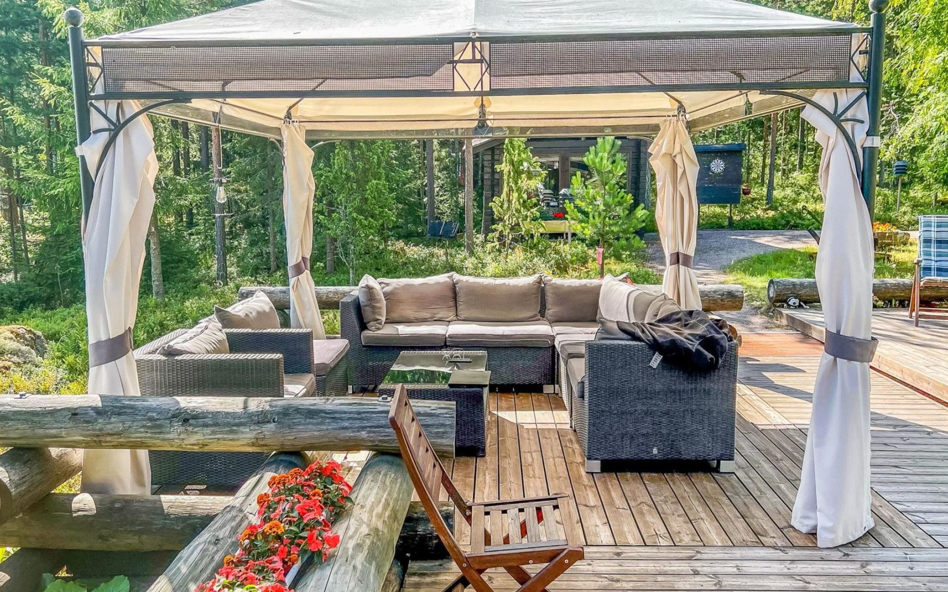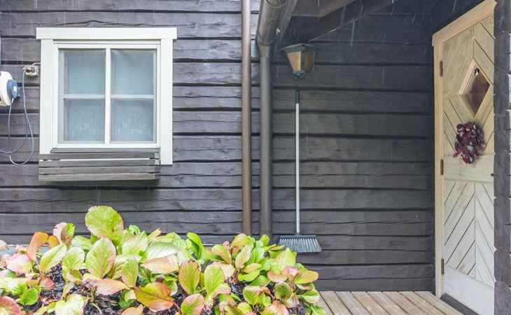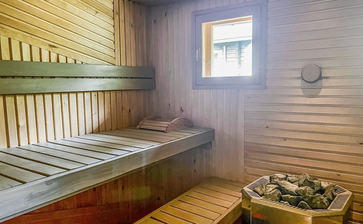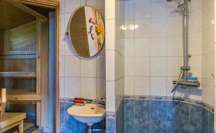 Beach sauna, which also has electric heating, so it can be used all year round. The washroom has a shower and a sauna, which has both a wood/electric heater. The sauna building also has a washing machine and a refrigerator. The sauna cabin's living area has an adult bunk bed (two beds), a sofa and a wicker chair seating group.