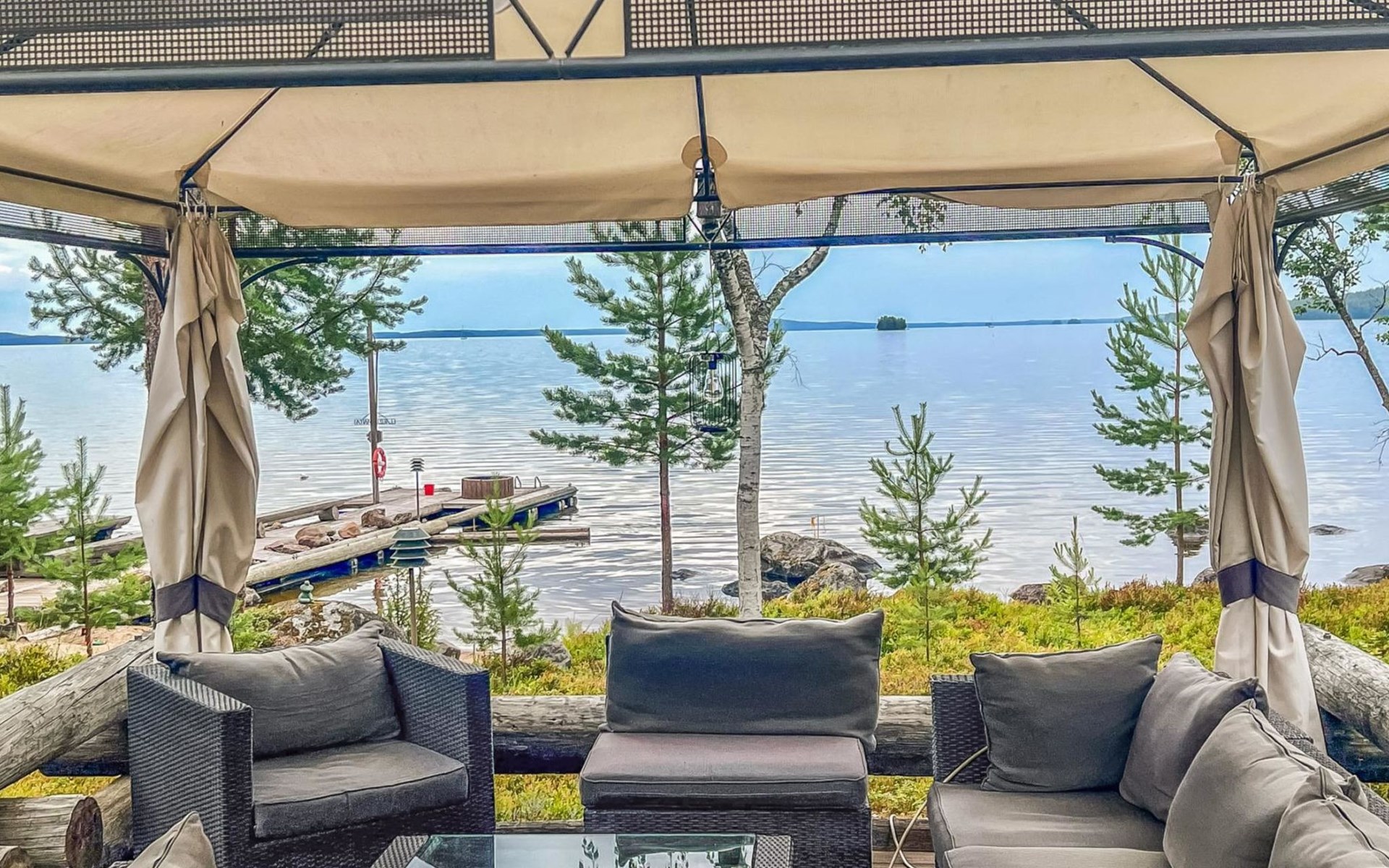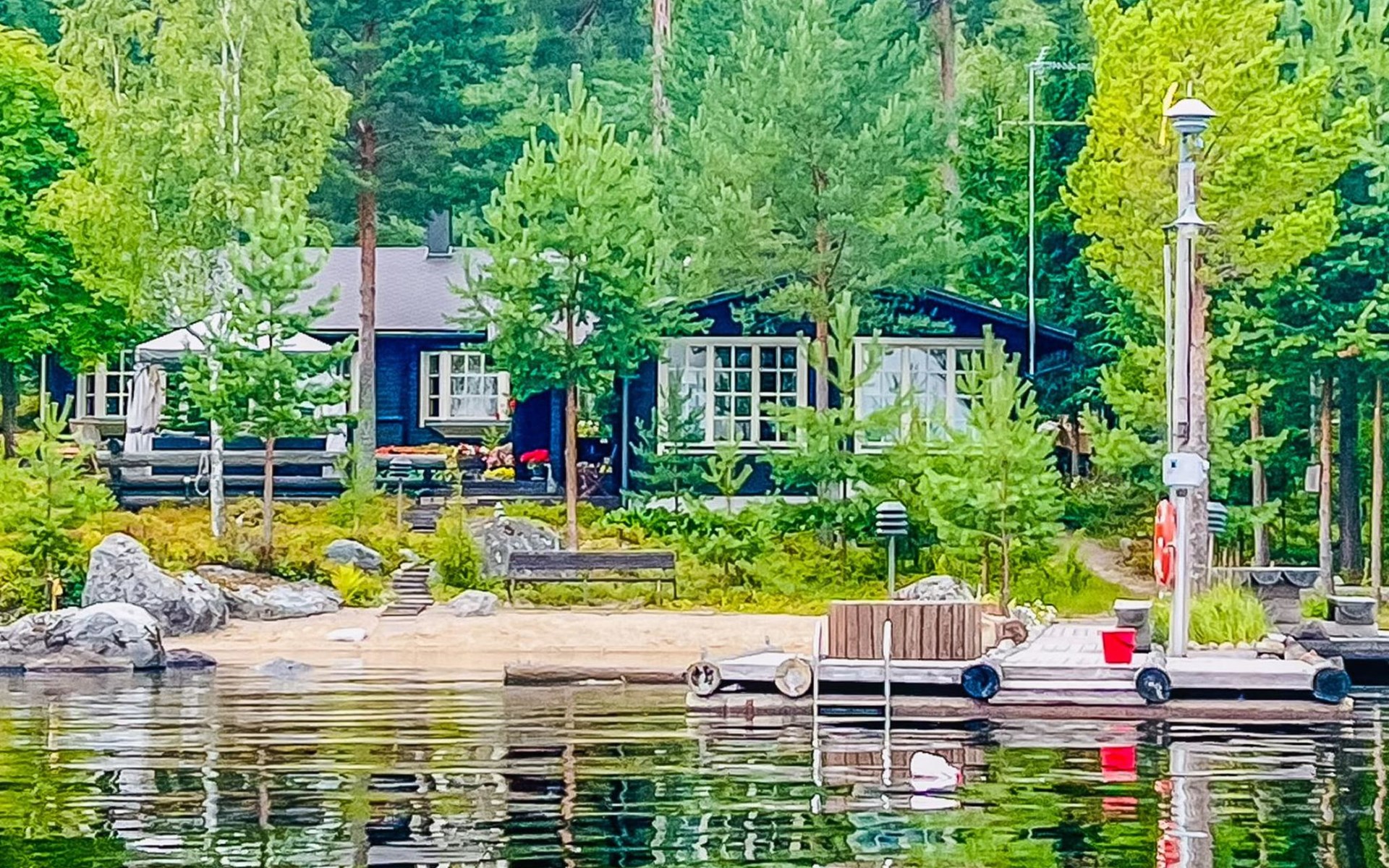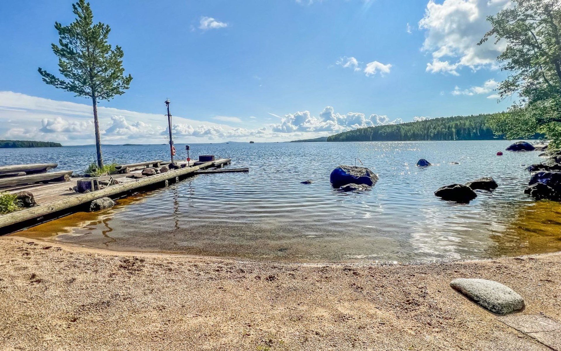 The cottage is 175 km from Helsinki, 72 km from Lahti and 20 km from the Padasjoki church village to the cottage yard. The lake is about 25 m from the cottage. The beach is shallow with natural sand. There is a sturdy pier on the shore, suitable for a large boat. The water depth at the end of the pier is about 1-1.5 m.