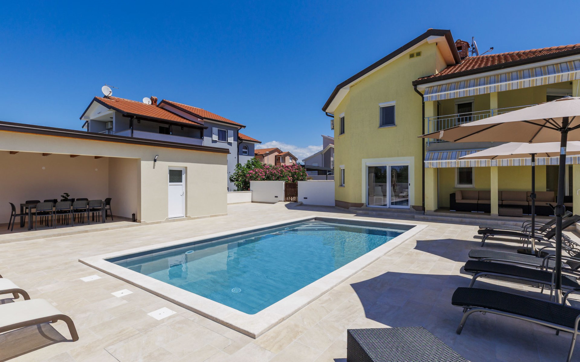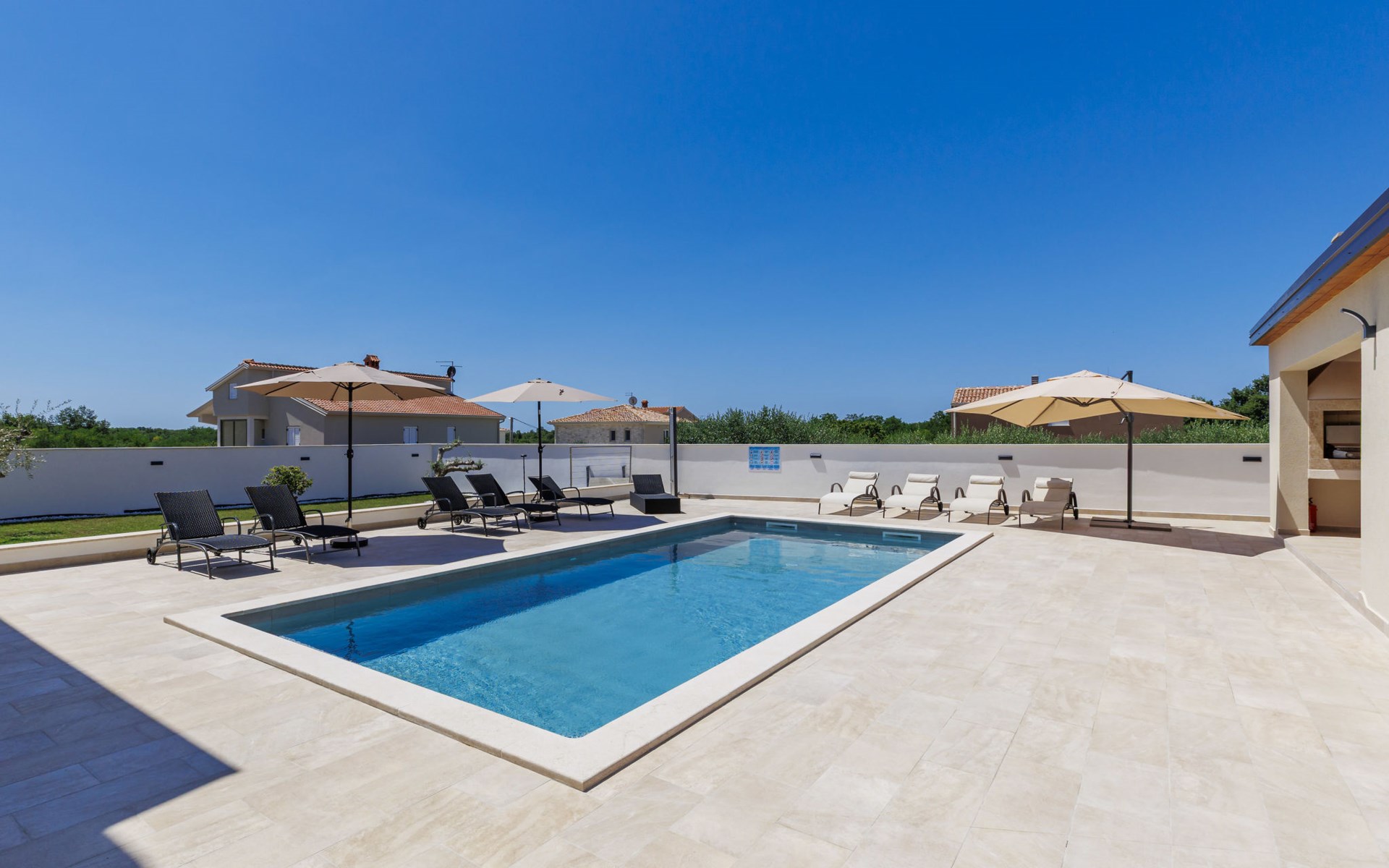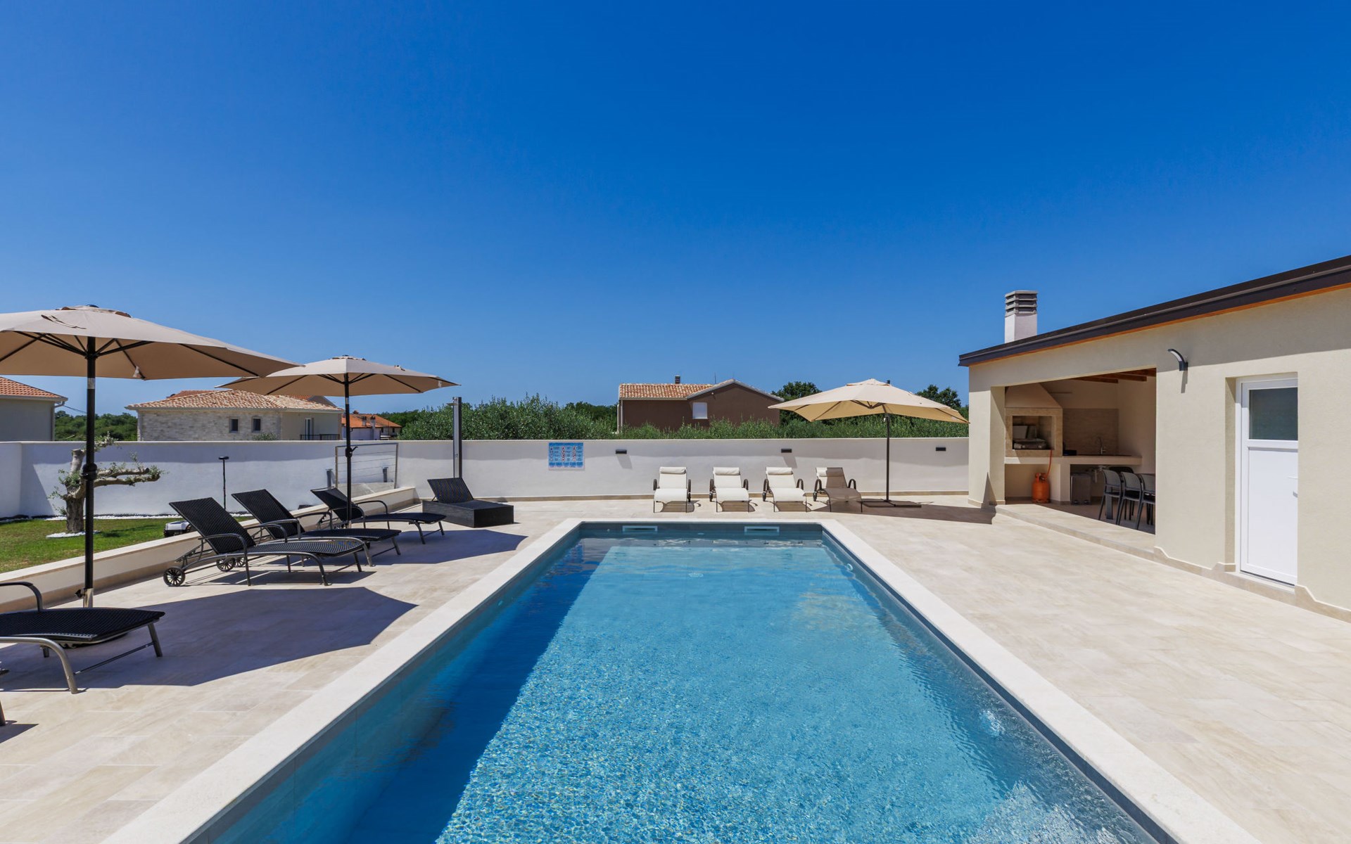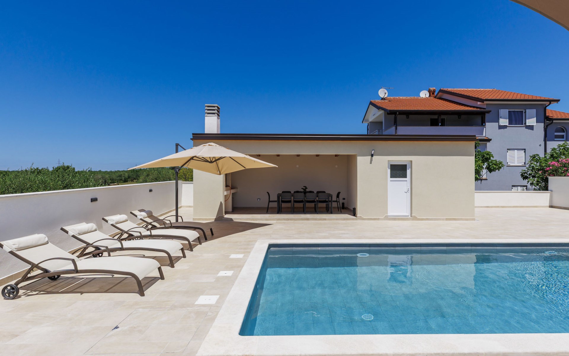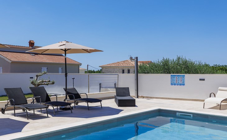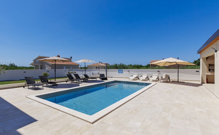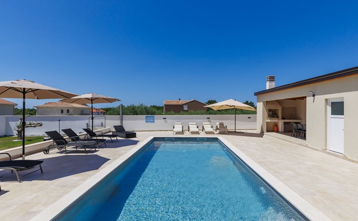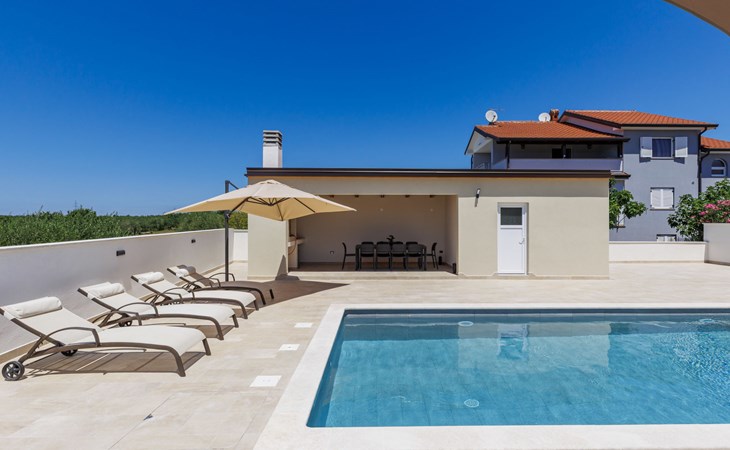 Beautiful single-family house "Villa Lucia", 2 storeys. In the hamlet Srbarica 3 km from the centre of Umag, in a sunny position, 2.5 km from the sea, 2.5 km from the beach, in a cul-de-sac. Private: property 850 m2 (fenced), garden with lawn, swimming pool angular (9 x 4 m, depth 145 cm, seasonal availability: 01.May. - 15.Oct.) with internal staircase. Outdoor shower, barbecue. In the house: internet access, washing machine. Parking (for 3 cars) at the house on the premises. Shop 1 km, supermarket 2 km, restaurant 500 m, bus stop 4.4 km, pebble beach 2.5 km, rocky beach 2.5 km, public bathing area 2.5 km. Golf course (18 hole) 10 km, tennis 3 km, walking paths from the house 500 m, cycle lane 550 m. Nearby attractions: aquapark 18 km, cave Mramornica 15 km. Please note: suitable for families. The owner does not accept any youth groups. Airfield 60 km from the property. The photograph shows a typical example. The house consists of 3 apartments rented as one unit: one apartment on the ground floor and two apartments on the first floor. The allowed number of people in and around the property / pool, grill and yard is 10 persons, outside visits prohibited.