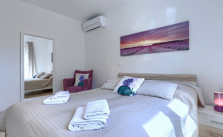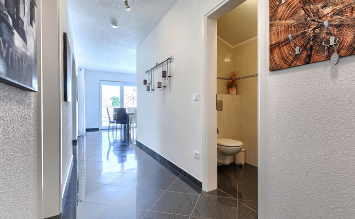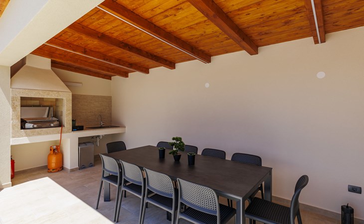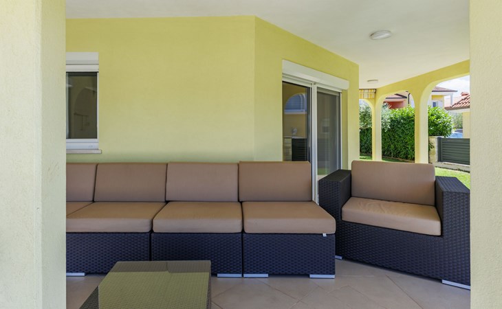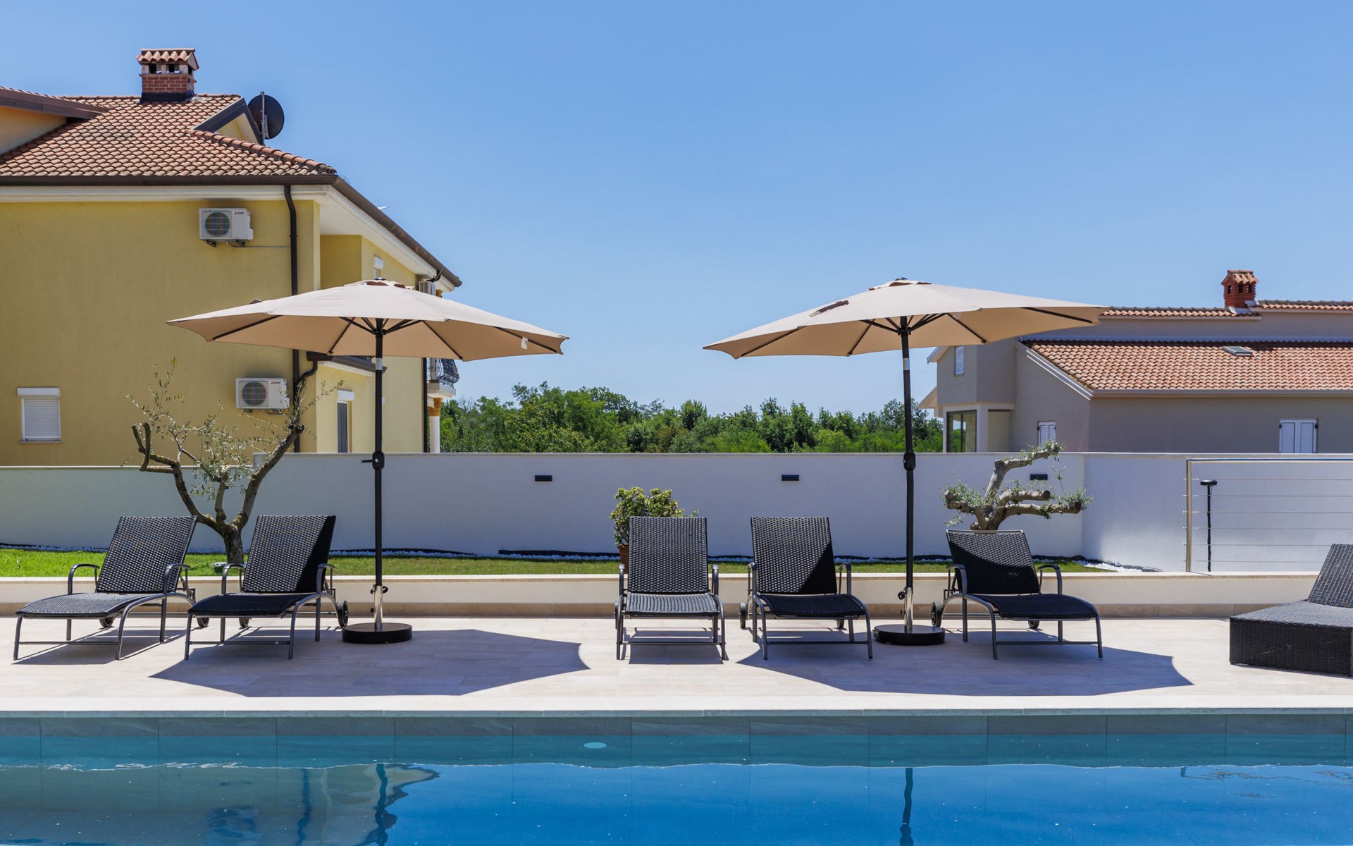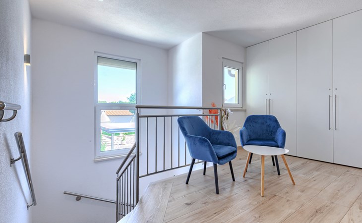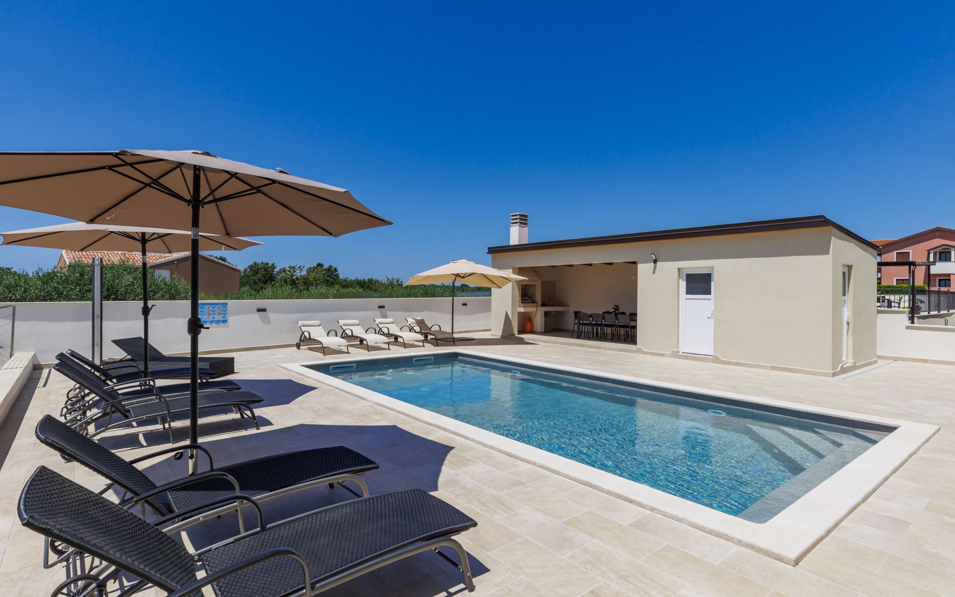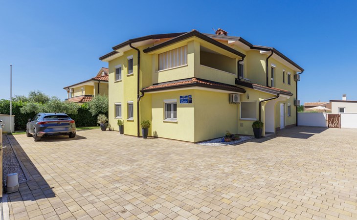 Beautiful single-family house "Villa Lucia", 2 storeys. In the hamlet Srbarica 3 km from the centre of Umag, in a sunny position, 2.5 km from the sea, 2.5 km from the beach, in a cul-de-sac. Private: property 850 m2 (fenced), garden with lawn, swimming pool angular (9 x 4 m, depth 145 cm, seasonal availability: 01.May. - 15.Oct.) with internal staircase. Outdoor shower, barbecue. In the house: internet access, washing machine. Parking (for 3 cars) at the house on the premises. Shop 1 km, supermarket 2 km, restaurant 500 m, bus stop 4.4 km, pebble beach 2.5 km, rocky beach 2.5 km, public bathing area 2.5 km. Golf course (18 hole) 10 km, tennis 3 km, walking paths from the house 500 m, cycle lane 550 m. Nearby attractions: aquapark 18 km, cave Mramornica 15 km. Please note: suitable for families. The owner does not accept any youth groups. Airfield 60 km from the property. The photograph shows a typical example. The house consists of 3 apartments rented as one unit: one apartment on the ground floor and two apartments on the first floor. The allowed number of people in and around the property / pool, grill and yard is 10 persons, outside visits prohibited.