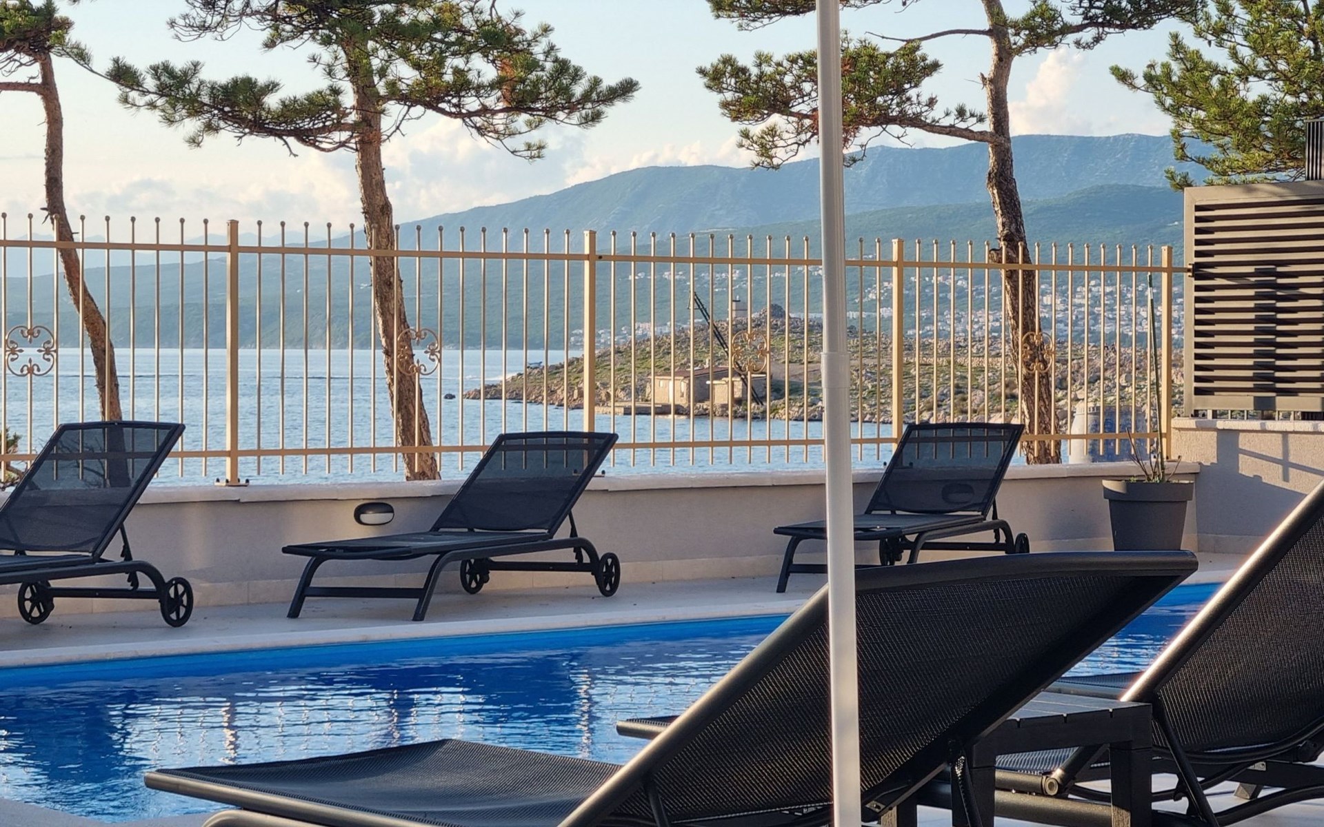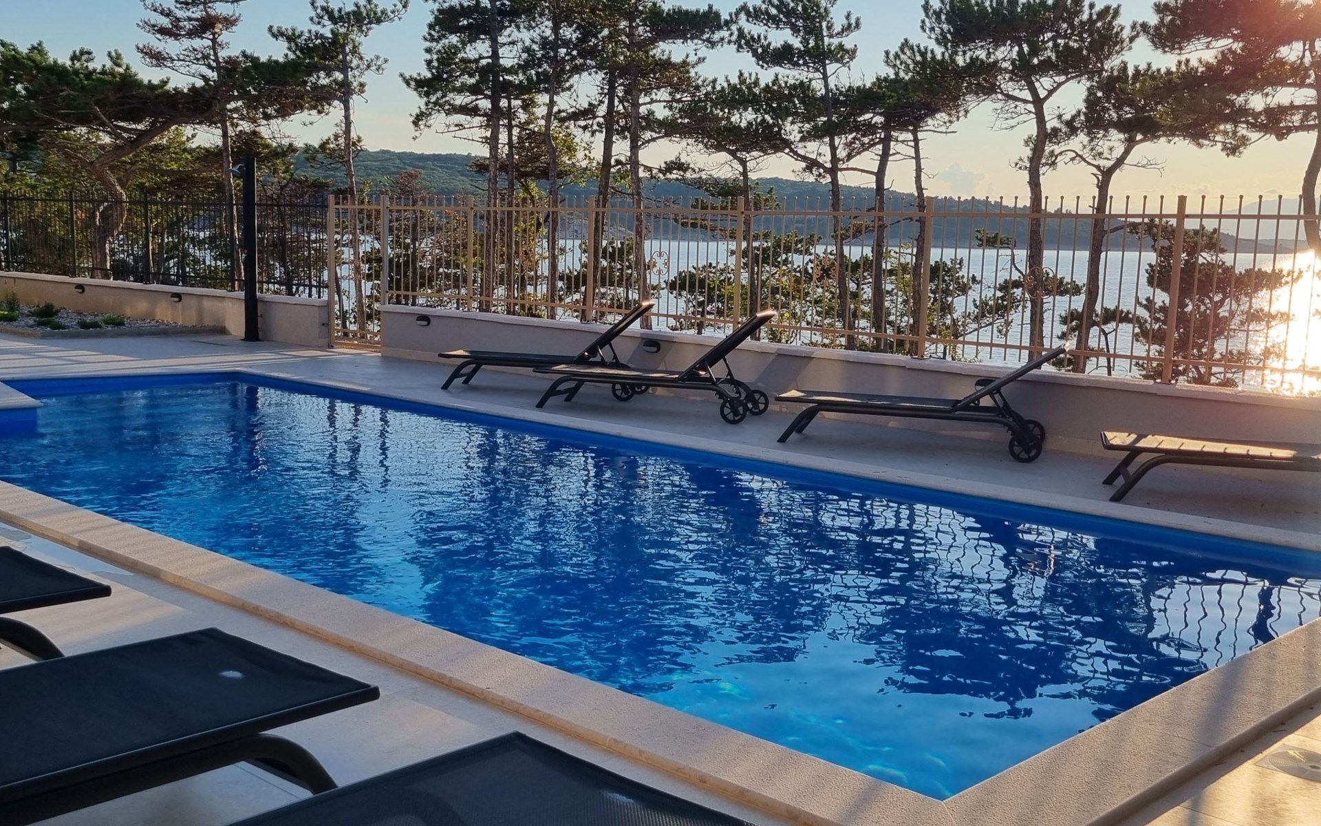 The furnished, covered terrace (11 m2) offers a beautiful view of the pool and the sea. The pool area on the ground floor is equipped with sun loungers, parasols and an outdoor shower and offers direct access to the sea for comfortable swimming. A communal laundry room on the ground floor includes a washing machine, washing capsules/detergent and an iron for guests' use.