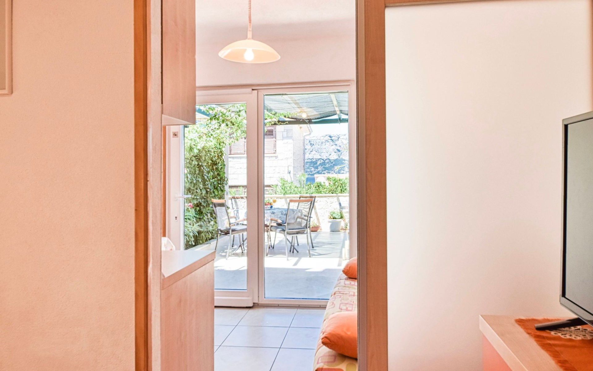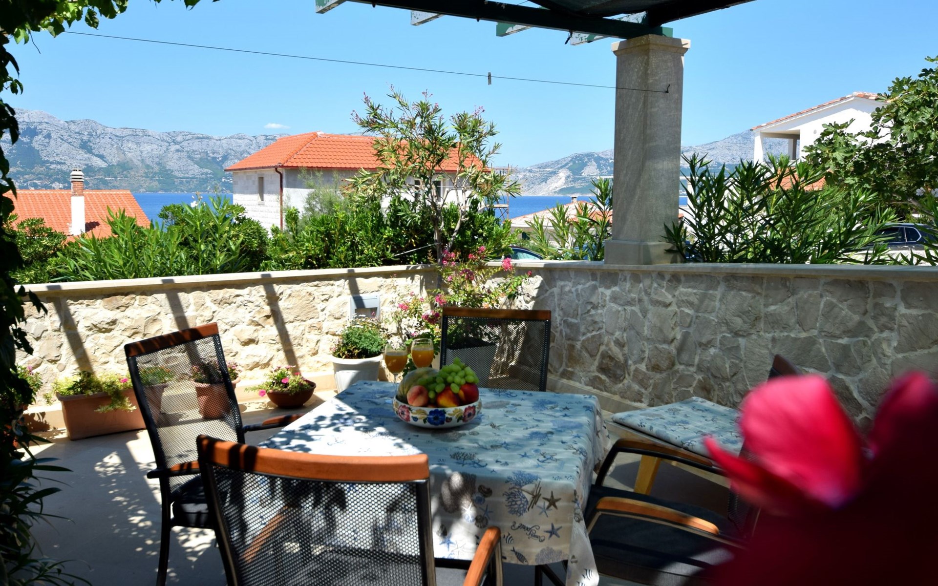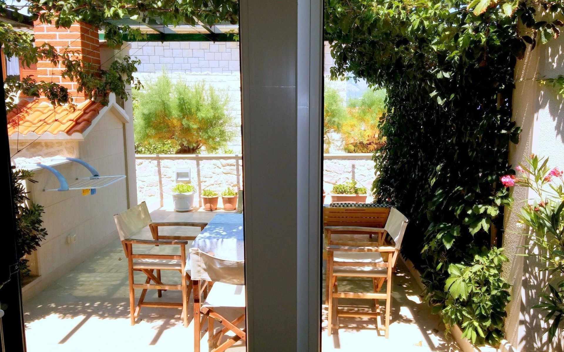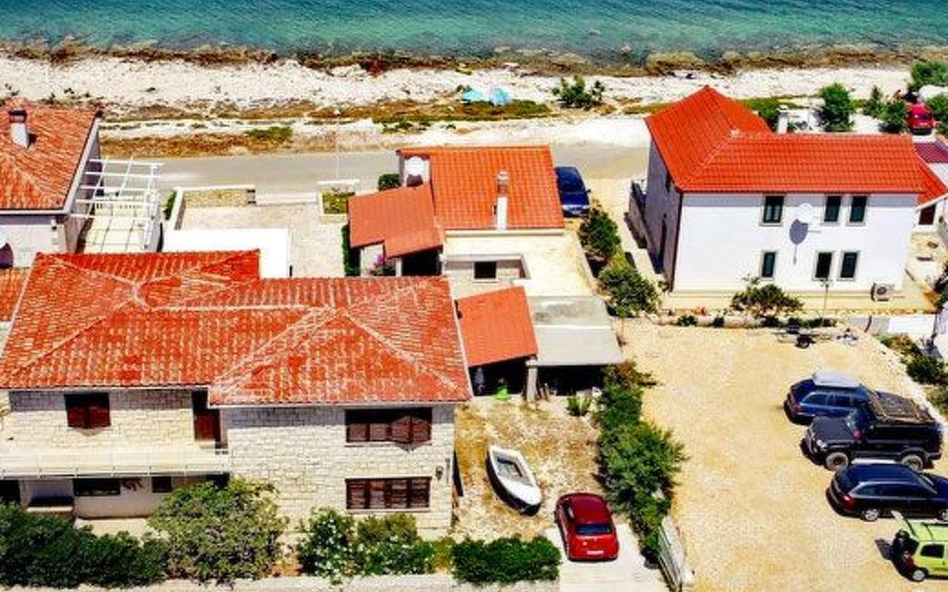 Each apartment has its own parking space in front of the house, separate entrance, shaded terrace with furniture, a bedroom with a double-bed, a kitchen with dining area and living room in one larger room, as well as bathroom with shower.