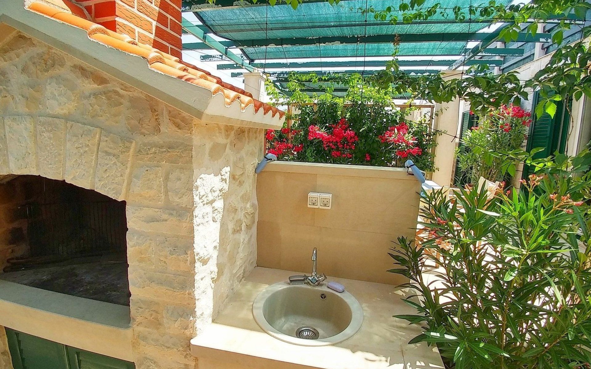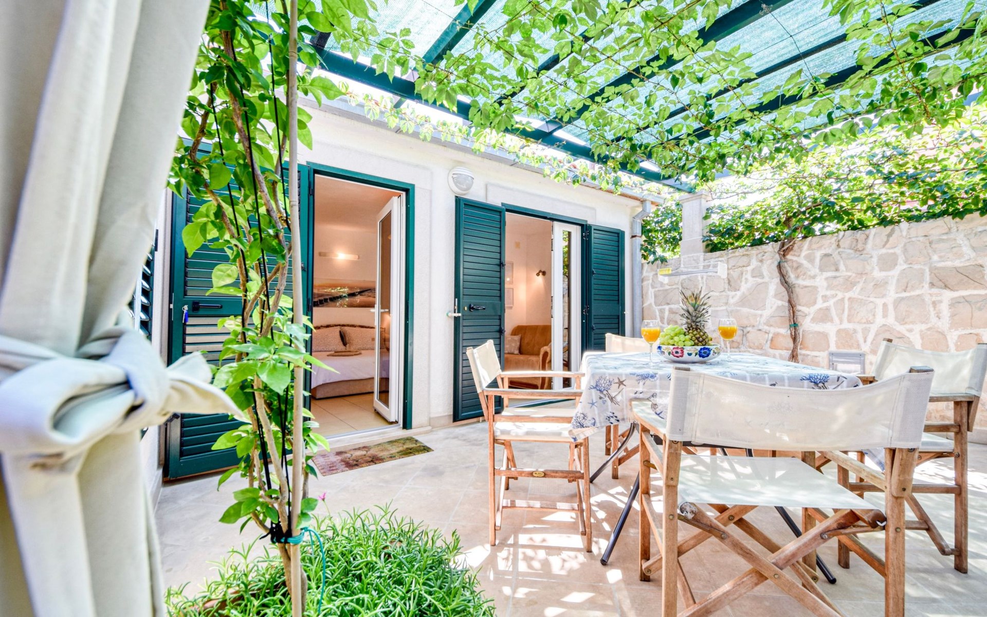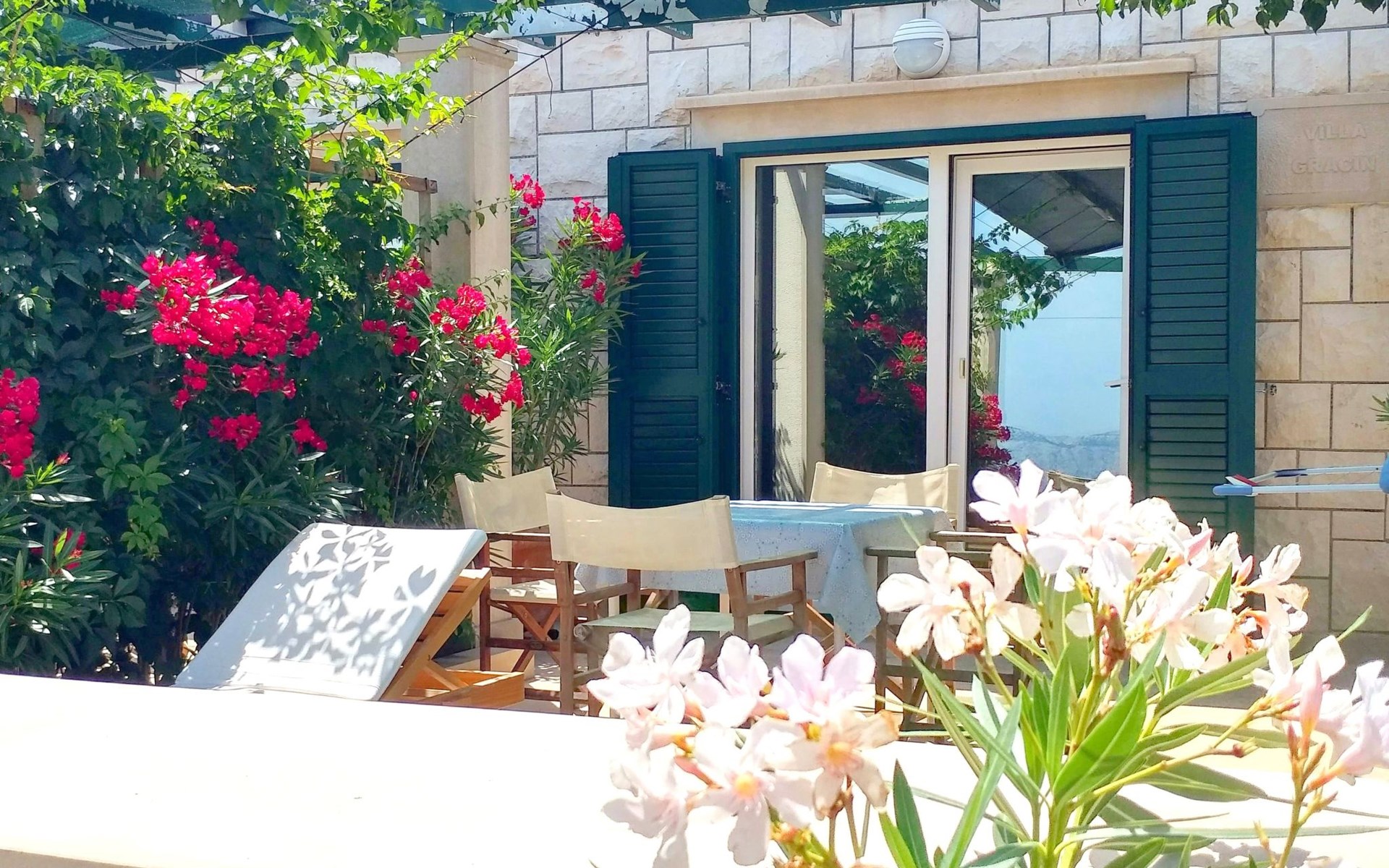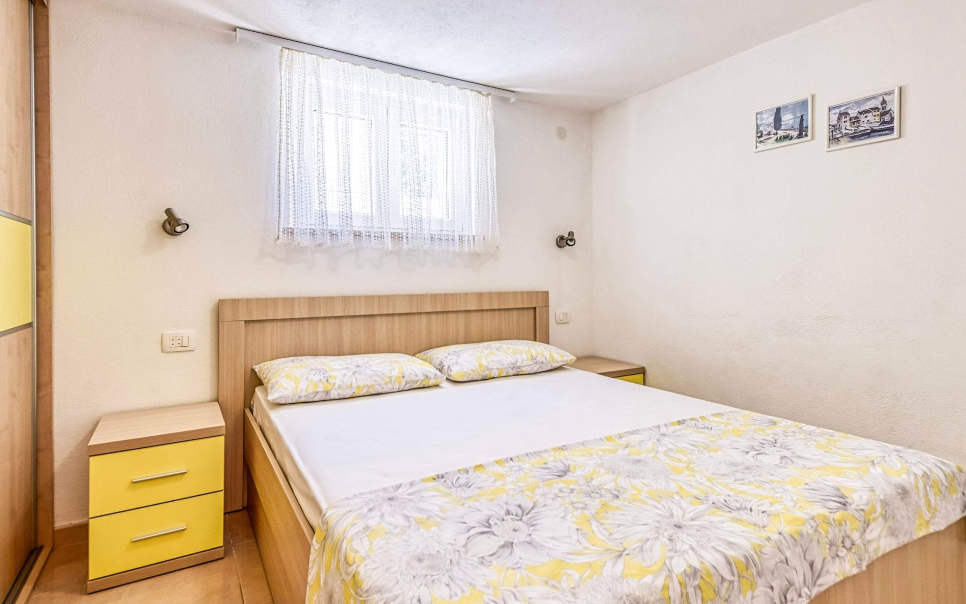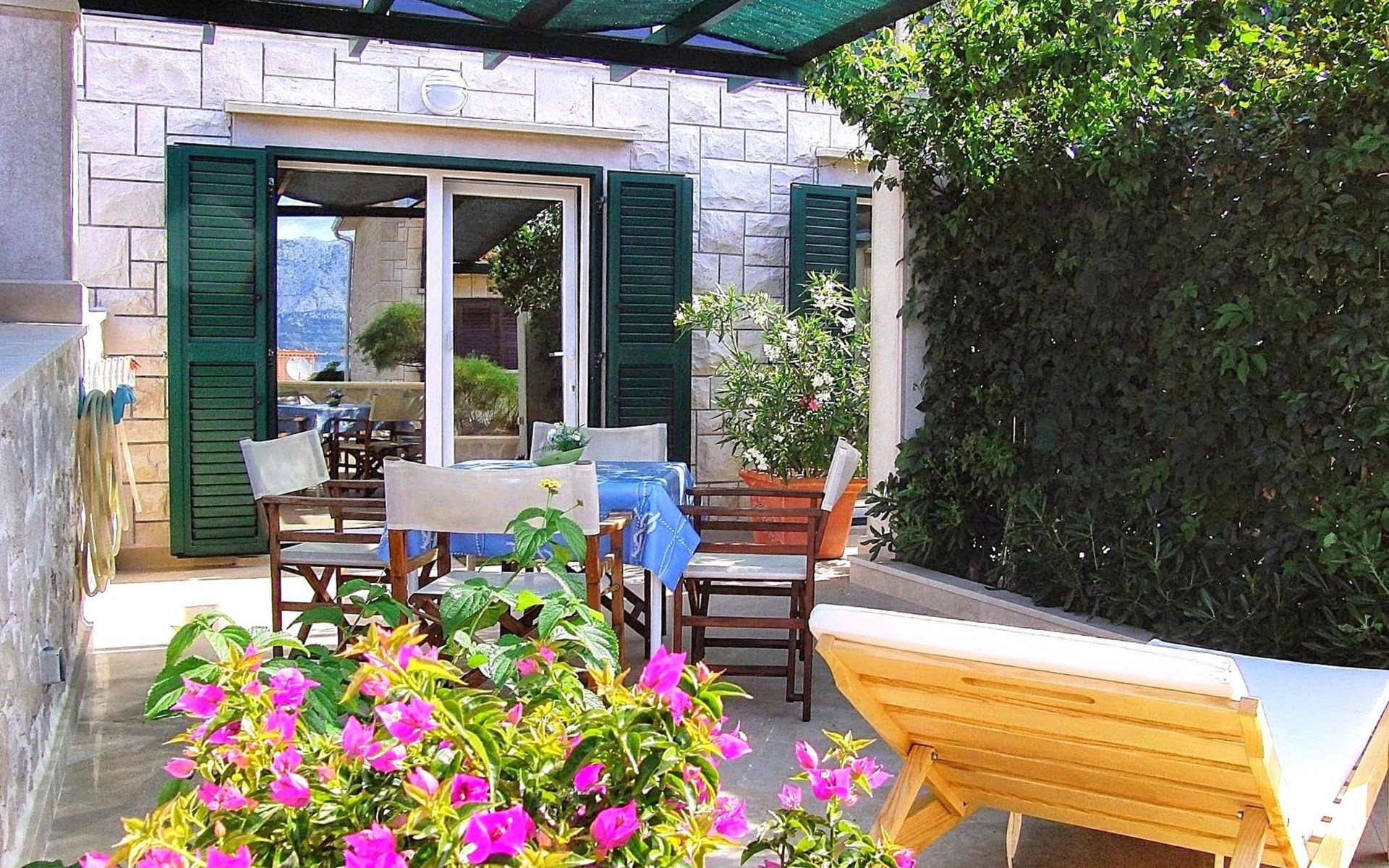 Each apartment has its own parking space in front of the house, separate entrance, shaded terrace with furniture, a bedroom with a double-bed, a kitchen with dining area and living room in one larger room, as well as bathroom with shower.
