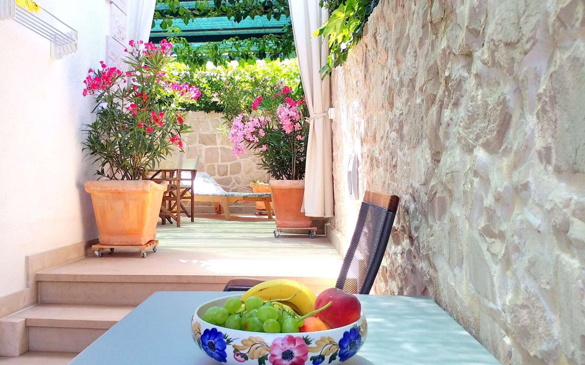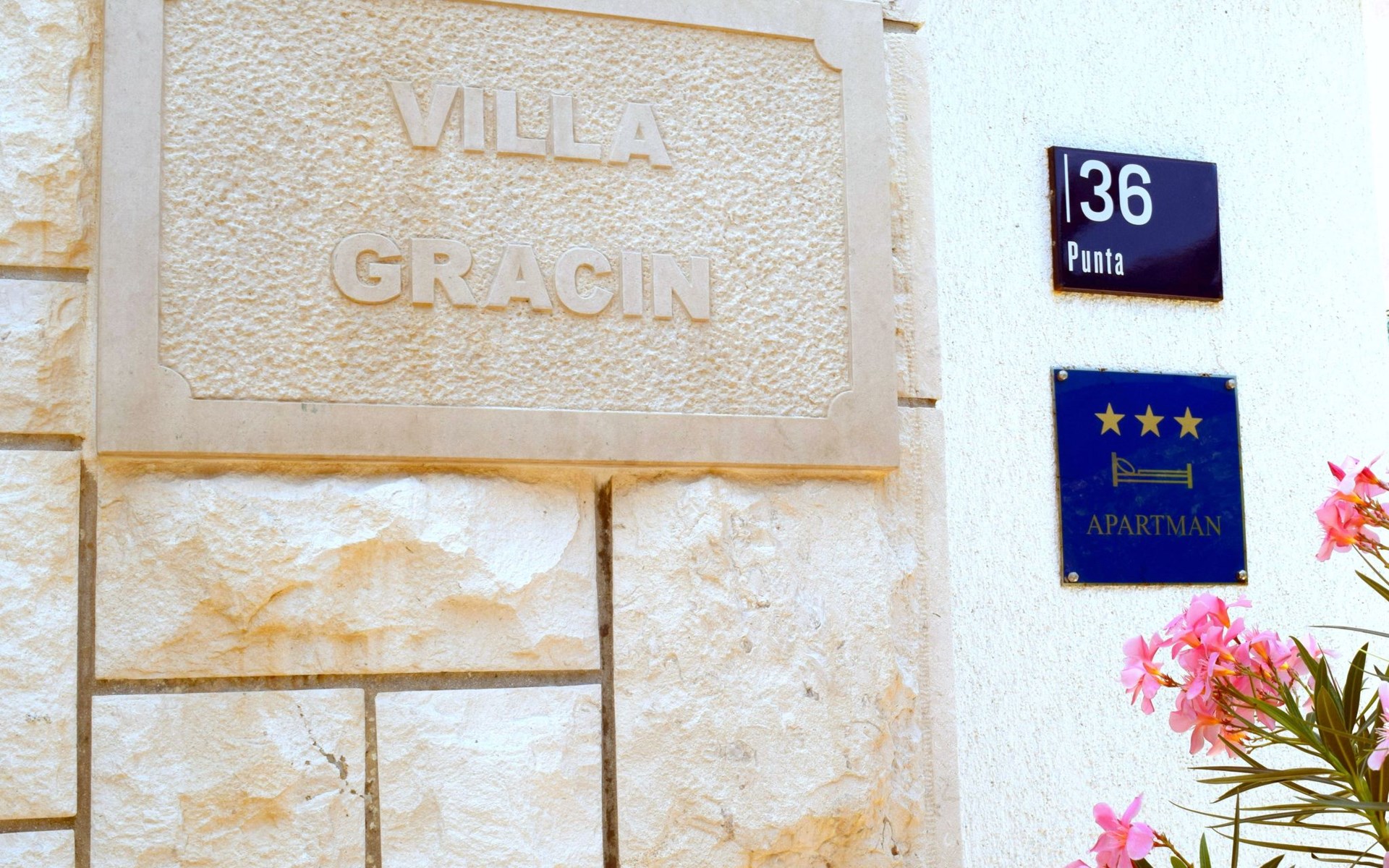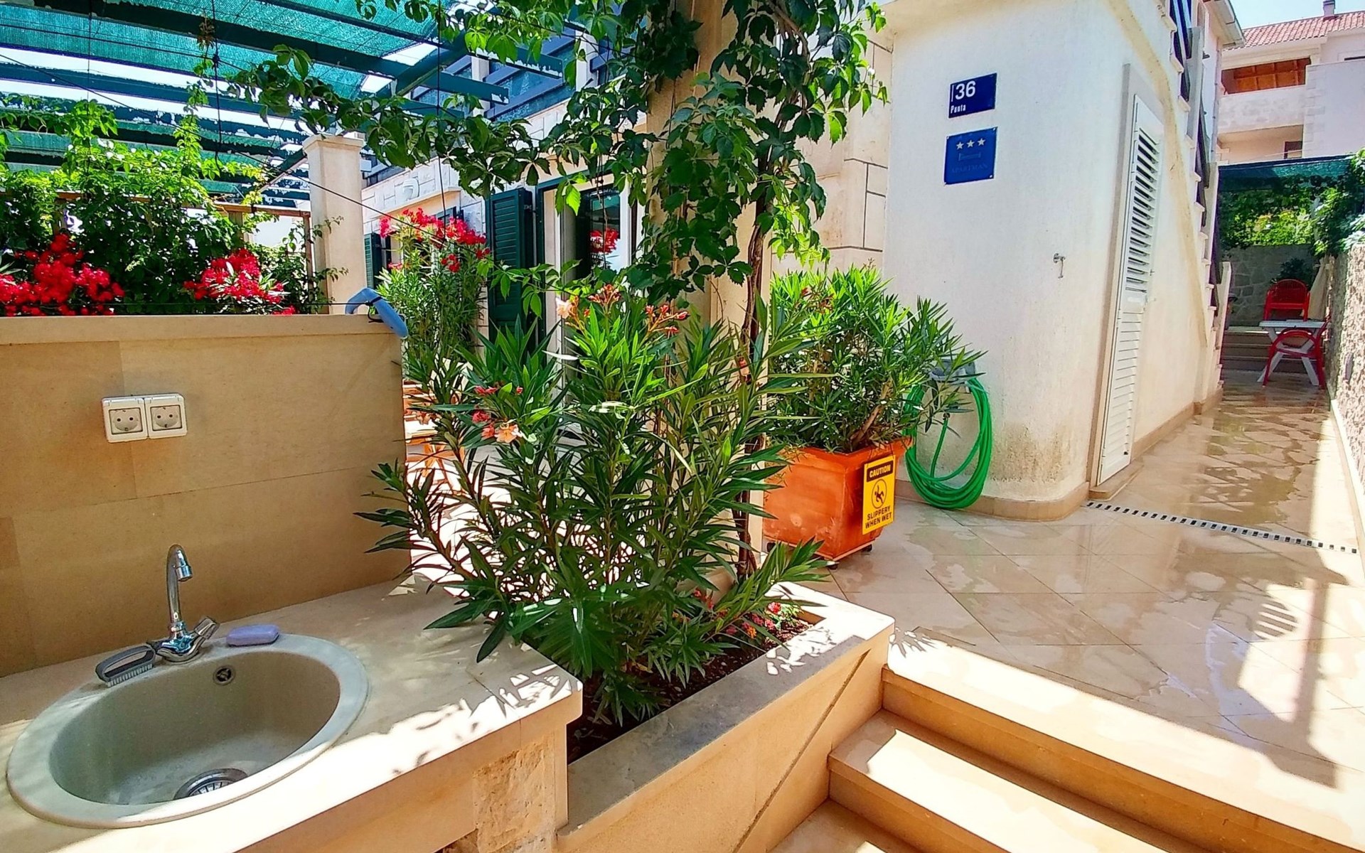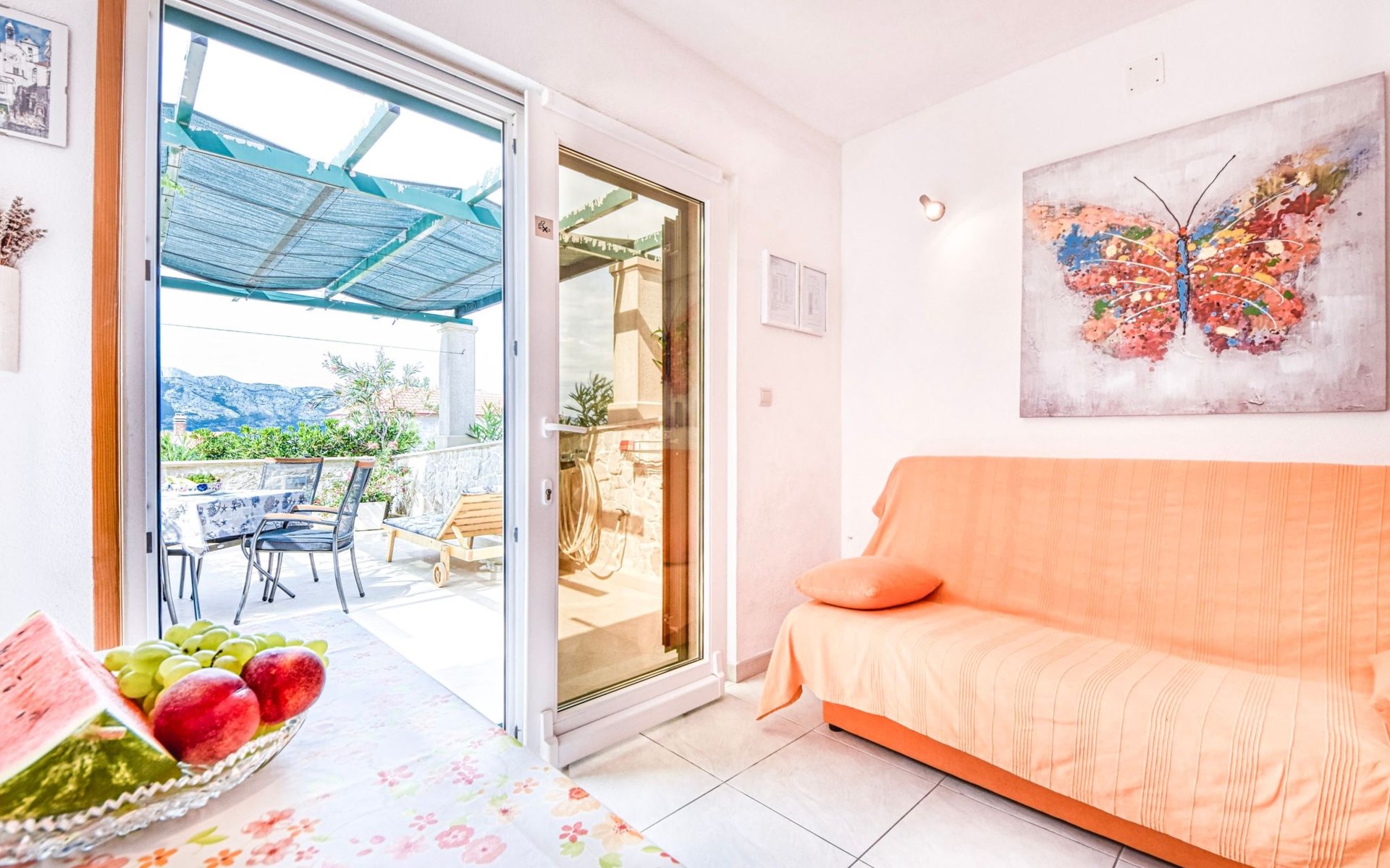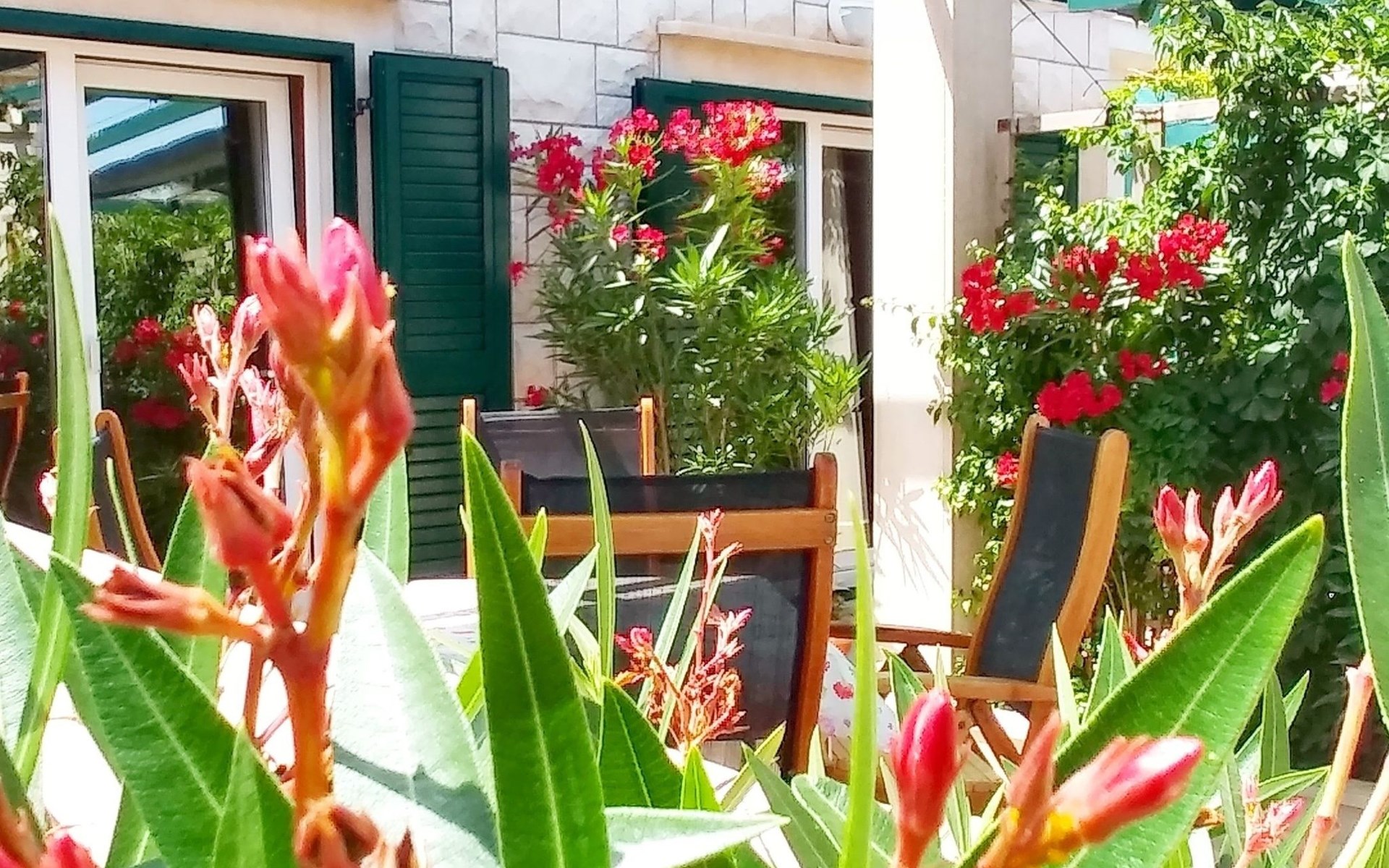Each apartment has its own parking space in front of the house, separate entrance, shaded terrace with furniture, a bedroom with a double-bed, a kitchen with dining area and living room in one larger room, as well as bathroom with shower.