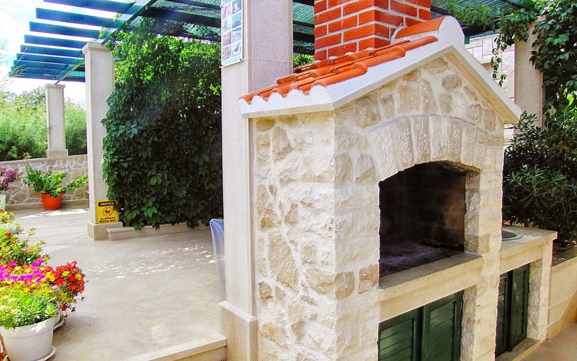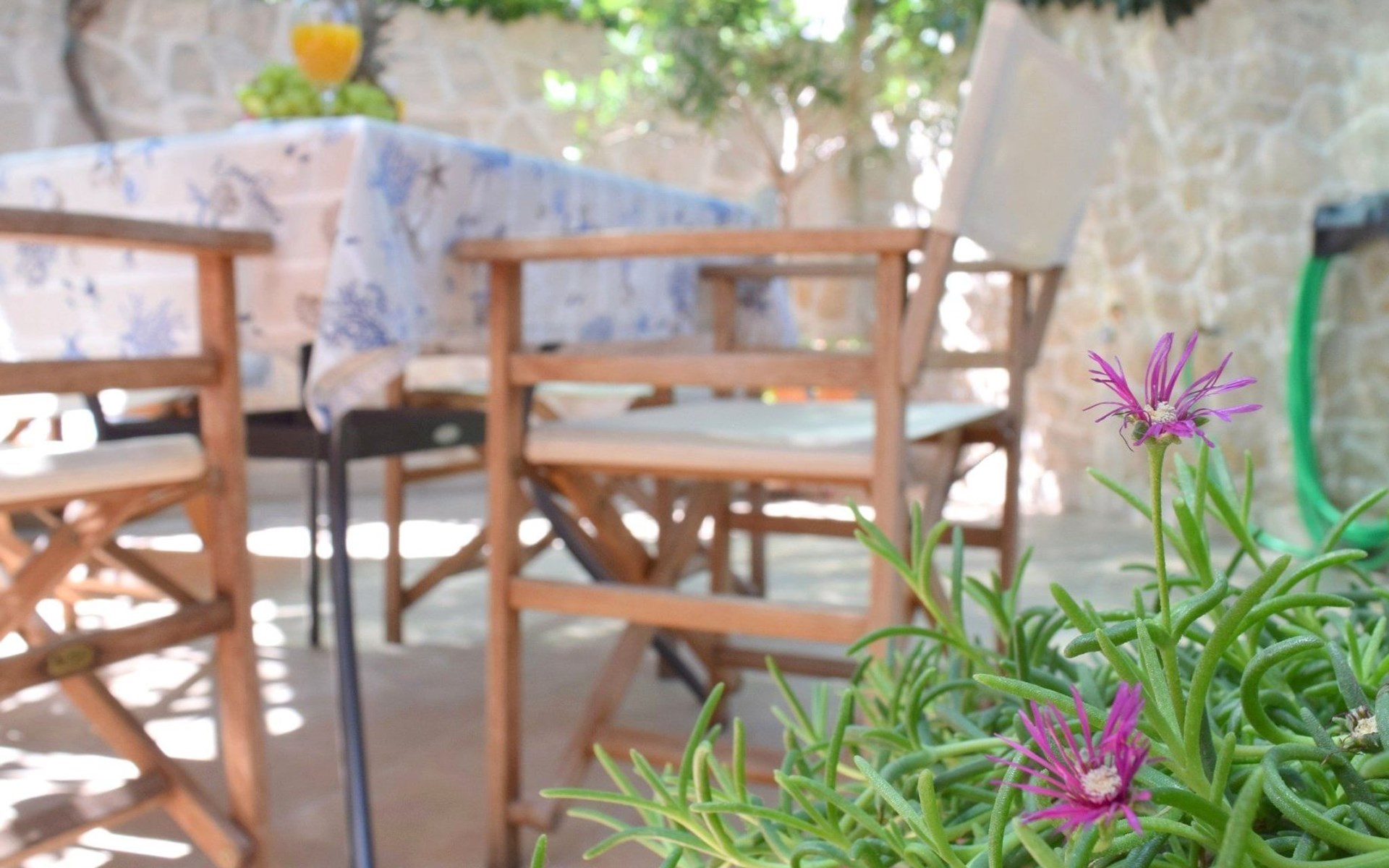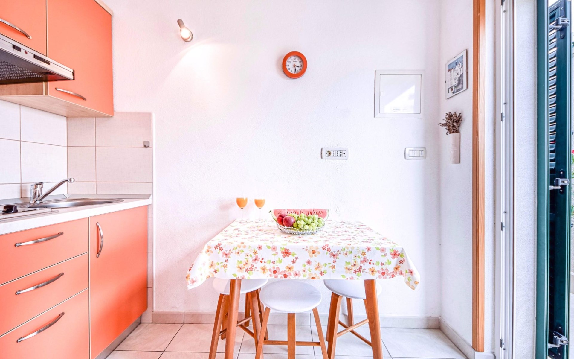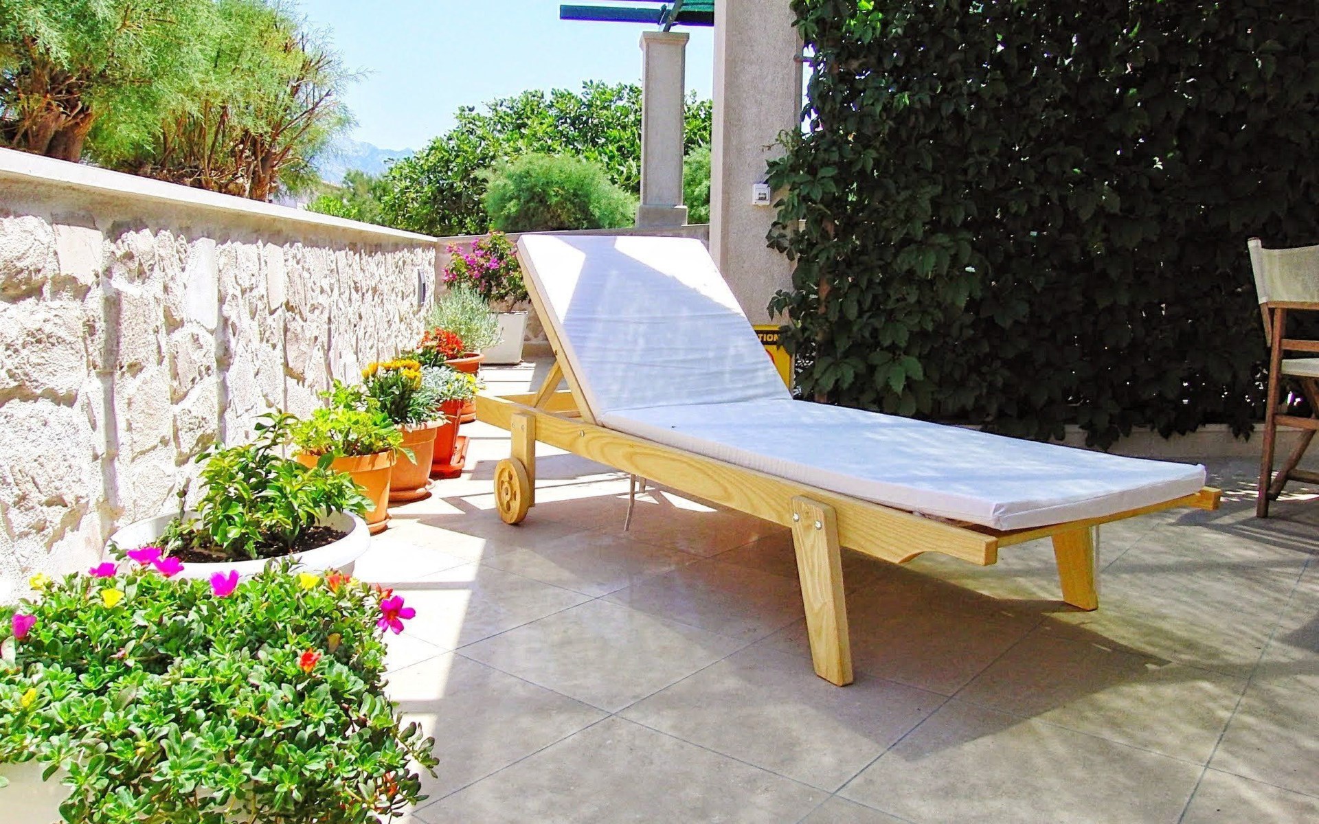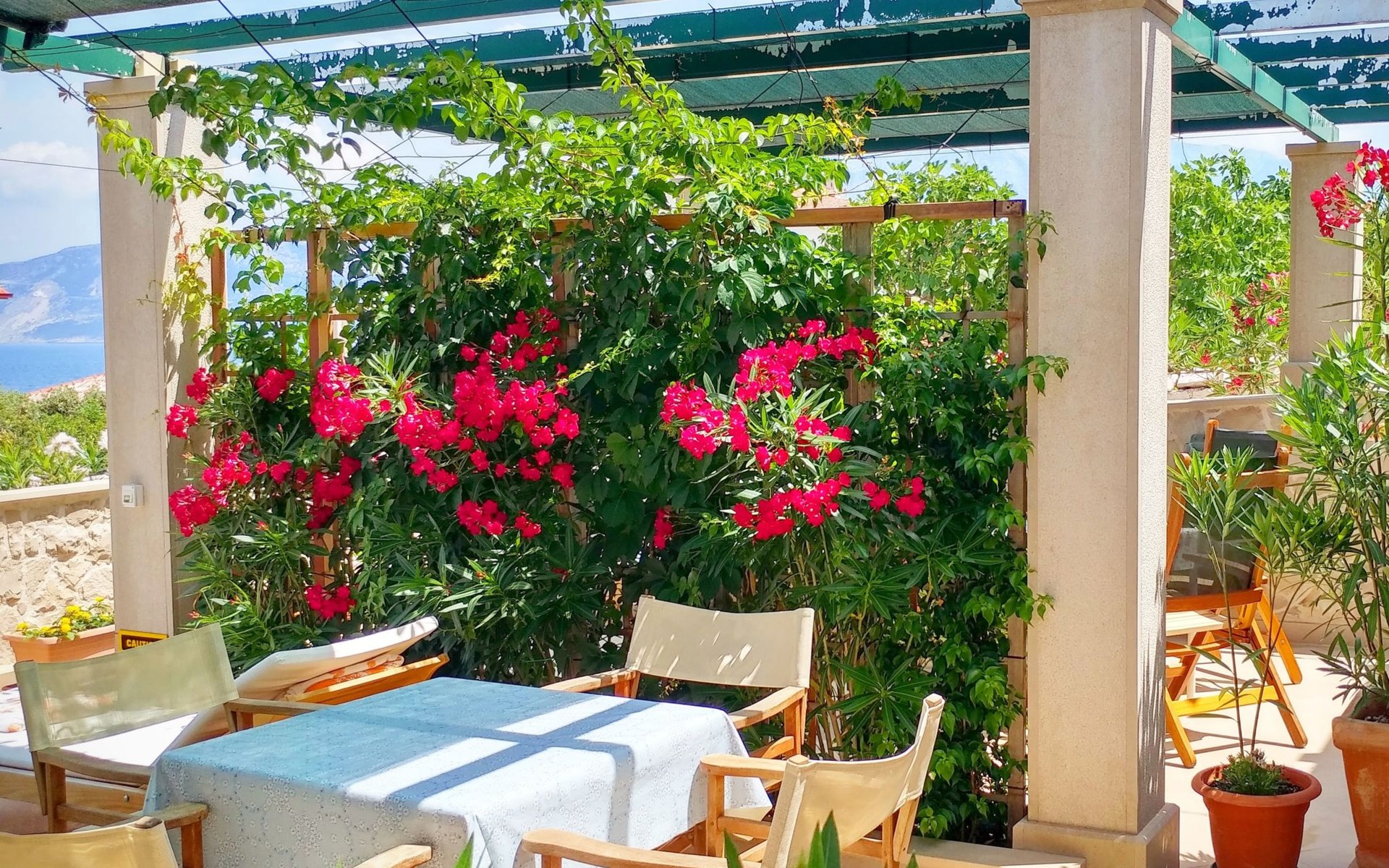Each apartment has its own parking space in front of the house, separate entrance, shaded terrace with furniture, a bedroom with a double-bed, a kitchen with dining area and living room in one larger room, as well as bathroom with shower.