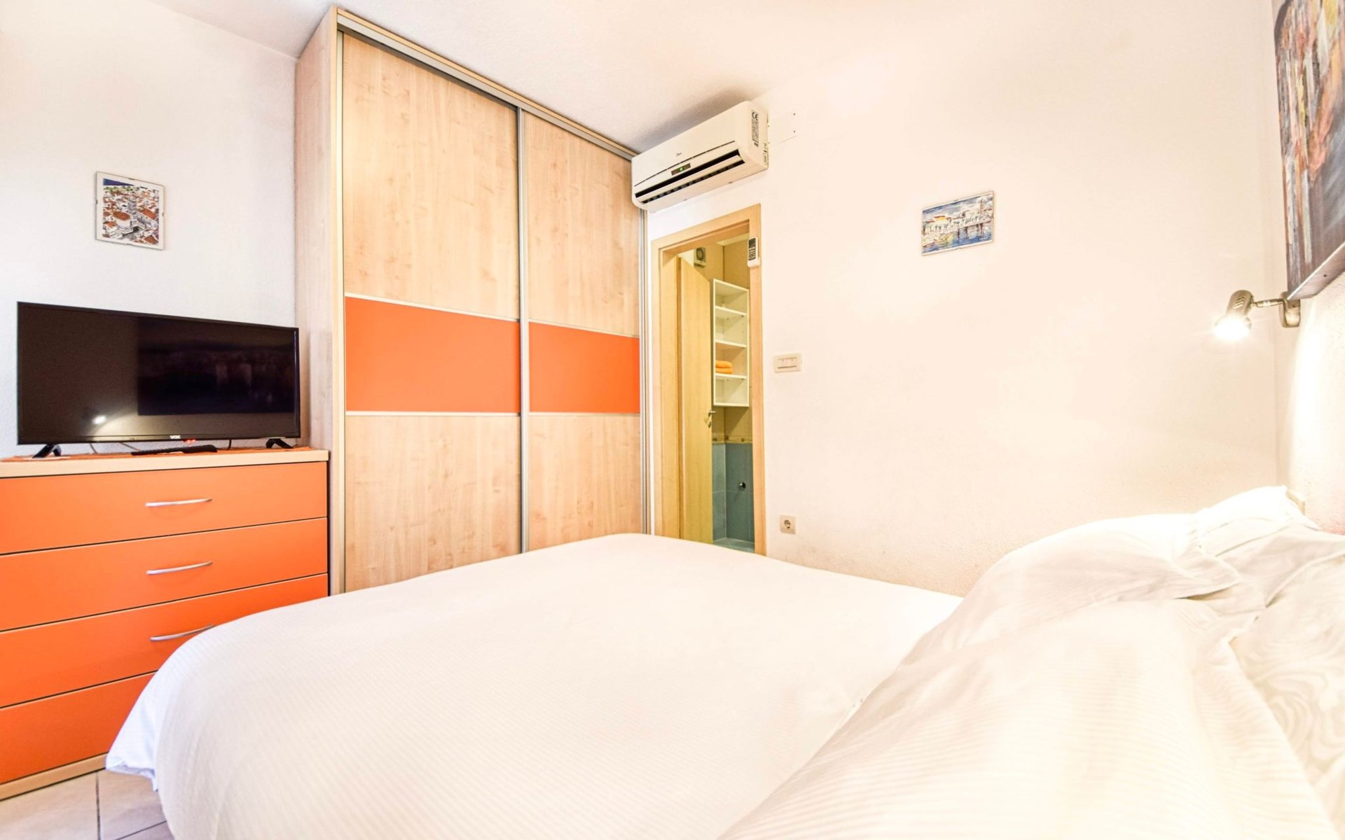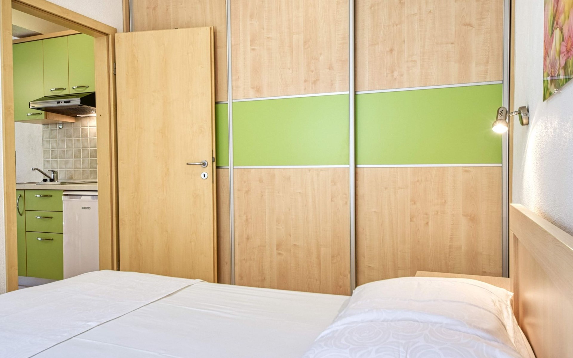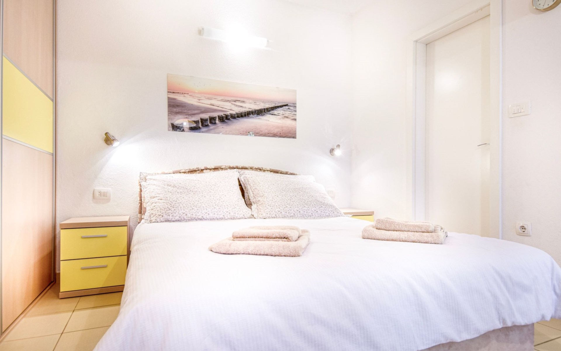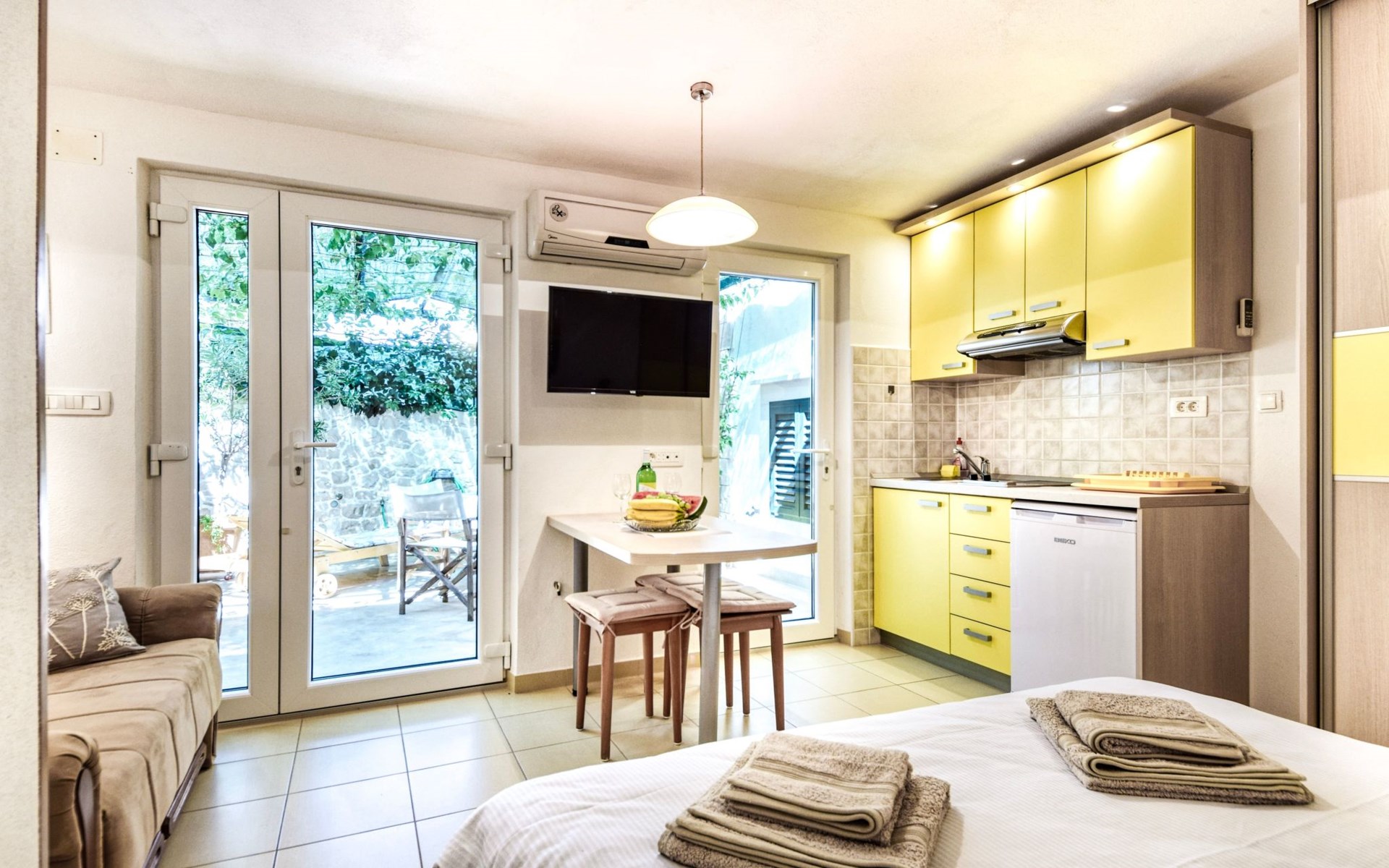 Air conditioning, wi-fi internet, satellite TV, safe box, bed linen, towels, pots, bowls, plates, cups, glasses, kitchen towels, cutlery and kettle are standard equipment of each apartment.