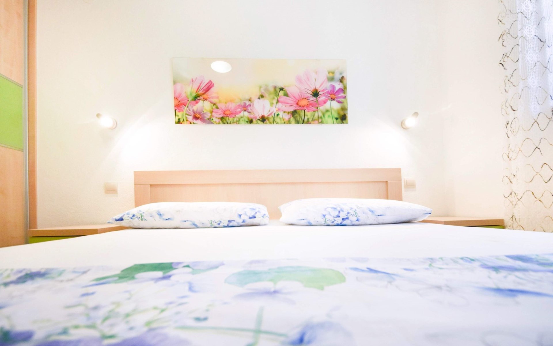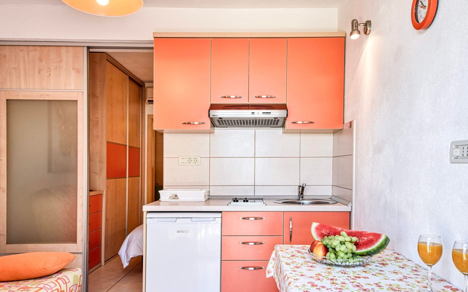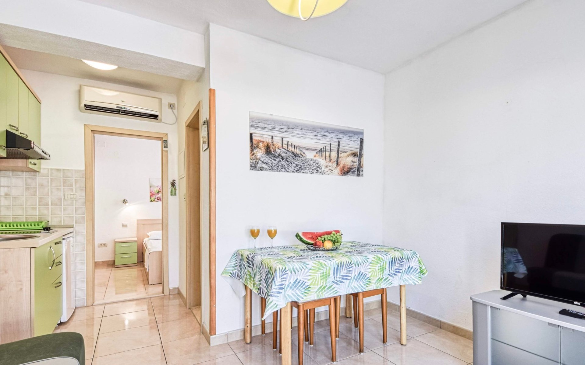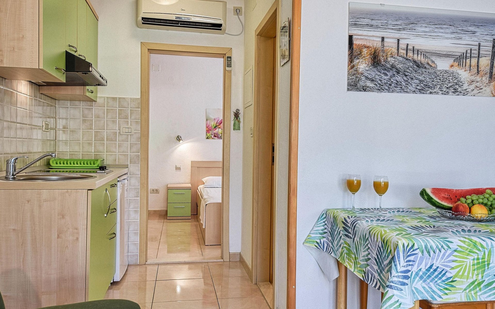 Air conditioning, wi-fi internet, satellite TV, safe box, bed linen, towels, pots, bowls, plates, cups, glasses, kitchen towels, cutlery and kettle are standard equipment of each apartment.