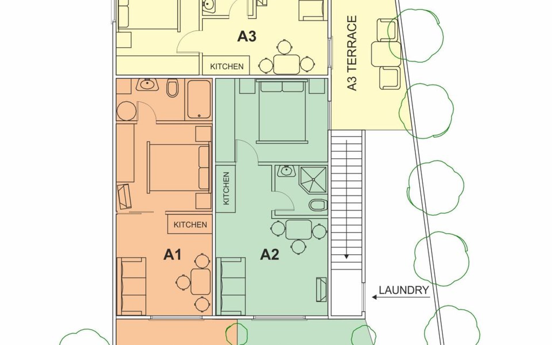 Three one-bedroom and one studio apartment (cca. 25 m2 each) are on the ground floor of the house.