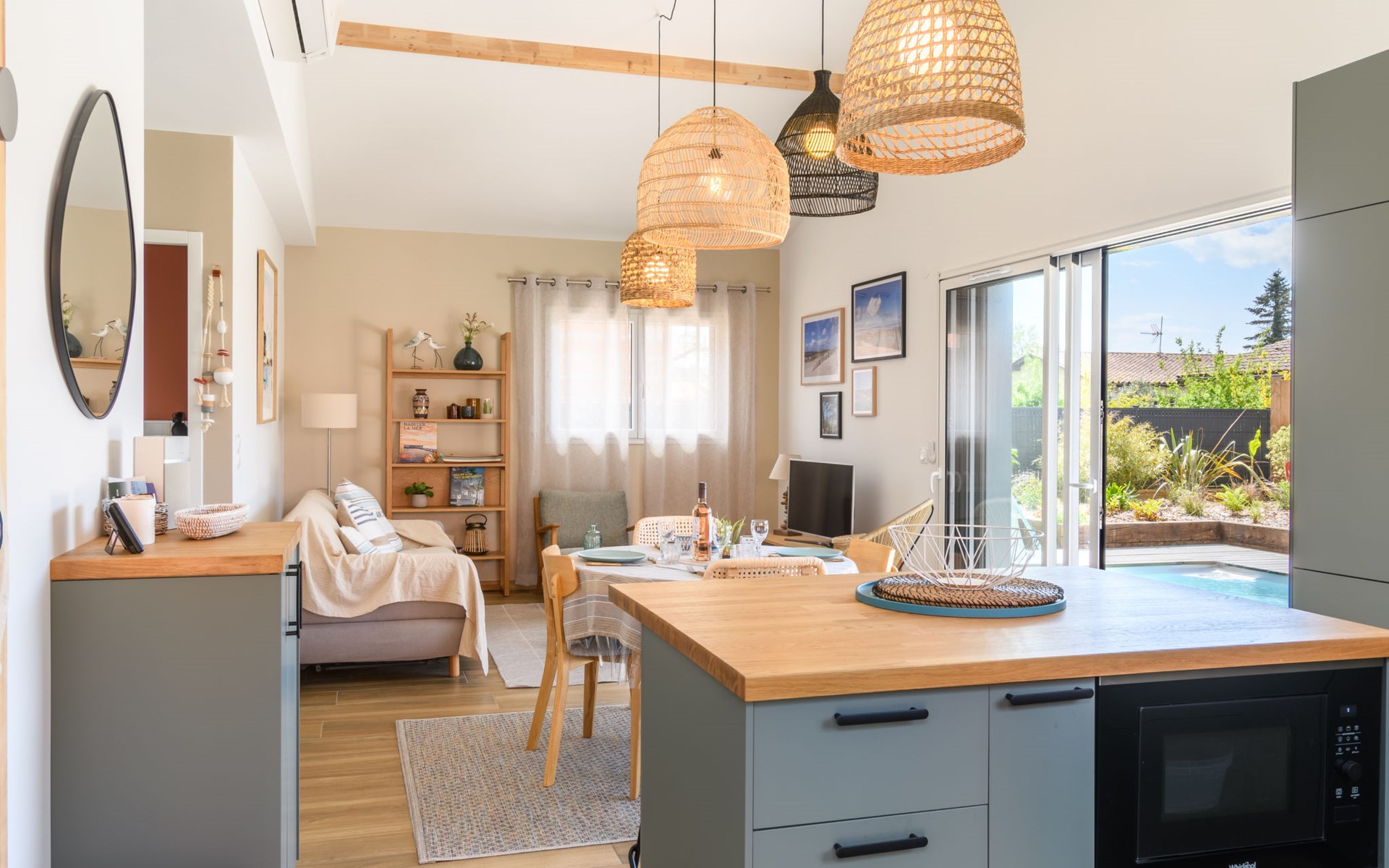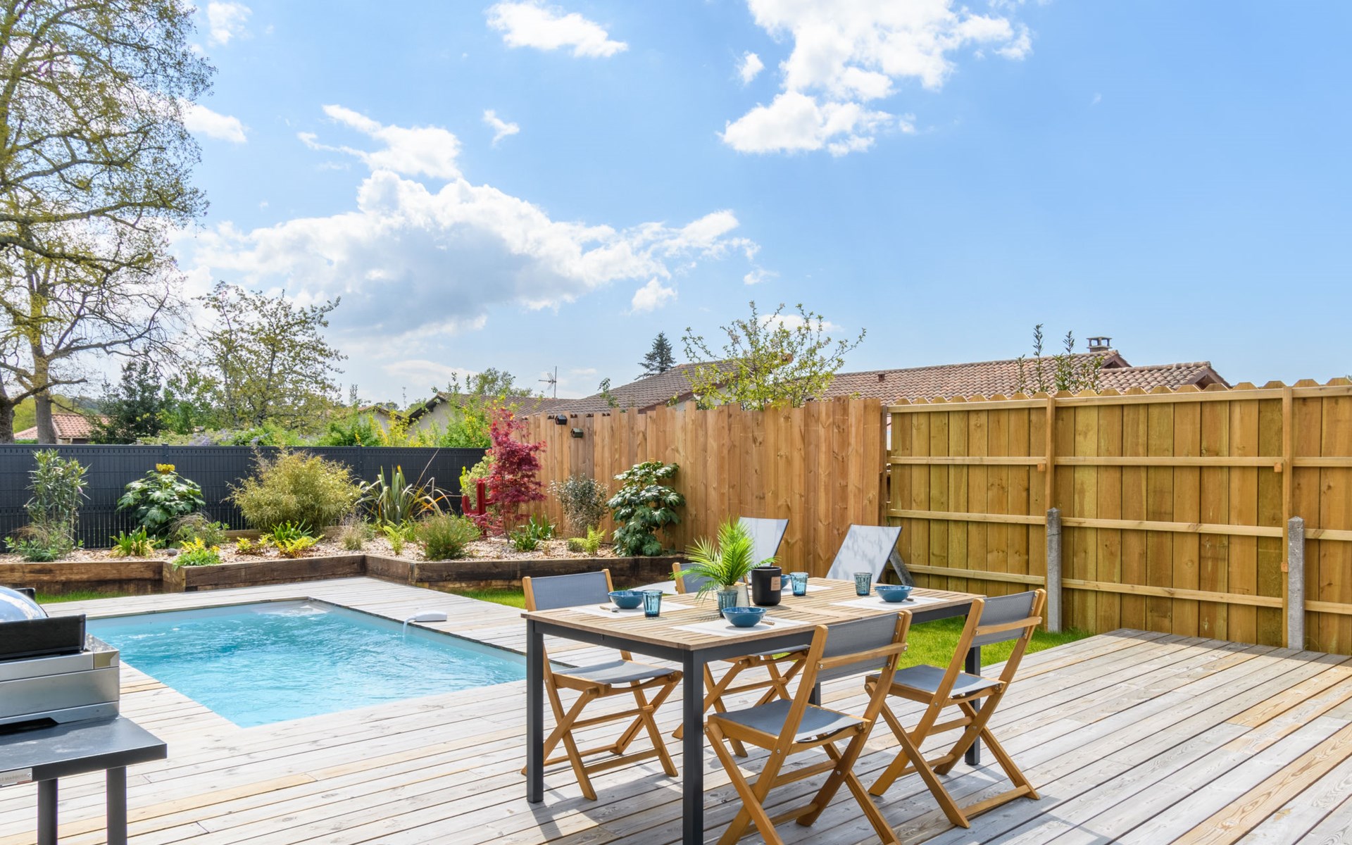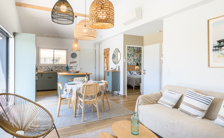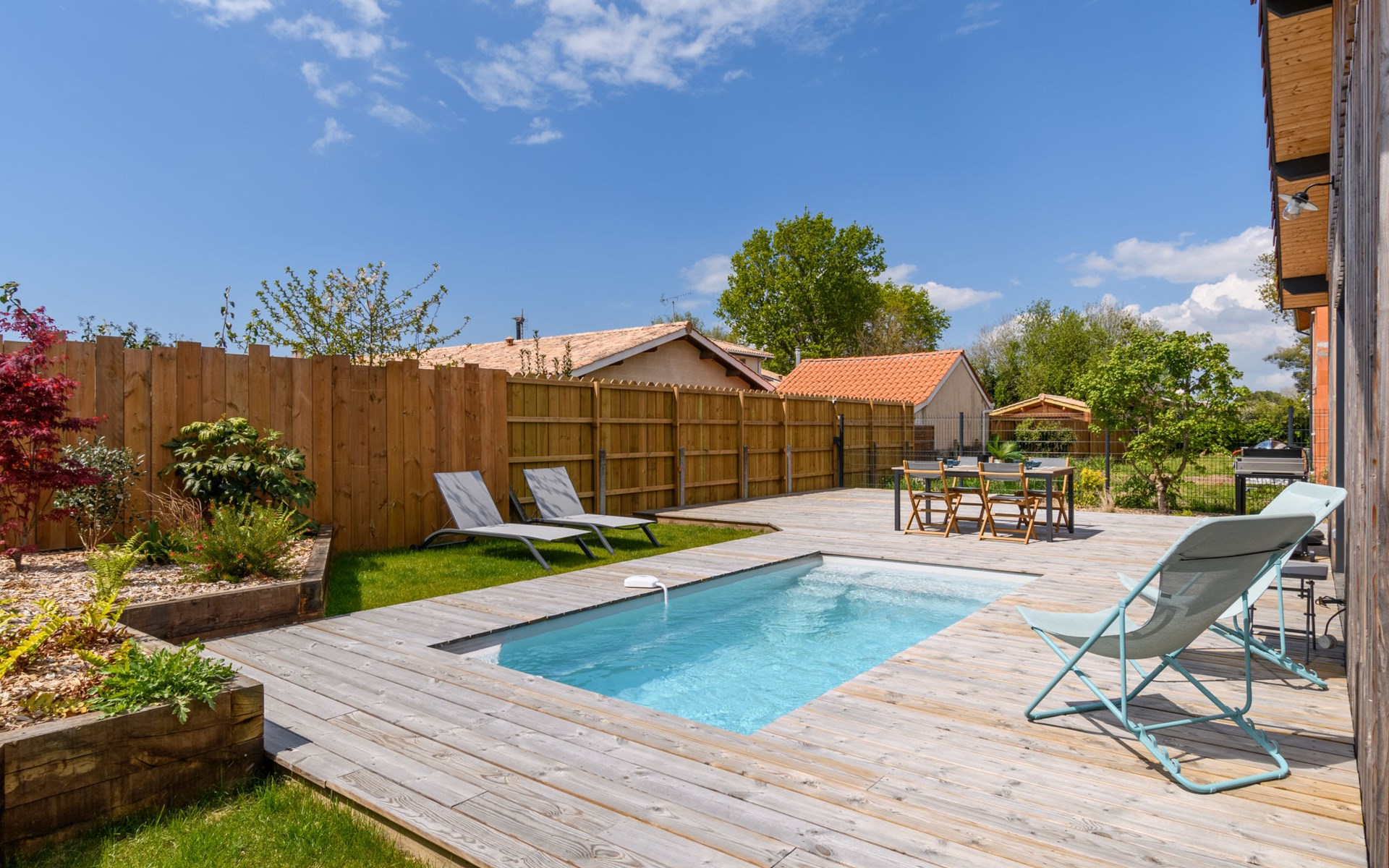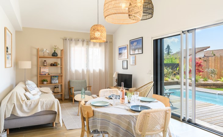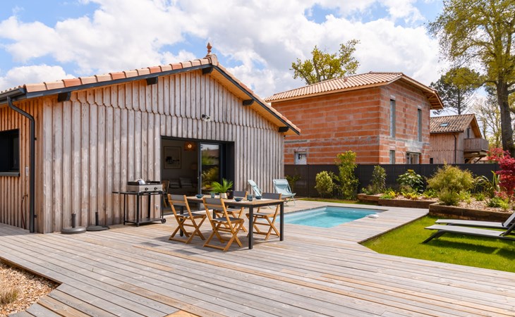 La Teste De Buch 5 km from Arcachon: Modern, beautiful single-family house "La Belle Testerine", built in 2022. 5 km from the sea, 5 km from the beach. Private: property 380 m2 (fenced), swimming pool (5 x 3 m, depth 140 cm, seasonal availability: 01.Jun. - 15.Sep.) with internal staircase and alarm system. Boules, parking. Grocery 1.8 km, supermarket 1.7 km, shopping centre 2 km, restaurant 800 m, bar 2.4 km, bakery 1.9 km, bus stop "La Séouge" 450 m, railway station "Le Teste de Buch" 2.5 km, sandy beach "La Hume" 5 km, park "La Chêneraie" 4.2 km, thermal baths "Thalazur" 6.4 km. Sports harbour 2.5 km, golf course (18 hole) 3.6 km. Nearby attractions: Dune du Pyla 6.7 km, Eratopia 5.1 km, Marché Municipal 1.7 km, Cinéma Grand Ecran 2.3 km, Navette Maritime pour le Cap Ferret 5.8 km, ArcaJetMarine 5.1 km. Well-known lakes can easily be reached: Lac de la Magdeleine 6.4 km, Lac de Cazaux 11.9 km. The keys‘ handover takes place by the agency Interhome in Arcachon, 6 km. Neighbourhood highly sensitive to noise. Quietness and good behaviour expected.
