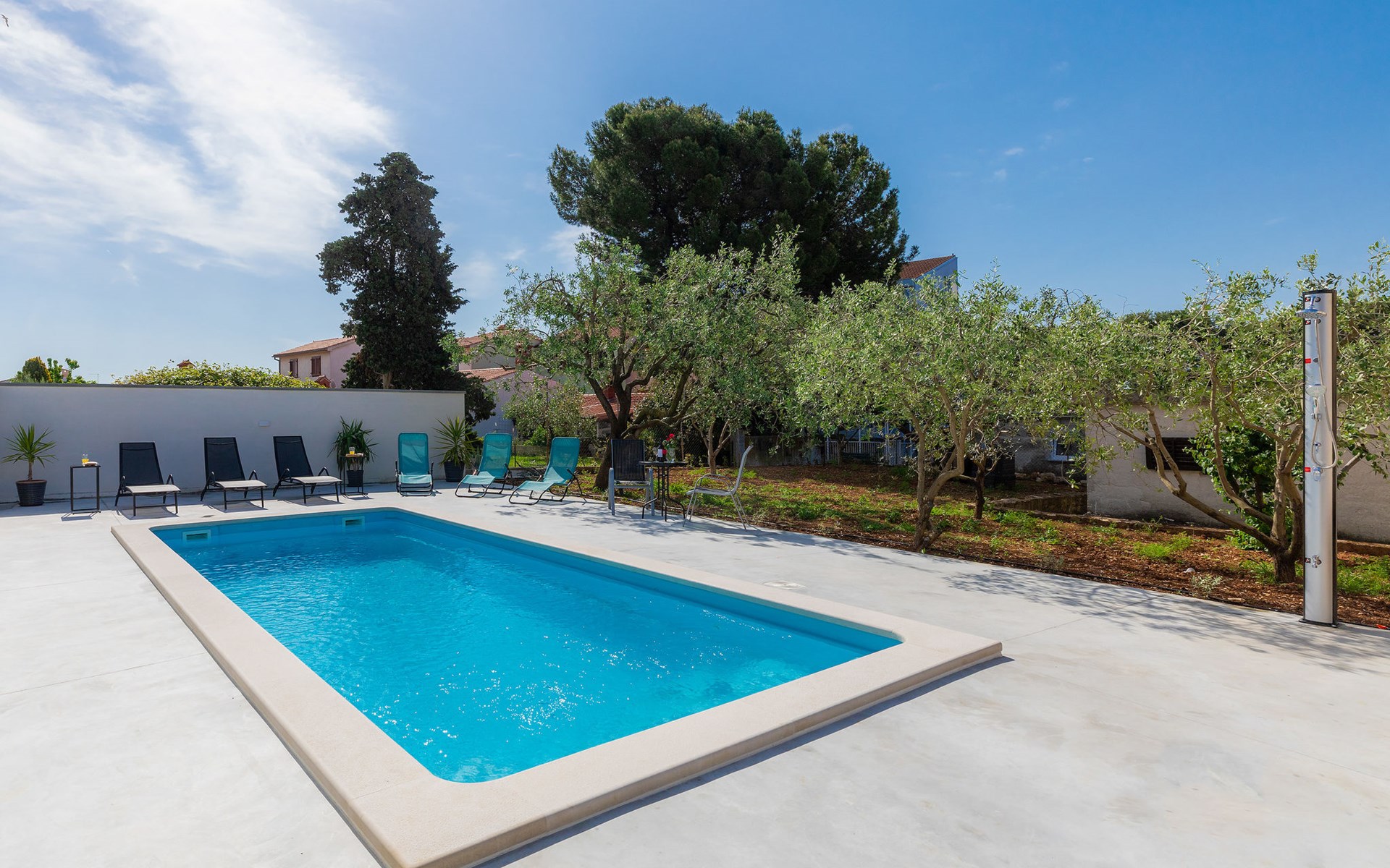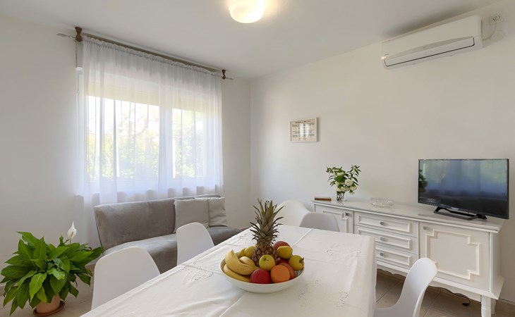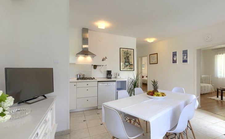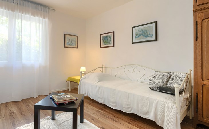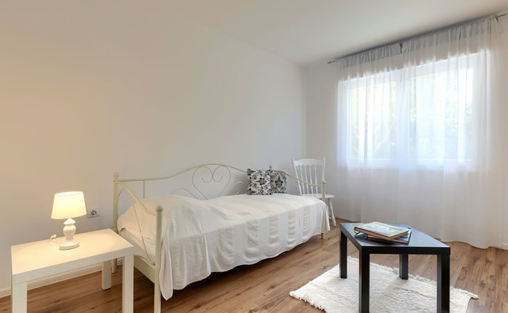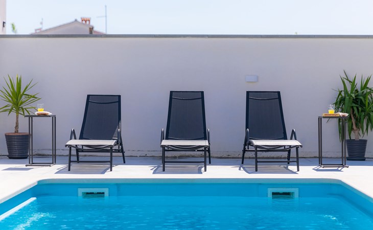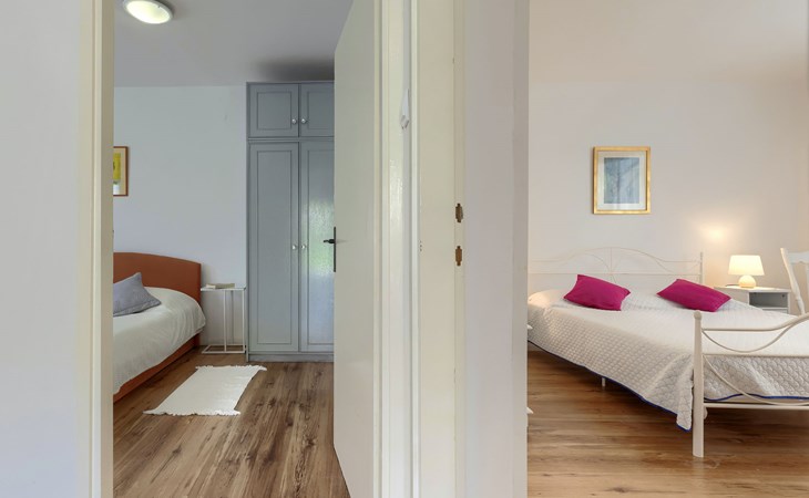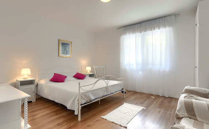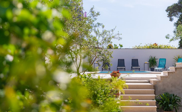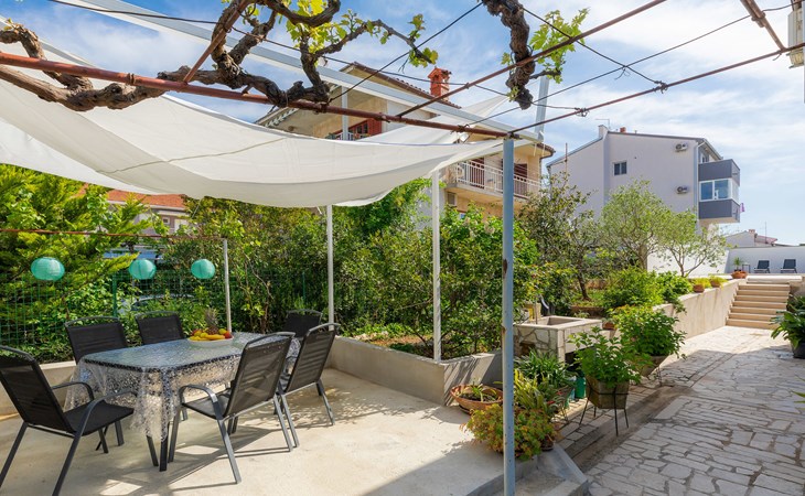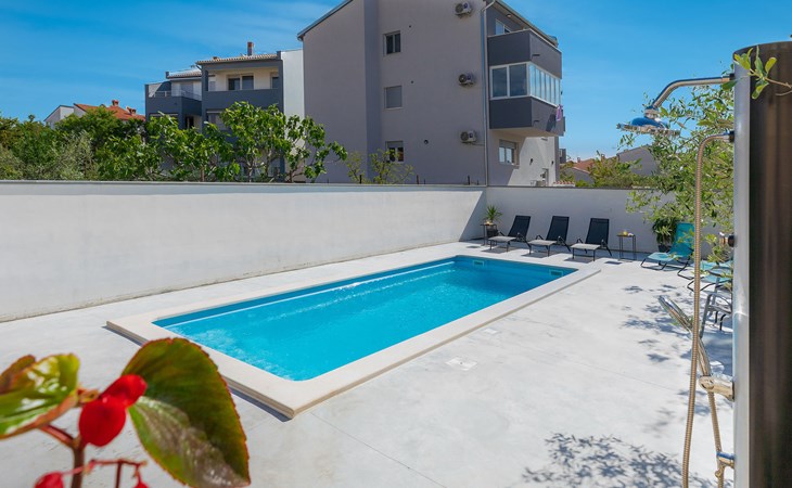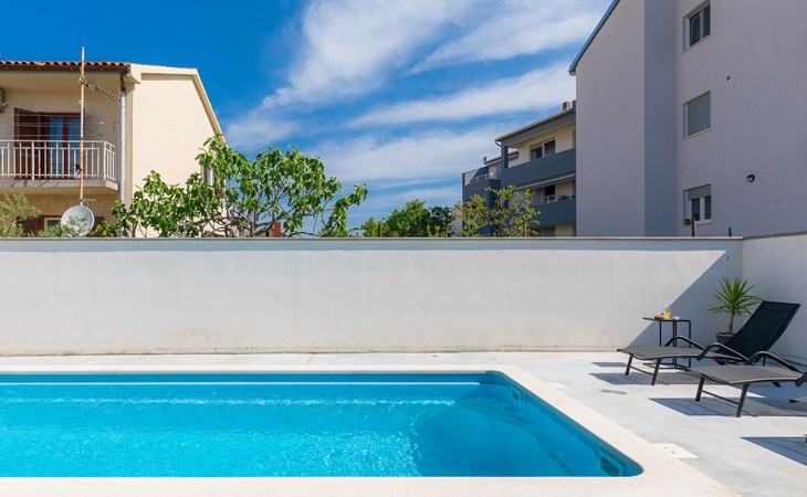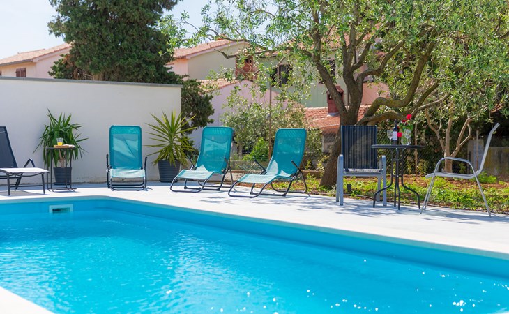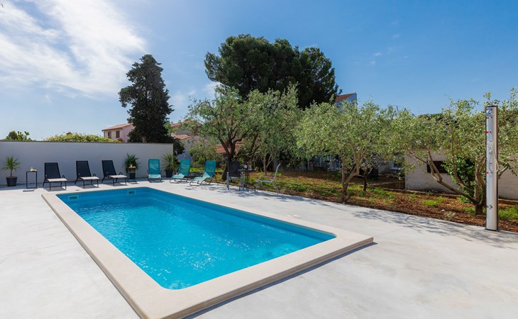 Beautiful 2-family house "Laura". 3 km from the centre of Pula, in a sunny position, 350 m from the sea, 1 km from the beach. For shared use: property 900 m2 (fenced), garden. Private: property 500 m2, garden with wildlife garden and flowers, swimming pool angular (7 x 3 m, 26 m2, depth 140 cm, seasonal availability: 01.Apr. - 01.Nov.) with internal staircase. Outdoor shower, terrace (10 m2), garden furniture. In the house: internet access. Parking at the house on the premises. Shop 300 m, supermarket 2 km, restaurant 50 m, bus stop 100 m, pebble beach 1 km, rocky beach 1 km, public bathing area 1 km. Marina 350 m. Please note: airfield 10 km from the property.