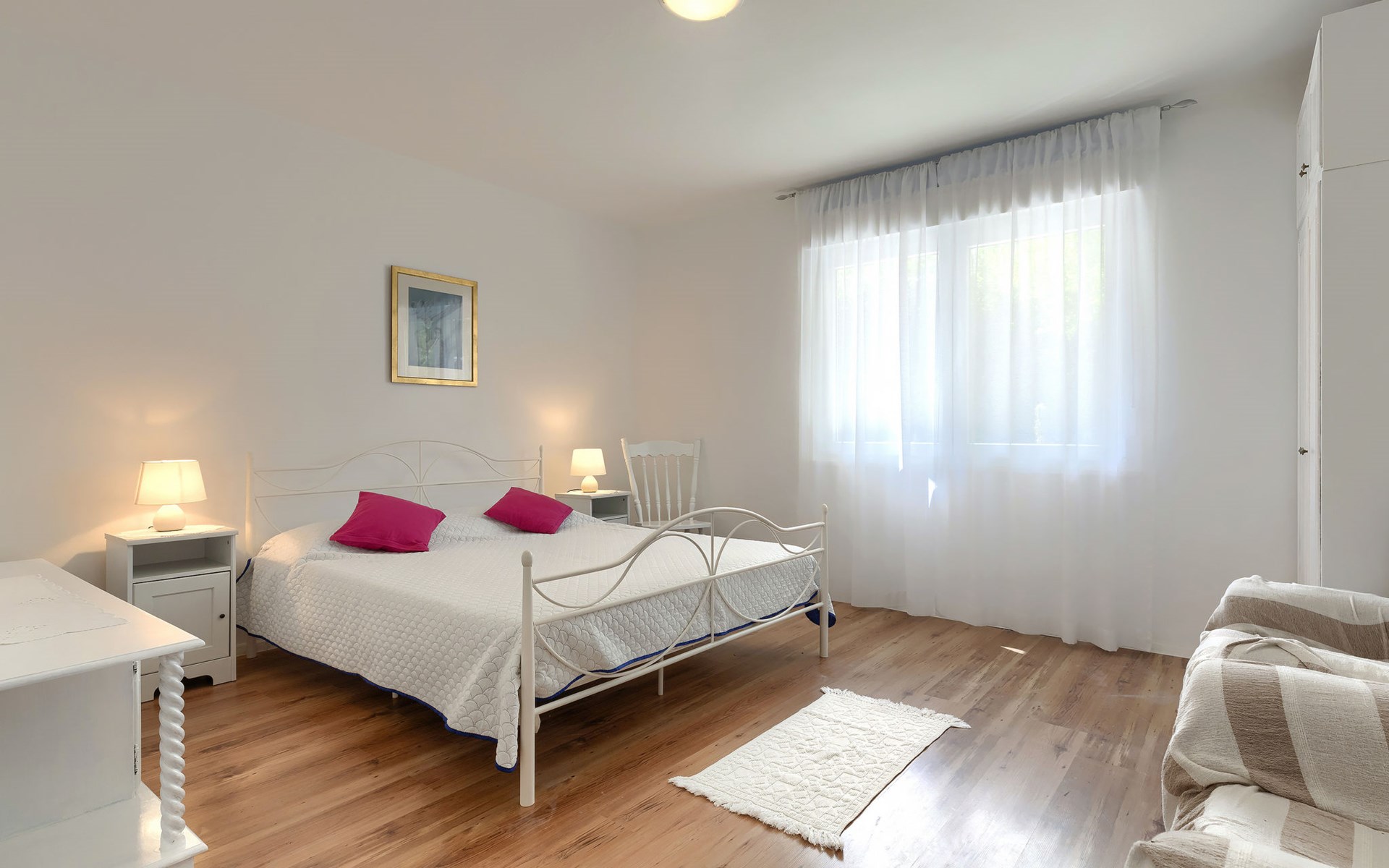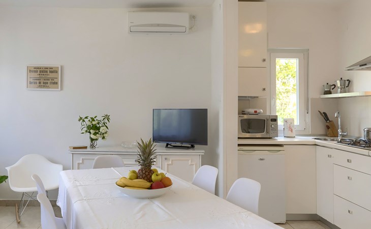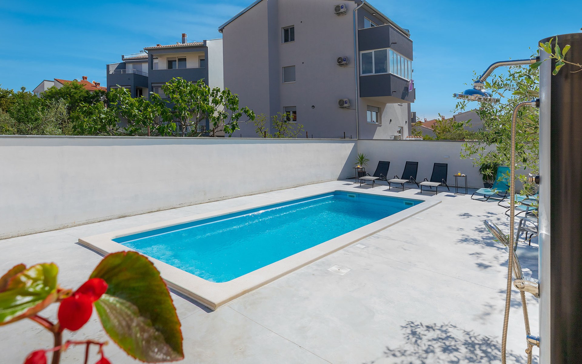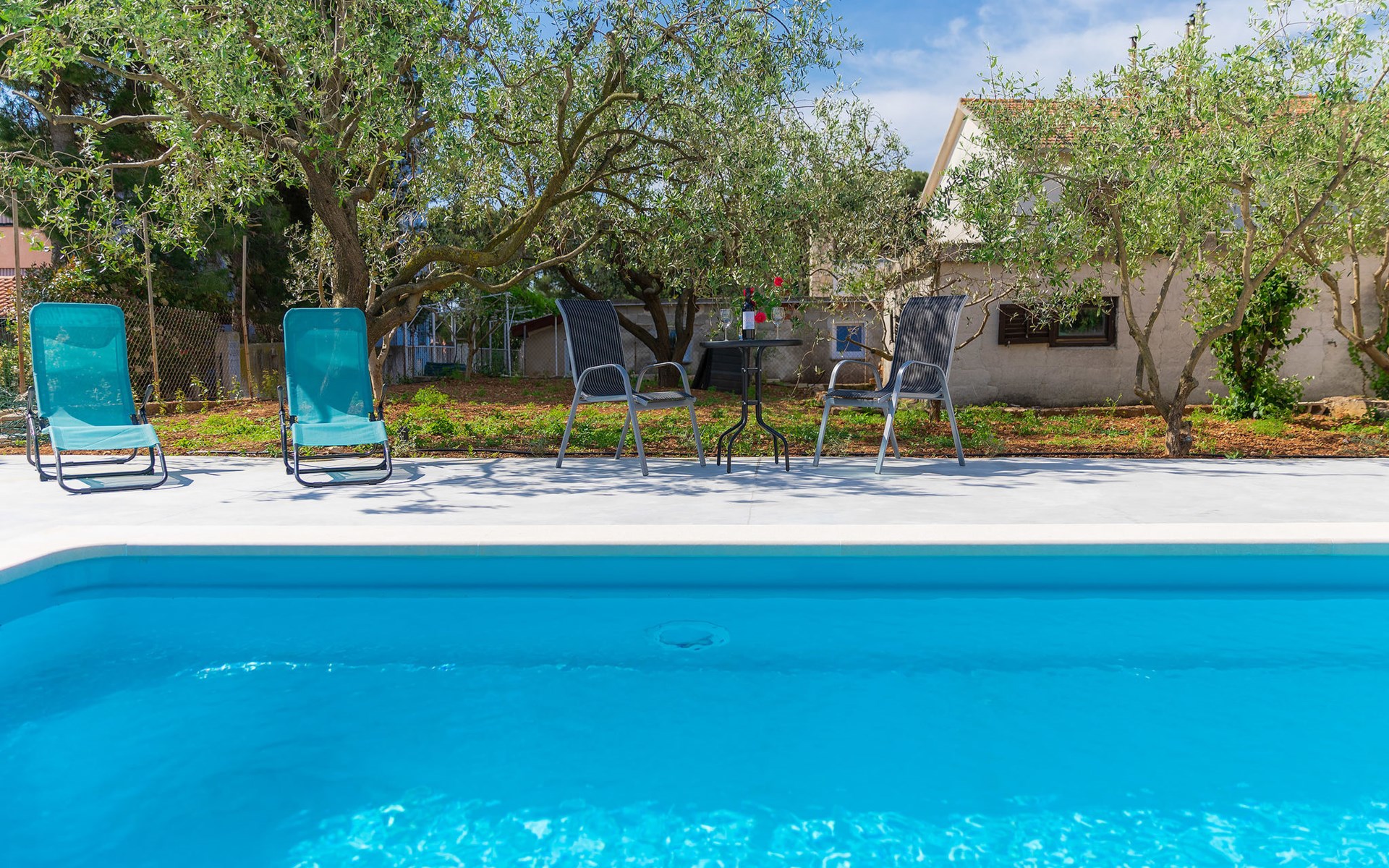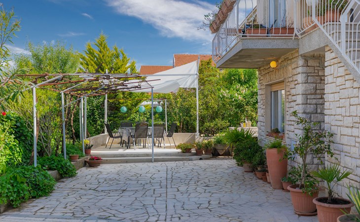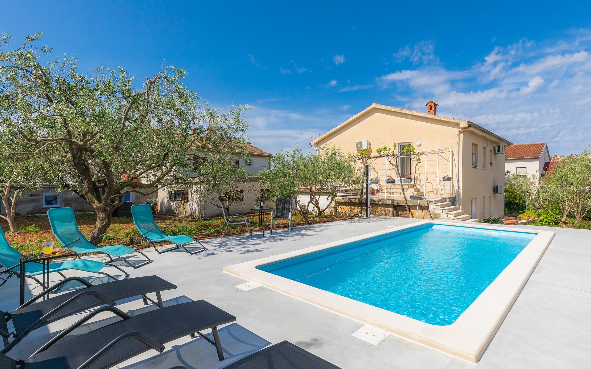 Beautiful 2-family house "Laura". 3 km from the centre of Pula, in a sunny position, 350 m from the sea, 1 km from the beach. For shared use: property 900 m2 (fenced), garden. Private: property 500 m2, garden with wildlife garden and flowers, swimming pool angular (7 x 3 m, 26 m2, depth 140 cm, seasonal availability: 01.Apr. - 01.Nov.) with internal staircase. Outdoor shower, terrace (10 m2), garden furniture. In the house: internet access. Parking at the house on the premises. Shop 300 m, supermarket 2 km, restaurant 50 m, bus stop 100 m, pebble beach 1 km, rocky beach 1 km, public bathing area 1 km. Marina 350 m. Please note: airfield 10 km from the property.