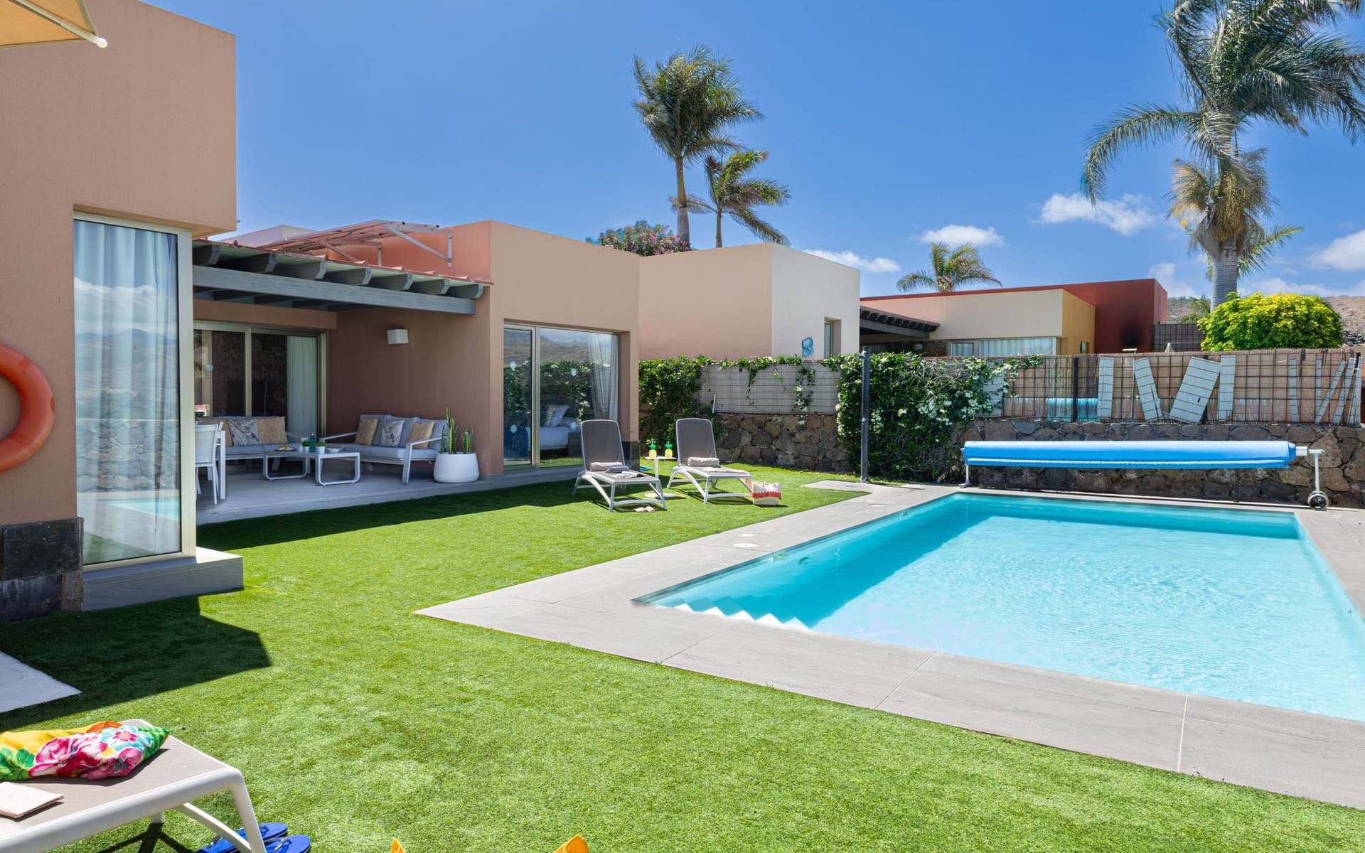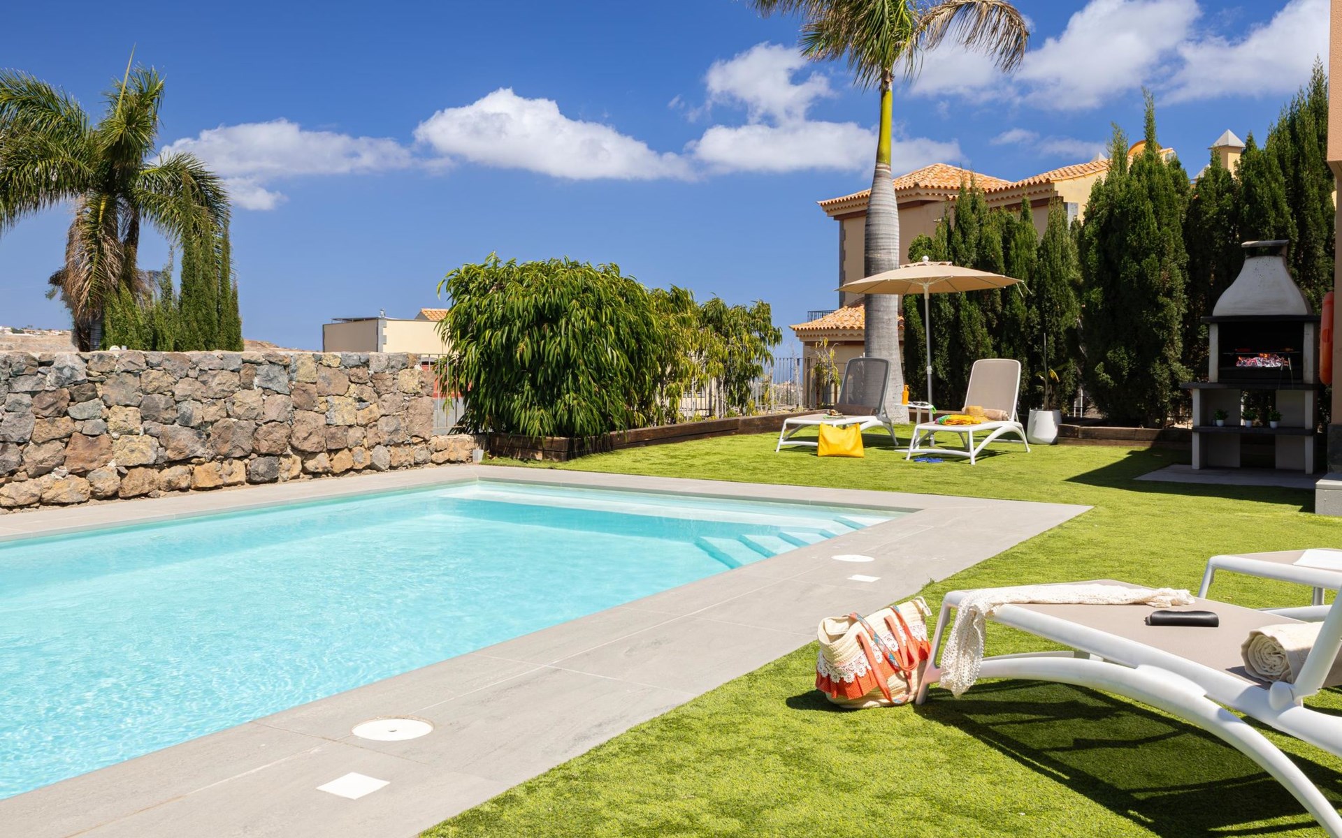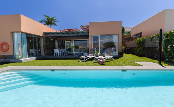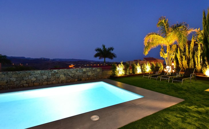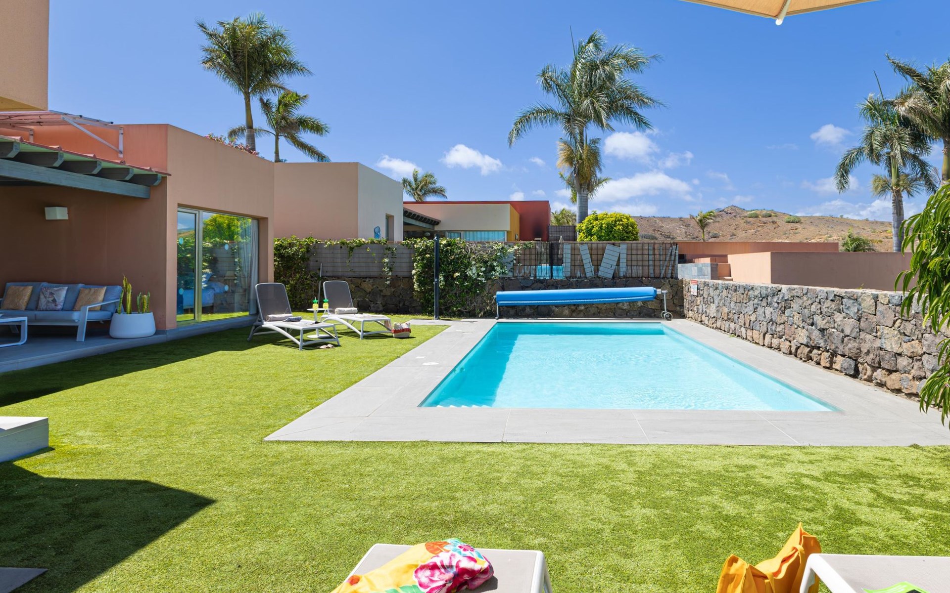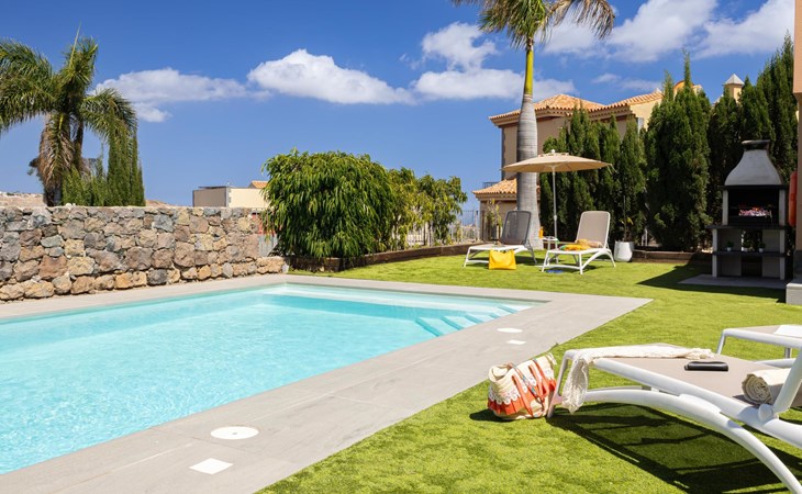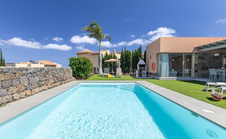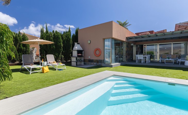 Modern, comfortable villa "Par4 Villa 8". In the centre of Salobre Golf Resort Maspalomas 5 km Meloneras 7 km, in a quiet, sunny, elevated position in the residential district. Private: property 380 m2 (fenced), garden 80 m2, lawn for sunbathing, swimming pool (8 x 4 m, depth 140 cm, seasonal availability: 01.Jan. - 31.Dec.). Garden furniture, barbecue. In the house: air conditioning, laundry, washing machine. Shop 4 km, shopping centre 1 km, restaurant 200 m, bus stop "Las Crucitas" 19 km, sandy beach "3000". Please note: car recommended. Baby equipment on request. The owner does not accept any youth groups. Airfield 25 km from the property.