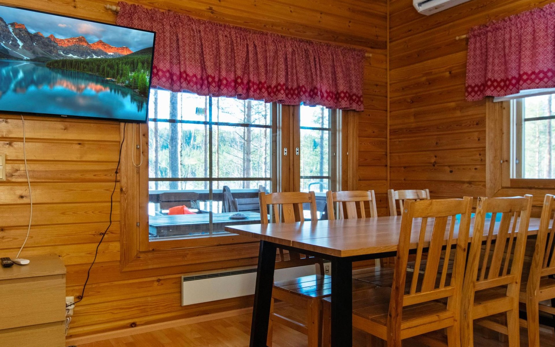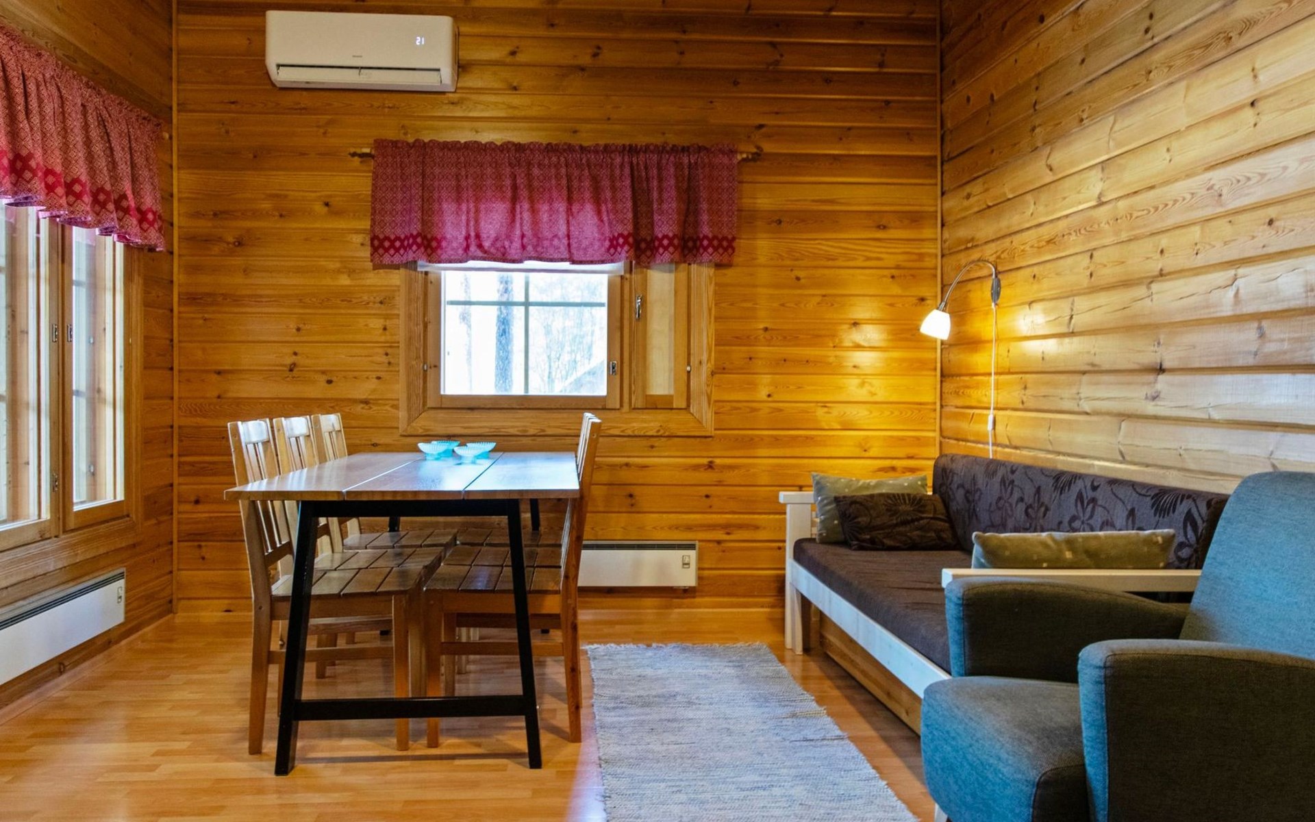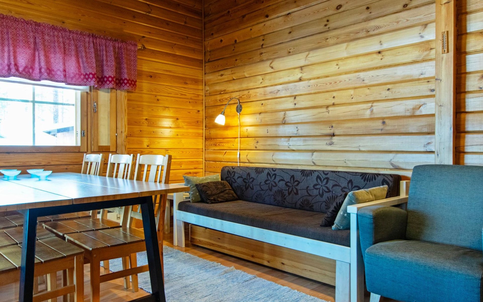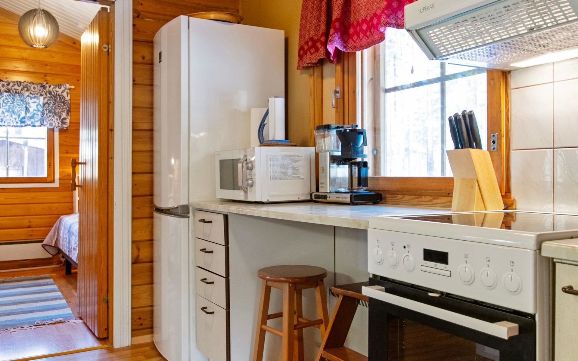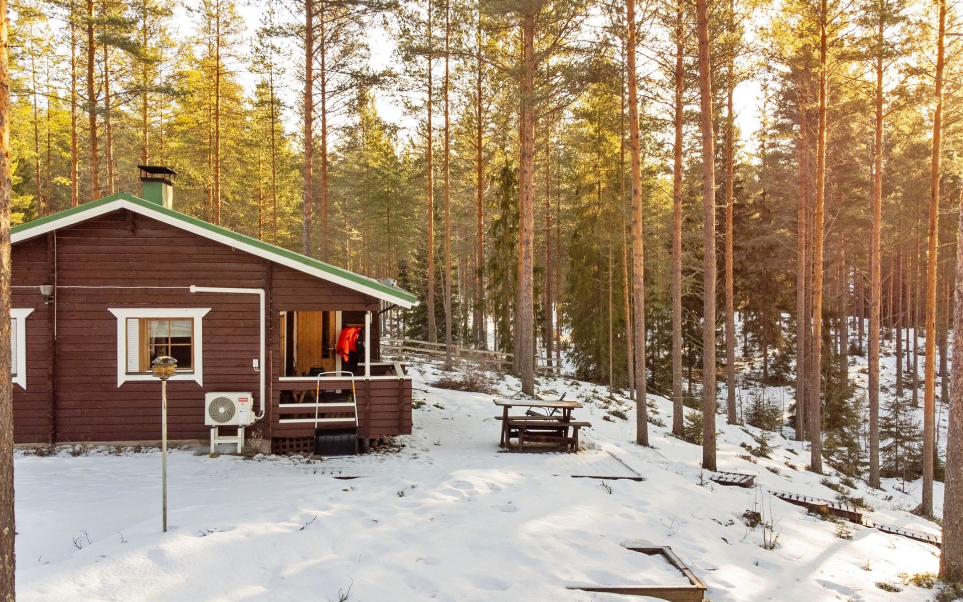 There is table and chairs on the open veranda. Available cot and high chair. Good outdoor and hiking areas nearby. Mushroom and berry forests nearby. Maintained ski trails in the winter. Outside power point for the car.