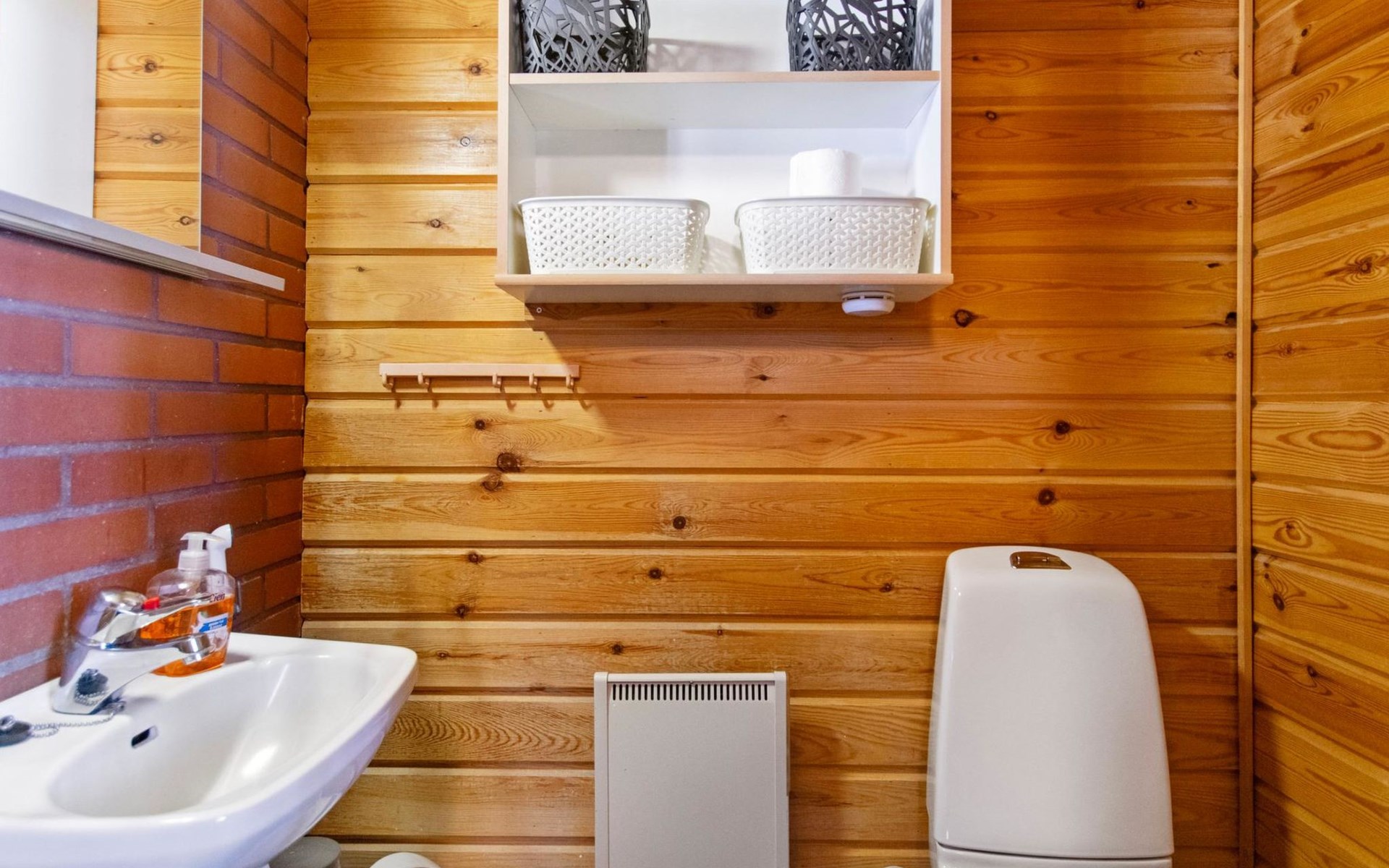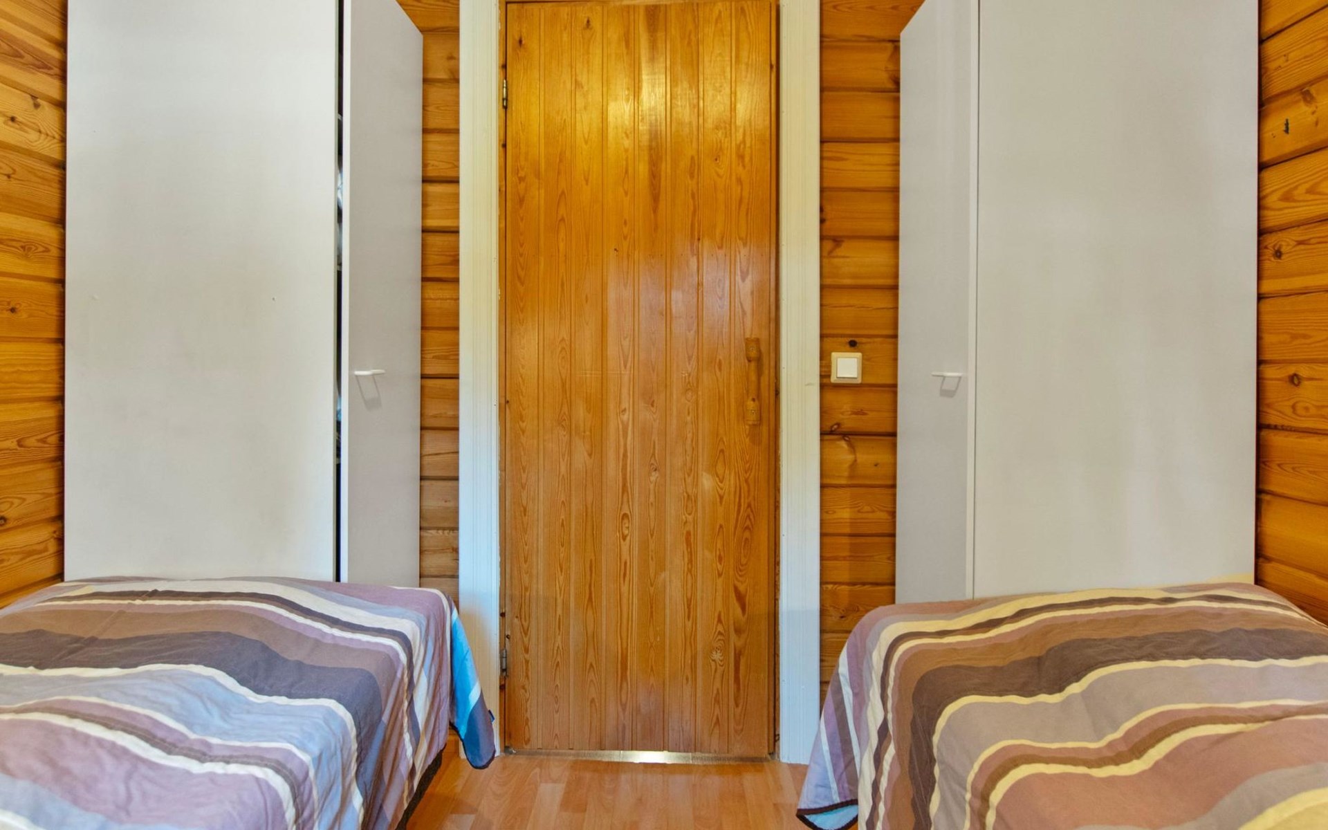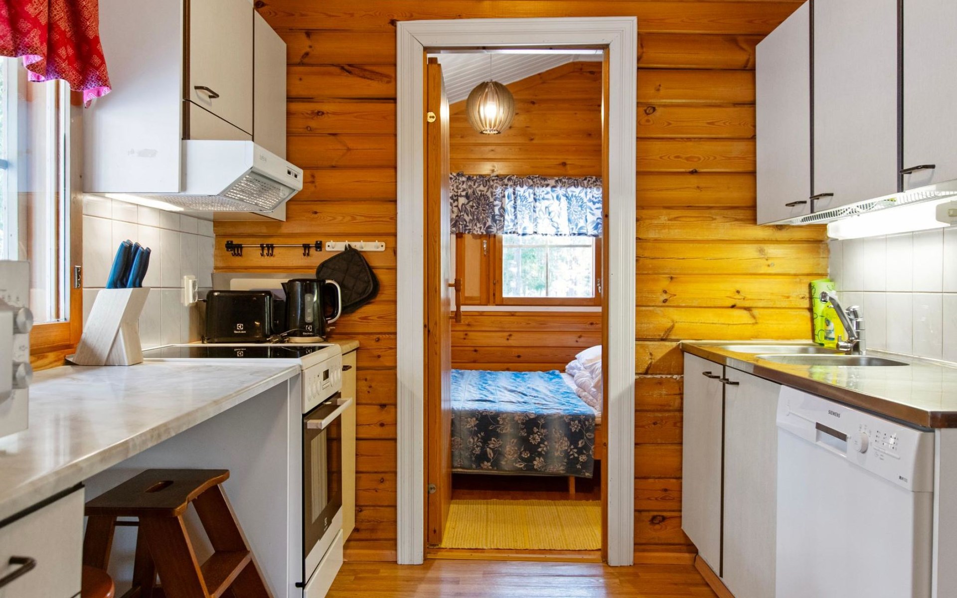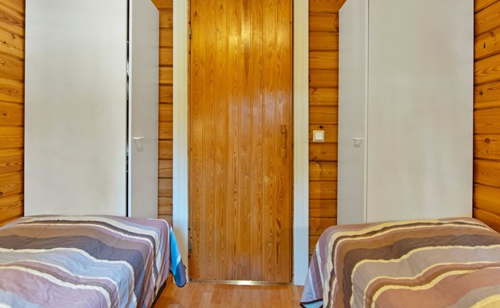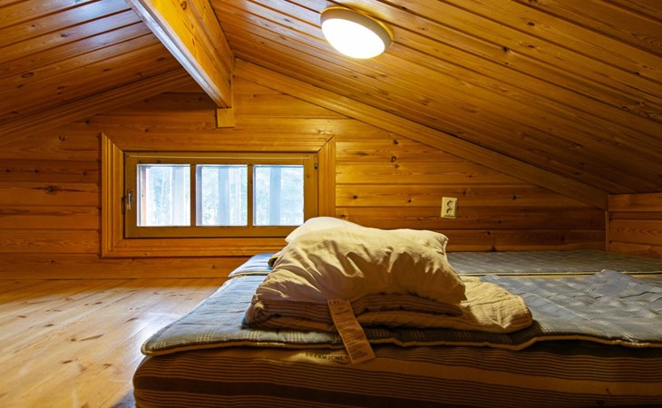 Log cabin 1992, kitchen, living room with convertible sofa bed for 2, bedroom with double bed, bedroom with 2 beds, low sleeping loft with 2 mattresses, dressing room, washroom, sauna, open veranda.