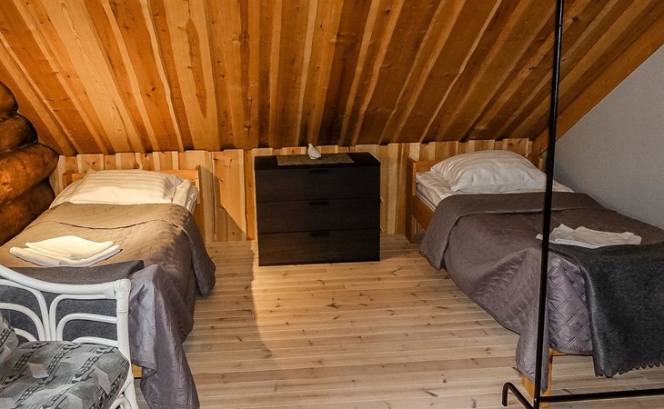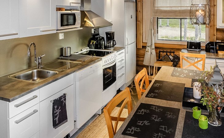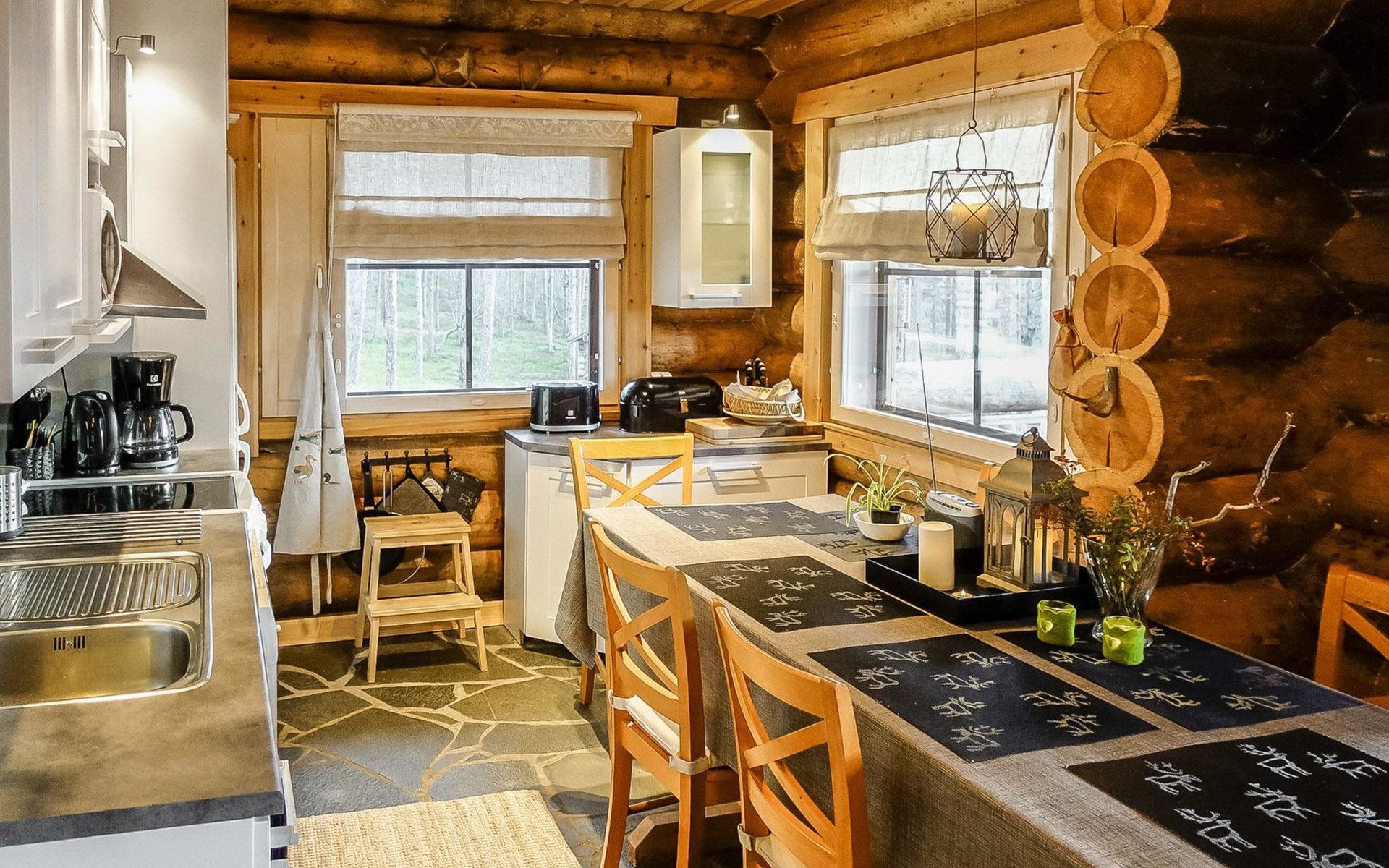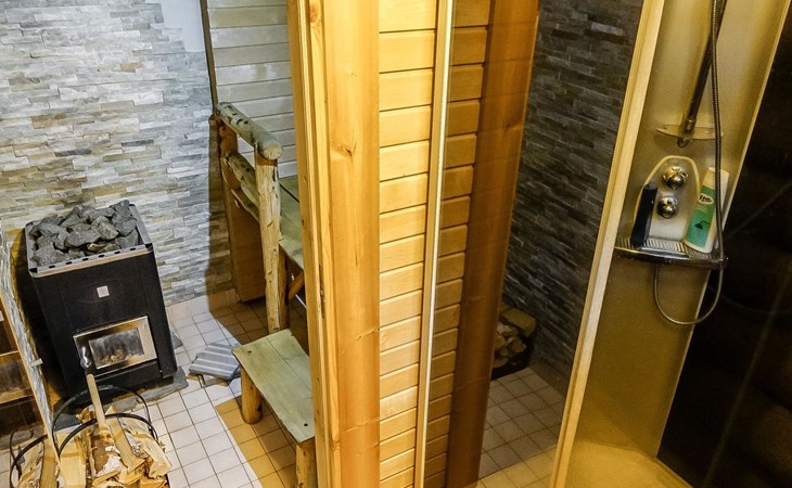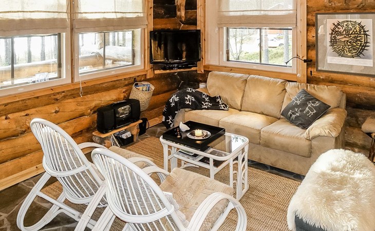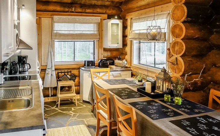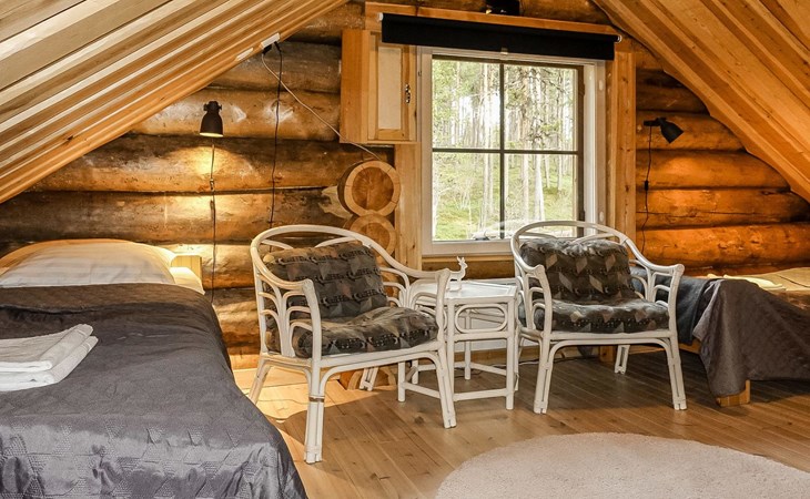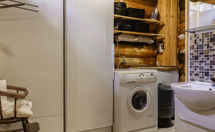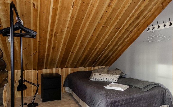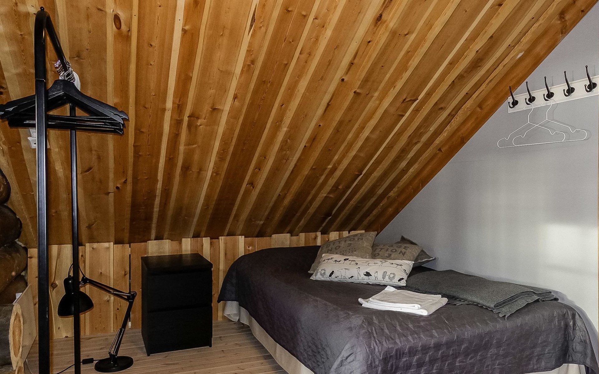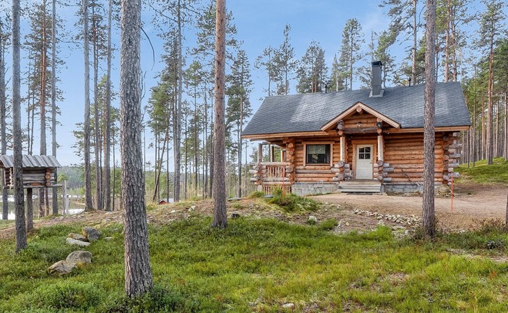 Log cabin built of northern pine in 2015, combined kitchen-living room, downstairs bedroom with 2 beds, upstairs bedroom with 3 beds, upstairs second bedroom with 3 beds (one of them is 120 cm wide), sauna with wood heated sauna stove, washroom with shower cubicle, 2 toilets (one of which is upstairs), covered terrace. A barbecue hut.