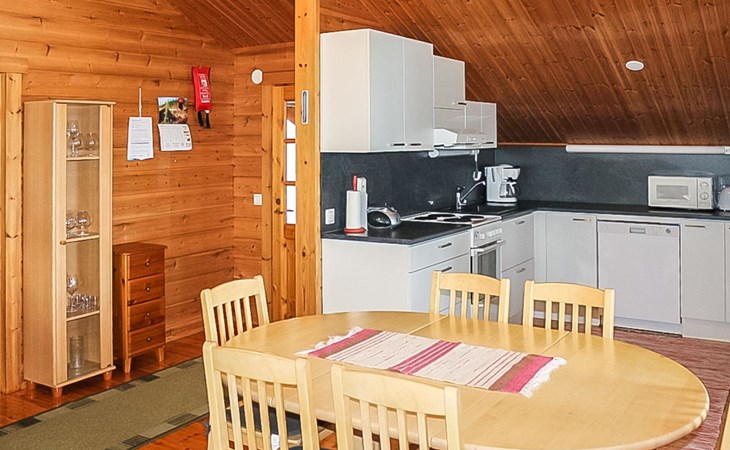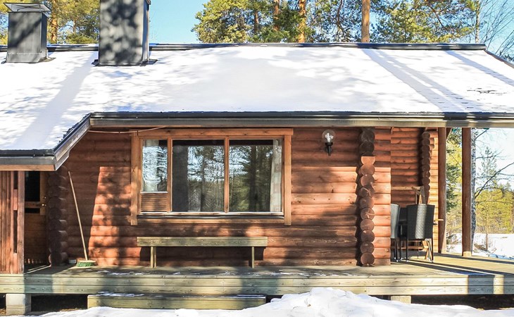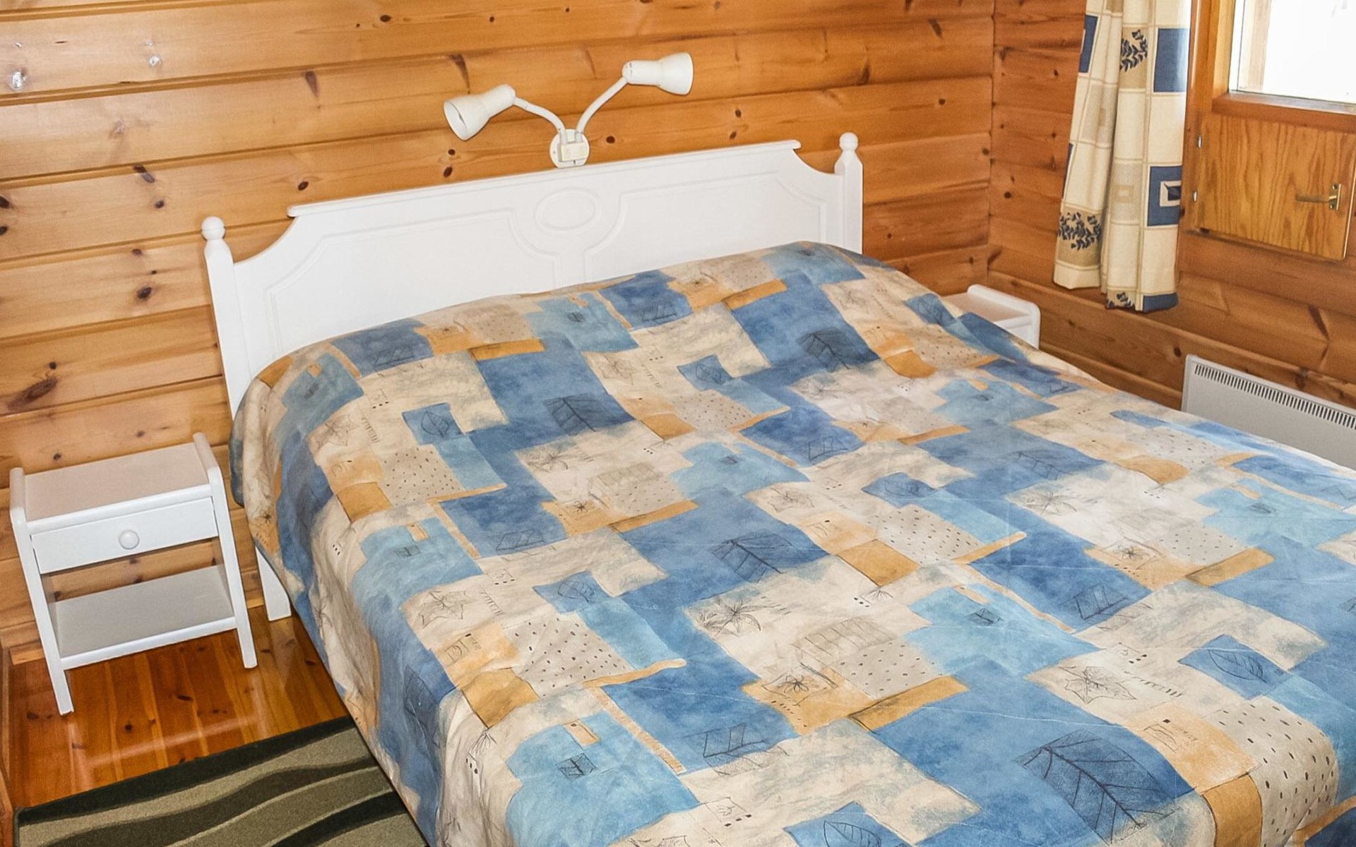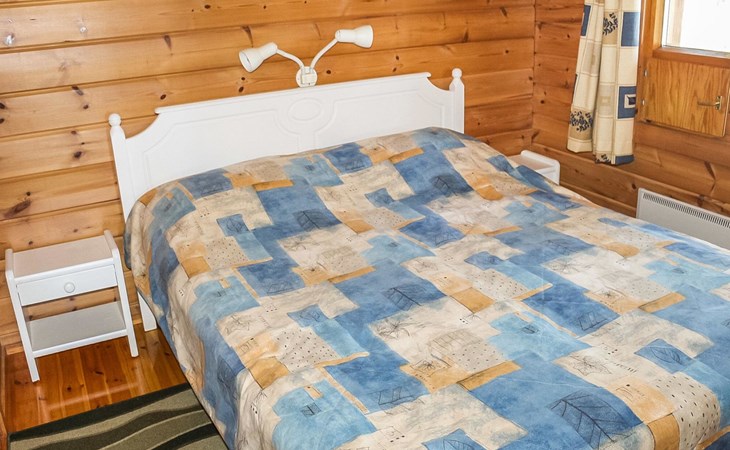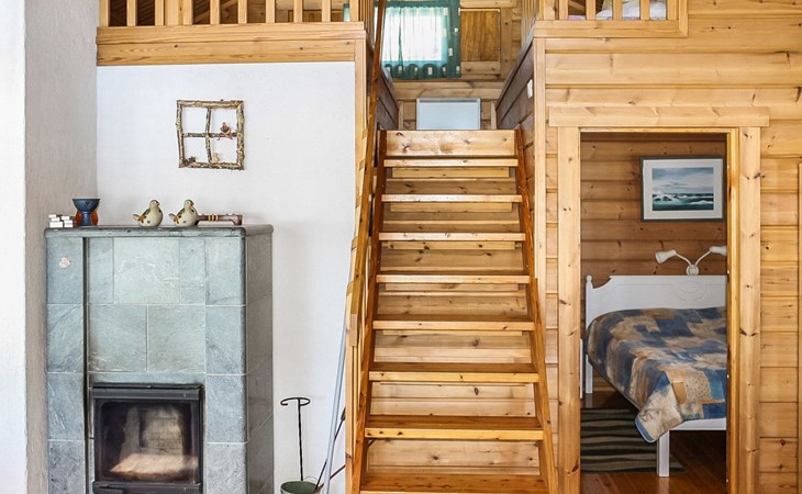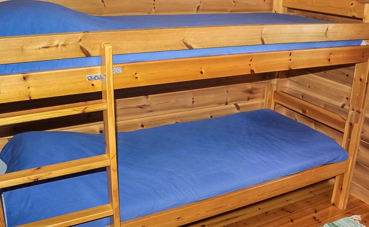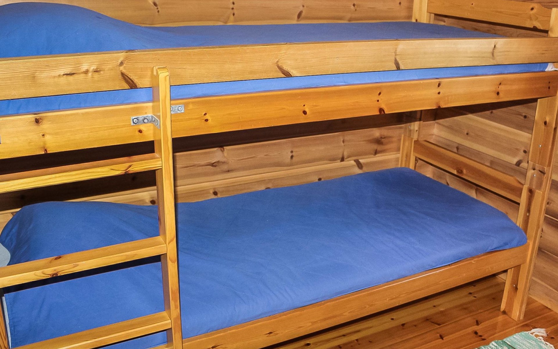 Wooden cabin 1994, living room/kitchen, bedroom with double bed, bedroom with bunk bed, sleeping loft (10 m²) with 3 mattresses, washroom, foyer, sauna, open veranda.