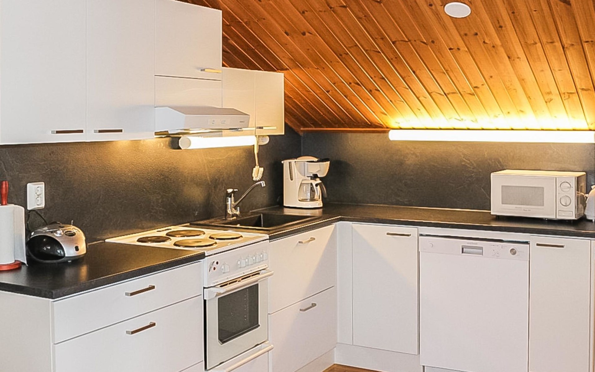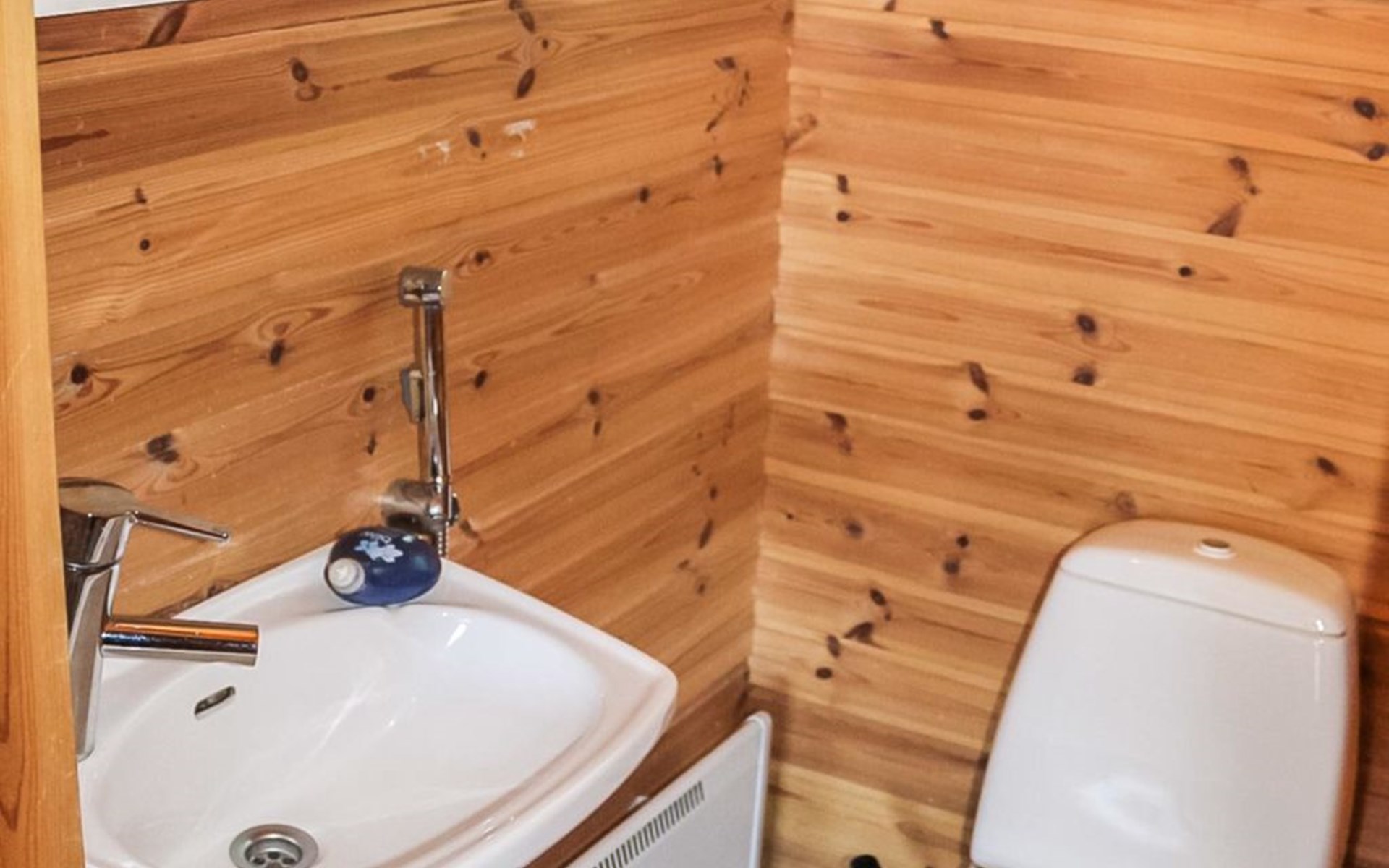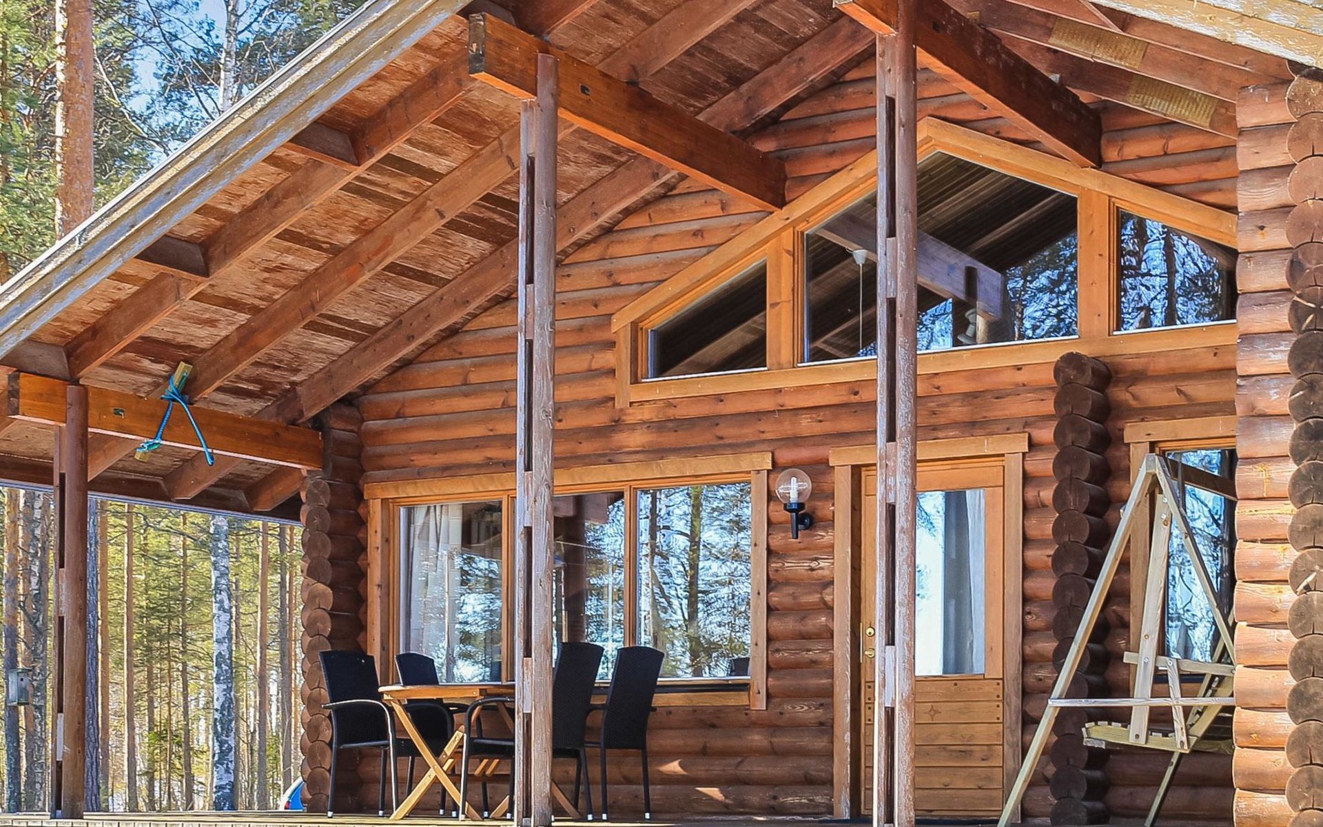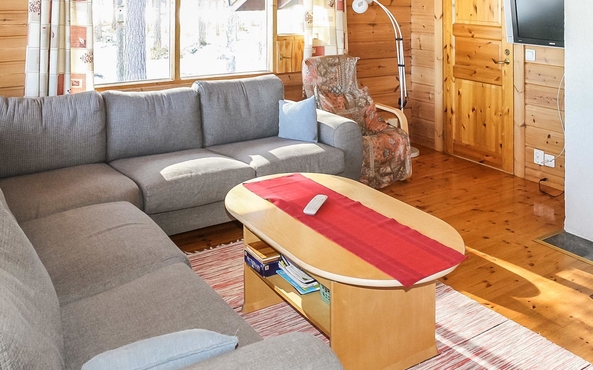 Wooden cabin 1994, living room/kitchen, bedroom with double bed, bedroom with bunk bed, sleeping loft (10 m²) with 3 mattresses, washroom, foyer, sauna, open veranda.