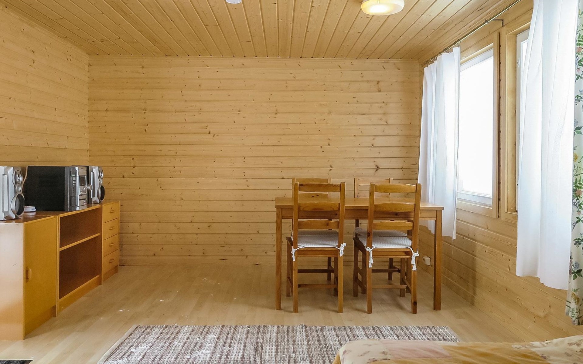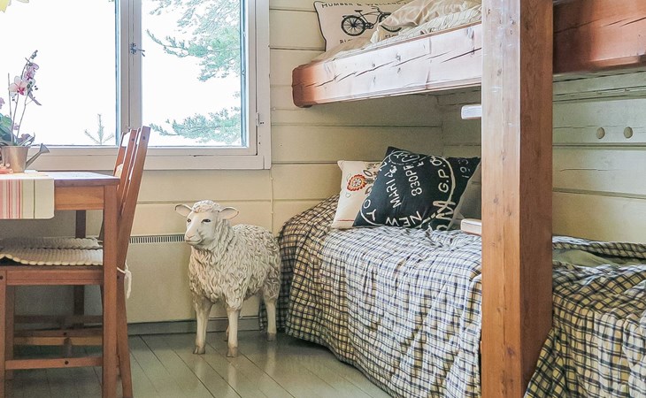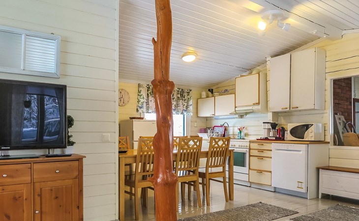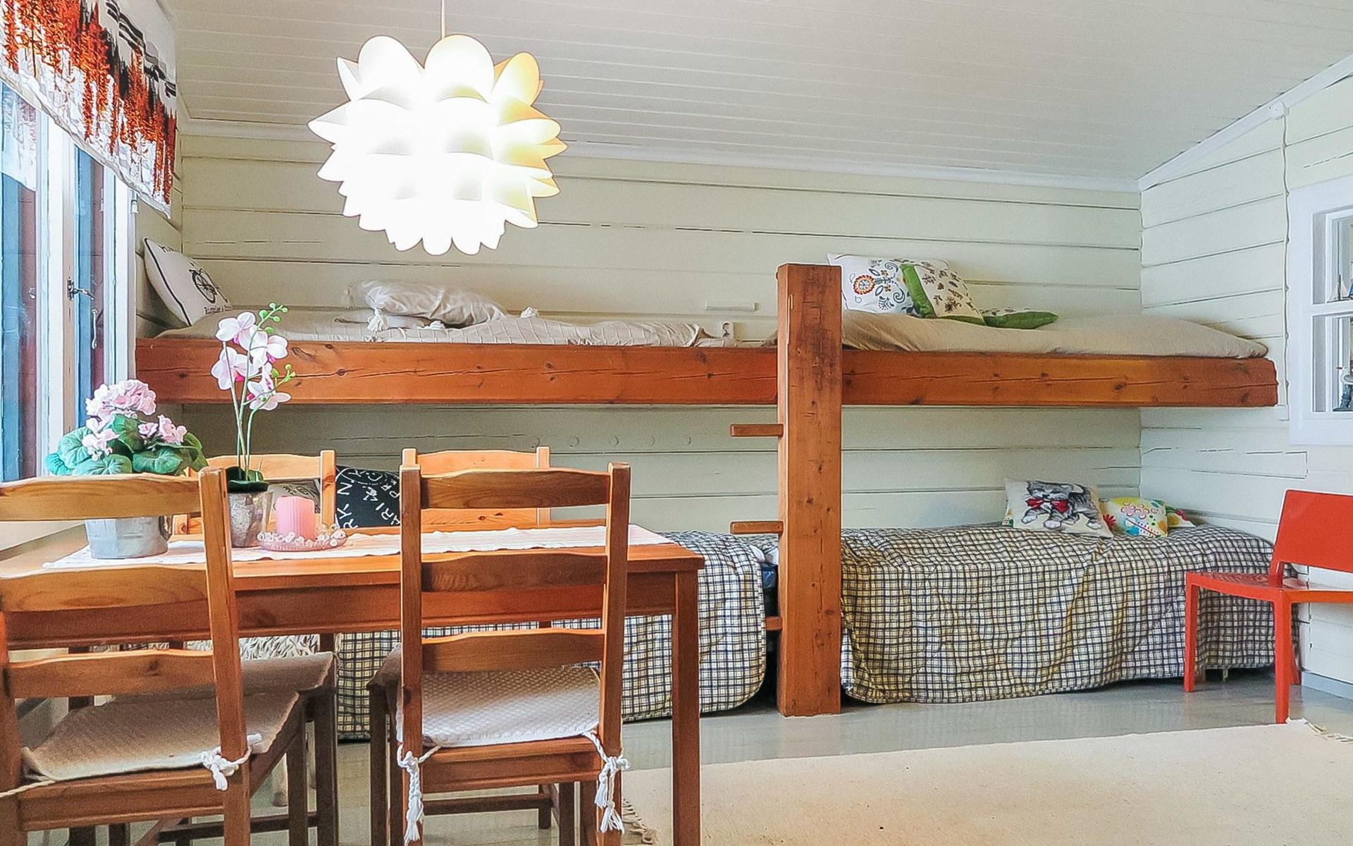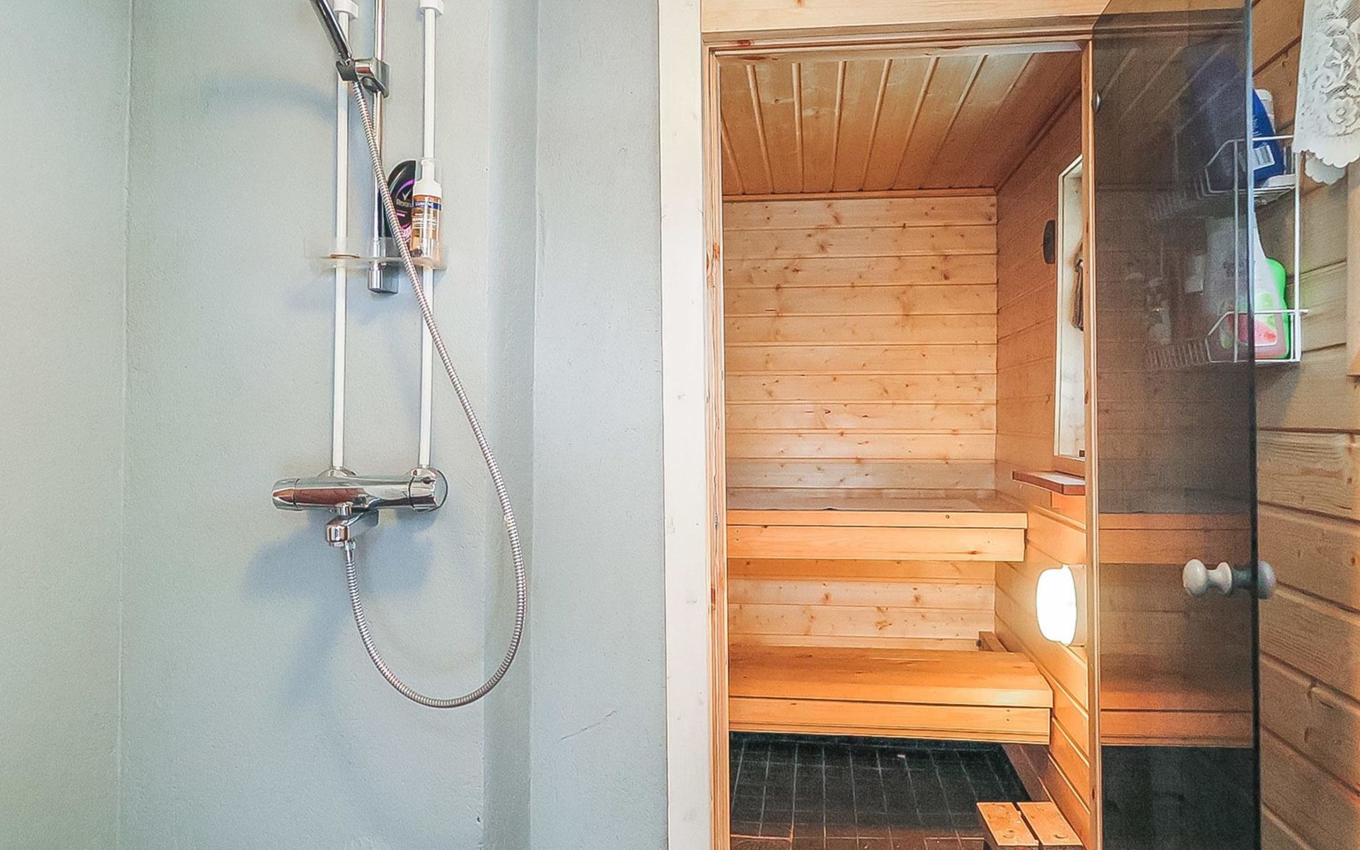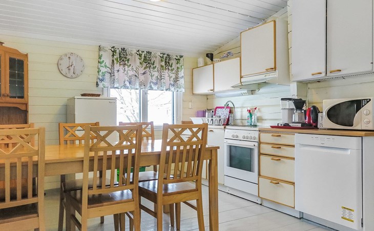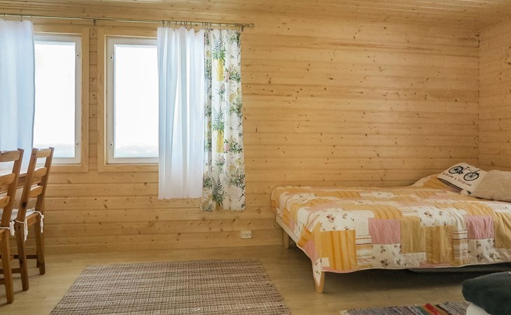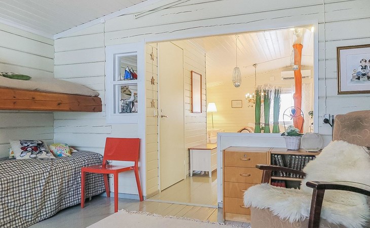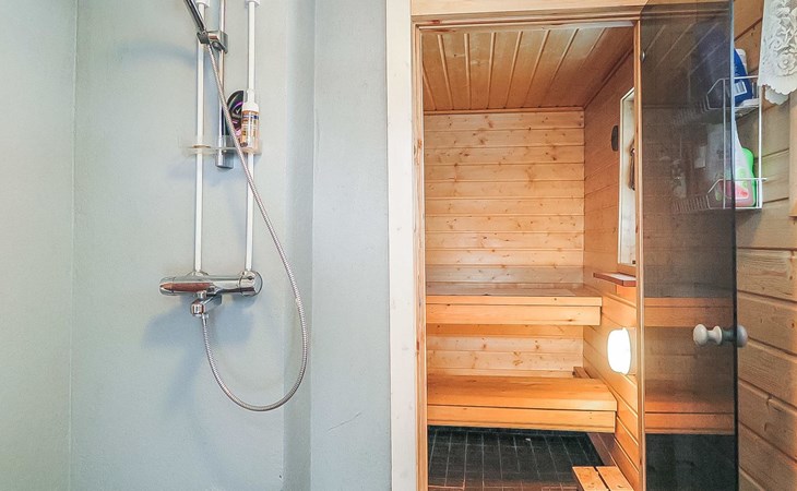 Combined kitchen-living room, 2 bunk beds in extension part, bedroom with double bed (width 140 cm), wood-heated sauna, wash room, separate toilet, terrace.