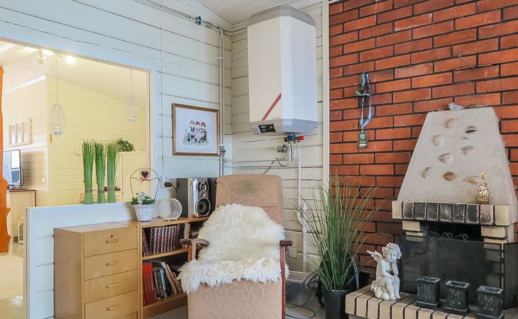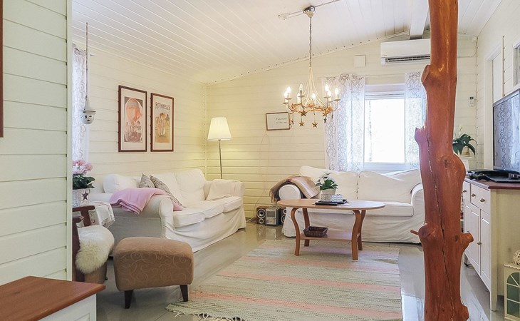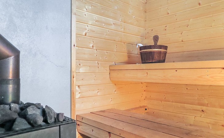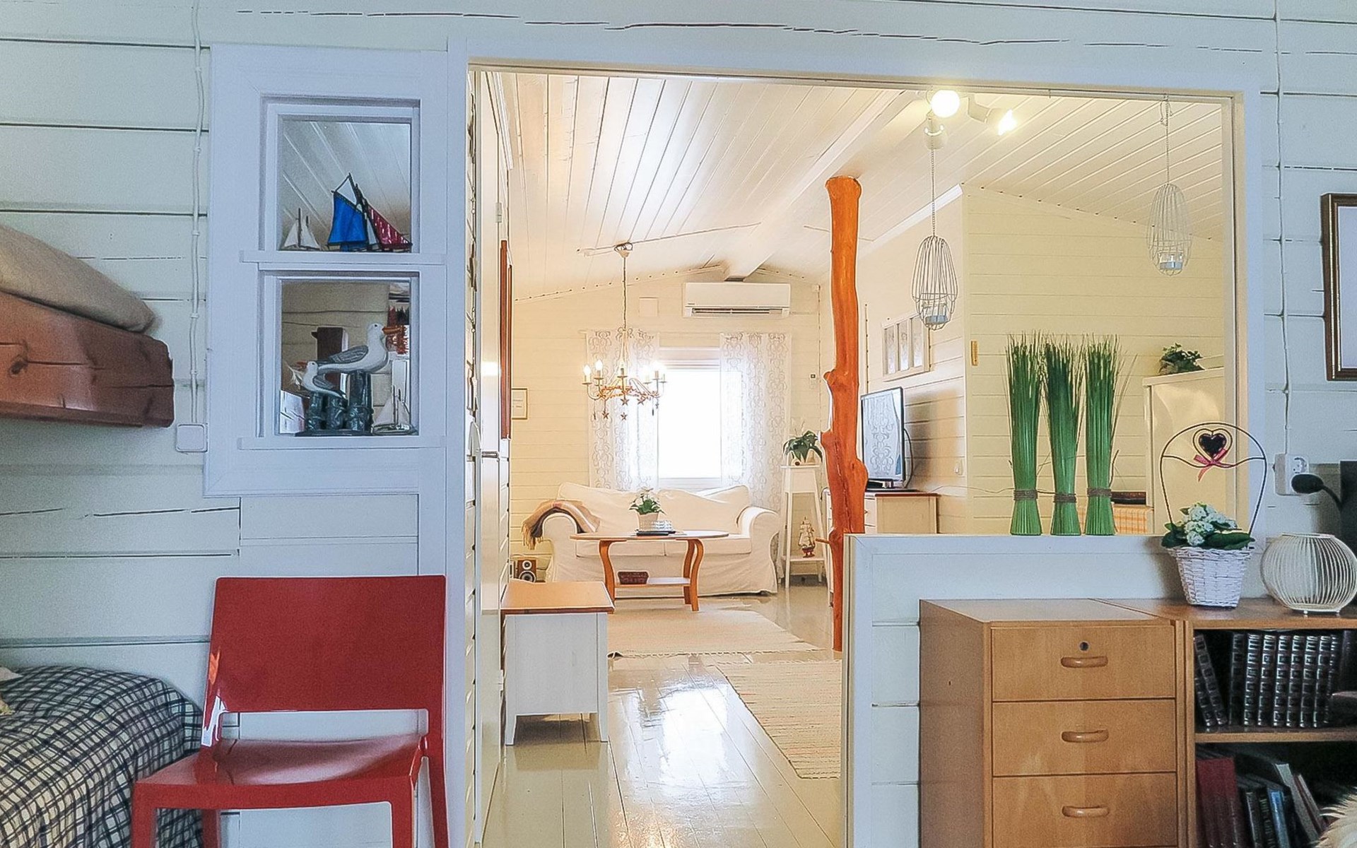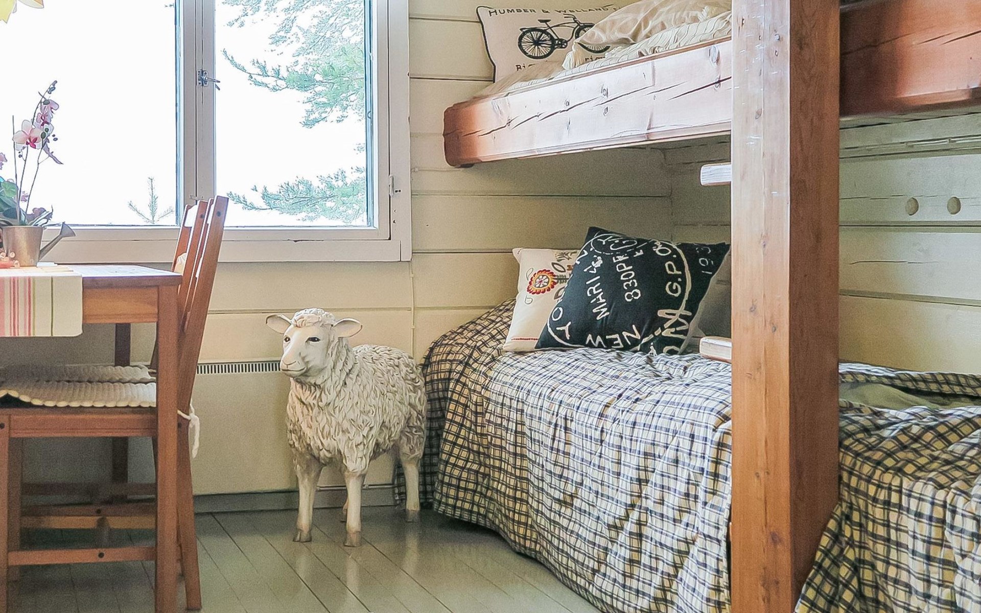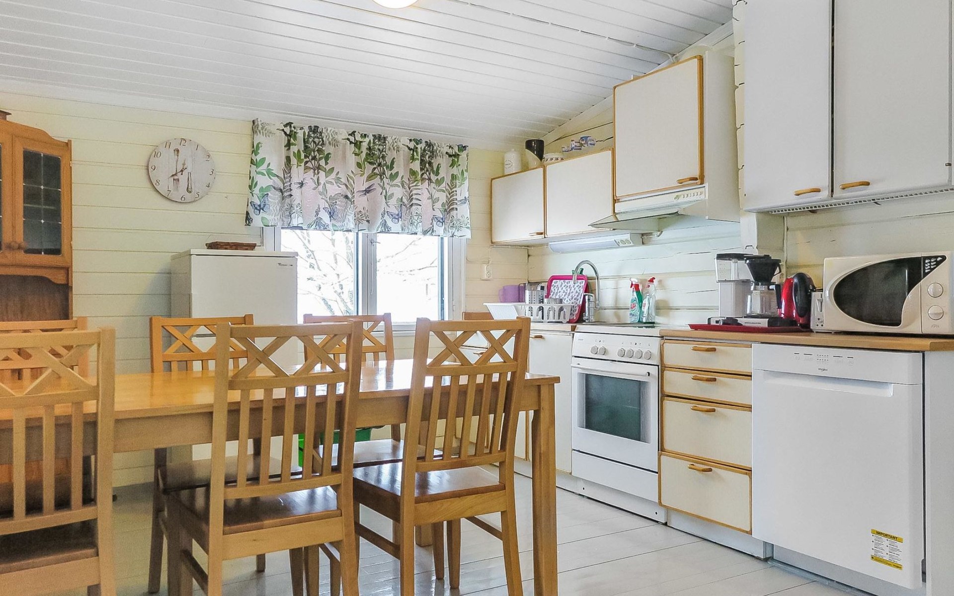 Combined kitchen-living room, 2 bunk beds in extension part, bedroom with double bed (width 140 cm), wood-heated sauna, wash room, separate toilet, terrace.