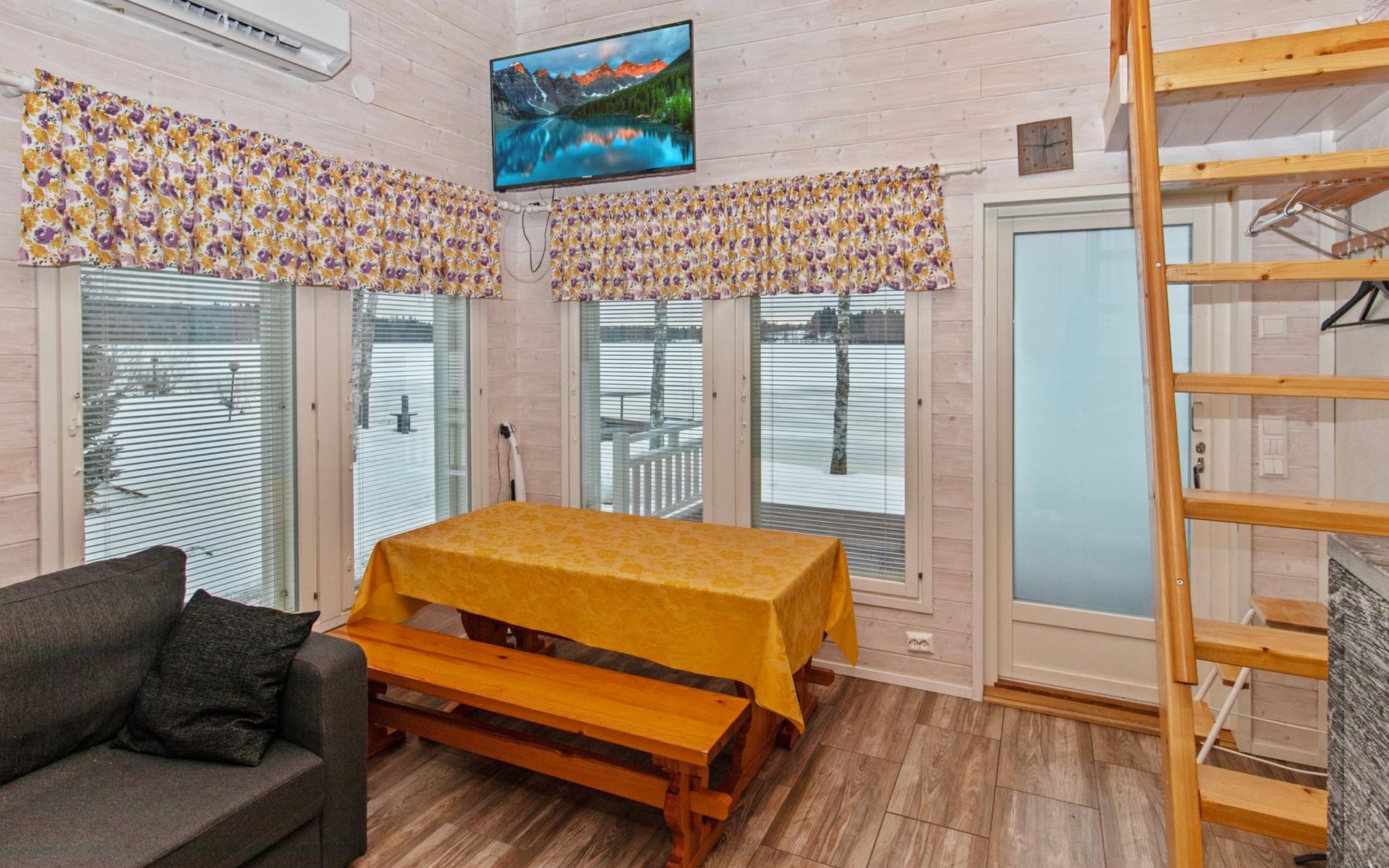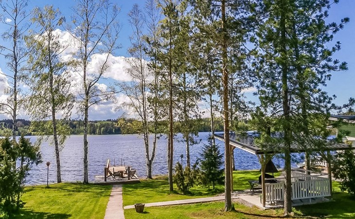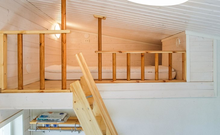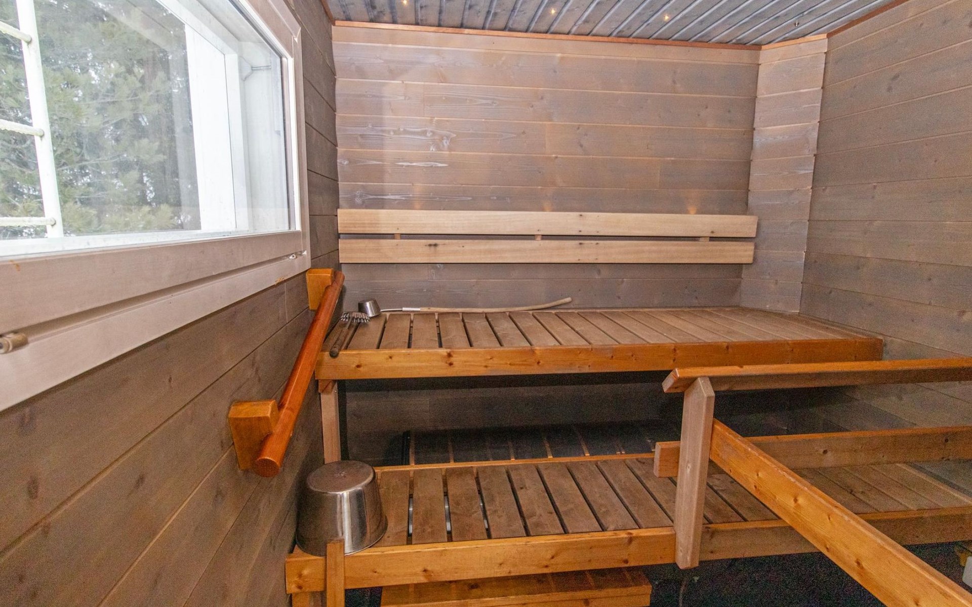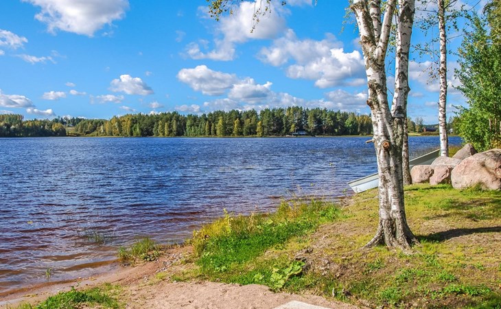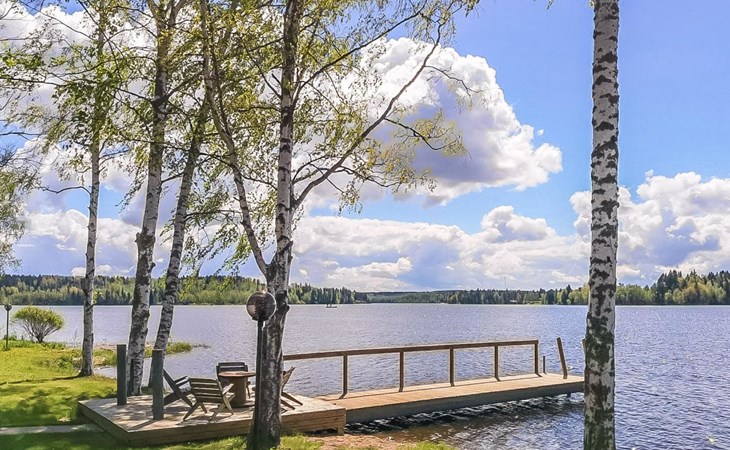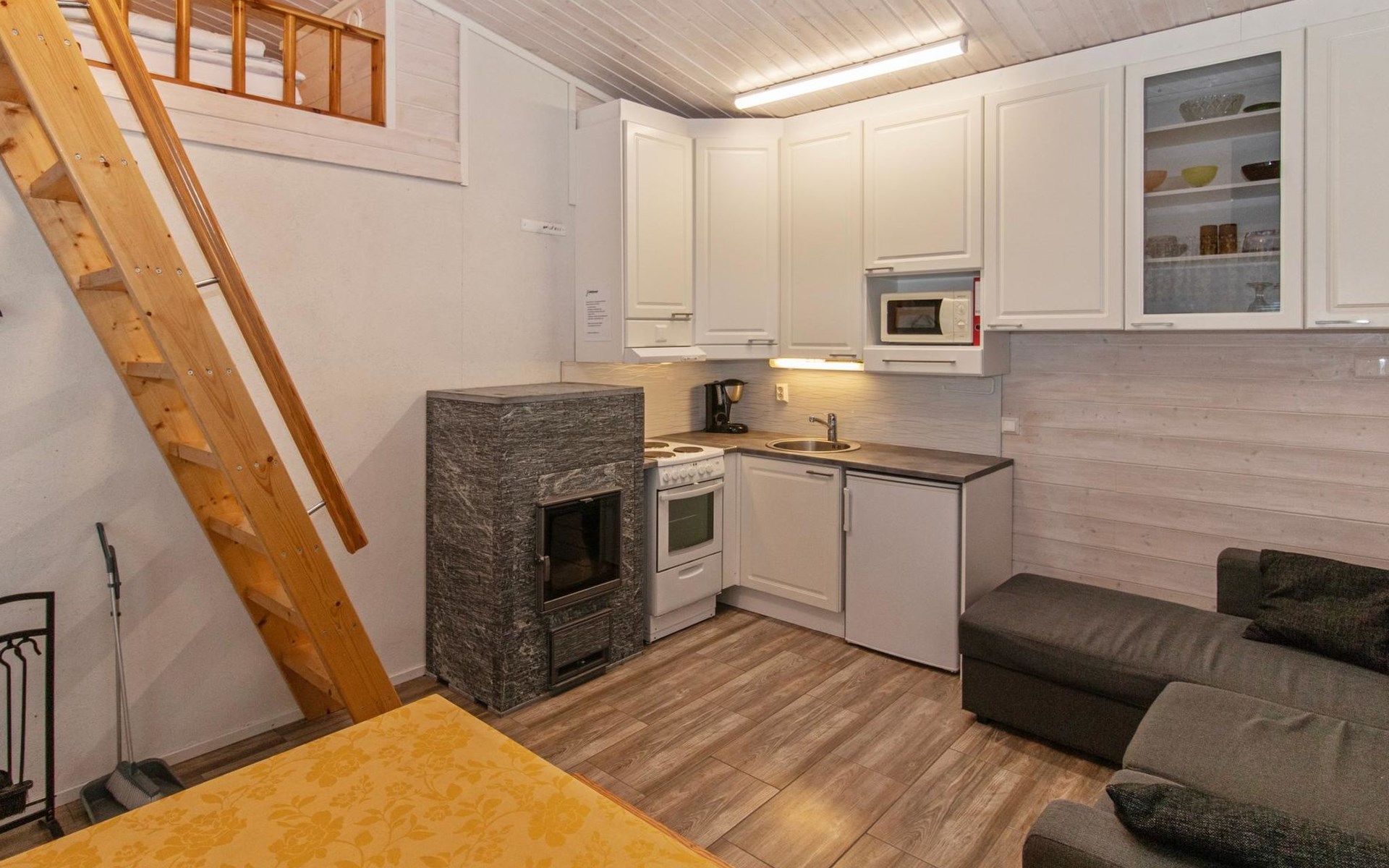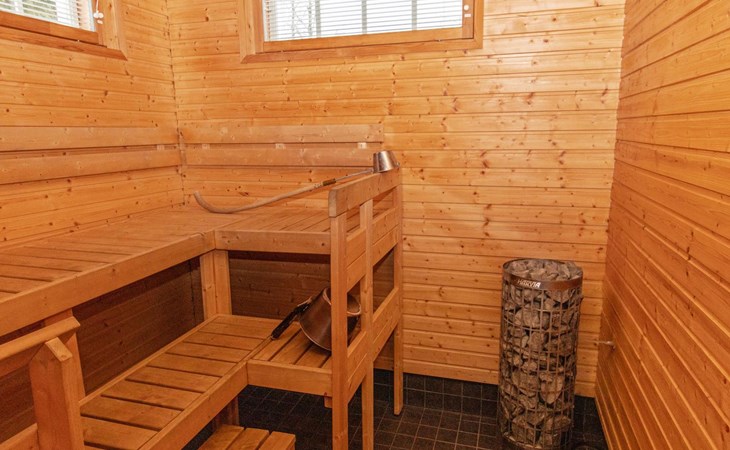 The lakeside sauna was completed in 2019. The sauna measures 28 m² + loft and features a wood-heated sauna, a spacious bathroom with a shower and WC, a cozy living area with a 140 cm wide pull-out sofa bed, a kitchenette, and a heat-storing fireplace. The stairs lead to the loft, where there are two mattresses.