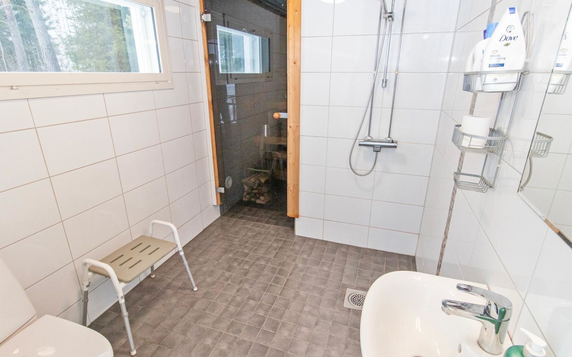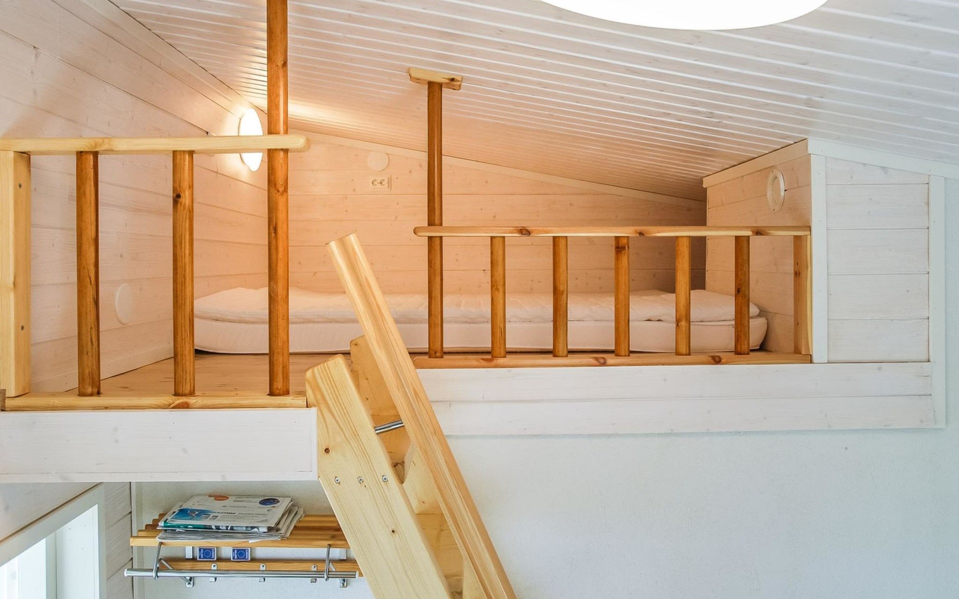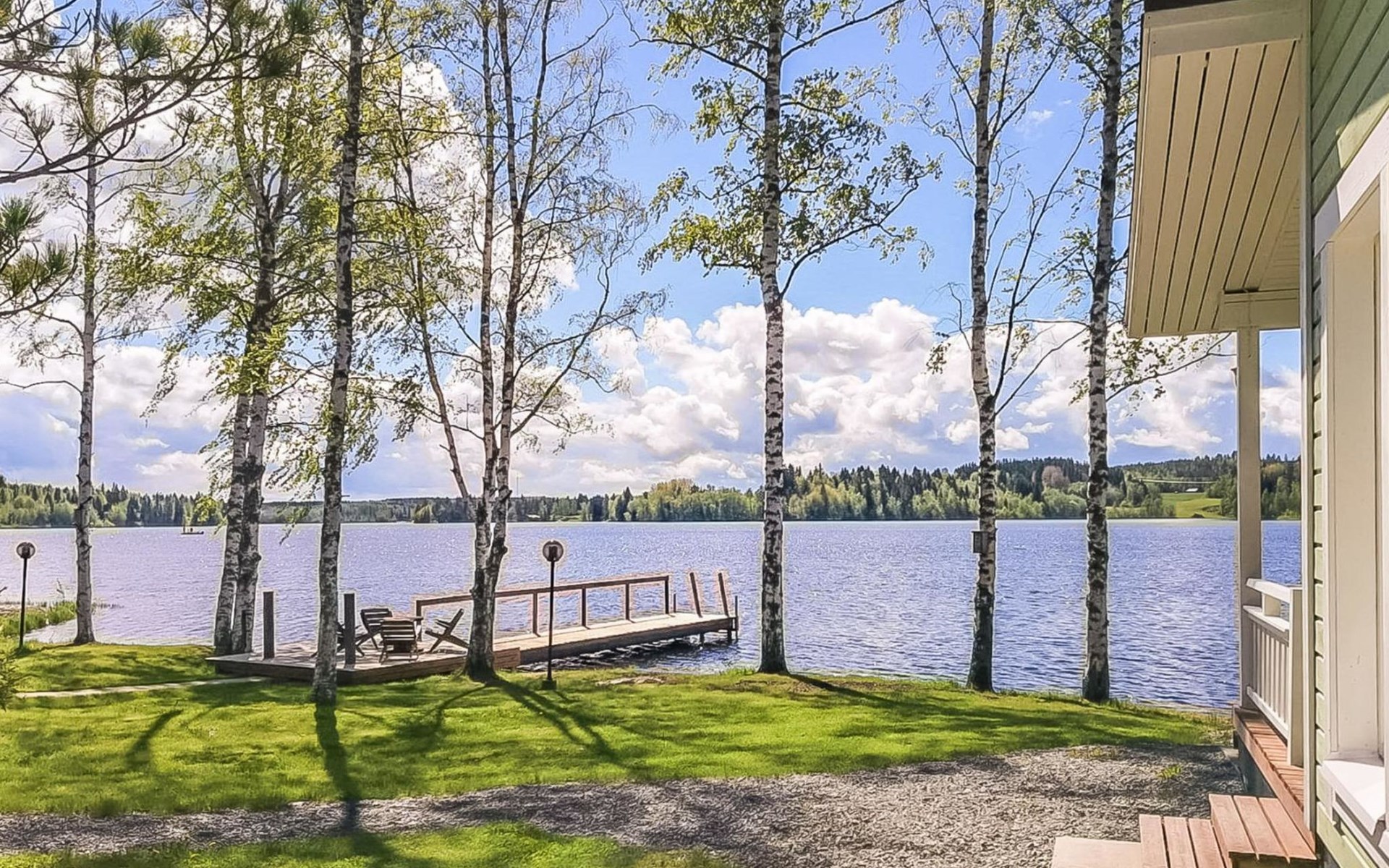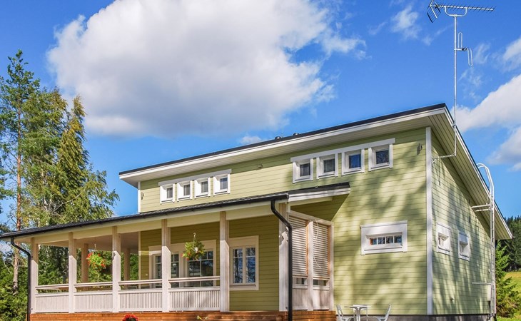 The lakeside sauna was completed in 2019. The sauna measures 28 m² + loft and features a wood-heated sauna, a spacious bathroom with a shower and WC, a cozy living area with a 140 cm wide pull-out sofa bed, a kitchenette, and a heat-storing fireplace. The stairs lead to the loft, where there are two mattresses.