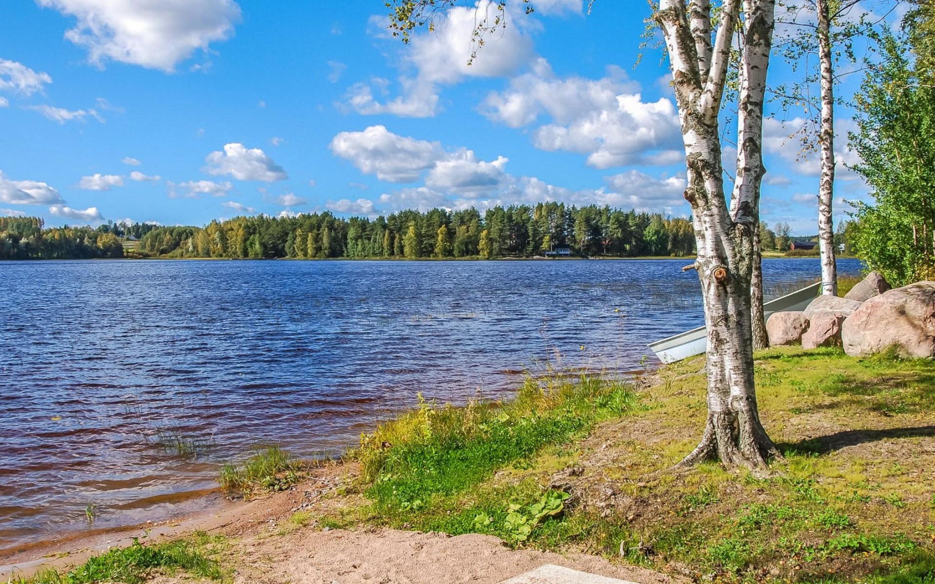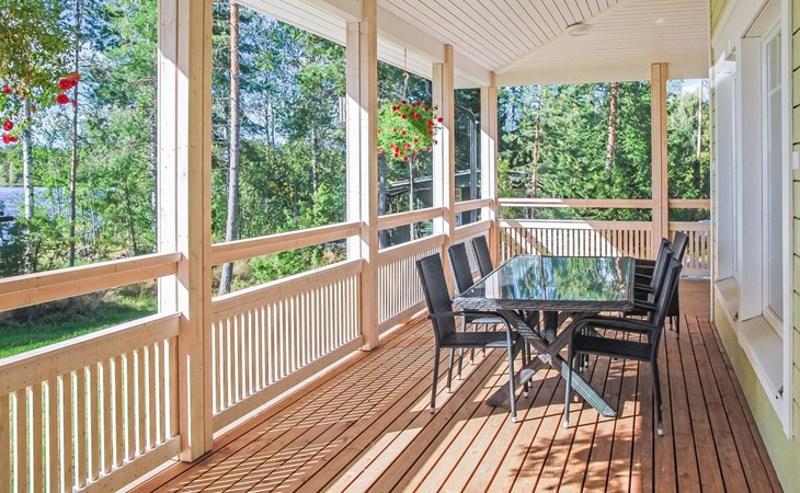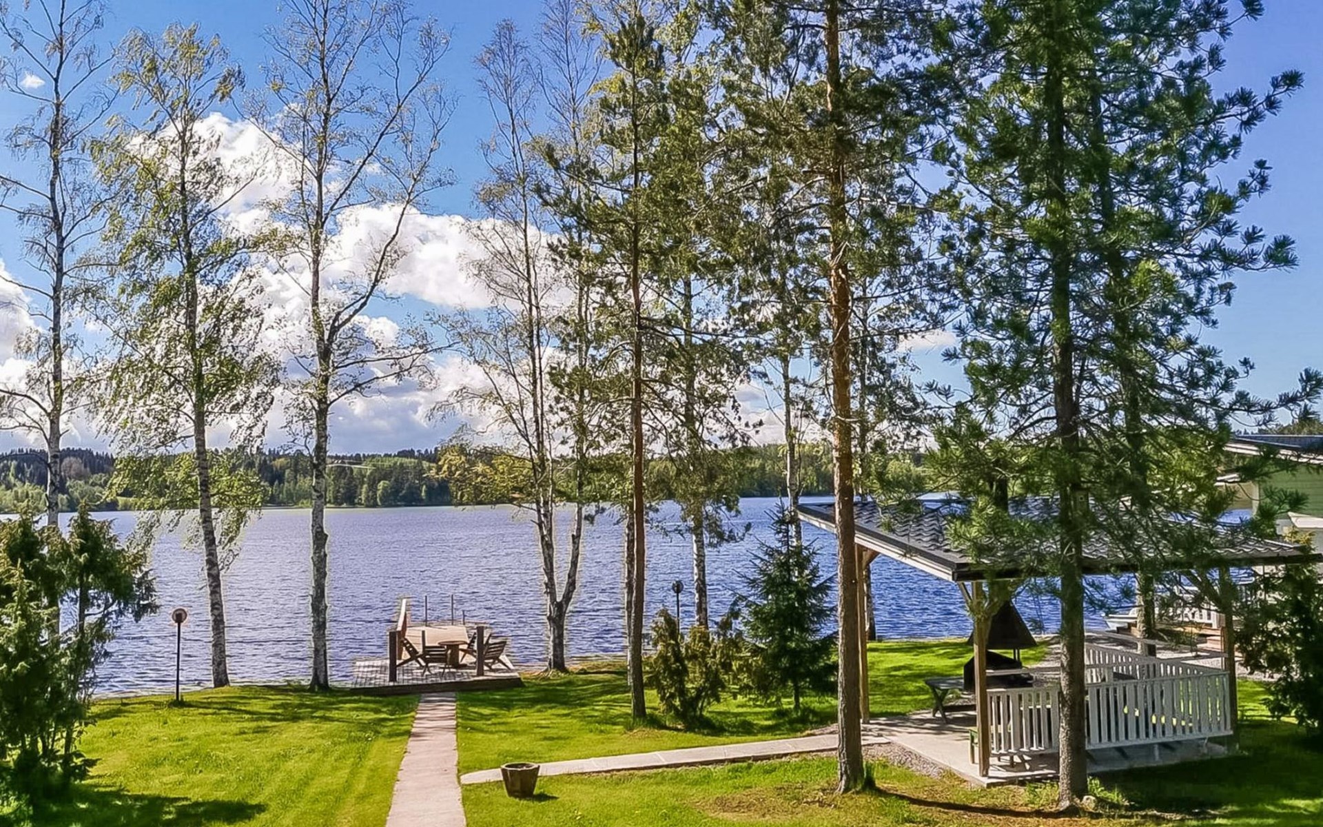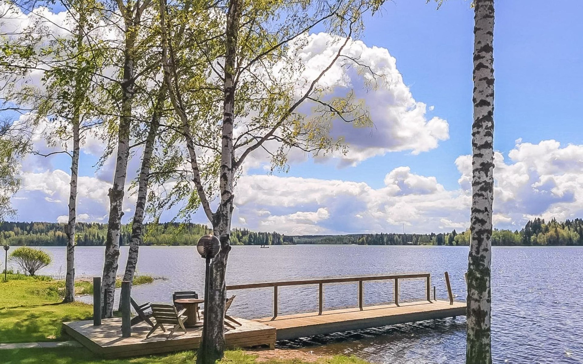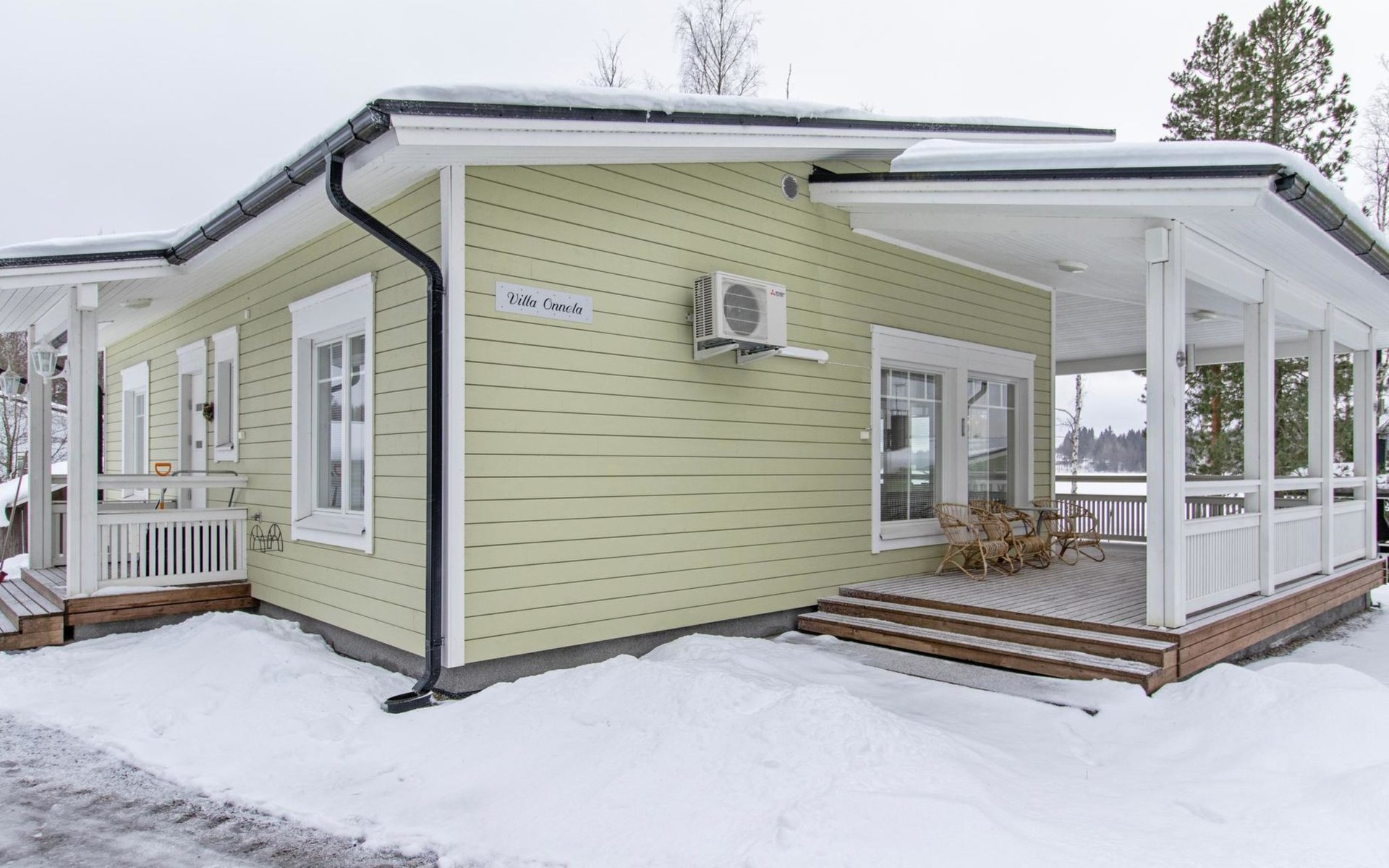 The lakeside sauna was completed in 2019. The sauna measures 28 m² + loft and features a wood-heated sauna, a spacious bathroom with a shower and WC, a cozy living area with a 140 cm wide pull-out sofa bed, a kitchenette, and a heat-storing fireplace. The stairs lead to the loft, where there are two mattresses.