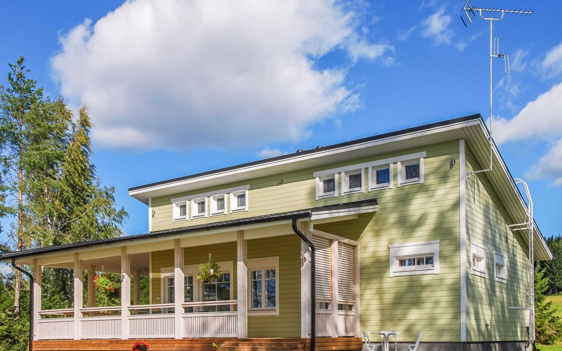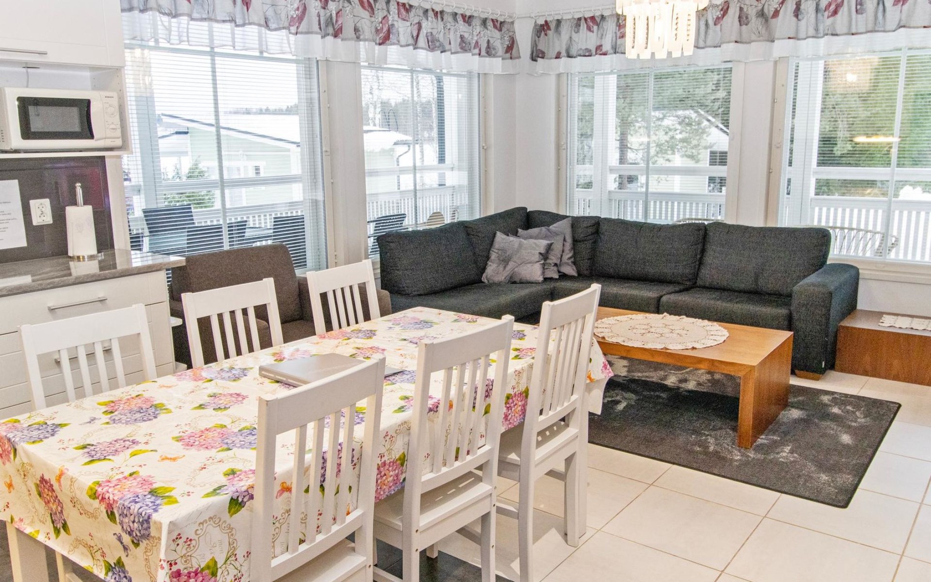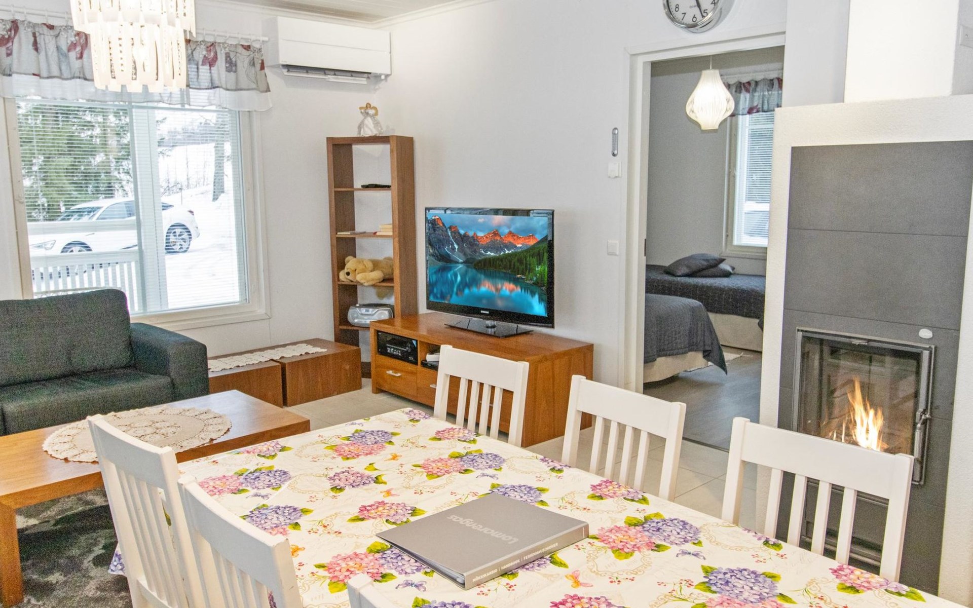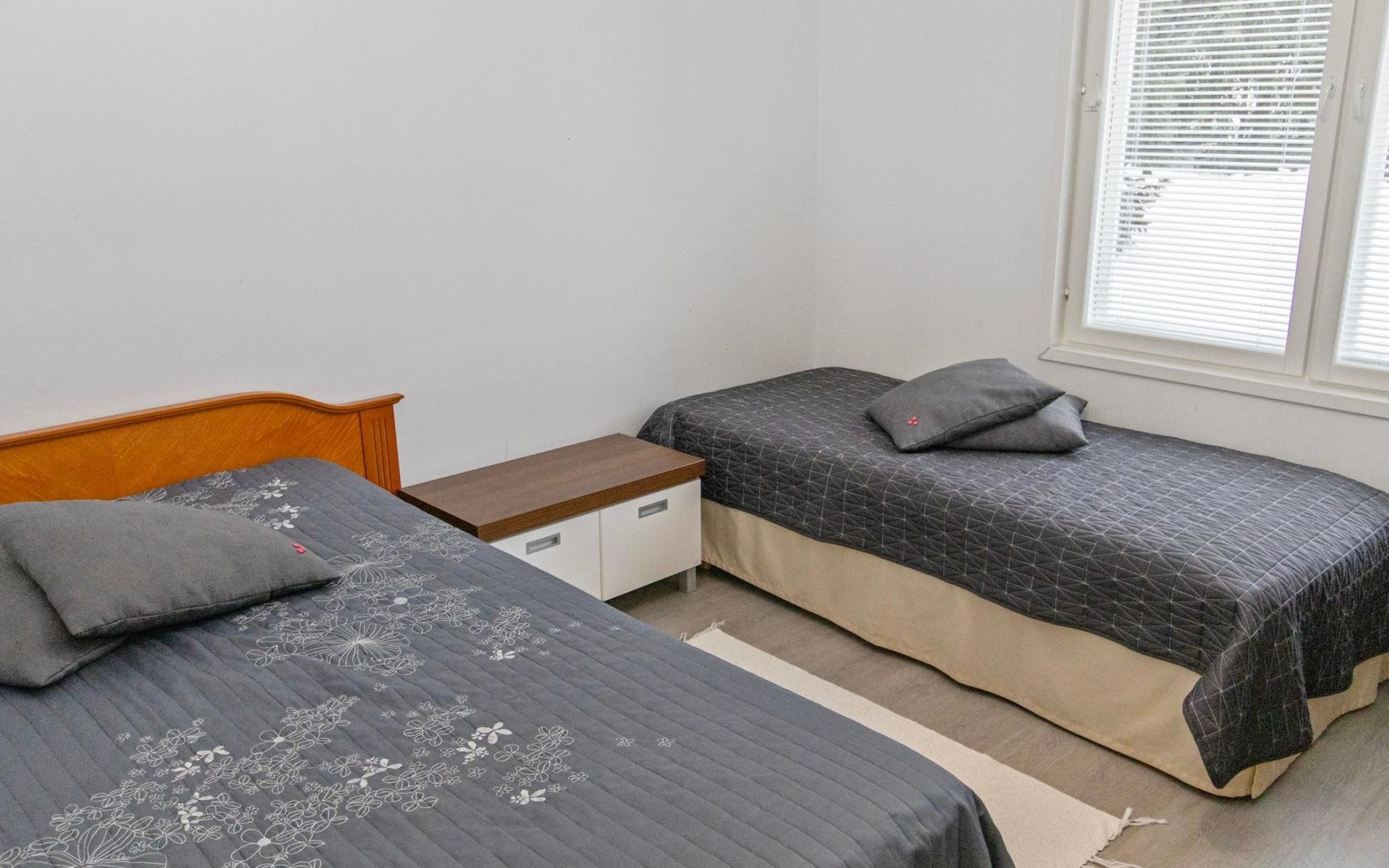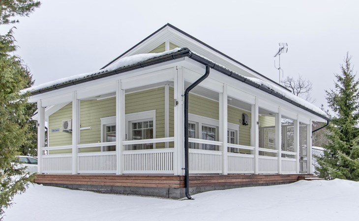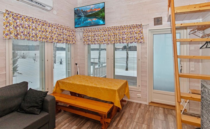 The main cabin features a spacious living room/kitchen, a utility room with a full-height freezer, an electric sauna, a bathroom with an additional WC, and a separate WC. There are two bedrooms in the cabin: one with a double bed, and the other with two single beds, one of which is 120 cm wide. For additional sleeping space, the living room has a fold-out armchair bed.