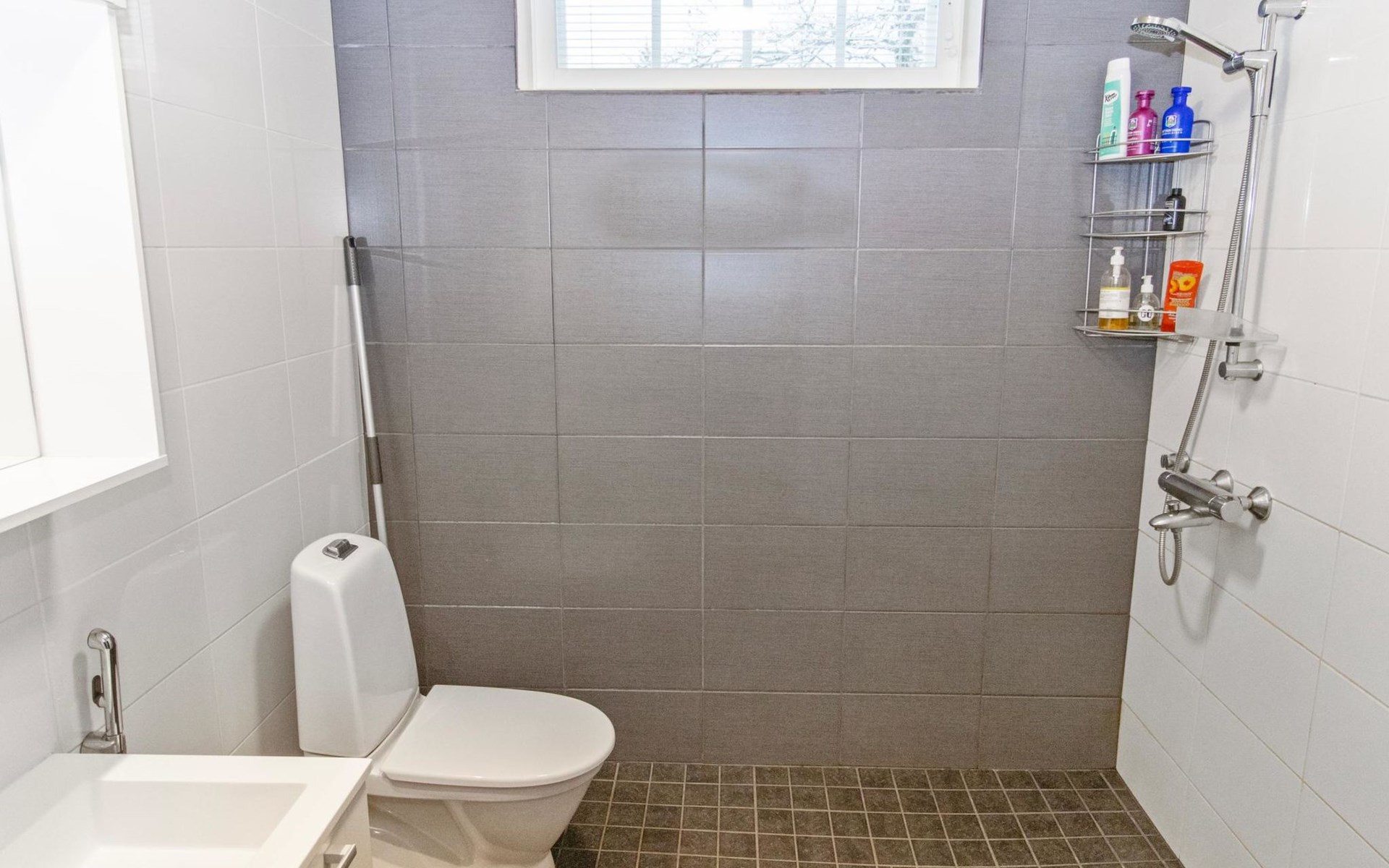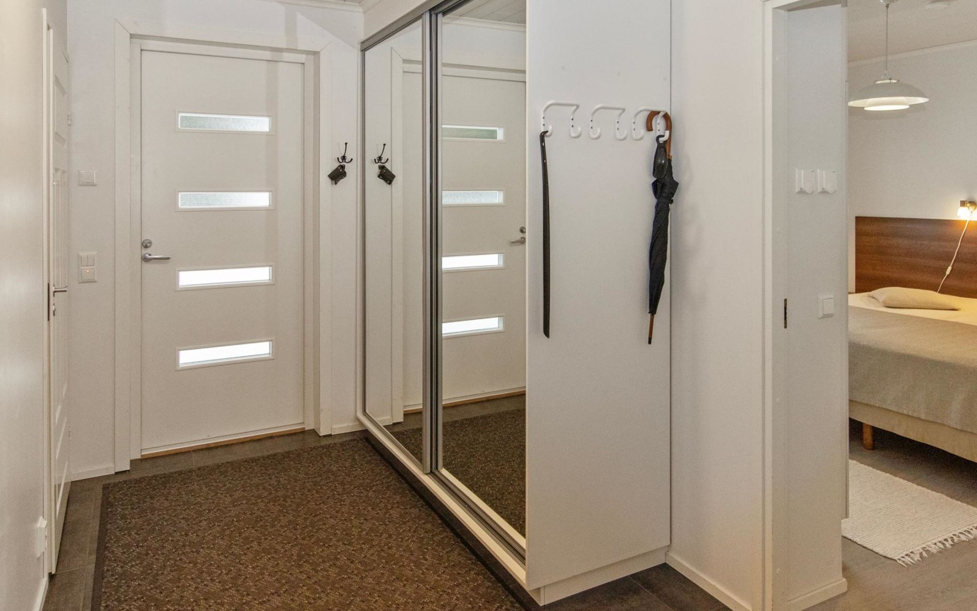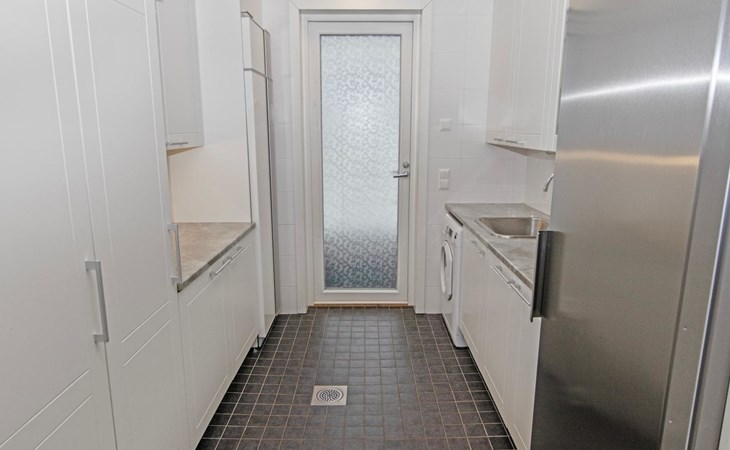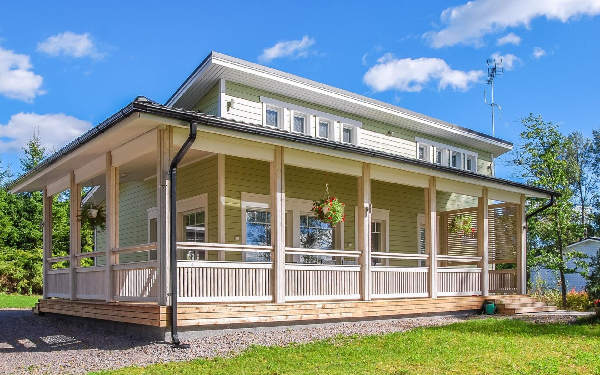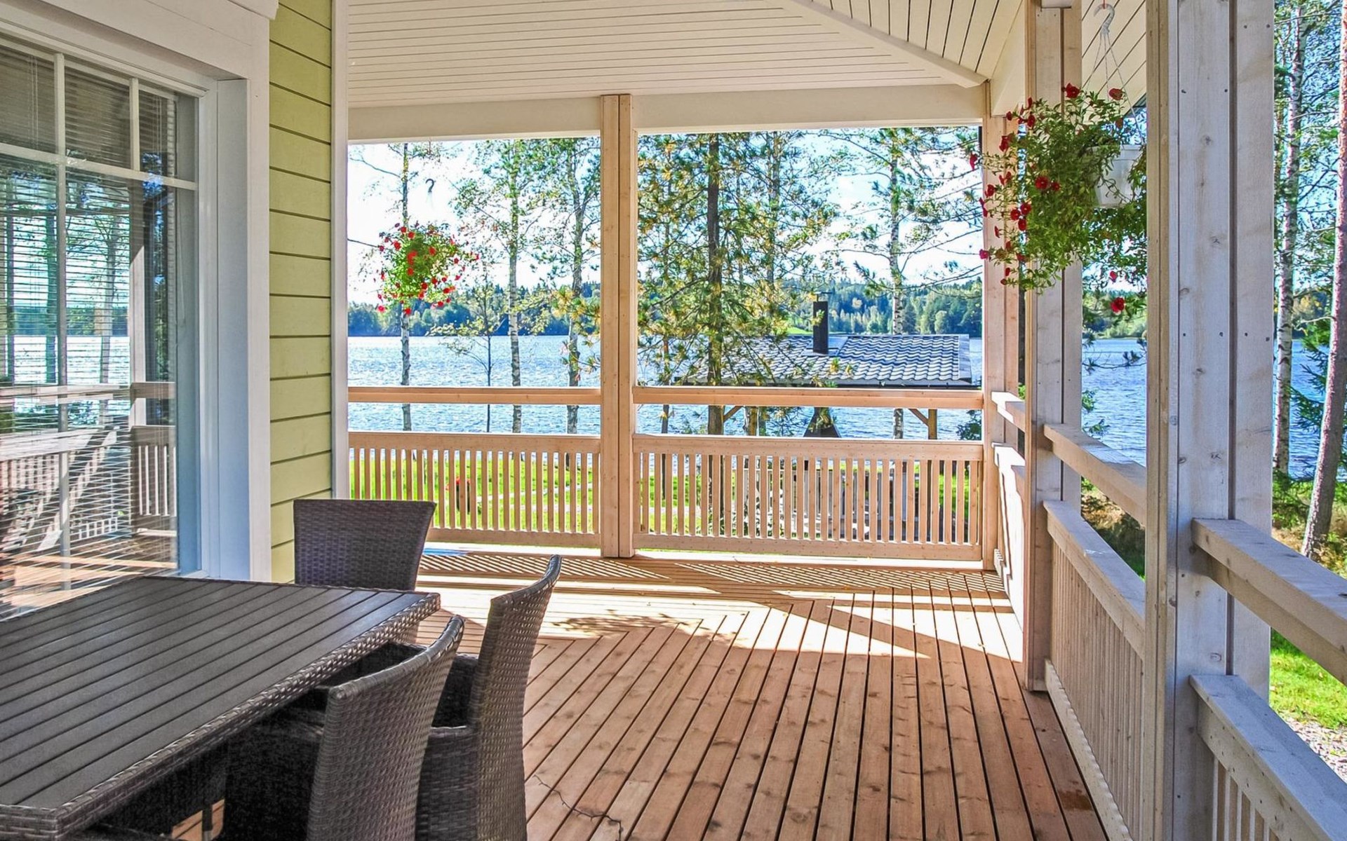 The main cabin features a spacious living room/kitchen, a utility room with a full-height freezer, an electric sauna, a bathroom with an additional WC, and a separate WC. There are two bedrooms in the cabin: one with a double bed, and the other with two single beds, one of which is 120 cm wide. For additional sleeping space, the living room has a fold-out armchair bed.