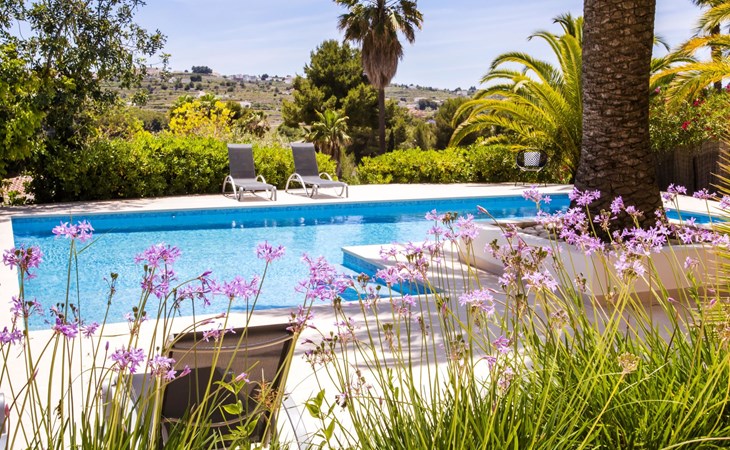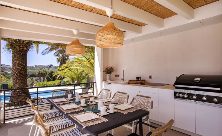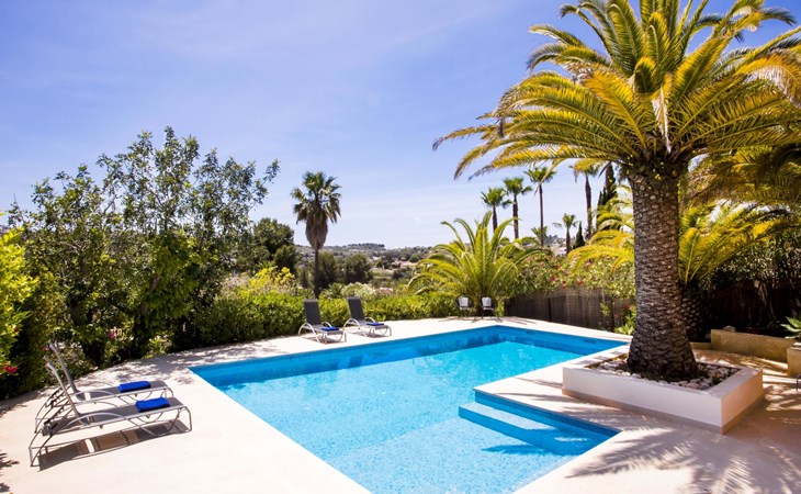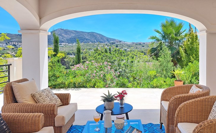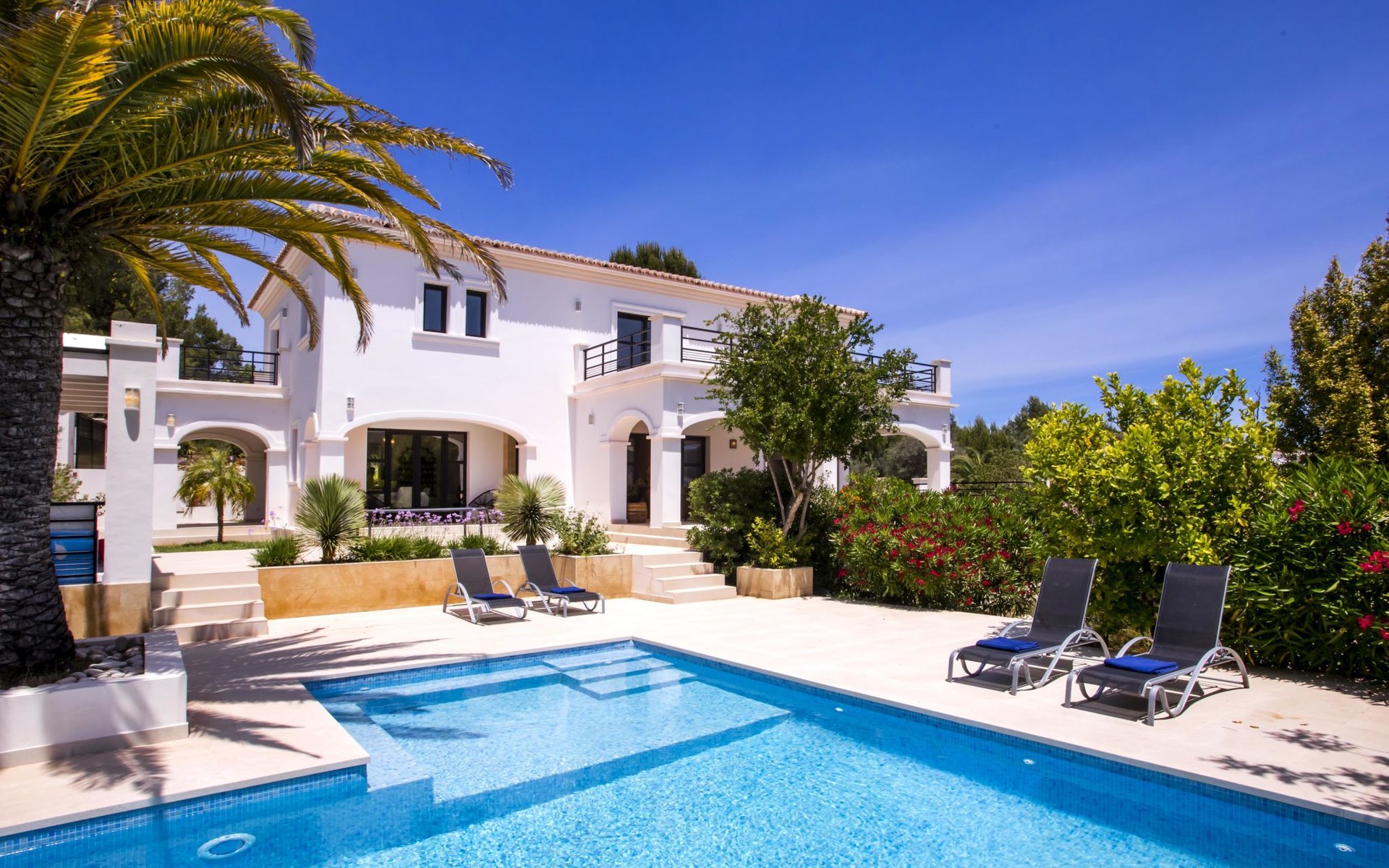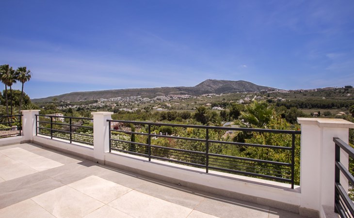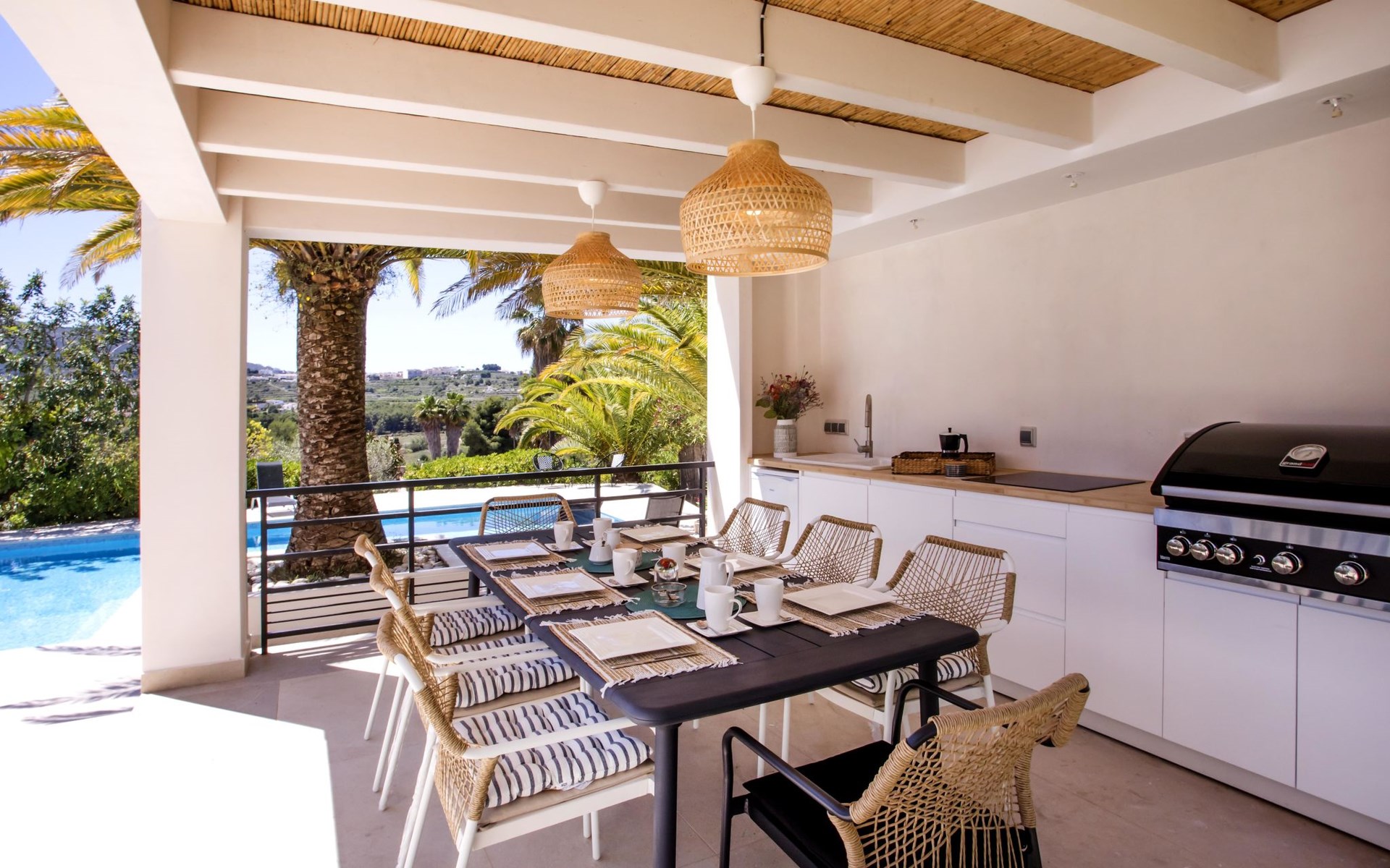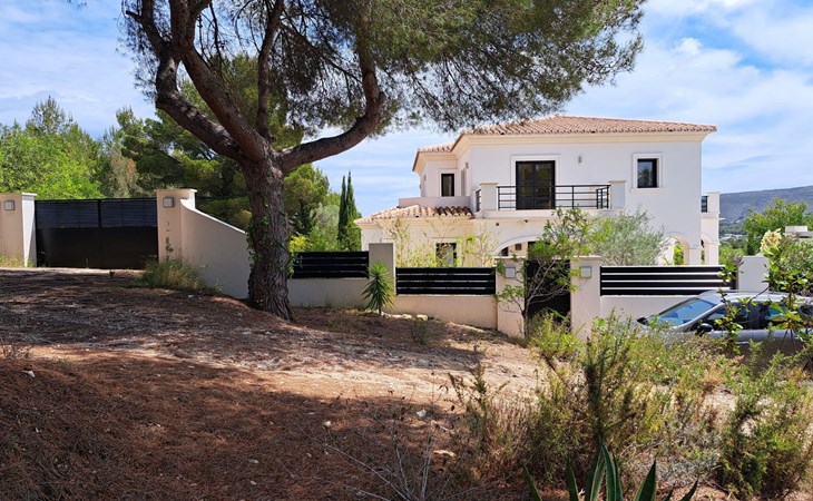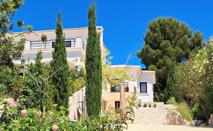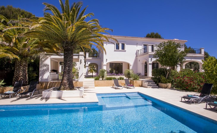 Very large, very modern, very luxurious villa "Almandrina", 2 storeys. In the district of La Lluca, in the resort 7 km from the centre of Javea - El Arenal, in a quiet, sunny position, 25 m from the edge of the forest, 7 km from the sea, 7 km from the beach. Private: property 2'000 m2 (fenced), large, beautiful, well-kept terraced garden with lawn and trees, swimming pool (10 x 5 m, depth 90 - 190 cm, seasonal availability: 01.Jan. - 31.Dec.) with internal staircase. Unconventional pool shape. Paddling pool, outdoor shower, pool house with fridge and cooking stove, pergola, garden furniture, barbecue house. In the house: air conditioning, laundry, washing machine. Parking on the premises, single garage. Shop 9 km, supermarket 2 km, shopping centre 20 km, restaurant 3 km, café 3 km, internet café 7 km, bus stop 7 km, sandy beach "Playa del Arenal" 7 km, shingle beach "Playa de Portitchol" 13 km, diving center 7 km. Sports harbour 7 km, golf course (9 hole) 2 km, surf school 7 km, sailing school 7 km, tennis 3 km, riding stable 10 km. Nearby attractions: Aqualandia Benidorm 40 km, Oceanografico Valencia 110 km. Hiking paths: Portichol 10 km. The owner does not accept any youth groups. Neighbourhood highly sensitive to noise. Quietness and good behaviour expected.