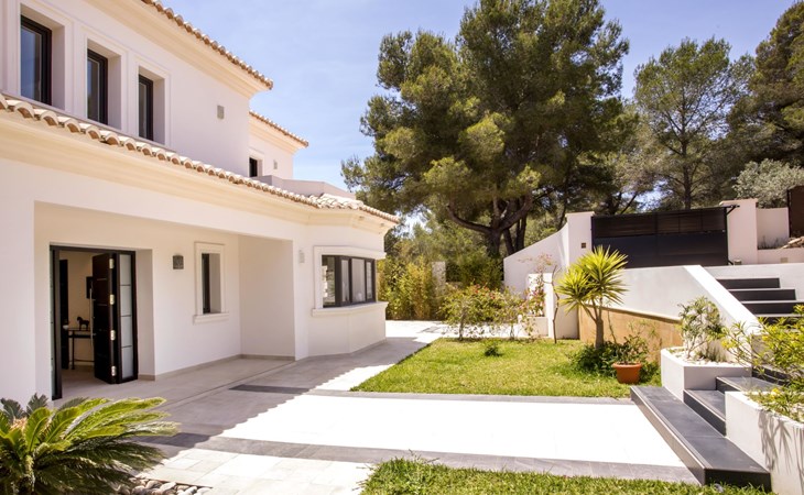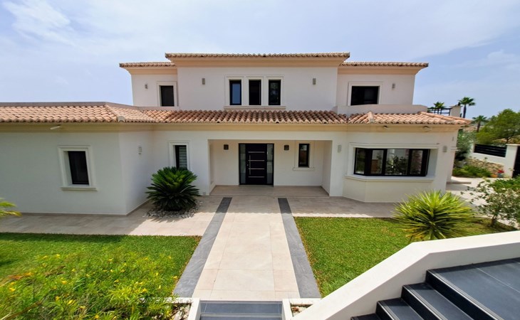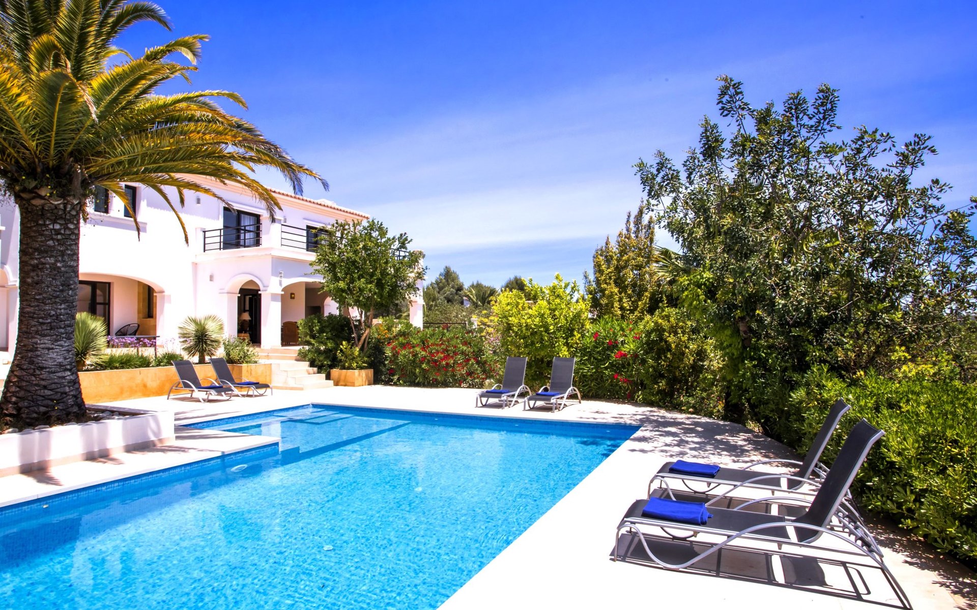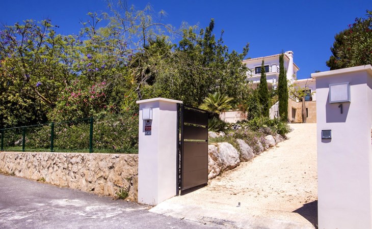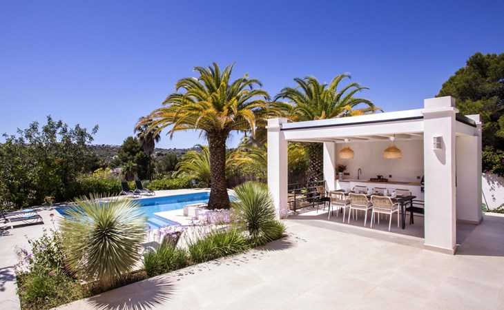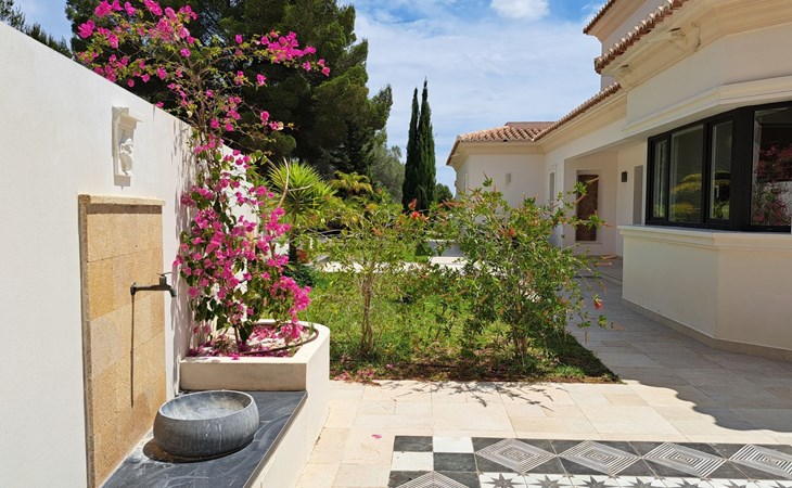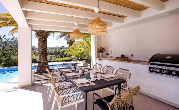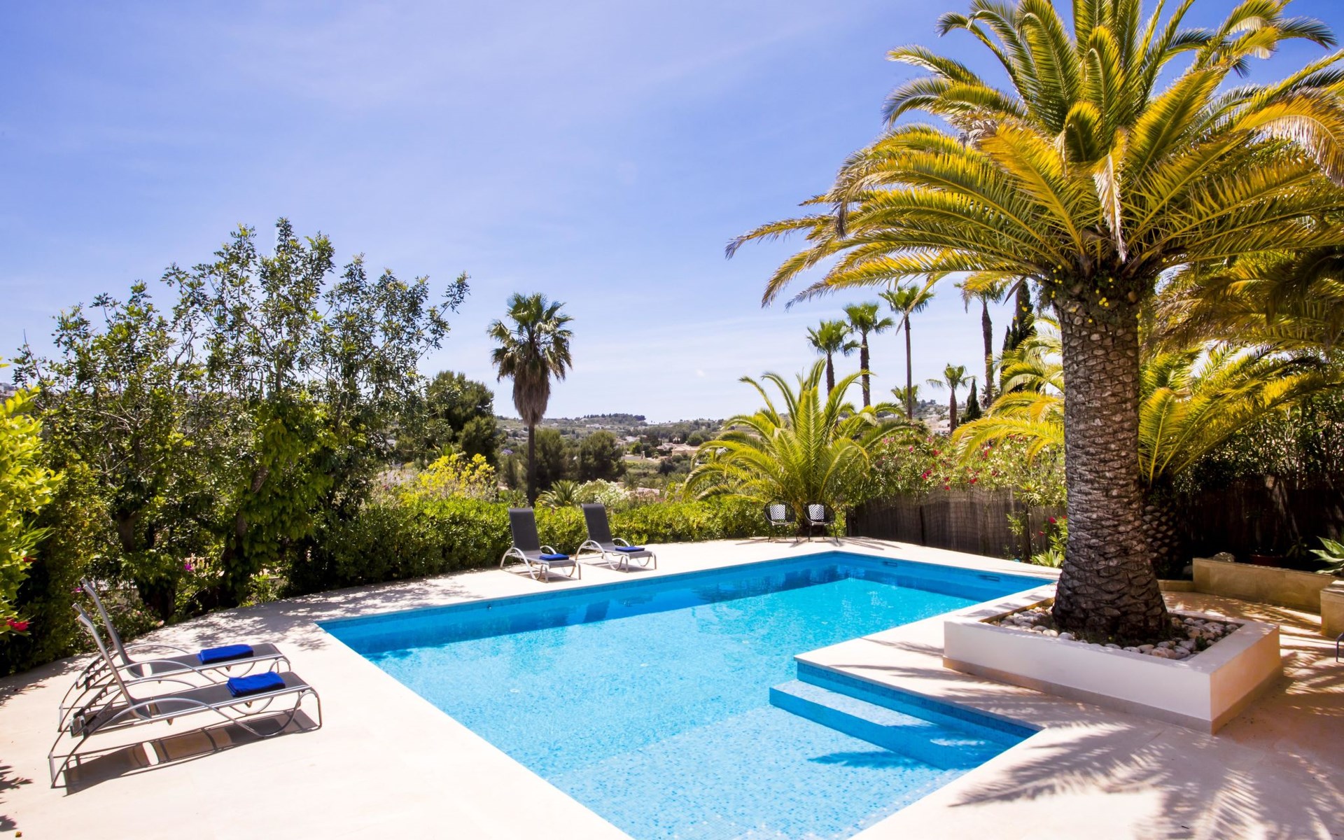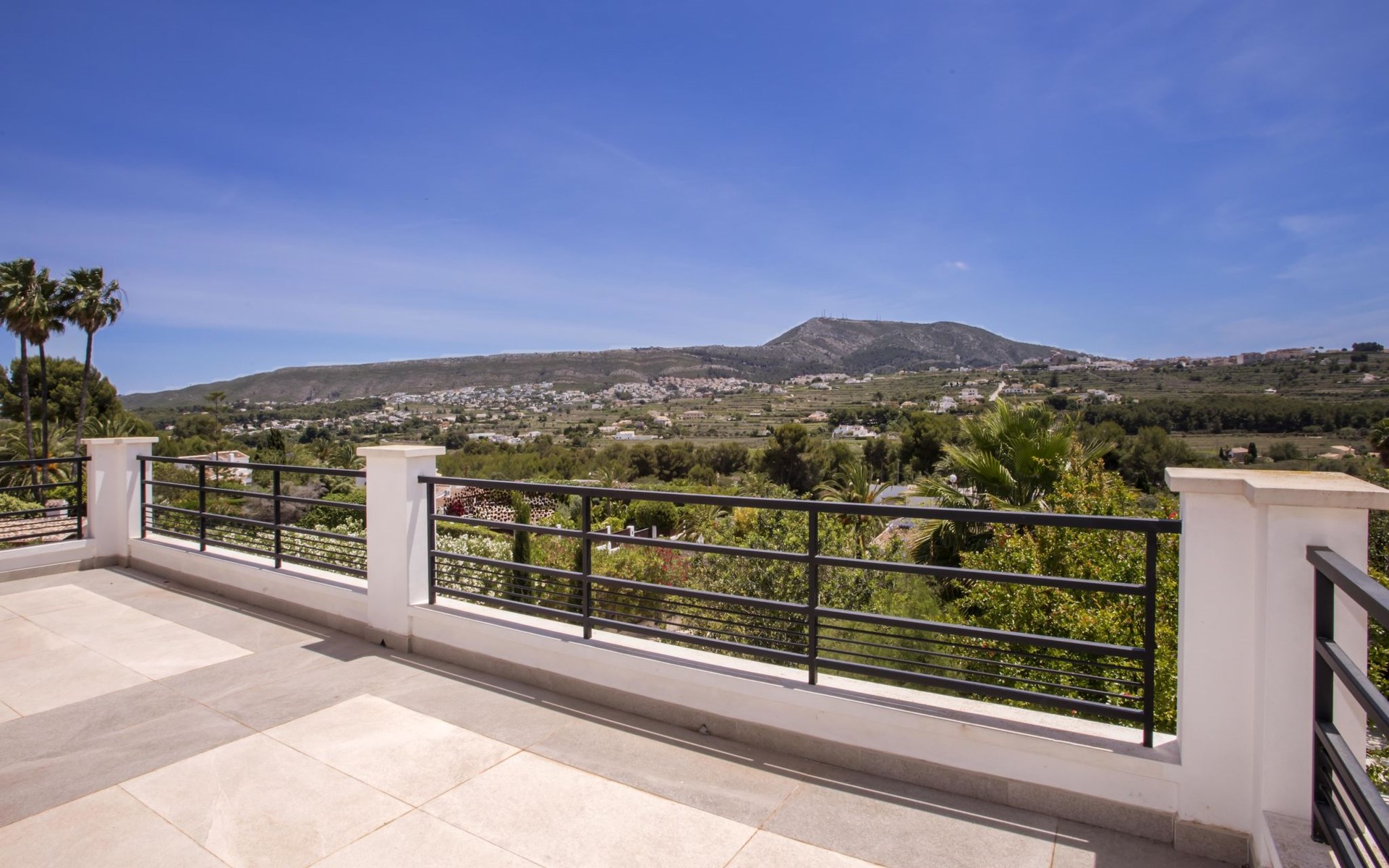Very large, very modern, very luxurious villa "Almandrina", 2 storeys. In the district of La Lluca, in the resort 7 km from the centre of Javea - El Arenal, in a quiet, sunny position, 25 m from the edge of the forest, 7 km from the sea, 7 km from the beach. Private: property 2'000 m2 (fenced), large, beautiful, well-kept terraced garden with lawn and trees, swimming pool (10 x 5 m, depth 90 - 190 cm, seasonal availability: 01.Jan. - 31.Dec.) with internal staircase. Unconventional pool shape. Paddling pool, outdoor shower, pool house with fridge and cooking stove, pergola, garden furniture, barbecue house. In the house: air conditioning, laundry, washing machine. Parking on the premises, single garage. Shop 9 km, supermarket 2 km, shopping centre 20 km, restaurant 3 km, café 3 km, internet café 7 km, bus stop 7 km, sandy beach "Playa del Arenal" 7 km, shingle beach "Playa de Portitchol" 13 km, diving center 7 km. Sports harbour 7 km, golf course (9 hole) 2 km, surf school 7 km, sailing school 7 km, tennis 3 km, riding stable 10 km. Nearby attractions: Aqualandia Benidorm 40 km, Oceanografico Valencia 110 km. Hiking paths: Portichol 10 km. The owner does not accept any youth groups. Neighbourhood highly sensitive to noise. Quietness and good behaviour expected.