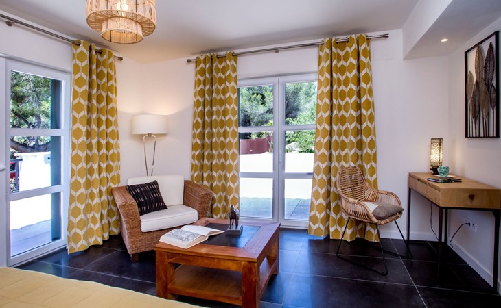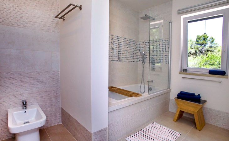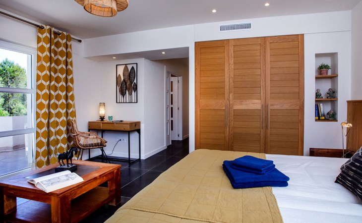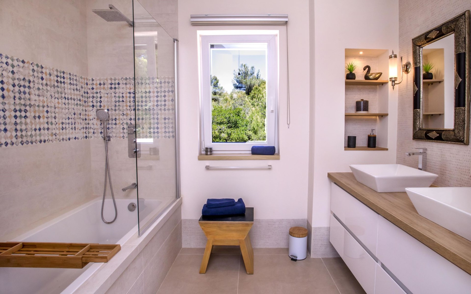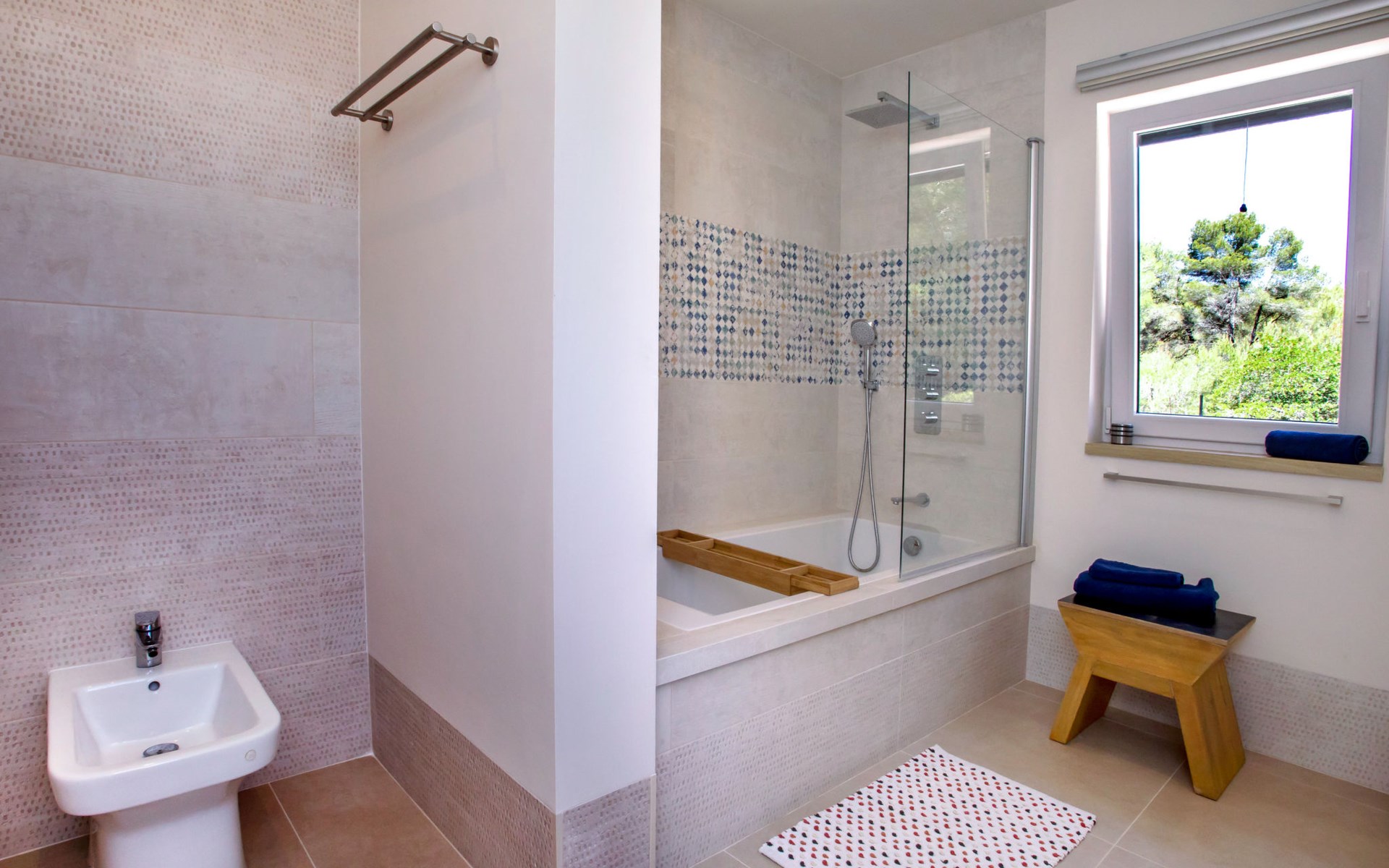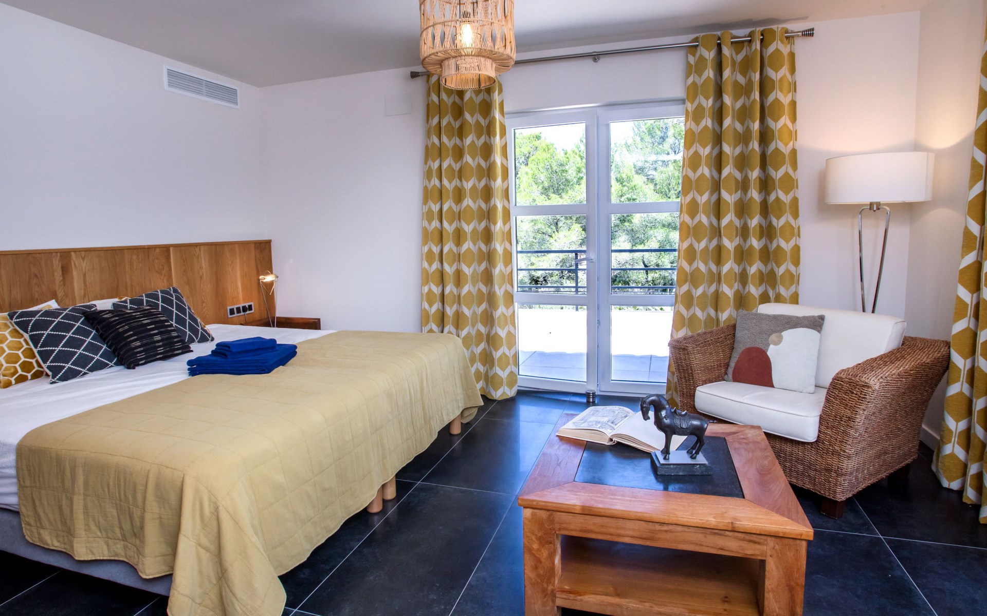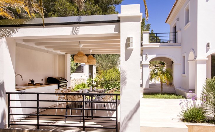 Very large, very modern, very luxurious villa "Almandrina", 2 storeys. In the district of La Lluca, in the resort 7 km from the centre of Javea - El Arenal, in a quiet, sunny position, 25 m from the edge of the forest, 7 km from the sea, 7 km from the beach. Private: property 2'000 m2 (fenced), large, beautiful, well-kept terraced garden with lawn and trees, swimming pool (10 x 5 m, depth 90 - 190 cm, seasonal availability: 01.Jan. - 31.Dec.) with internal staircase. Unconventional pool shape. Paddling pool, outdoor shower, pool house with fridge and cooking stove, pergola, garden furniture, barbecue house. In the house: air conditioning, laundry, washing machine. Parking on the premises, single garage. Shop 9 km, supermarket 2 km, shopping centre 20 km, restaurant 3 km, café 3 km, internet café 7 km, bus stop 7 km, sandy beach "Playa del Arenal" 7 km, shingle beach "Playa de Portitchol" 13 km, diving center 7 km. Sports harbour 7 km, golf course (9 hole) 2 km, surf school 7 km, sailing school 7 km, tennis 3 km, riding stable 10 km. Nearby attractions: Aqualandia Benidorm 40 km, Oceanografico Valencia 110 km. Hiking paths: Portichol 10 km. The owner does not accept any youth groups. Neighbourhood highly sensitive to noise. Quietness and good behaviour expected.