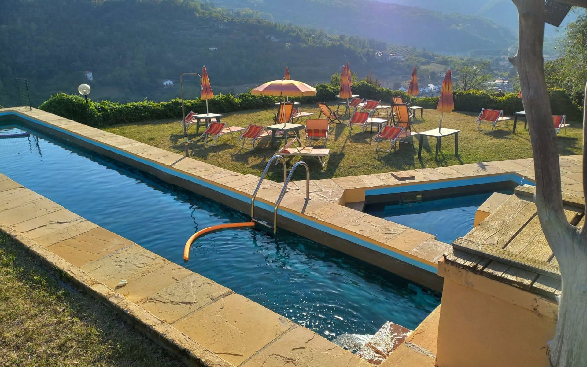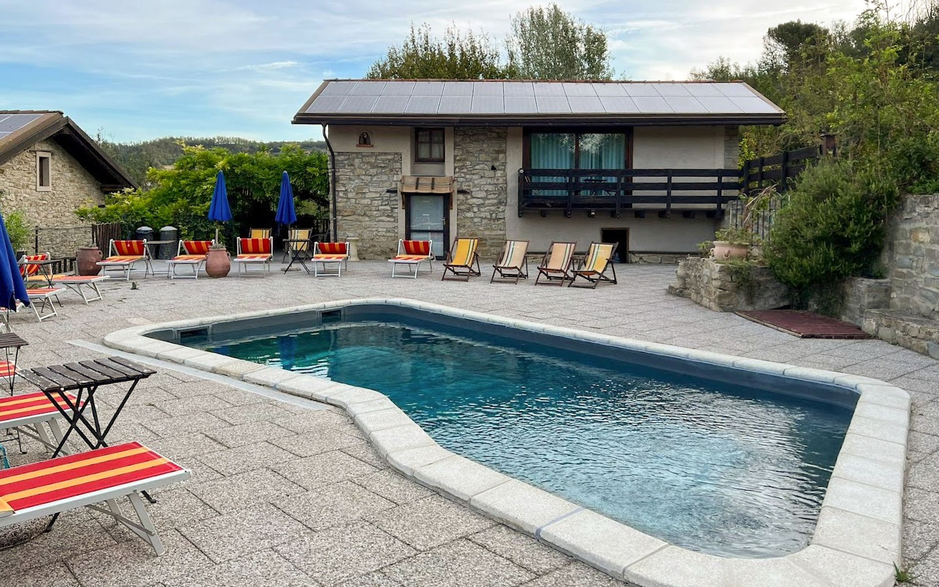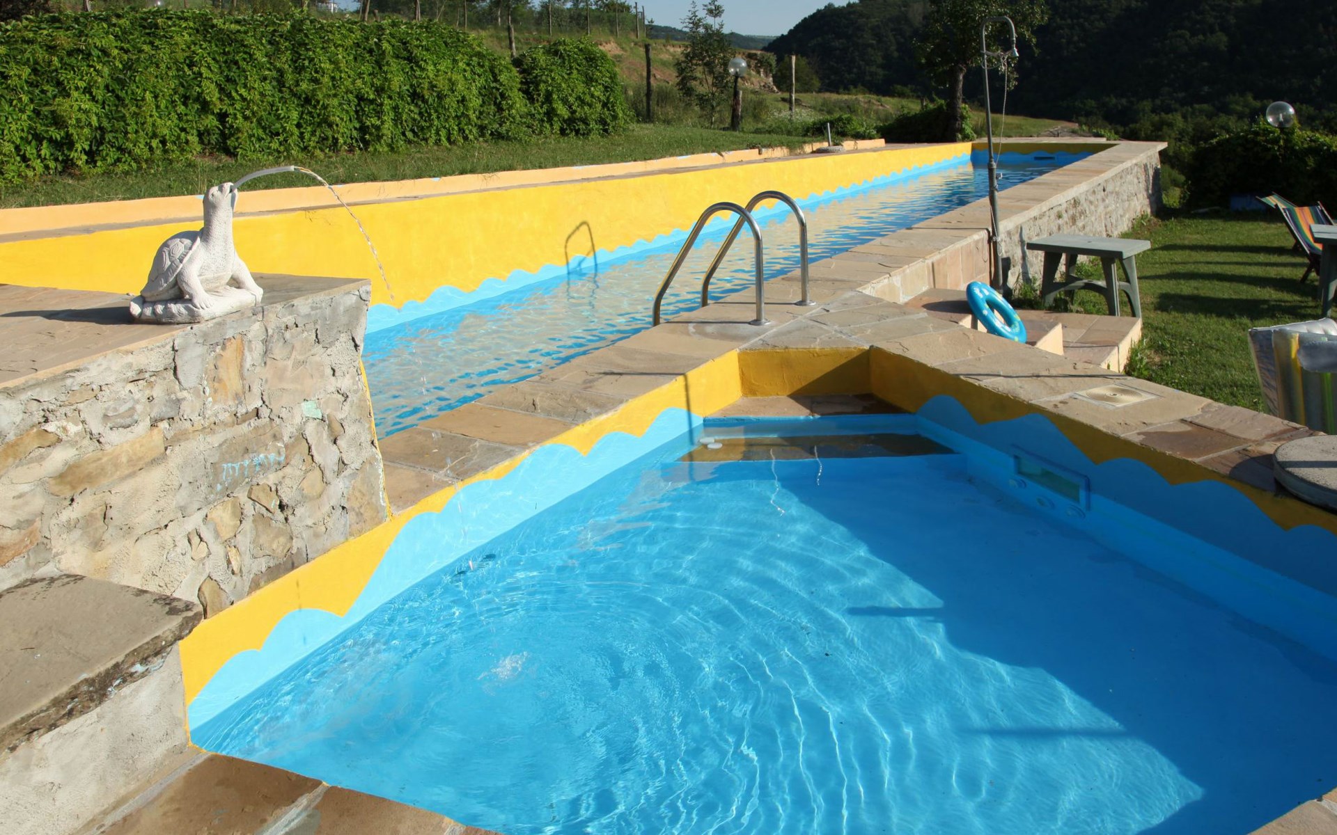 Agriturismo "Il Gallo". Above Cortemilia, 3.5 km from the centre, on top of a hill, in the woods. For shared use: property 20'000 m2, plants and flowers, courtyard, 2 swimming pools (18 x 3 m, depth 80 - 140 cm, seasonal availability: 15.May. - 31.Oct.). Children's playground (slide, swing, sandbox). In the house: restaurant, bar, breakfast room, lounge (all extra), table tennis, washing machine (extra). Breakfast full board half board possible on request (extra). Parking at the house. Supermarket 3.2 km, restaurant, bar, café 5 m, bus stop 3.1 km. Nearby attractions: Alba 35 km, Savona (Liguria) 60 km. Please note: car recommended. Suitable for families. Owner lives in separate semi-detached house. Animals in the neighbourhood.
