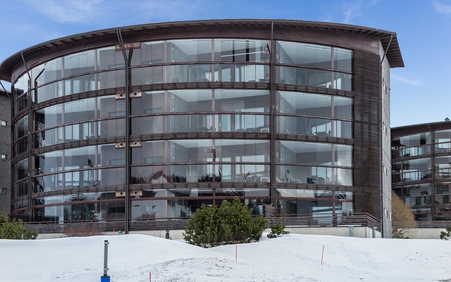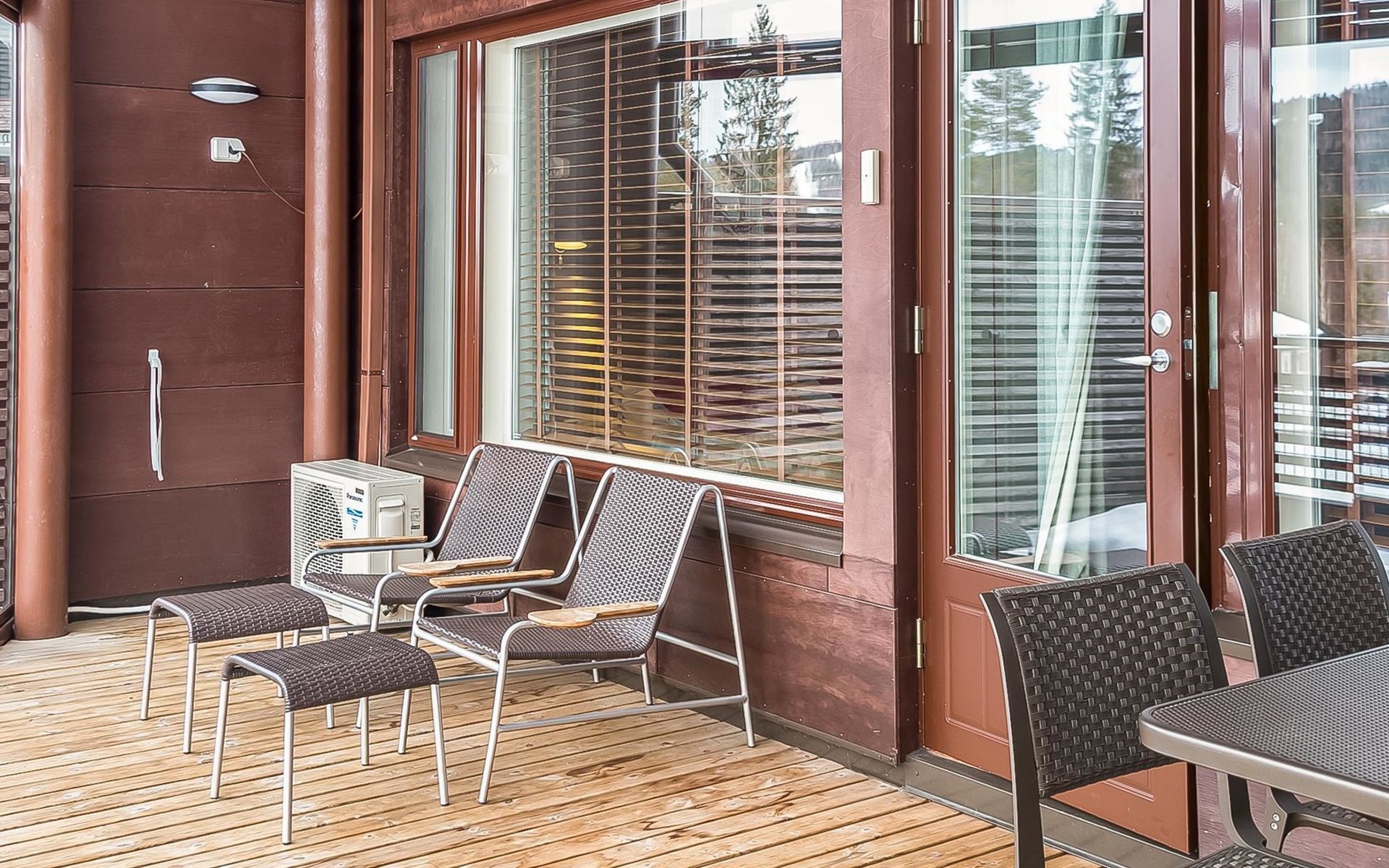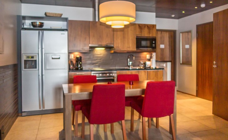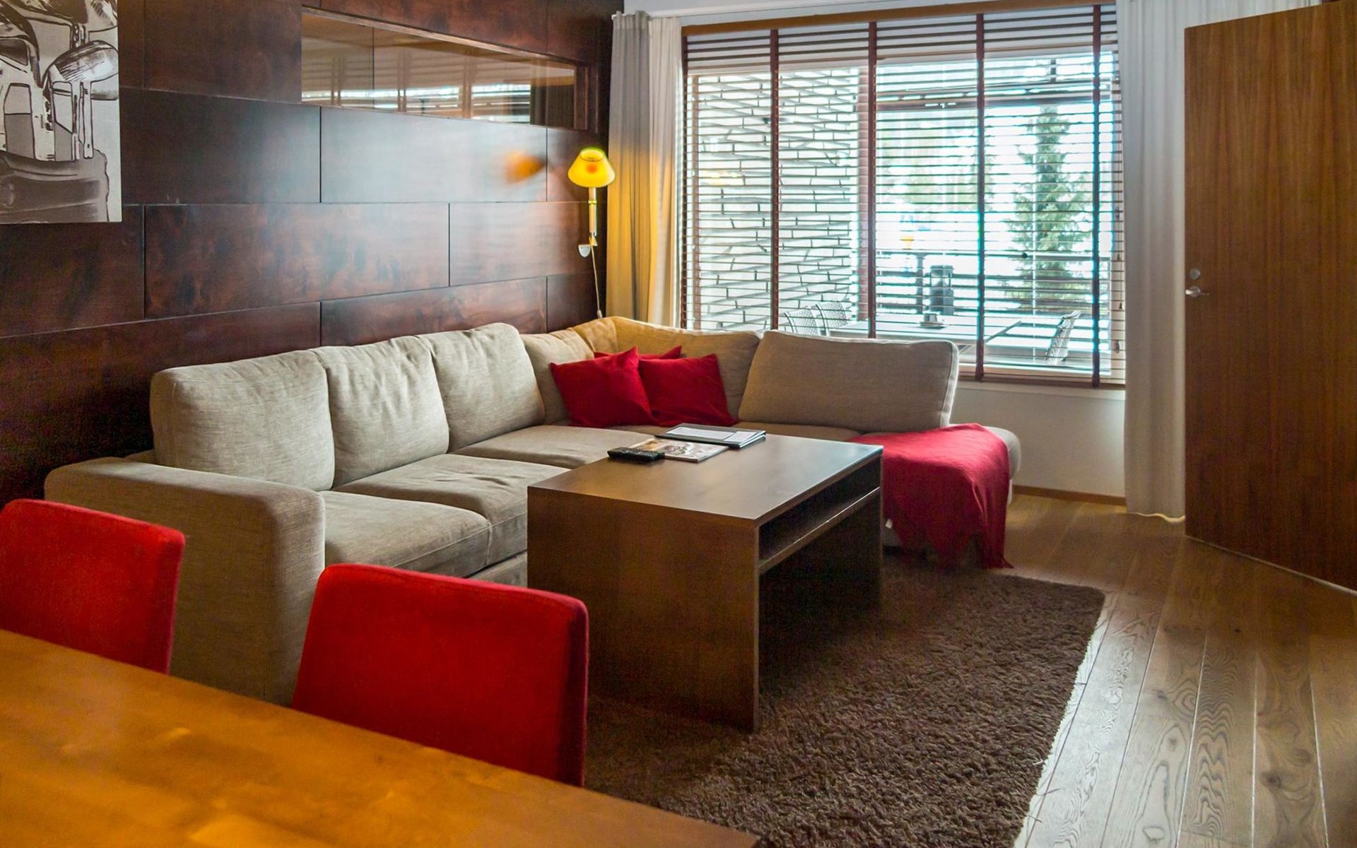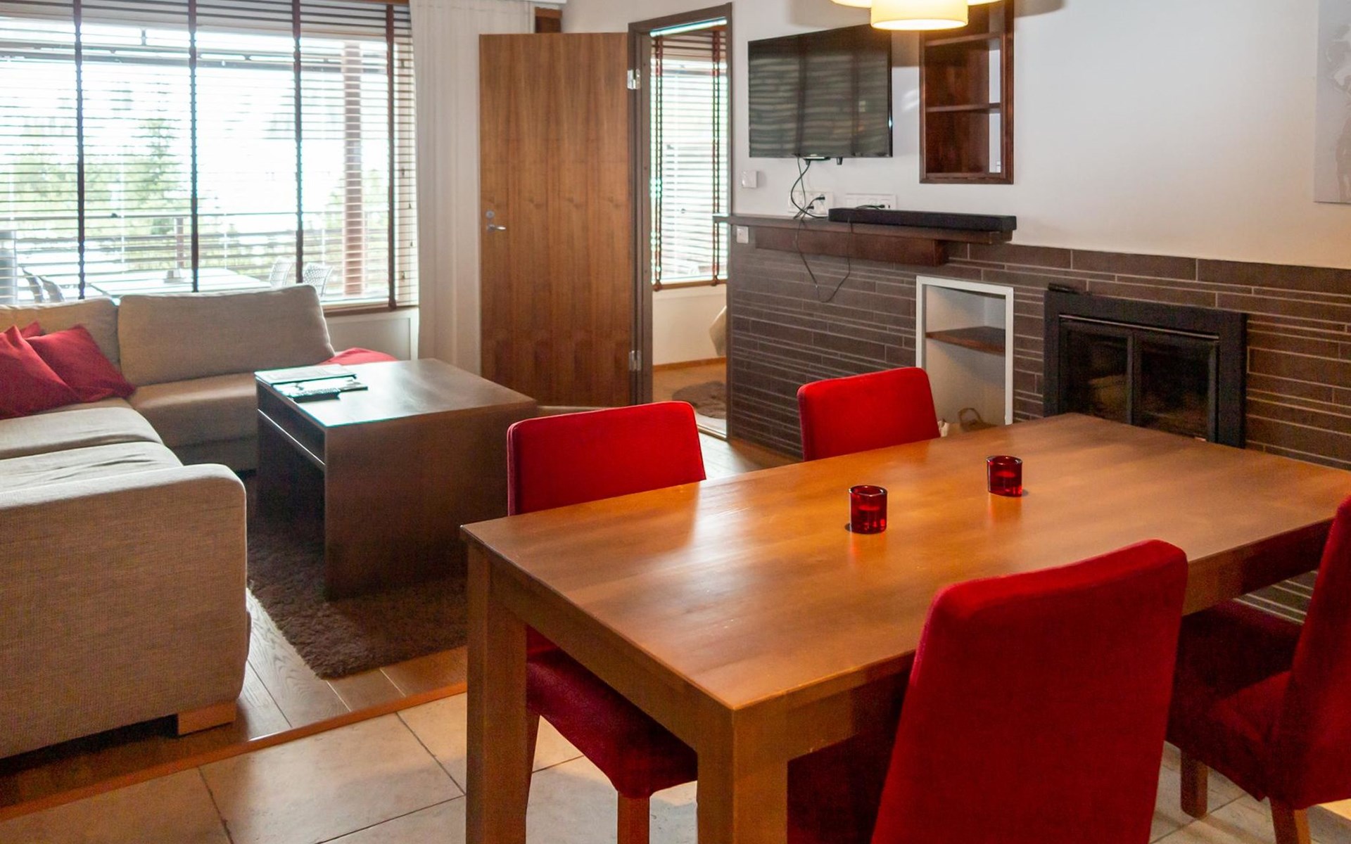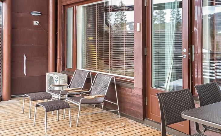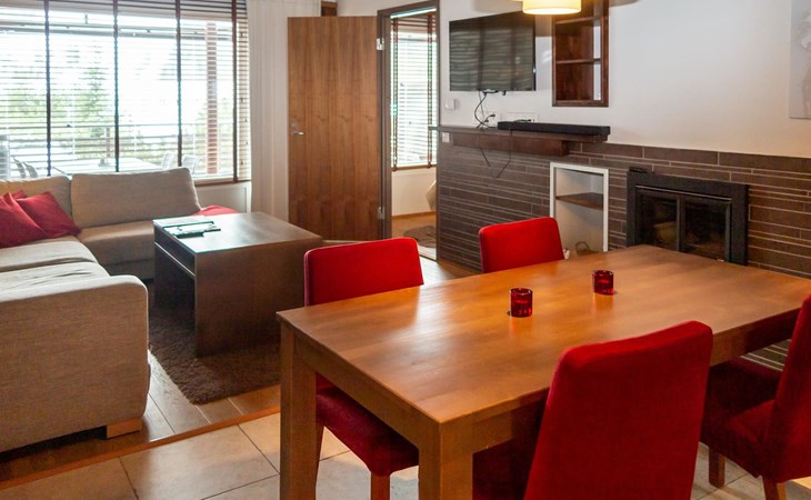 High standard Tahko Spa Junior Suite Orange B6 apartment located in heart of Tahko Ski Resort, built 2006, surface area 59 m² and 18 m² glazed terrace. Apartment has comfortable living room with open plan kitchen. In the living room sofa bed 2 extra beds. Bedroom with 2 separate beds, bedroom has a small shower and WC.