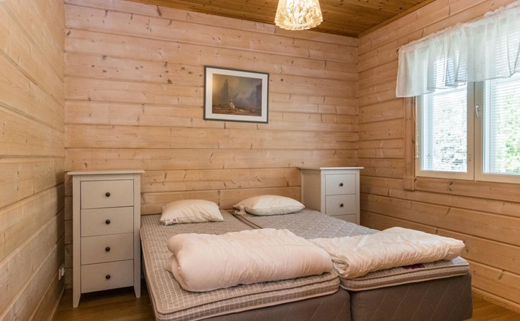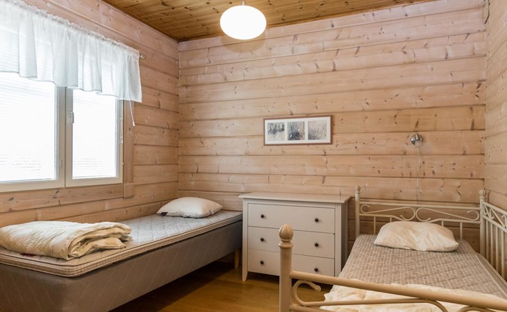 On the ground floor of the main building, there is a large open-plan living room/kitchen area with a high ceiling. The kitchen is well-equipped, and there is plenty of space for a larger group to dine together. Two bedrooms, each with two beds (size 80 x 200 cm). In addition, there is an electric sauna and a bathroom with WC.