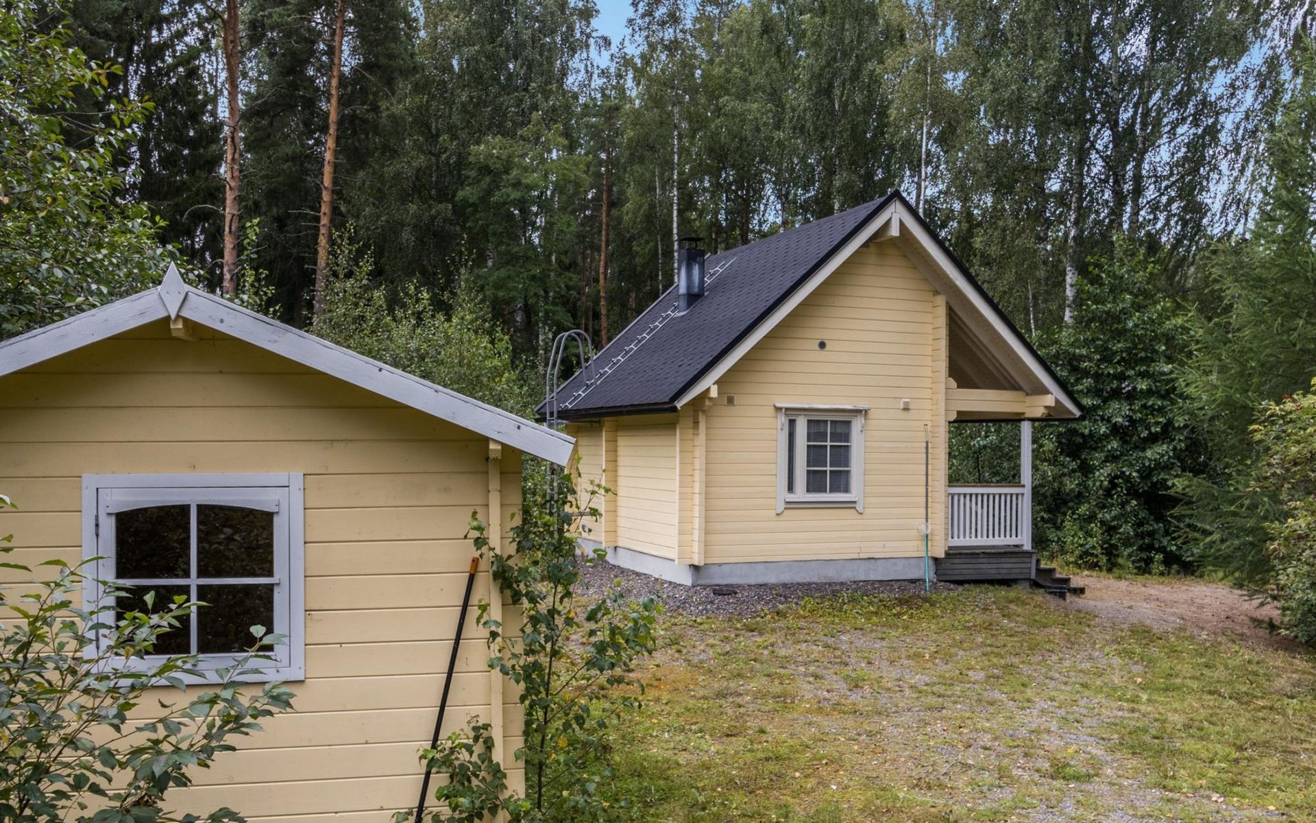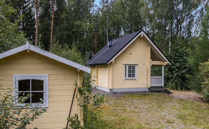On the beach, there is a separate sauna building with a wood-heated sauna stove, a washing room, a living area, and a loft. Terrace facing the lake. If needed, you can sleep in the loft of the sauna building (note the steep ladder). The living area has a sink and a workspace.