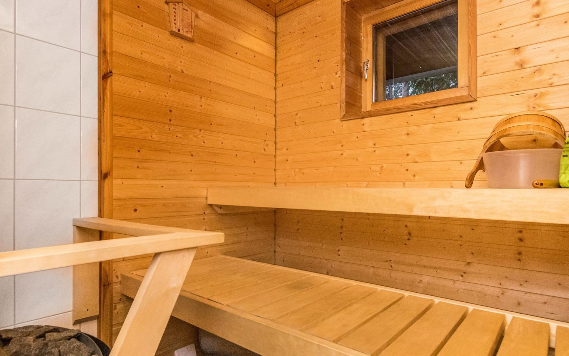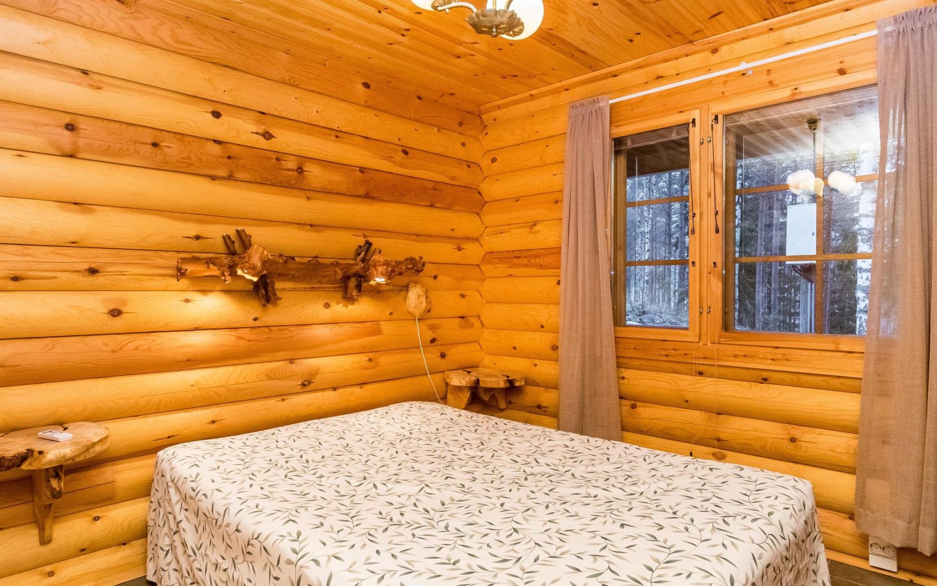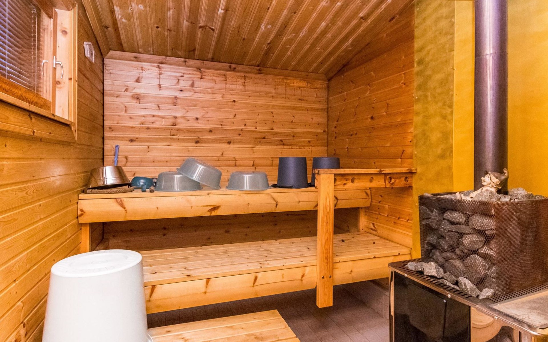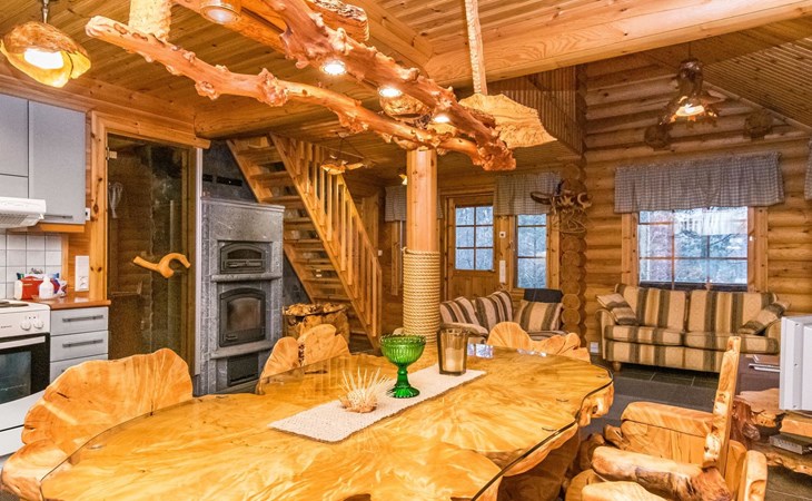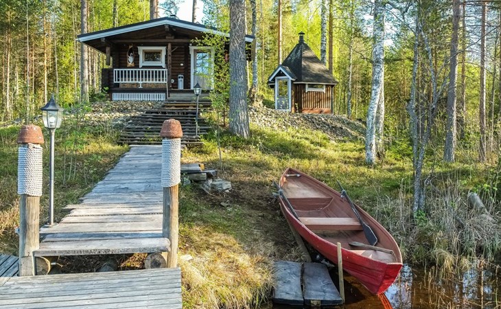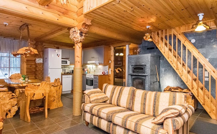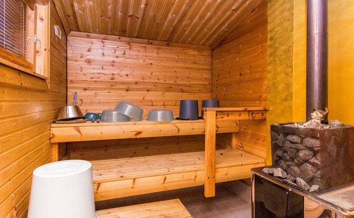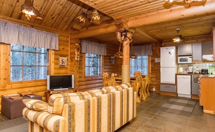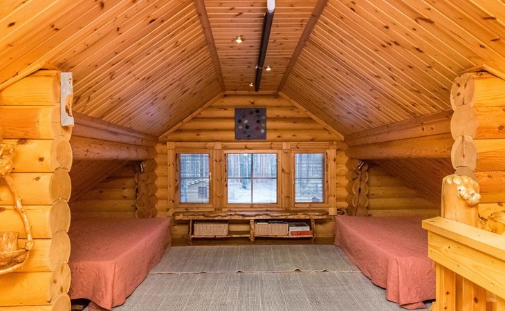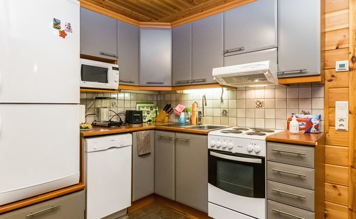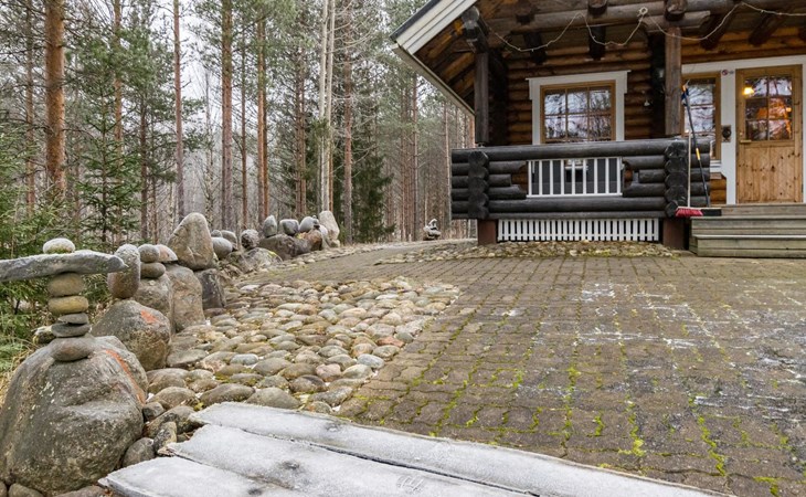 Log cottage 2006, kitchen-living room, bedroom (with glass door) with double bed, sleeping gallery (20 m2) with two beds (120 cm), washroom, sauna (elec. stove), terrace, and balcony. Own, separate sauna by the shore(wood heated stove). Sub-board for rent from the owner 20 e/day.