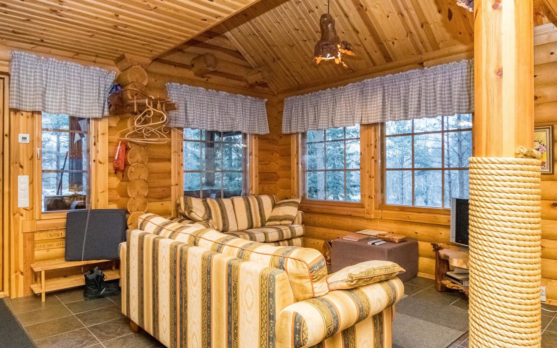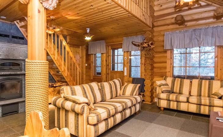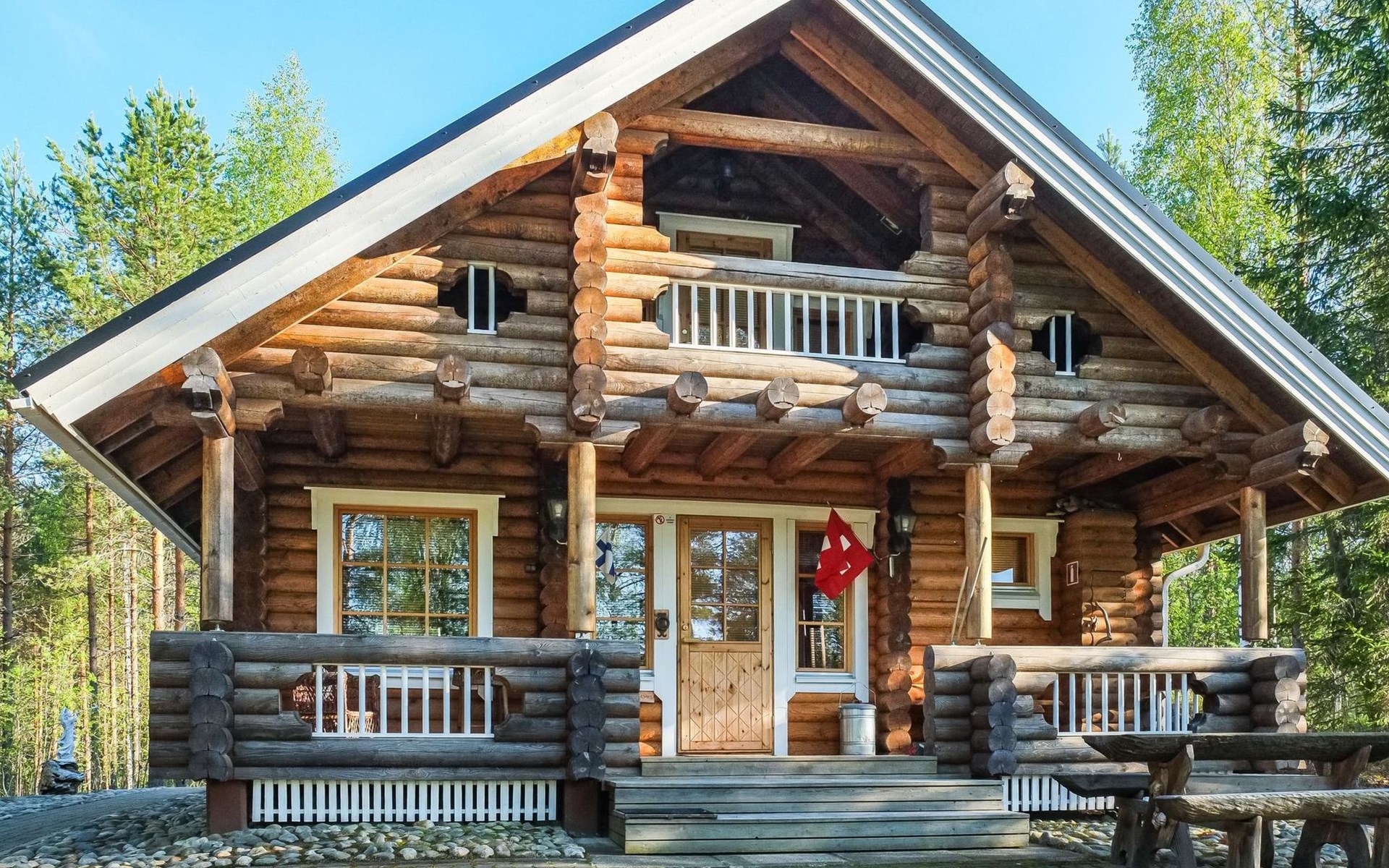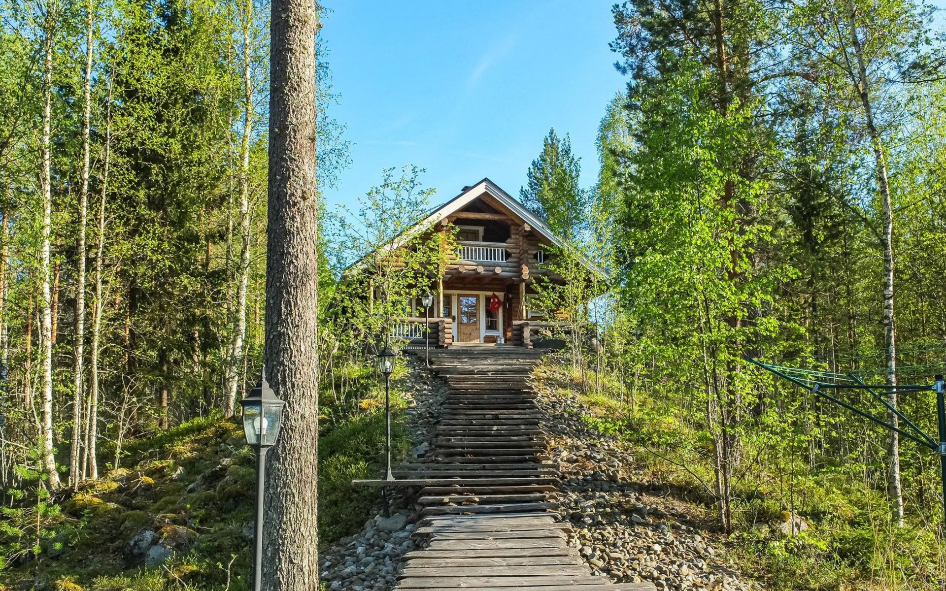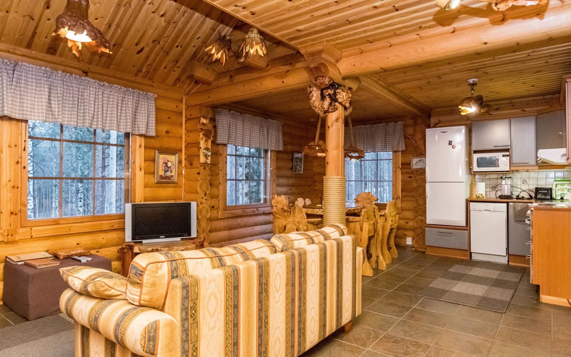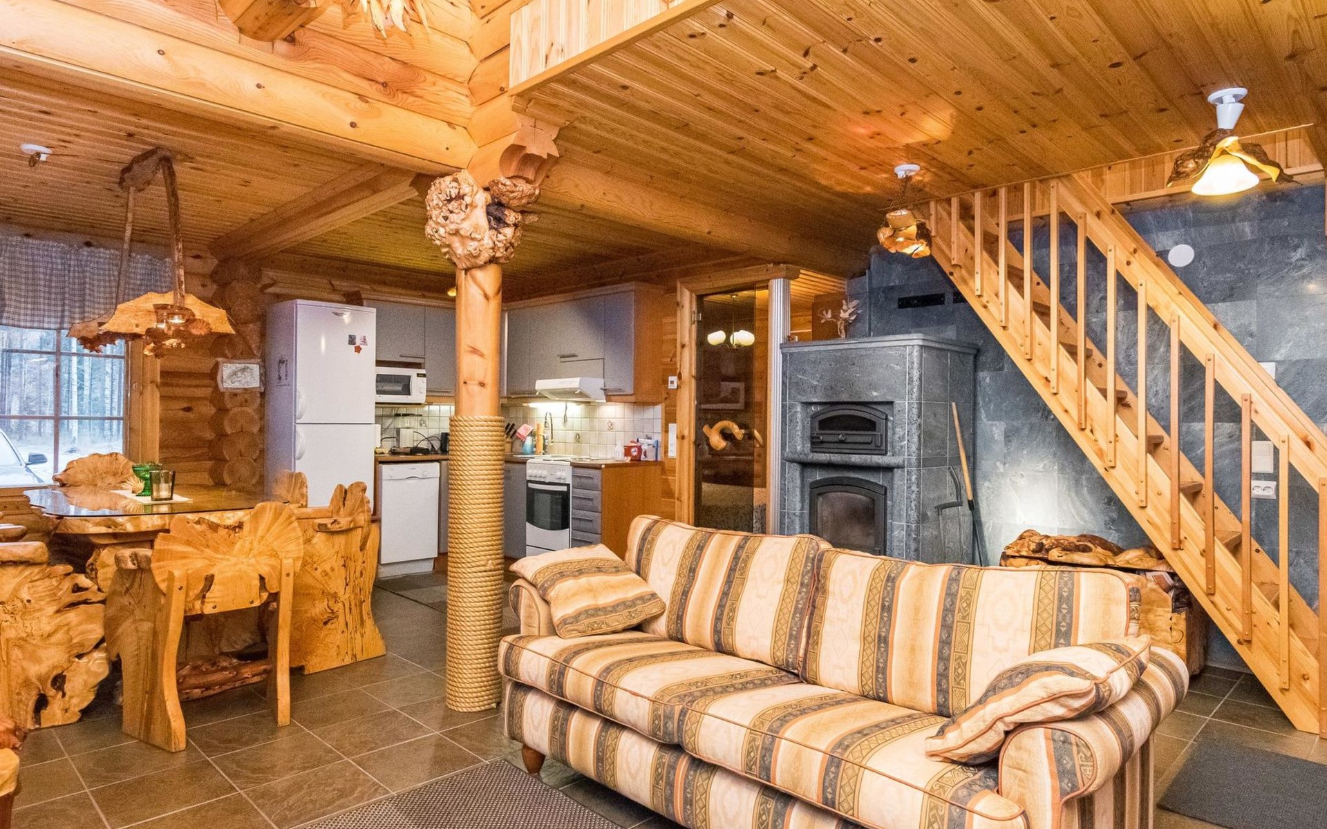 Log cottage 2006, kitchen-living room, bedroom (with glass door) with double bed, sleeping gallery (20 m2) with two beds (120 cm), washroom, sauna (elec. stove), terrace, and balcony. Own, separate sauna by the shore(wood heated stove). Sub-board for rent from the owner 20 e/day.