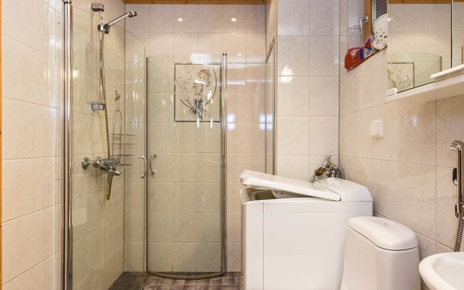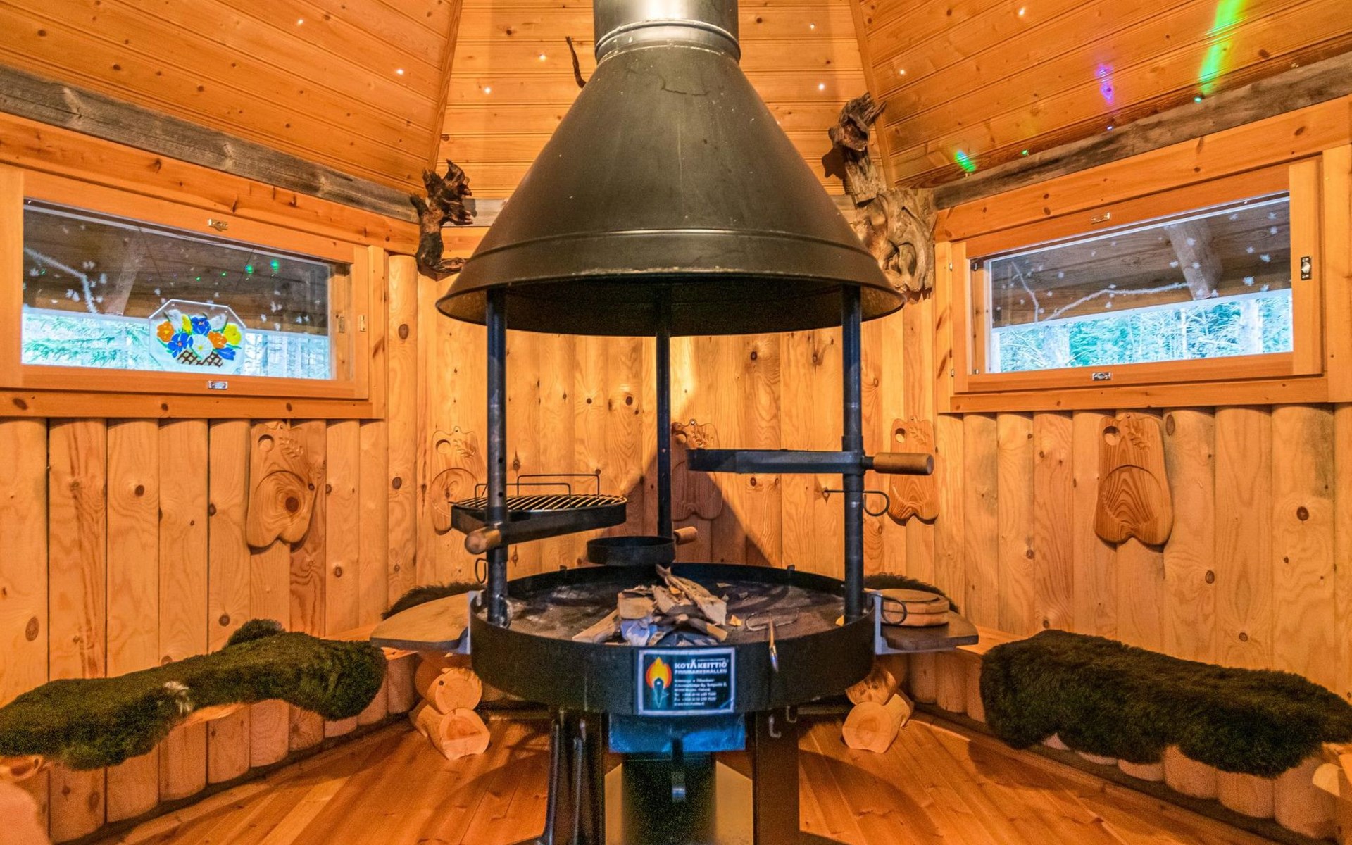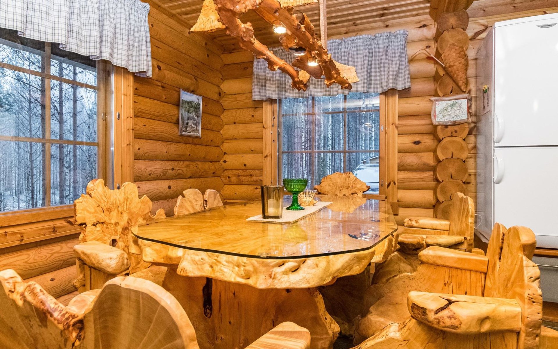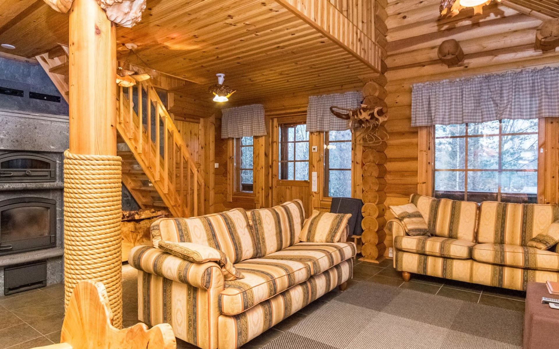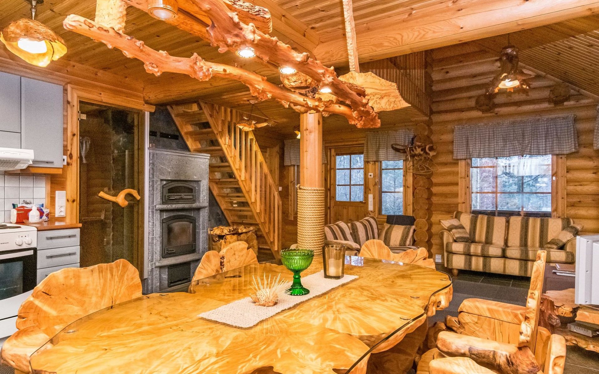 Log cottage 2006, kitchen-living room, bedroom (with glass door) with double bed, sleeping gallery (20 m2) with two beds (120 cm), washroom, sauna (elec. stove), terrace, and balcony. Own, separate sauna by the shore(wood heated stove). Sub-board for rent from the owner 20 e/day.