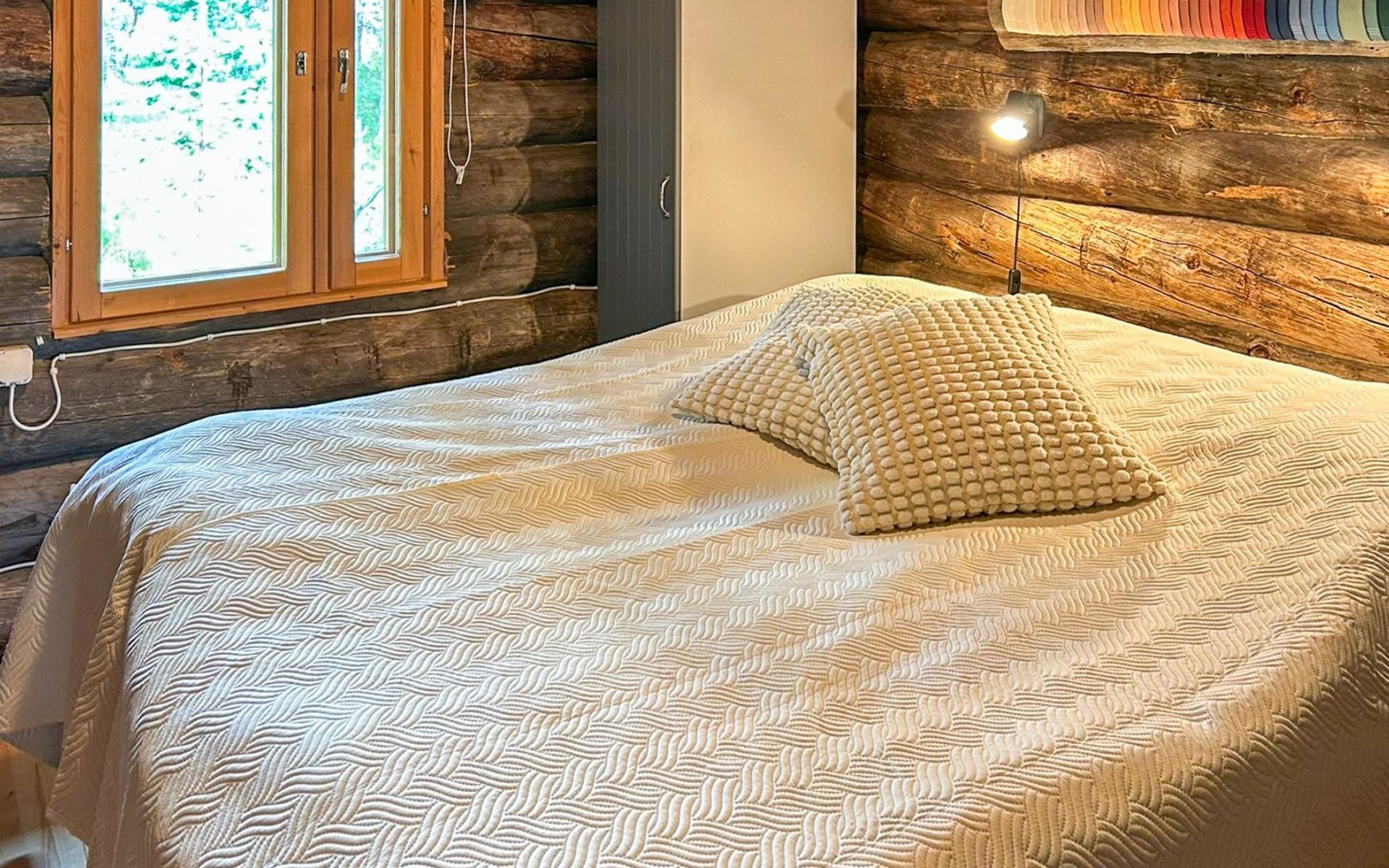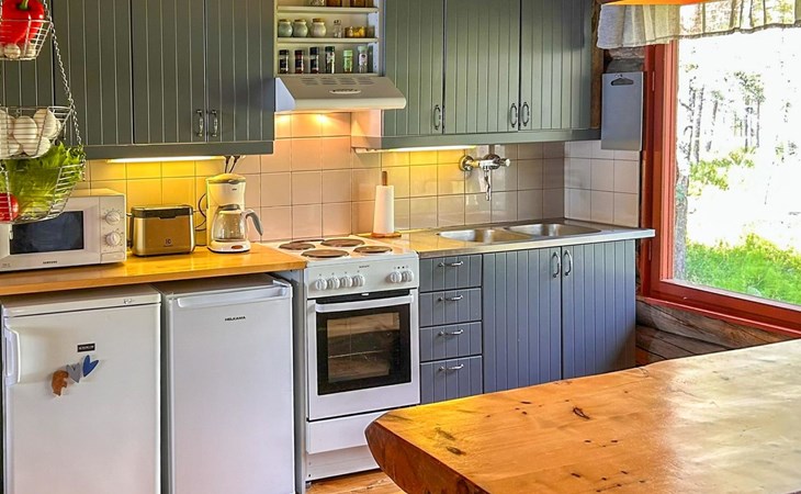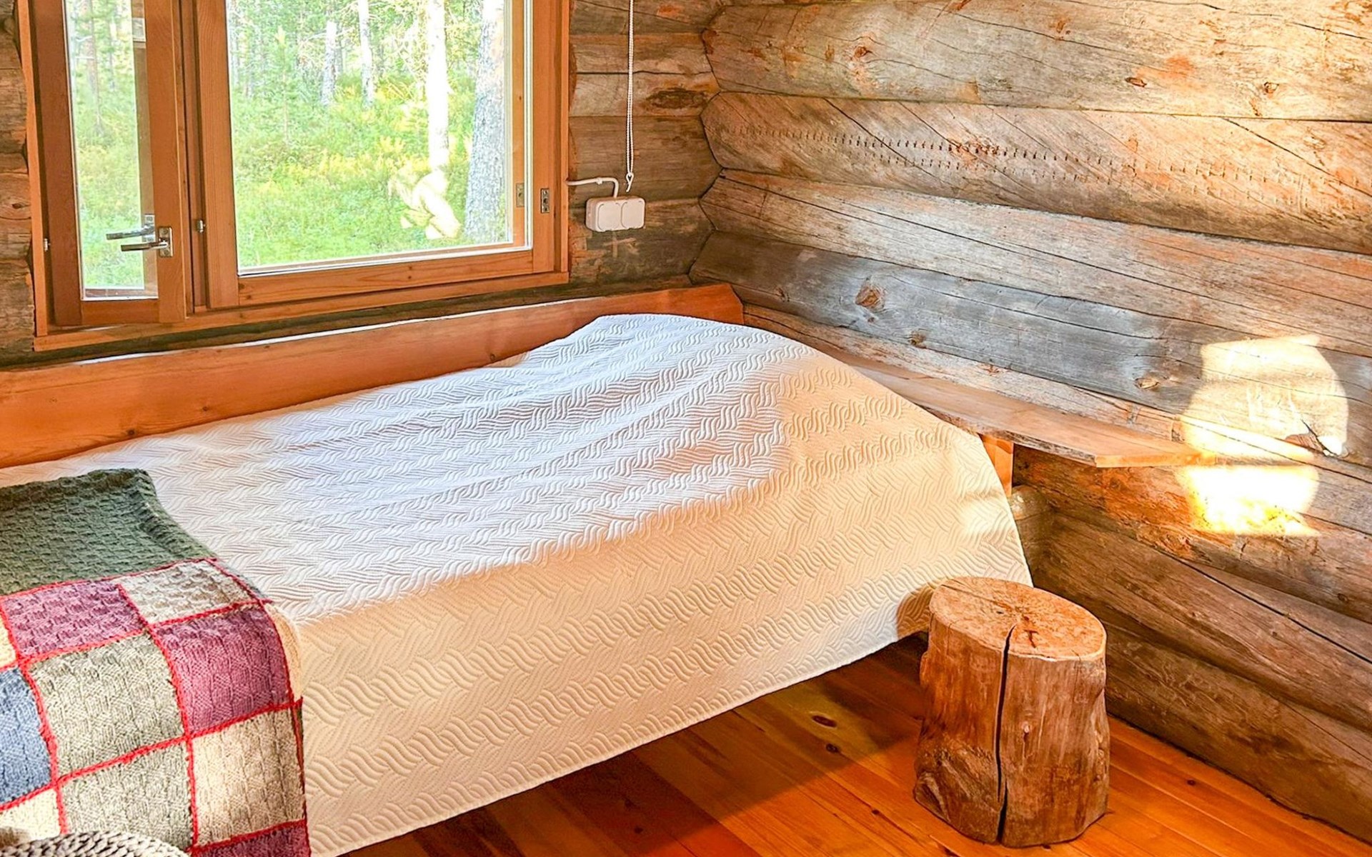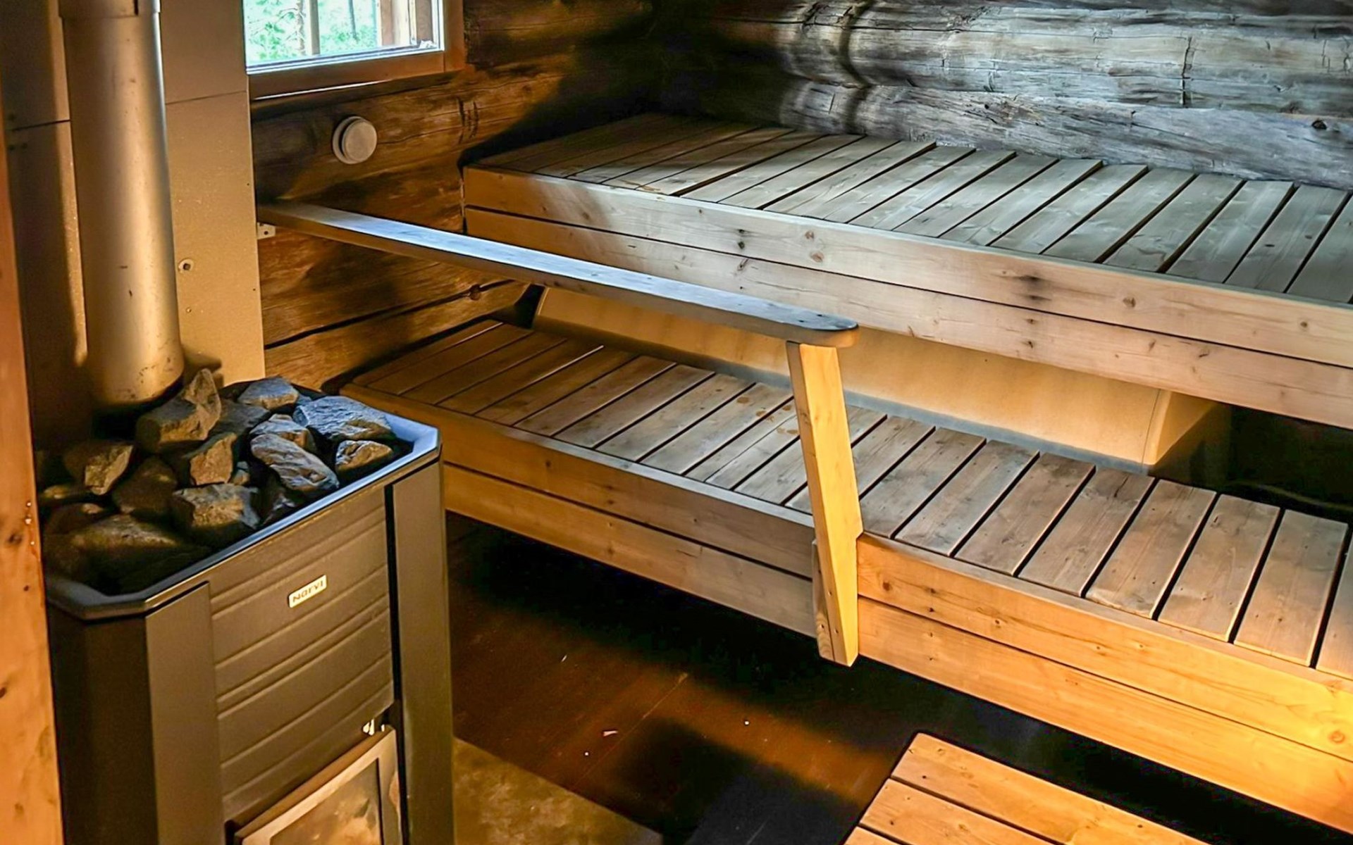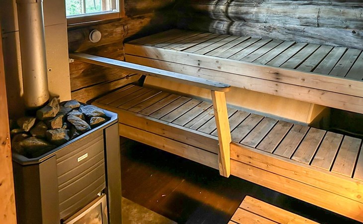 Silverlog cottage, built in 1971, expanded later. Living room room with silverlog bunk bed (lower bed 160 cm wide, 80 cm upper bed), 2 bedrooms each with 2 beds, kitchen, sauna (wood-burning stove, heater tank, shower), dressing room with 1 bed, veranda, porch. Eco-toilet inside the cabin, in addition an outdoor toilet. Smoke oven and a fire place.
