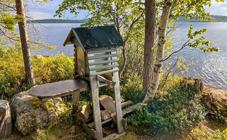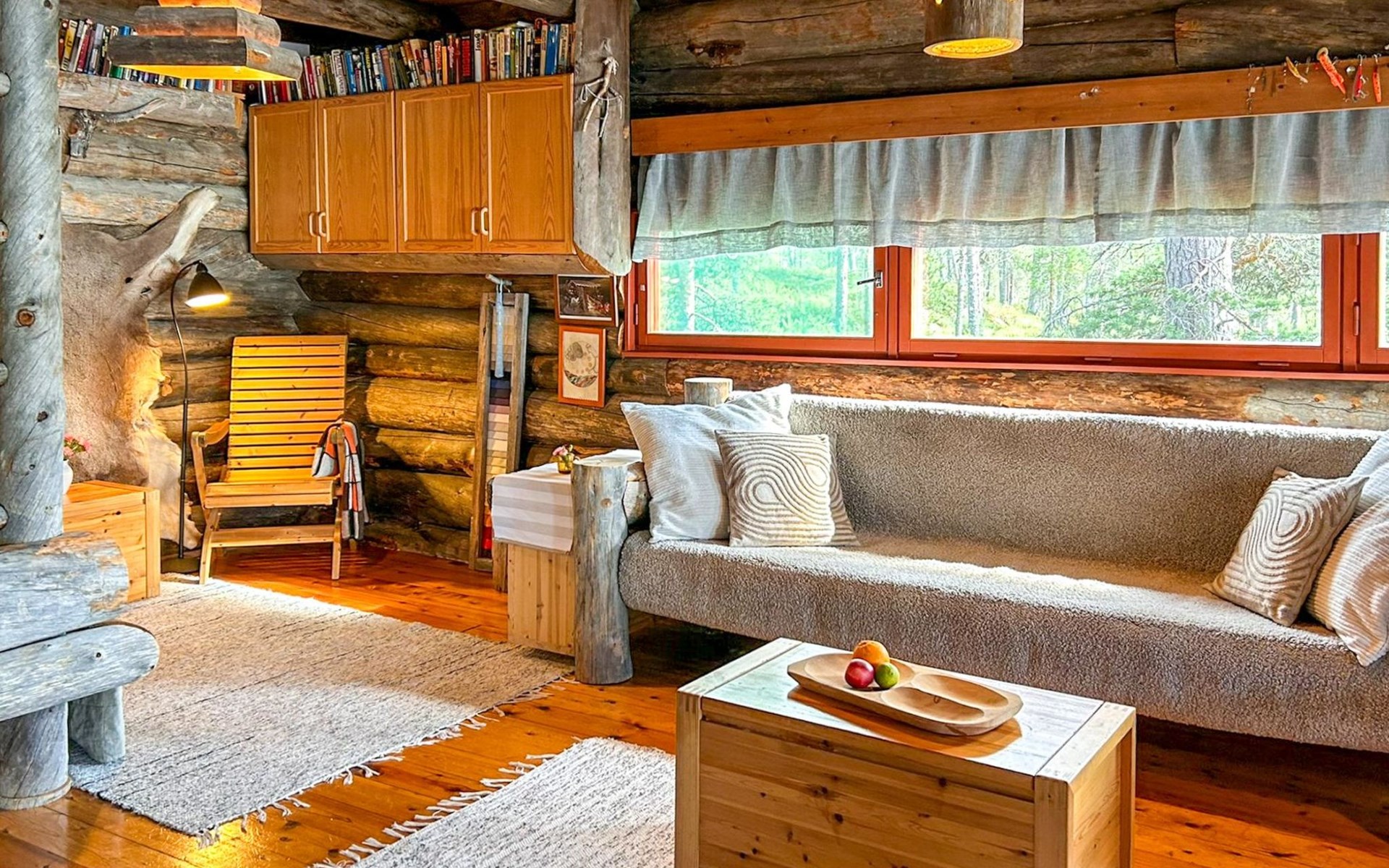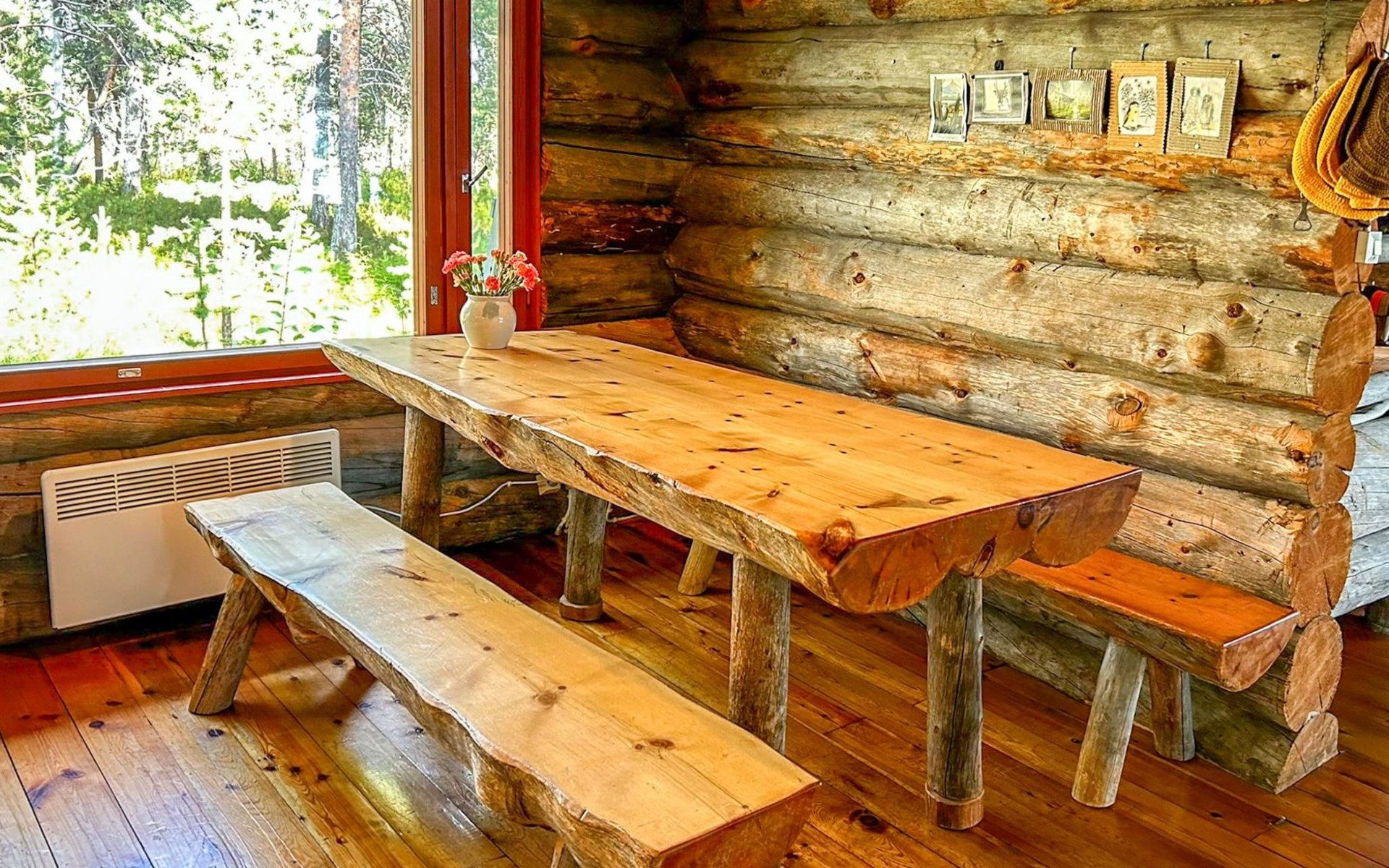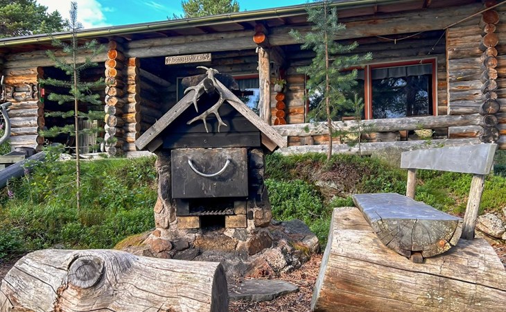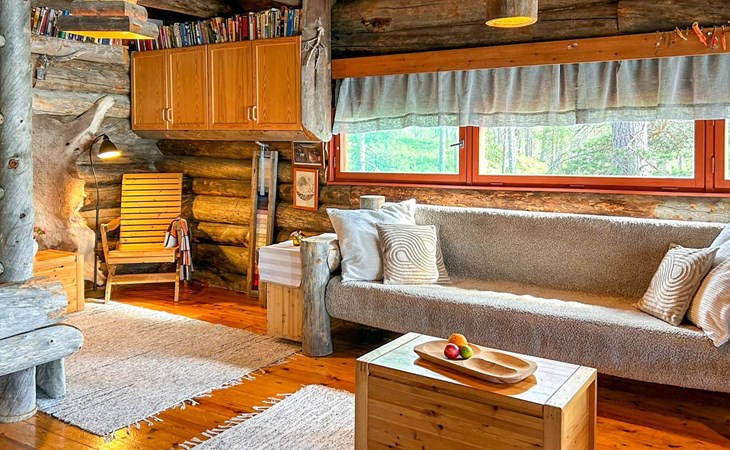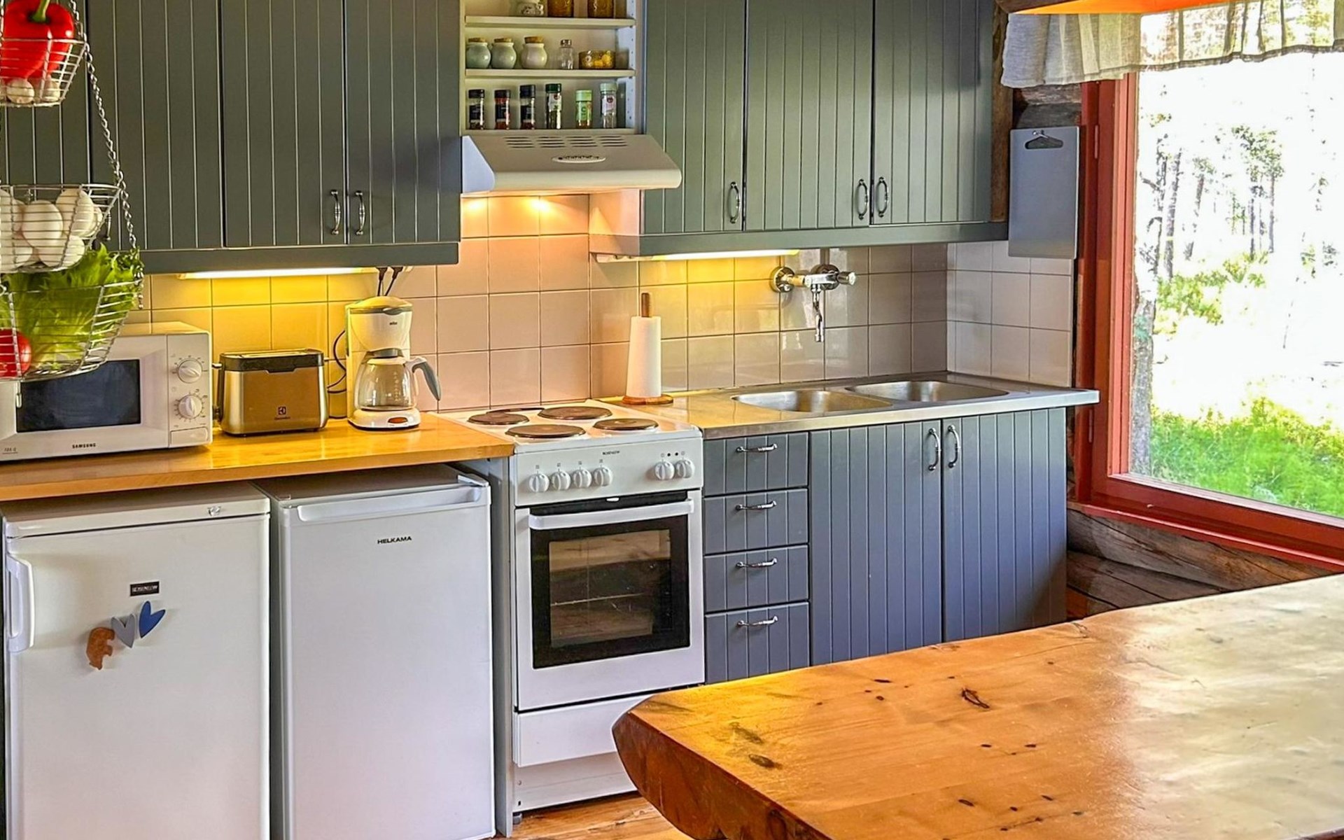 Silverlog cottage, built in 1971, expanded later. Living room room with silverlog bunk bed (lower bed 160 cm wide, 80 cm upper bed), 2 bedrooms each with 2 beds, kitchen, sauna (wood-burning stove, heater tank, shower), dressing room with 1 bed, veranda, porch. Eco-toilet inside the cabin, in addition an outdoor toilet. Smoke oven and a fire place.