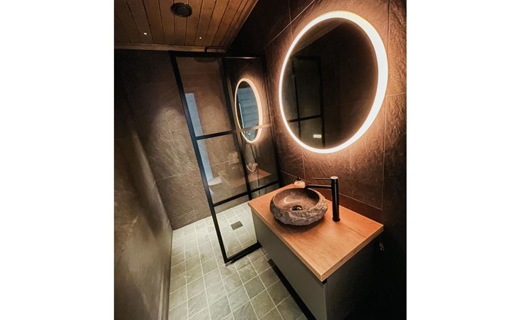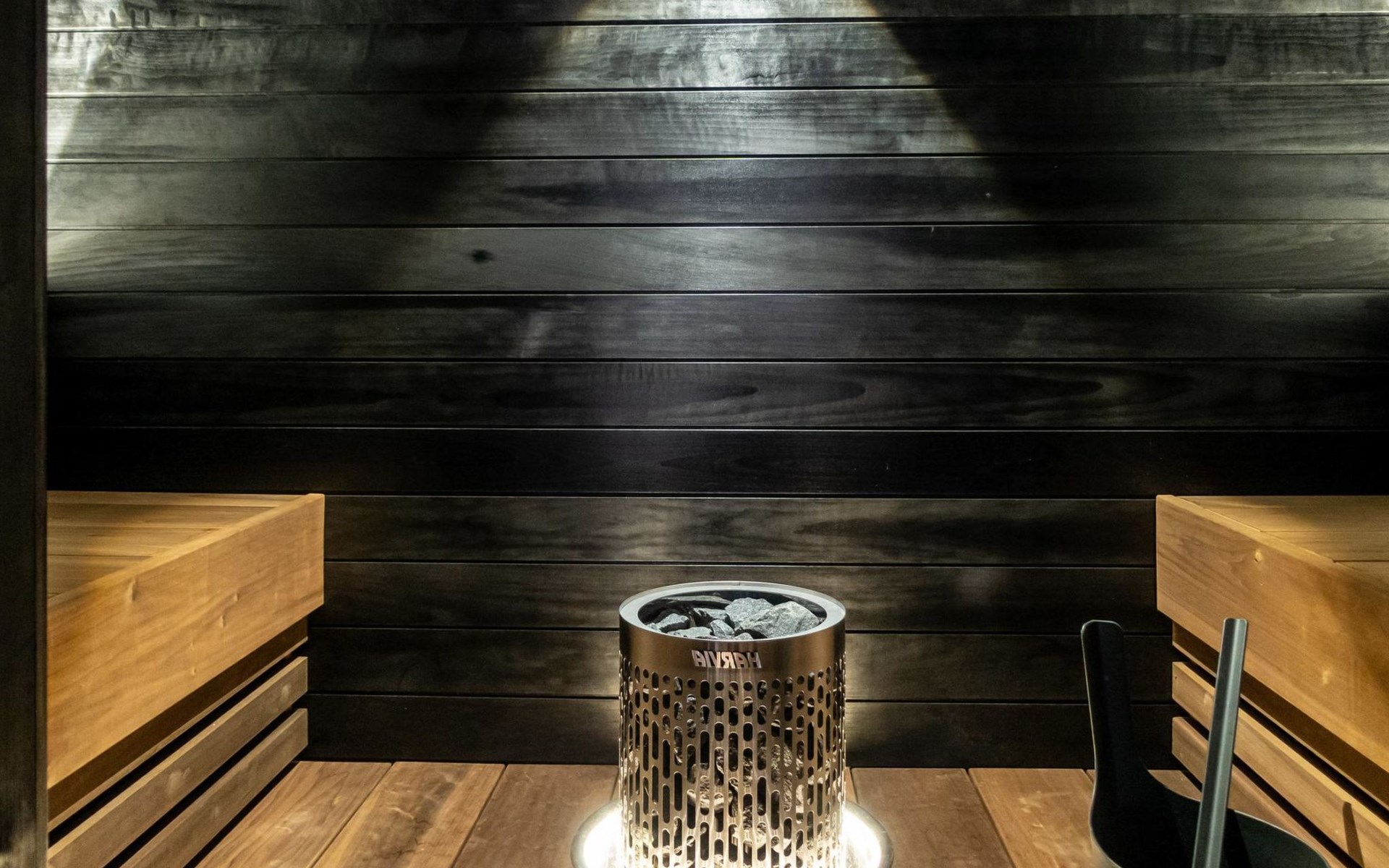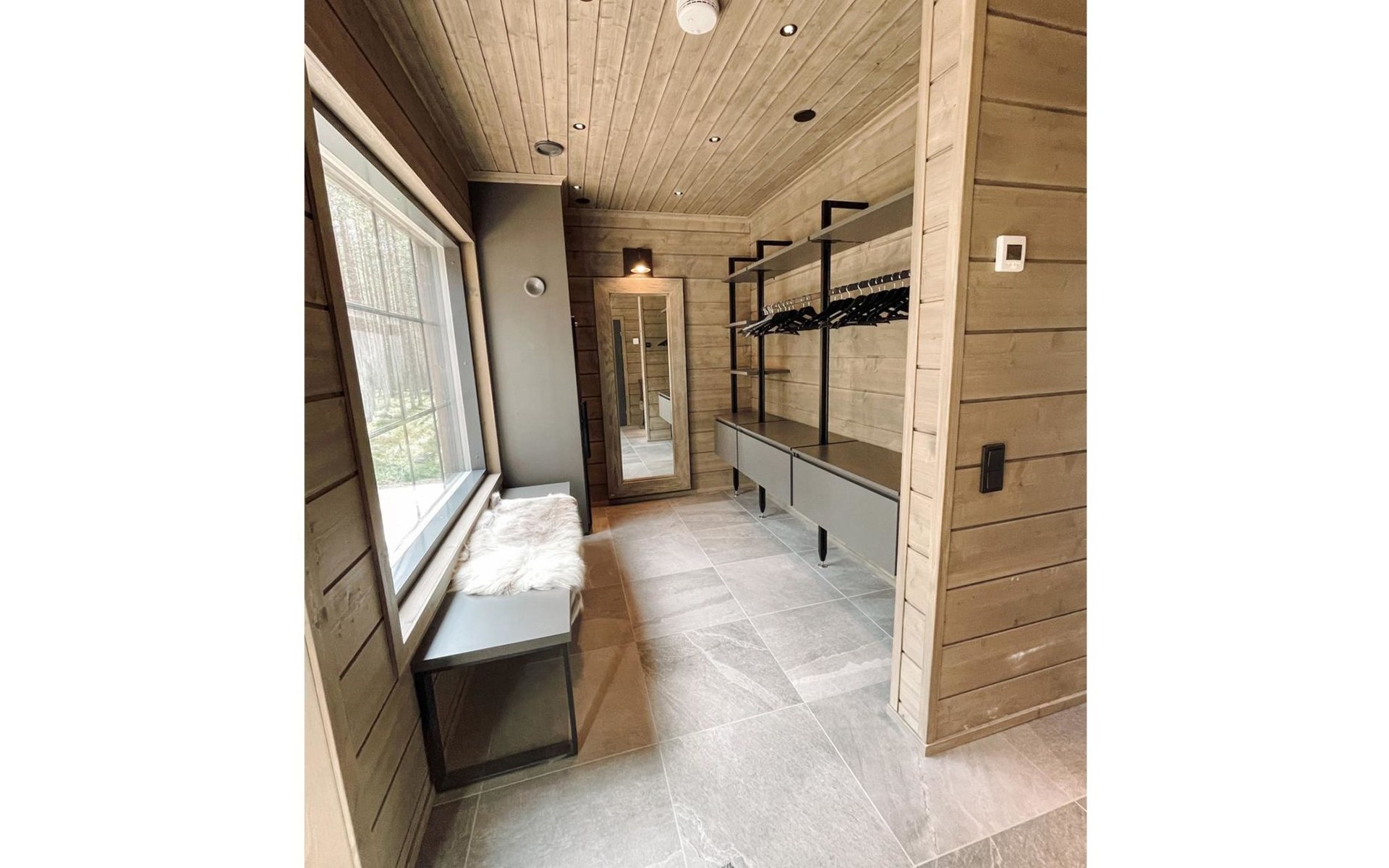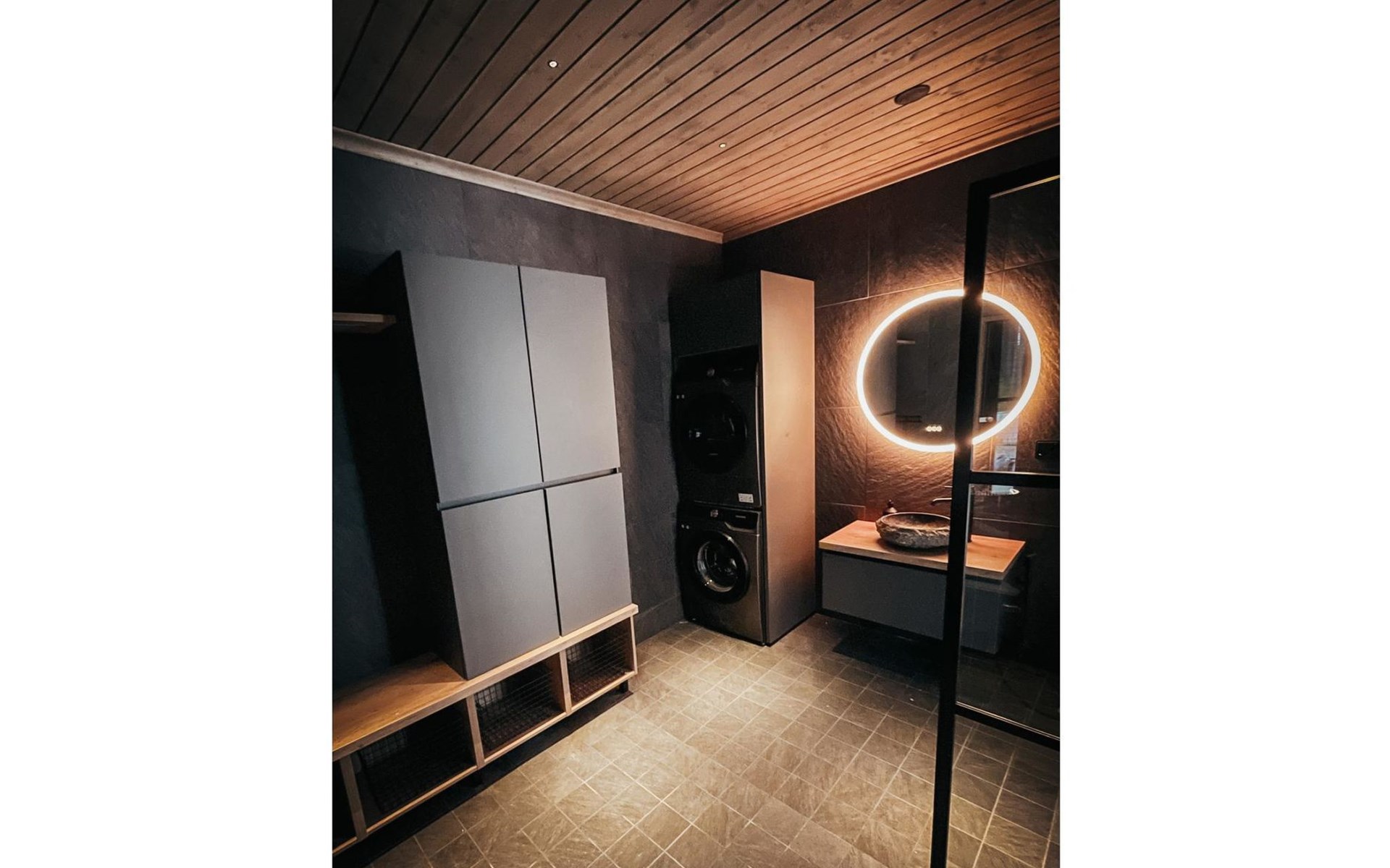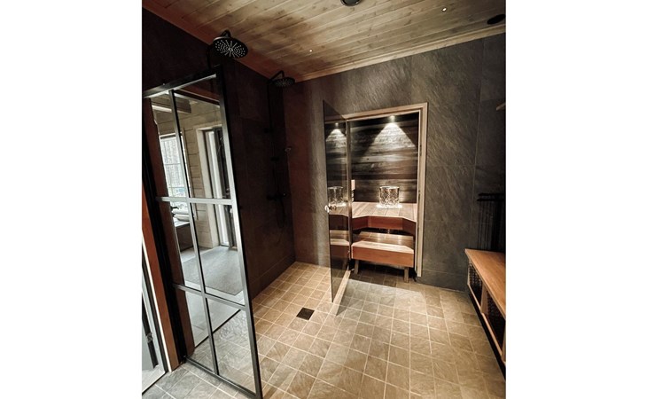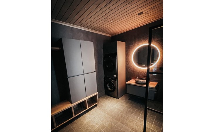 Washroom and sauna are also on the ground floor, entrance from the hall. In addition to WC, the washroom has a sauna and two showers. The washroom also has a washing machine and tumble dryer.