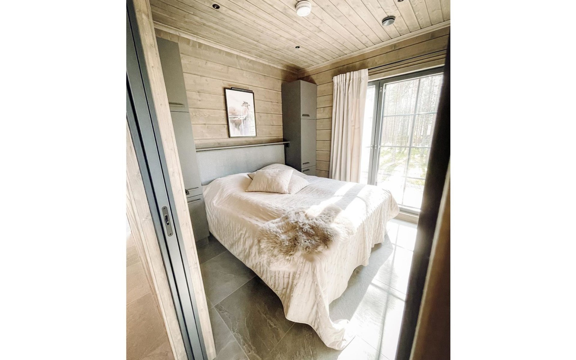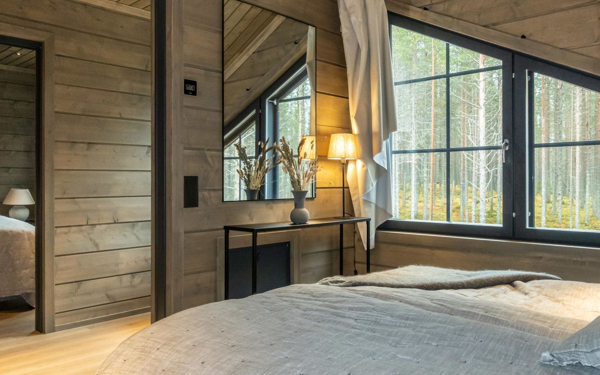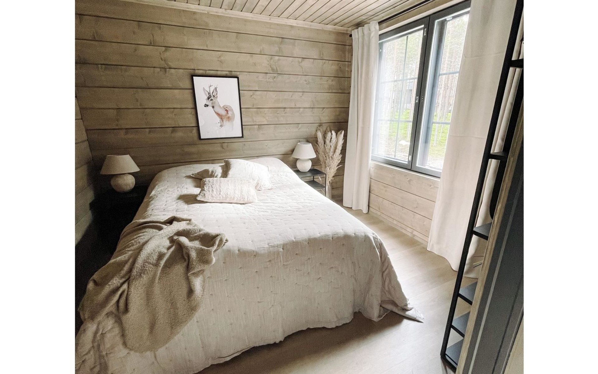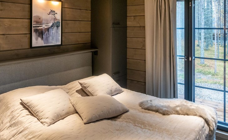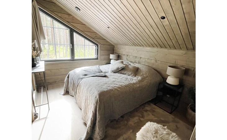 On the ground floor, there is one of Willa's four bedrooms. The bedroom has high-quality 180 cm wide bed and very high-quality pillows and blankets. The room is wonderfully bright thanks to the floor-to-ceiling window, but at night the bedroom can be darkened with a blackout curtain.