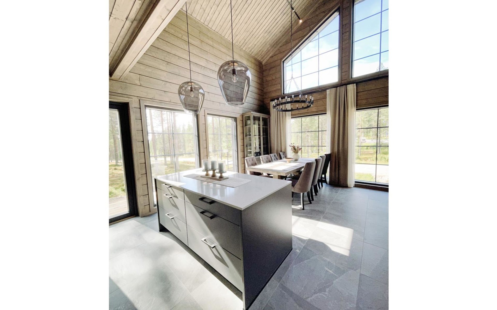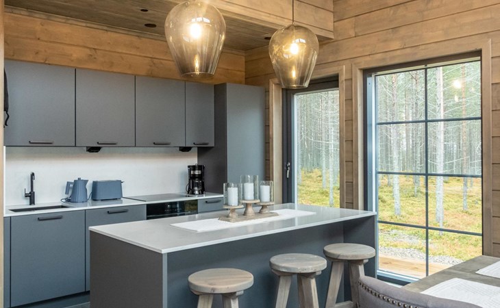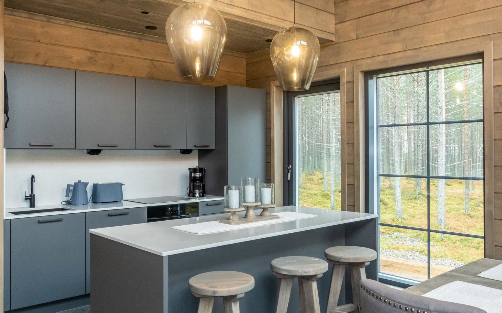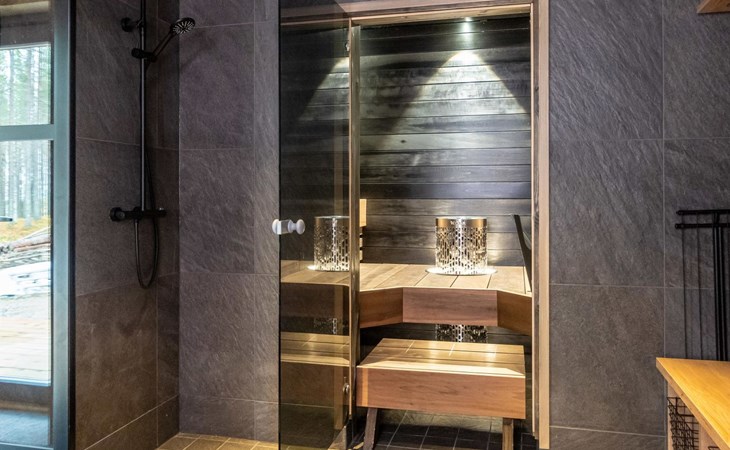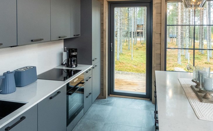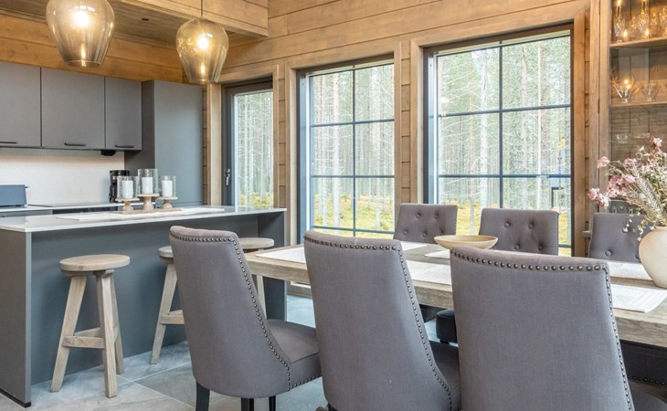 You can enjoy of Levi's fell view from the dining area, as well as from the living room thanks to large windows. From the windows, you can see the gondola and West Point ski lifts and Santa's cabin while you are enjoying of your morning coffee, for example. The bus stop is right near the cabin and the Levi Skibus operates every half hour between the ski slopes and the center of Levi.