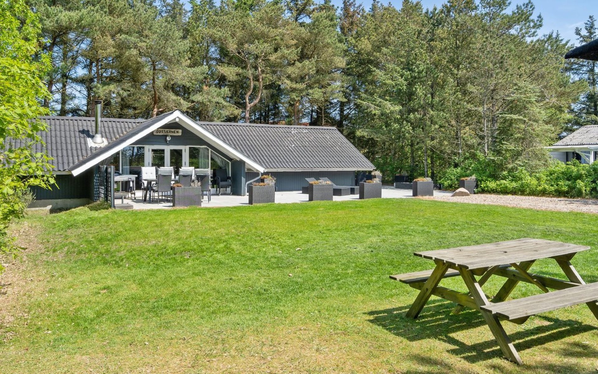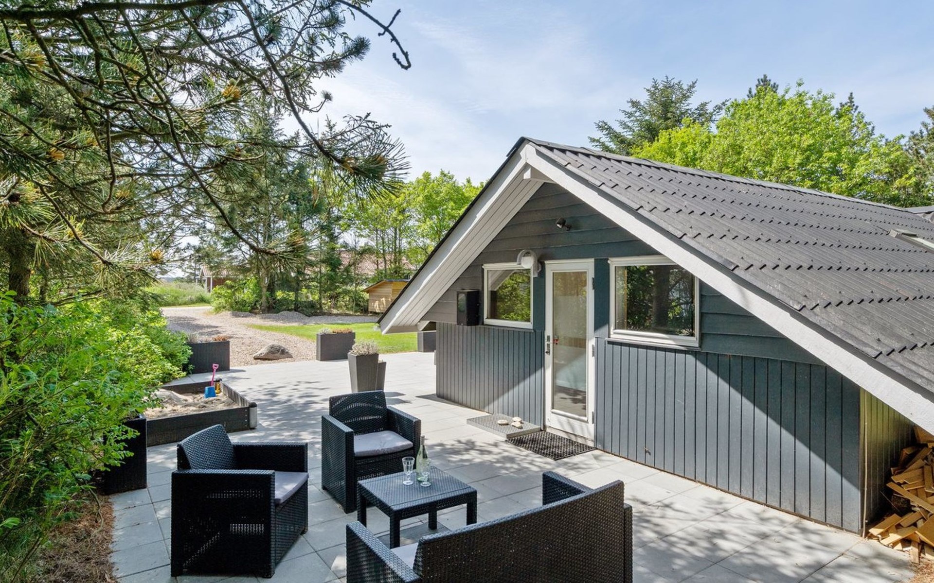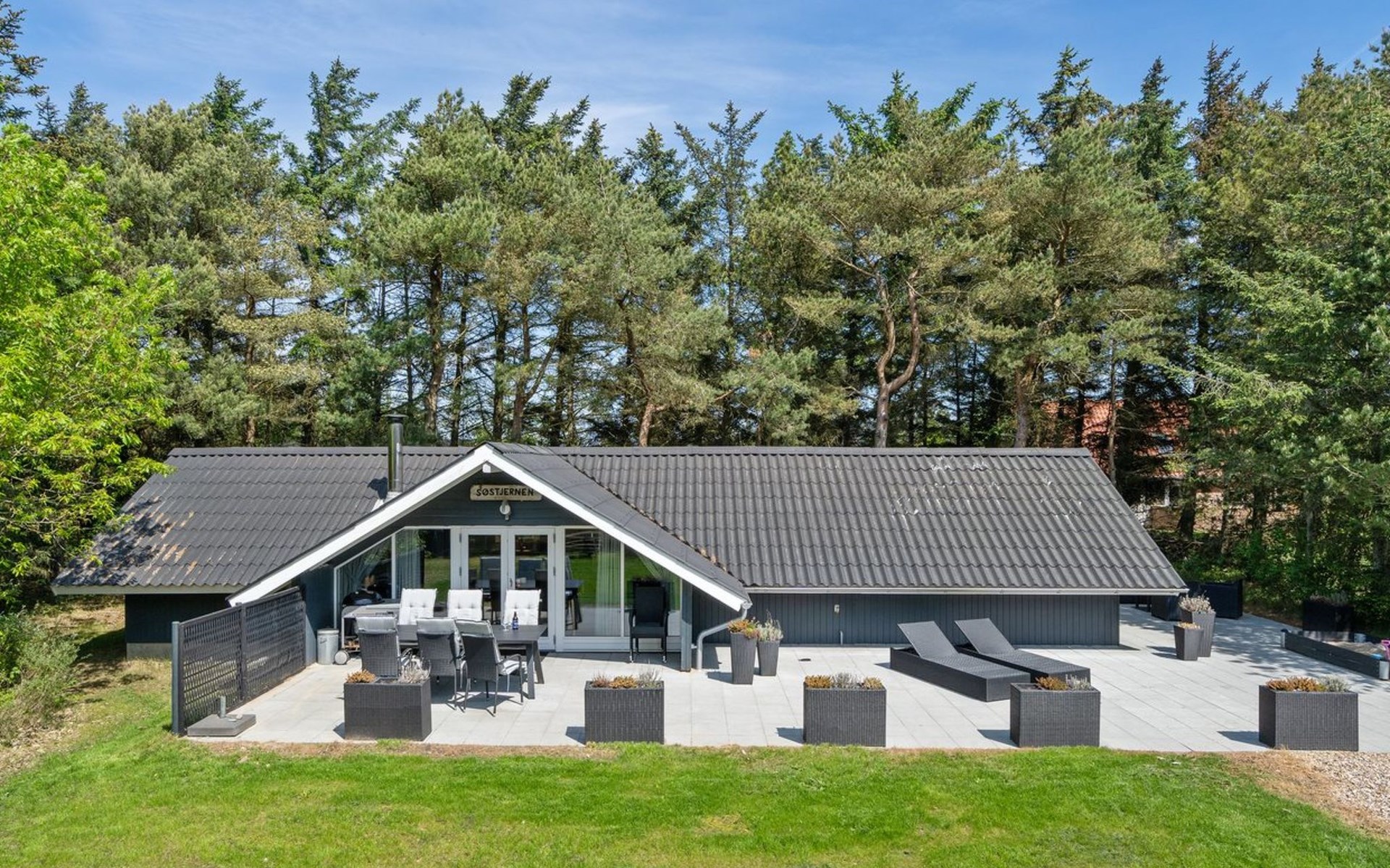 Single-family house, built in 1976. 900 m from the sea. Private: natural state property 1'420 m2. Terrace (110 m2), children's playground (swing). In the house: washing machine, tumble dryer. Parking at the house. E-charging station. Grocery 1 km. The owner does not accept any youth groups.