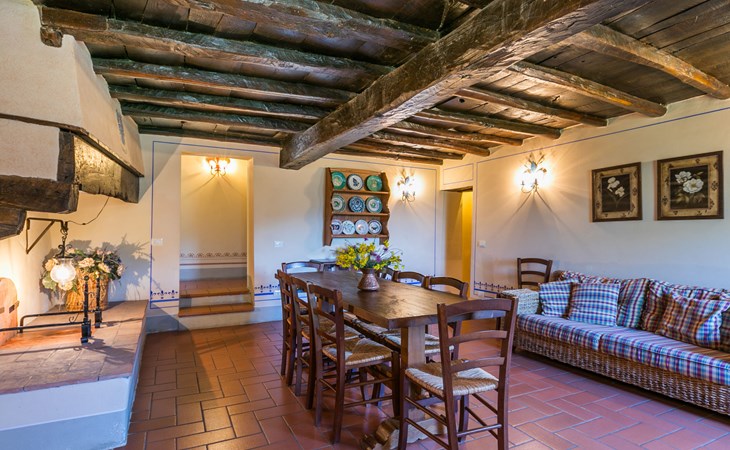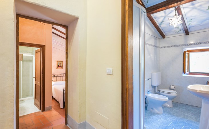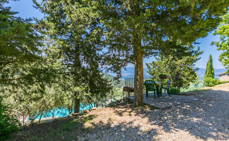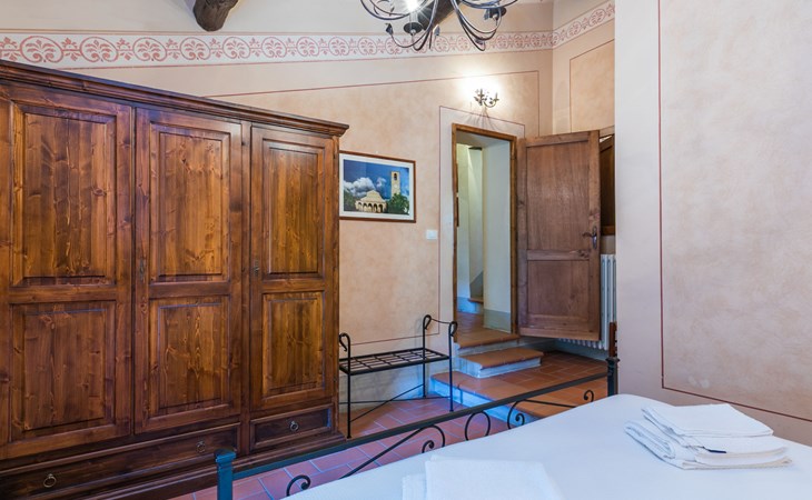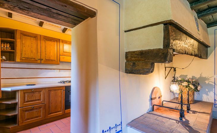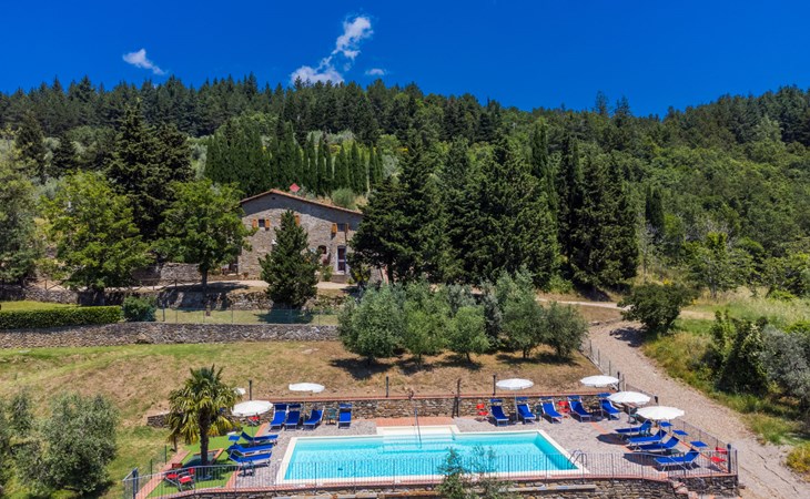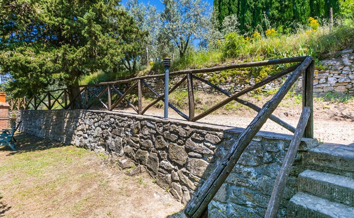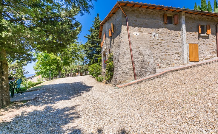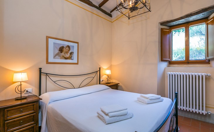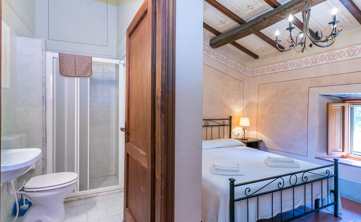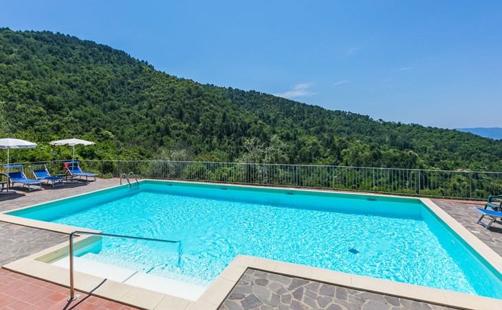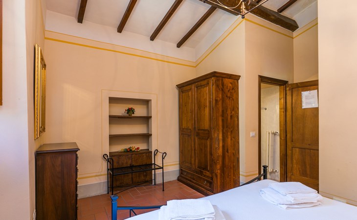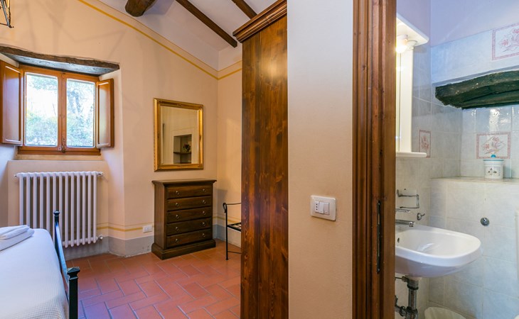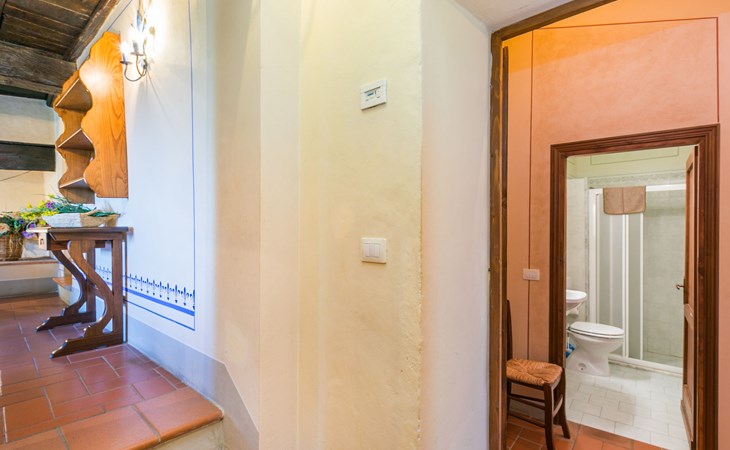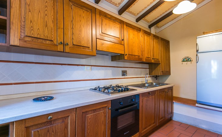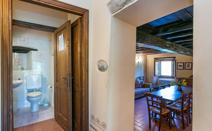 Borgo Stoppi, situated at 600 m a.s.l. at the foot of the Castello Poggio alla Regina, was a property of the counts Guidi since the 11th Century and after some changes of owners, in the 14th Century it became the main centre of the medieval district named "Curia del Castiglione" and agricultural capital of the surrounding mountain area, with its own town hall and big weekly market. Today, the old houses of the hamlet have been restored to 8 units, enhancing in a superb manner the beauty this affascinating place has maintained during the centuries: cypress, oak, pine and chestnuts trees are silent testimonies of Nature and wild boars, hares, squirrels, phaesants and owls may be watched in the surroundings. From the terrace covered with olive trees that produce one of the best and genuine olive oils of the area, you can enjoy a magnificent panorama over the Arno valley and the Chianti hills. Residence "Borgo Stoppi", 600 m a.s.l.. 2.5 km from the centre of Reggello, 30 km from the centre of Firenze, 35 km from the centre of Arezzo, in a quiet, sunny, elevated position, 70 km from the lake, in a cul-de-sac, in the countryside. For shared use: property 5'000 m2, swimming pool (6 x 12 m, depth 150 cm, seasonal availability: 22.May. - 08.Oct. pool opening hours: 08:00-21:00). Outdoor shower. Heating to be paid on the spot, heating available only from 01.Nov. - 07.Apr.. Steep motor access to the house (800 m via unmade road). Parking on the premises. Shop 2.5 km, grocery 2.5 km, supermarket 2.5 km, restaurant 2.5 km, bar 2.5 km, café 2.5 km, bus stop 3.5 km, railway station "Figline Valdarno" 10 km, bathing lake "Lago di Bilancino" 70 km. Nearby attractions: Firenze 40 km, Siena 86 km, Arezzo 64 km, Abazzia di Vallombrosa 16 km. Please note: car recommended. Suitable for families. The photograph shows a typical example.