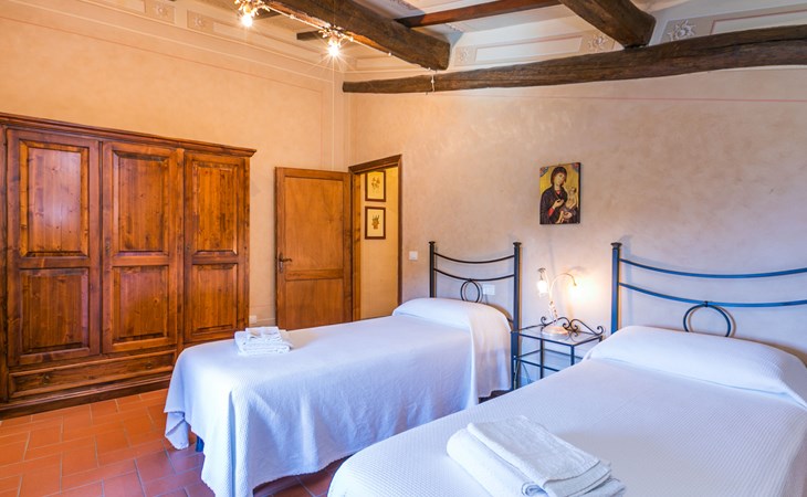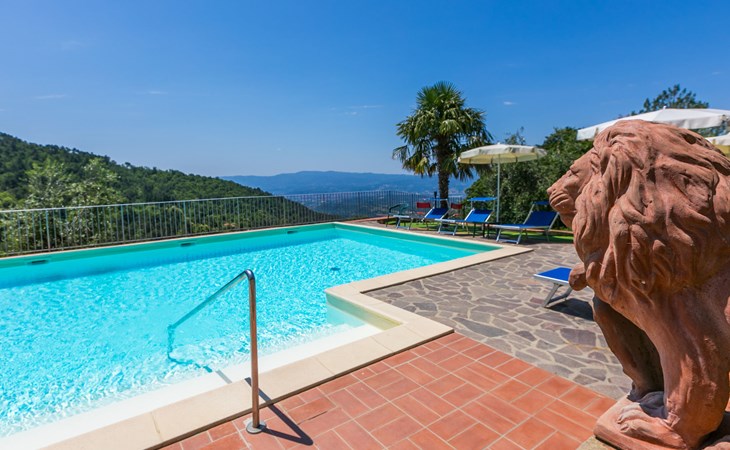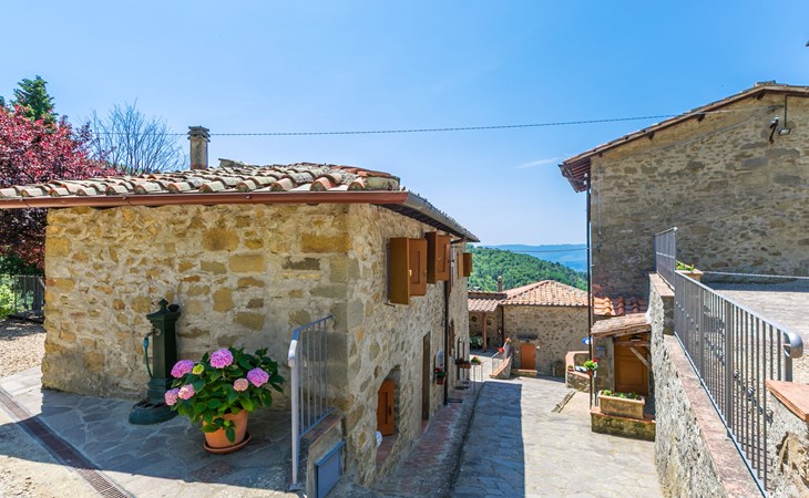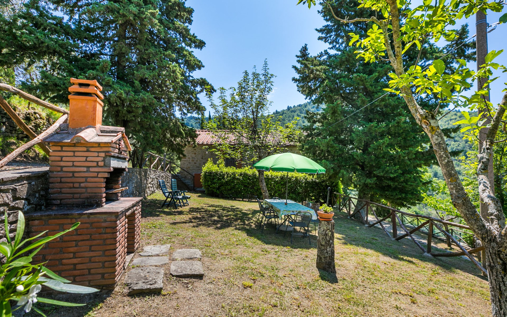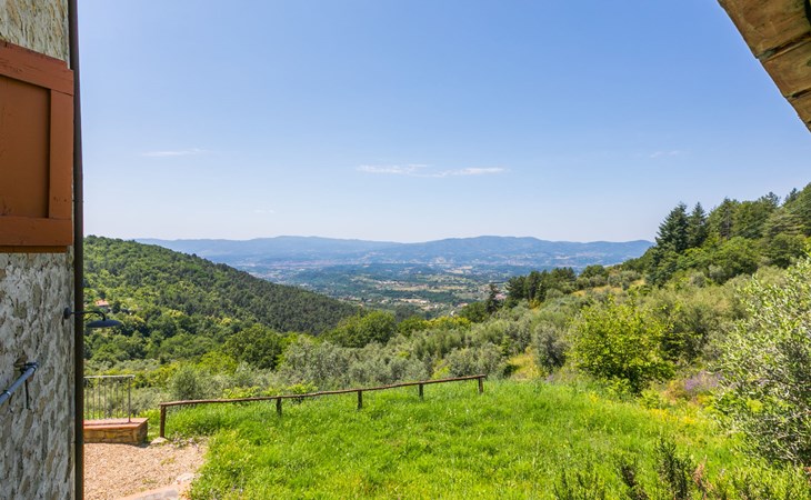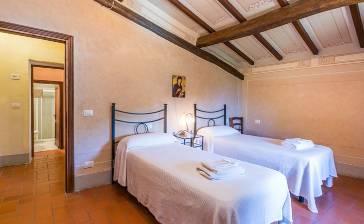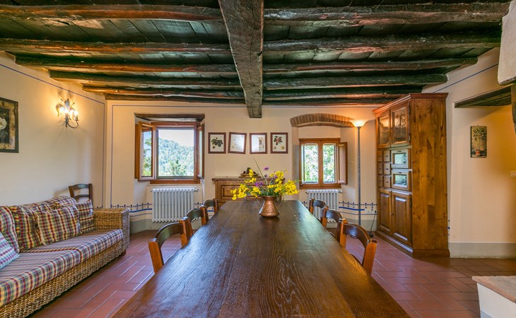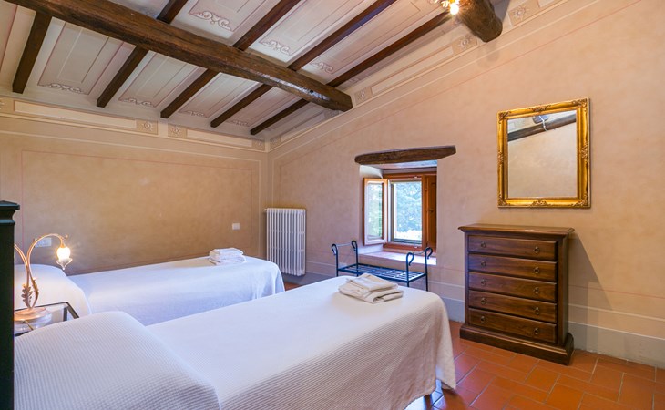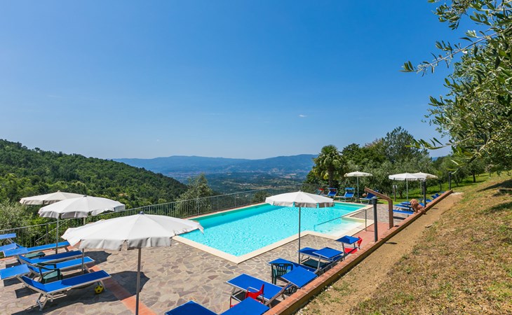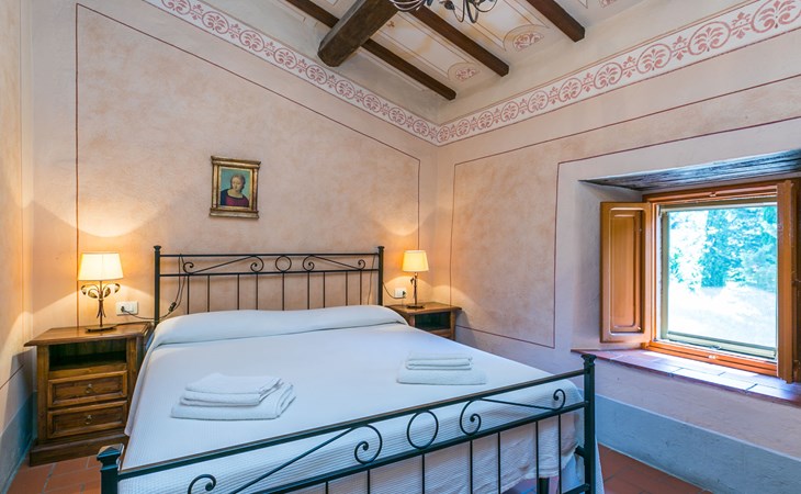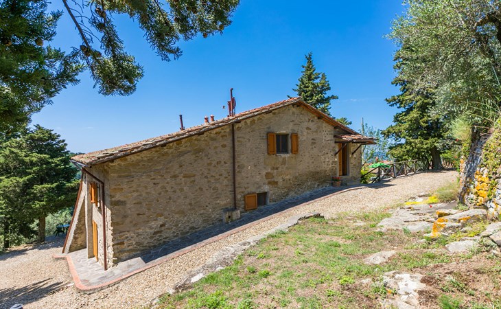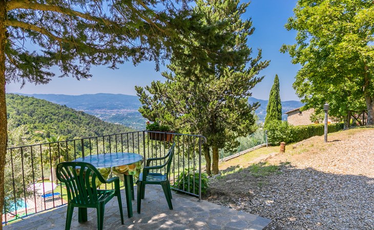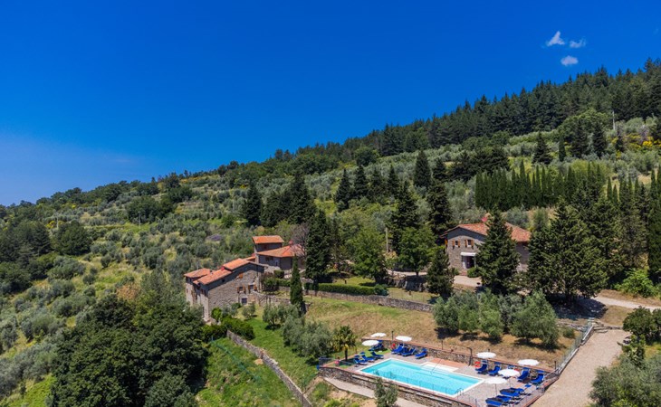 Borgo Stoppi, situated at 600 m a.s.l. at the foot of the Castello Poggio alla Regina, was a property of the counts Guidi since the 11th Century and after some changes of owners, in the 14th Century it became the main centre of the medieval district named "Curia del Castiglione" and agricultural capital of the surrounding mountain area, with its own town hall and big weekly market. Today, the old houses of the hamlet have been restored to 8 units, enhancing in a superb manner the beauty this affascinating place has maintained during the centuries: cypress, oak, pine and chestnuts trees are silent testimonies of Nature and wild boars, hares, squirrels, phaesants and owls may be watched in the surroundings. From the terrace covered with olive trees that produce one of the best and genuine olive oils of the area, you can enjoy a magnificent panorama over the Arno valley and the Chianti hills. Residence "Borgo Stoppi", 600 m a.s.l.. 2.5 km from the centre of Reggello, 30 km from the centre of Firenze, 35 km from the centre of Arezzo, in a quiet, sunny, elevated position, 70 km from the lake, in a cul-de-sac, in the countryside. For shared use: property 5'000 m2, swimming pool (6 x 12 m, depth 150 cm, seasonal availability: 22.May. - 08.Oct. pool opening hours: 08:00-21:00). Outdoor shower. Heating to be paid on the spot, heating available only from 01.Nov. - 07.Apr.. Steep motor access to the house (800 m via unmade road). Parking on the premises. Shop 2.5 km, grocery 2.5 km, supermarket 2.5 km, restaurant 2.5 km, bar 2.5 km, café 2.5 km, bus stop 3.5 km, railway station "Figline Valdarno" 10 km, bathing lake "Lago di Bilancino" 70 km. Nearby attractions: Firenze 40 km, Siena 86 km, Arezzo 64 km, Abazzia di Vallombrosa 16 km. Please note: car recommended. Suitable for families. The photograph shows a typical example.