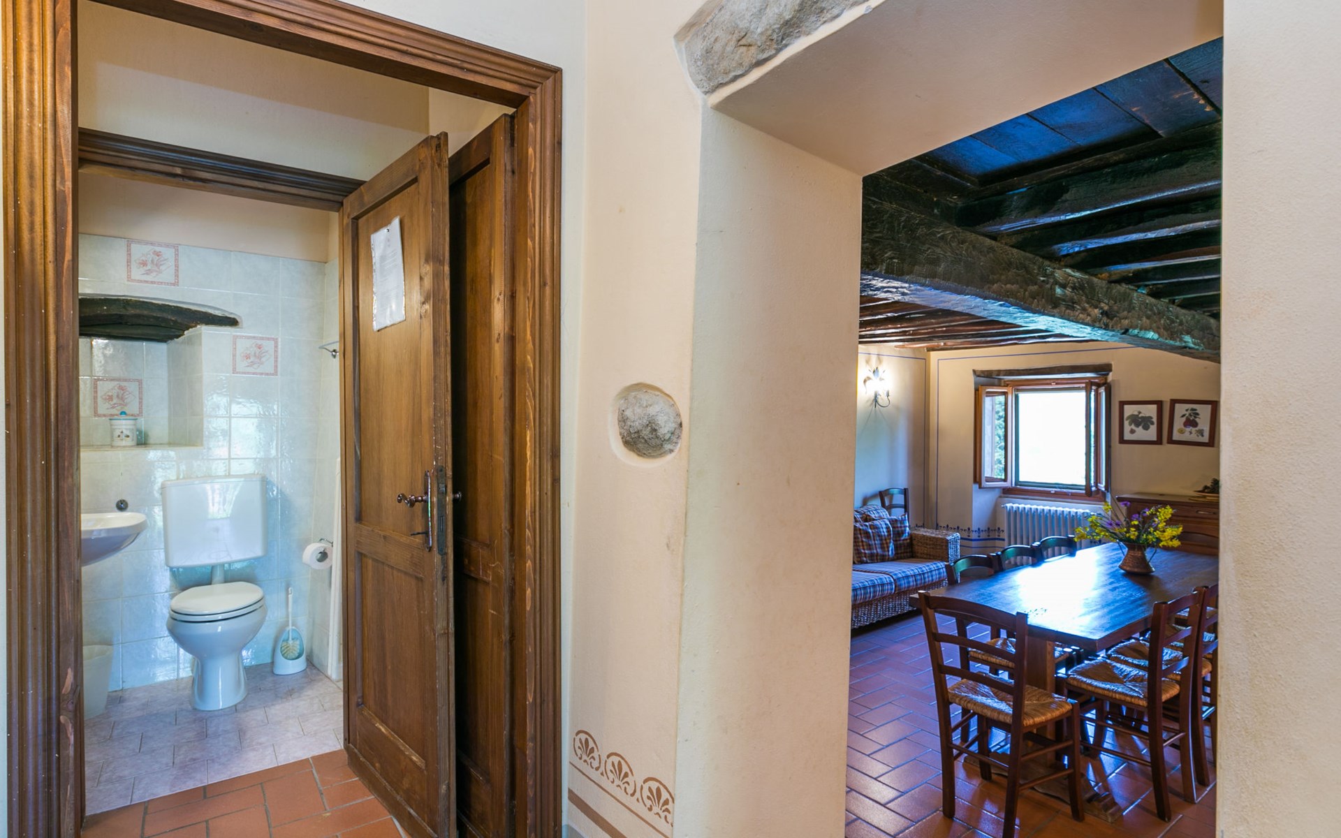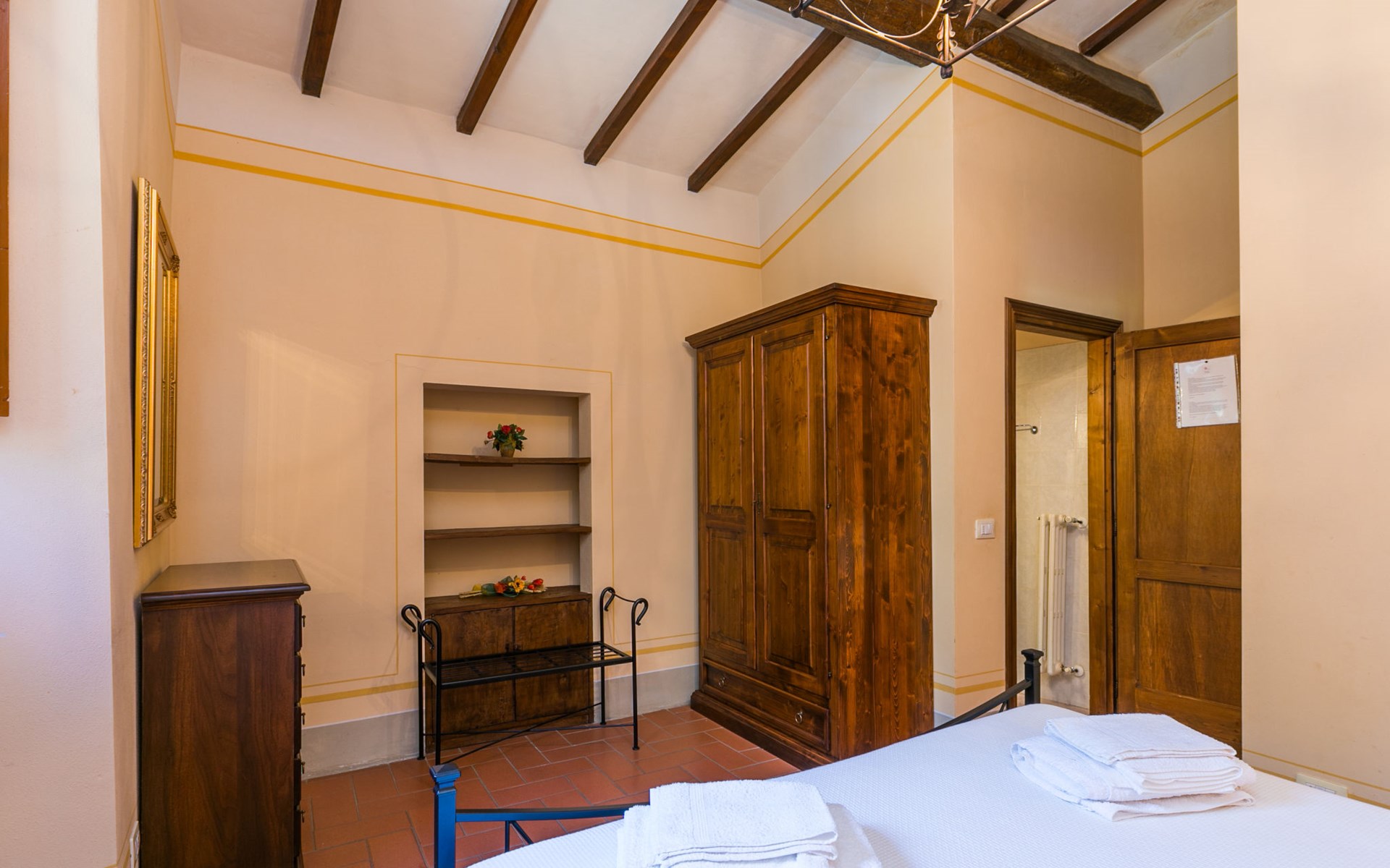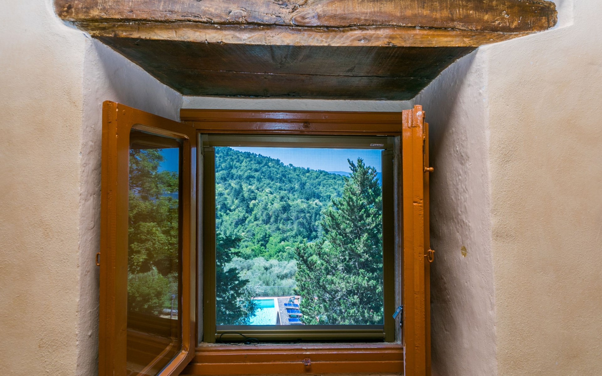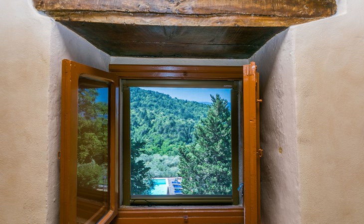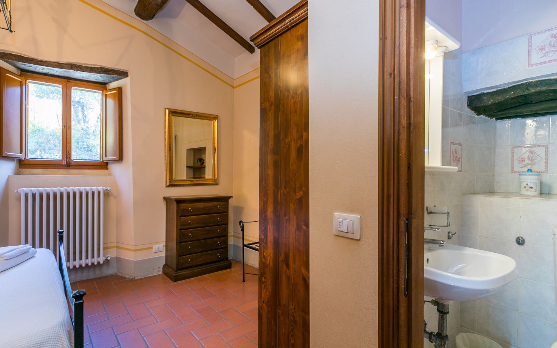 Borgo Stoppi, situated at 600 m a.s.l. at the foot of the Castello Poggio alla Regina, was a property of the counts Guidi since the 11th Century and after some changes of owners, in the 14th Century it became the main centre of the medieval district named "Curia del Castiglione" and agricultural capital of the surrounding mountain area, with its own town hall and big weekly market. Today, the old houses of the hamlet have been restored to 8 units, enhancing in a superb manner the beauty this affascinating place has maintained during the centuries: cypress, oak, pine and chestnuts trees are silent testimonies of Nature and wild boars, hares, squirrels, phaesants and owls may be watched in the surroundings. From the terrace covered with olive trees that produce one of the best and genuine olive oils of the area, you can enjoy a magnificent panorama over the Arno valley and the Chianti hills. Residence "Borgo Stoppi", 600 m a.s.l.. 2.5 km from the centre of Reggello, 30 km from the centre of Firenze, 35 km from the centre of Arezzo, in a quiet, sunny, elevated position, 70 km from the lake, in a cul-de-sac, in the countryside. For shared use: property 5'000 m2, swimming pool (6 x 12 m, depth 150 cm, seasonal availability: 22.May. - 08.Oct. pool opening hours: 08:00-21:00). Outdoor shower. Heating to be paid on the spot, heating available only from 01.Nov. - 07.Apr.. Steep motor access to the house (800 m via unmade road). Parking on the premises. Shop 2.5 km, grocery 2.5 km, supermarket 2.5 km, restaurant 2.5 km, bar 2.5 km, café 2.5 km, bus stop 3.5 km, railway station "Figline Valdarno" 10 km, bathing lake "Lago di Bilancino" 70 km. Nearby attractions: Firenze 40 km, Siena 86 km, Arezzo 64 km, Abazzia di Vallombrosa 16 km. Please note: car recommended. Suitable for families. The photograph shows a typical example.